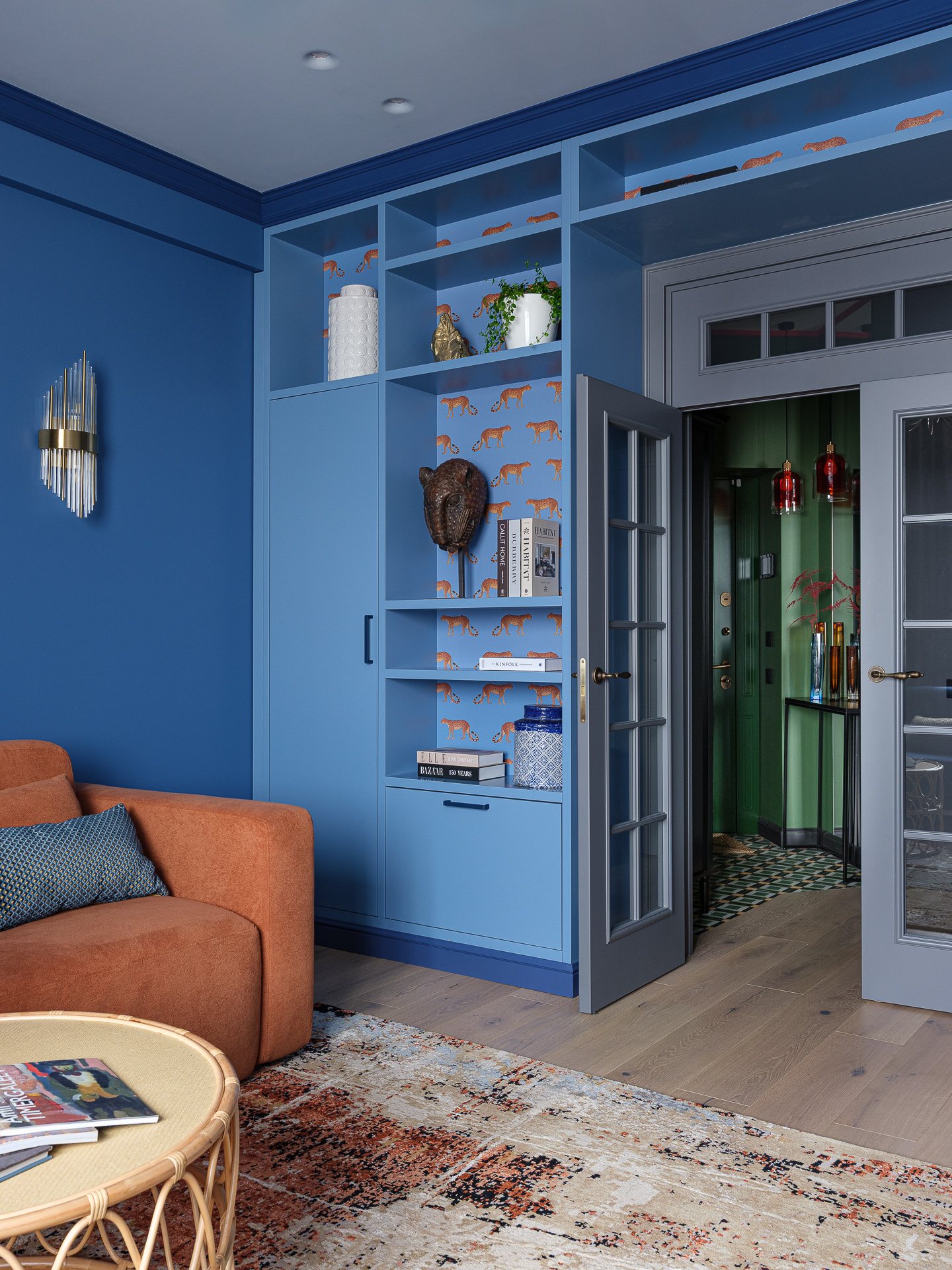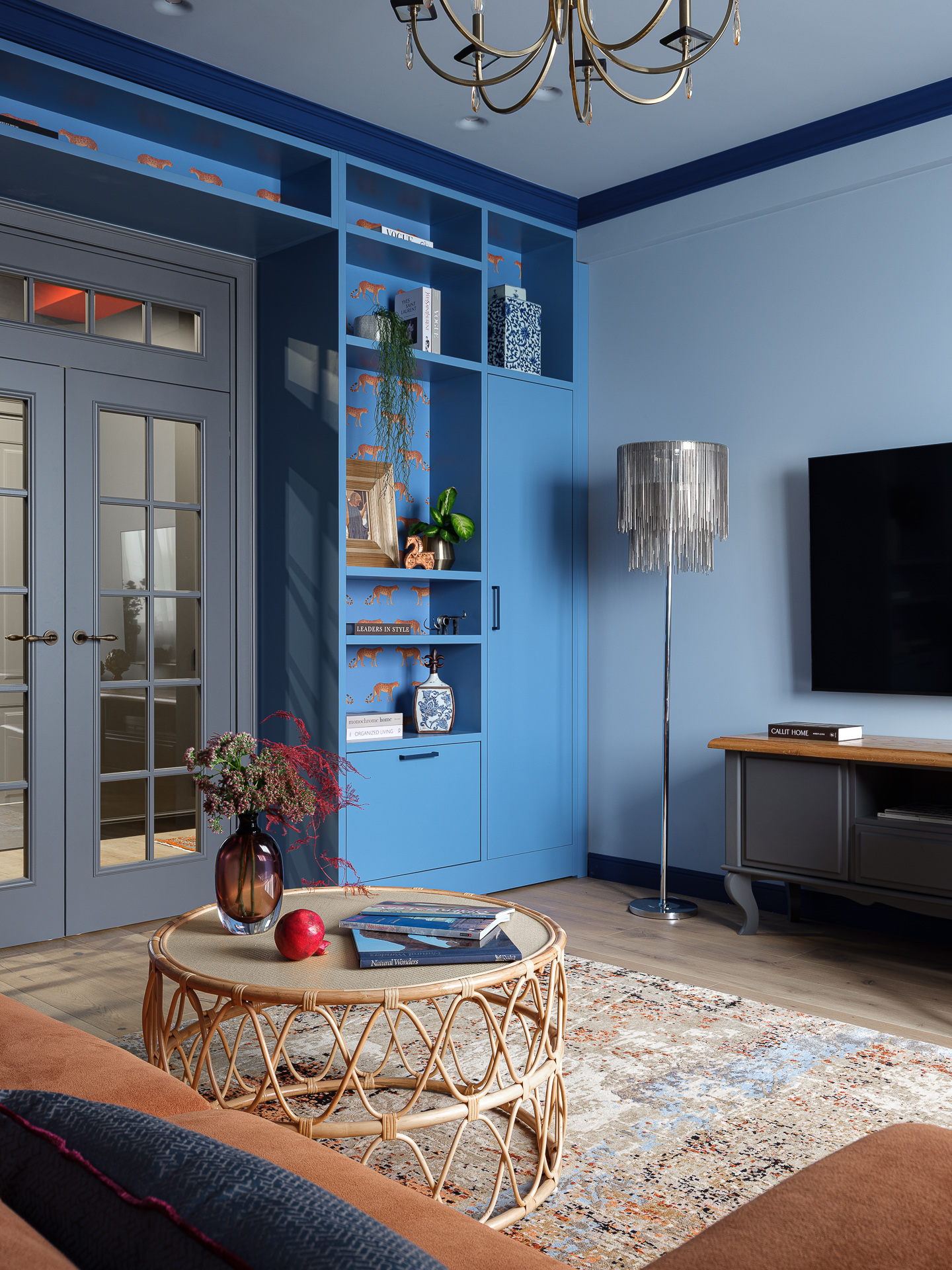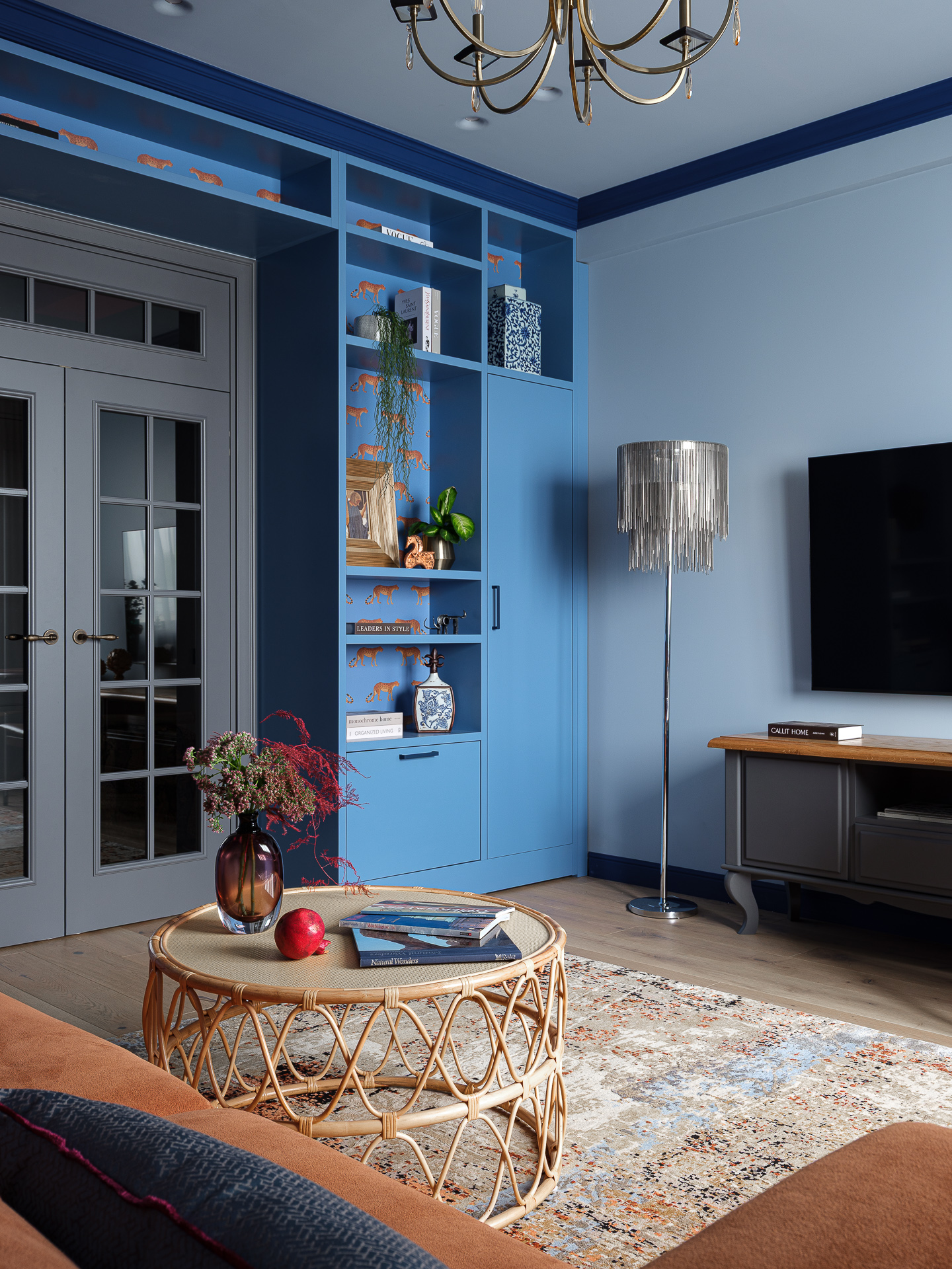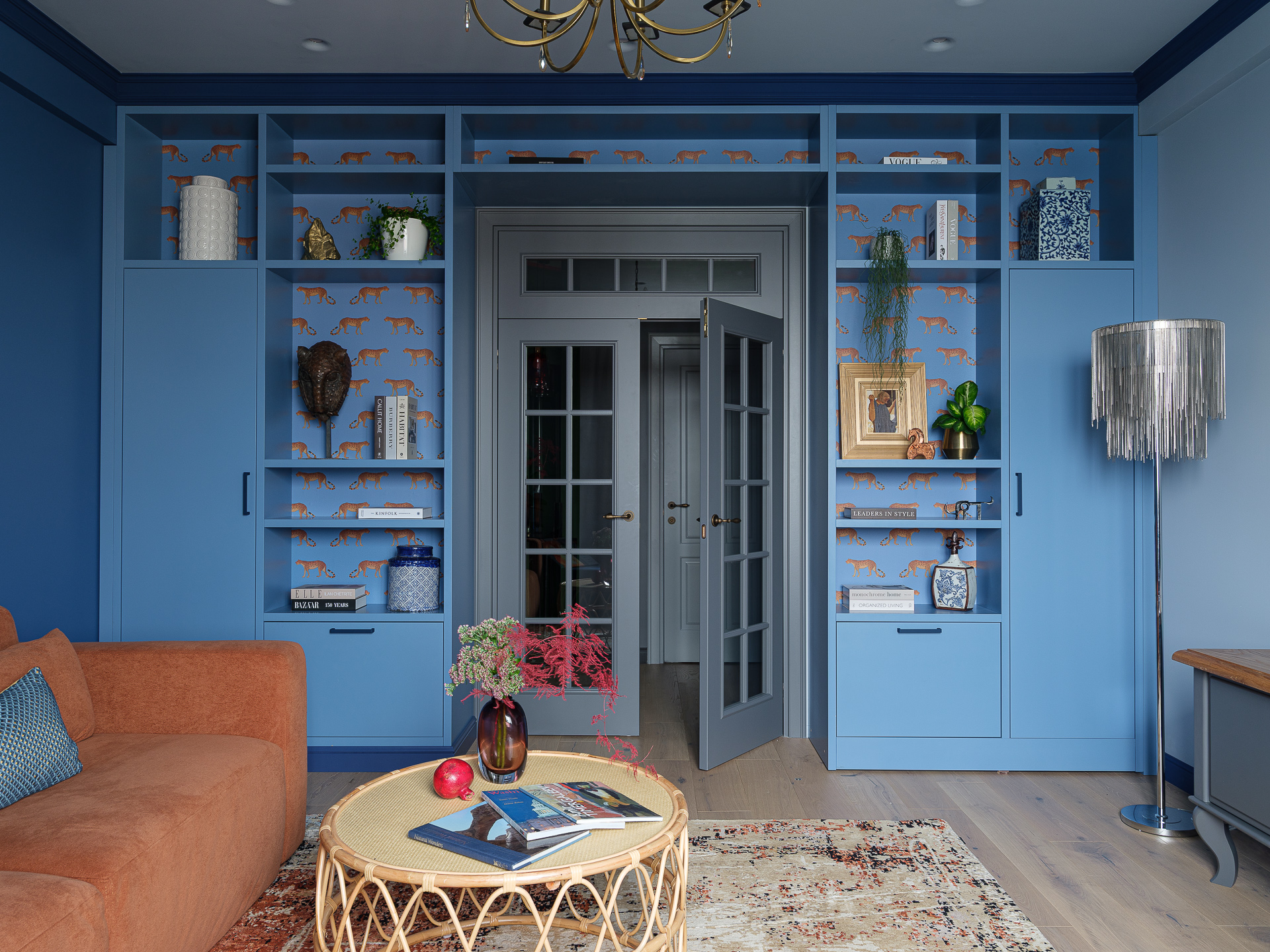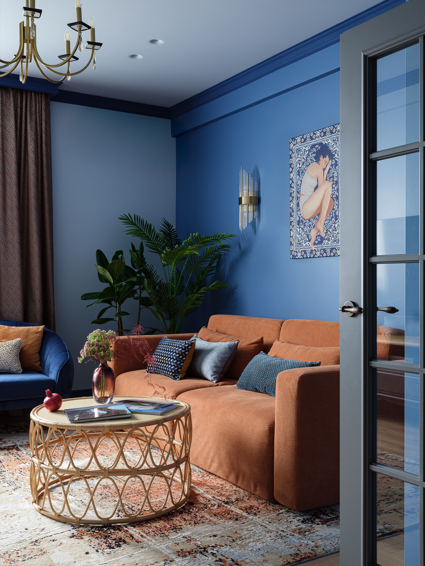 Гостиная приняла синие оттенки. Обрамлением этого цвета - является тёмный синий карниз, геометрично преходящий в дверной портал. Минималистичные синие ручки, также, поддерживают цвет карниза и дверного проёма. Акцентным пятном, в данном случае, является оранжевый диван. Над диваном висит картина в интересном багете, внутри которого, поселился, танцующий под индийские мотивы, тигр. Также, тигров мы можем видеть на шкафу и над обеденным столом.