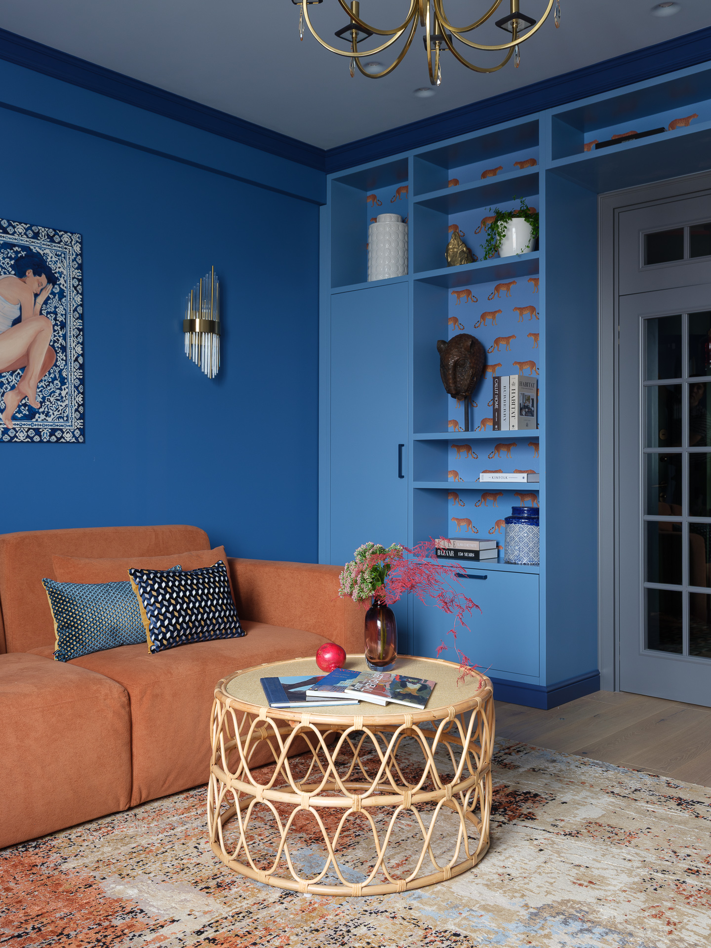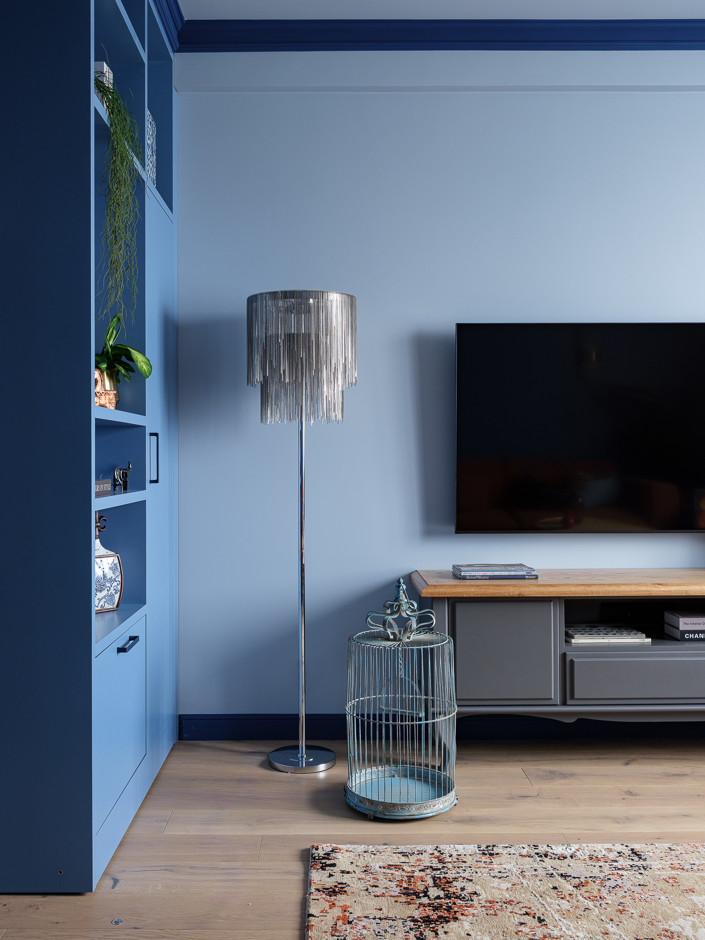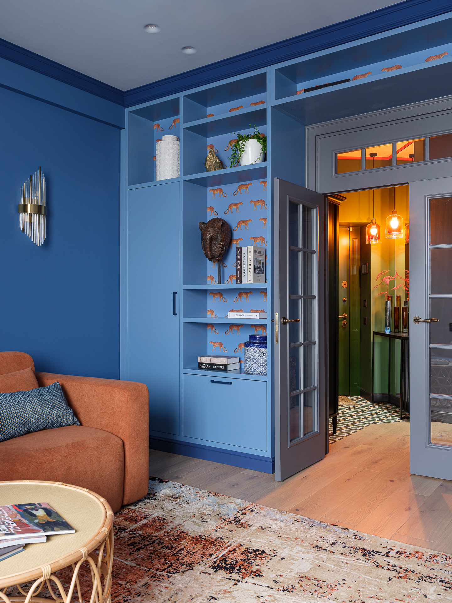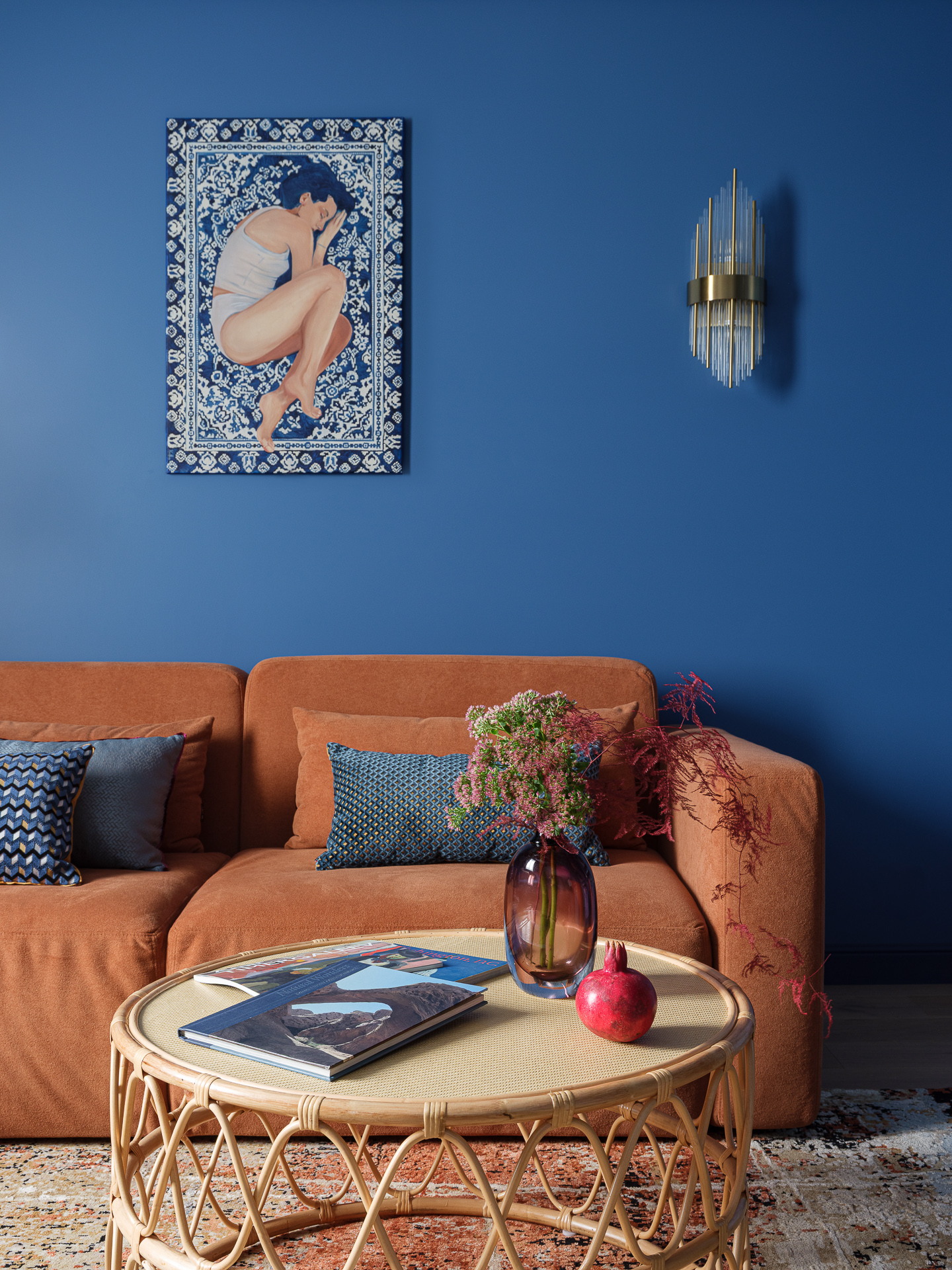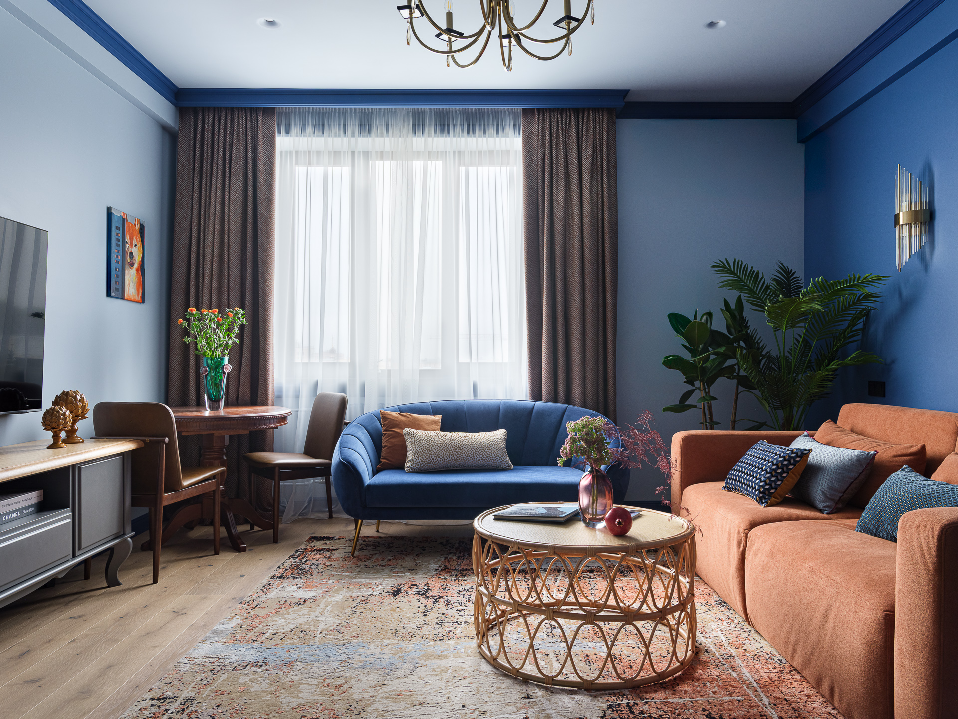 Гостиная приняла синие оттенки. Обрамлением этого цвета - является тёмный синий карниз, геометрично преходящий в дверной портал. Минималистичные синие ручки, также, поддерживают цвет карниза и дверного проёма. Акцентным пятном, в данном случае, является оранжевый диван. Над диваном висит картина в интересном багете, внутри которого, поселился, танцующий под индийские мотивы, тигр. Также, тигров мы можем видеть на шкафу и над обеденным столом.