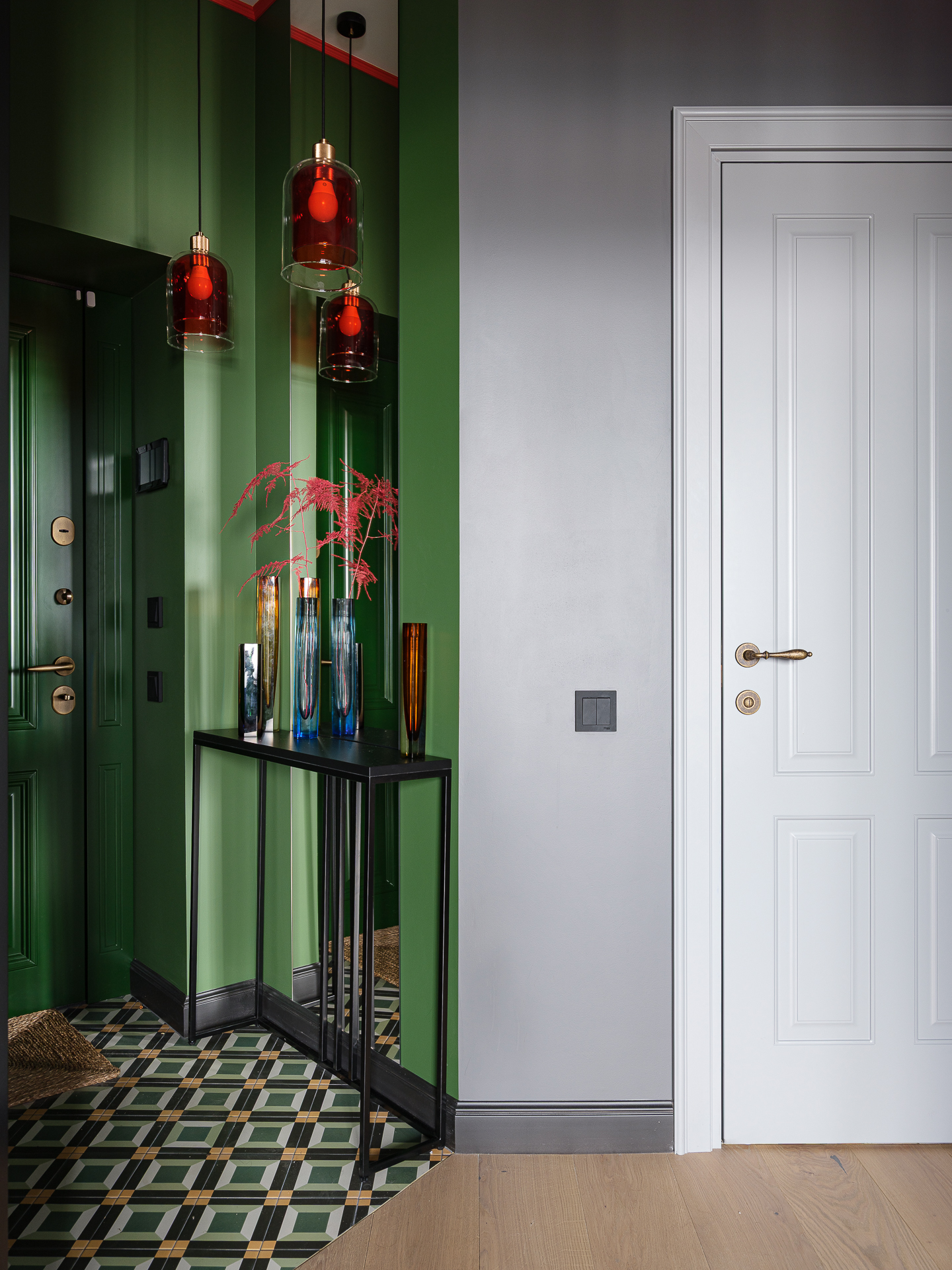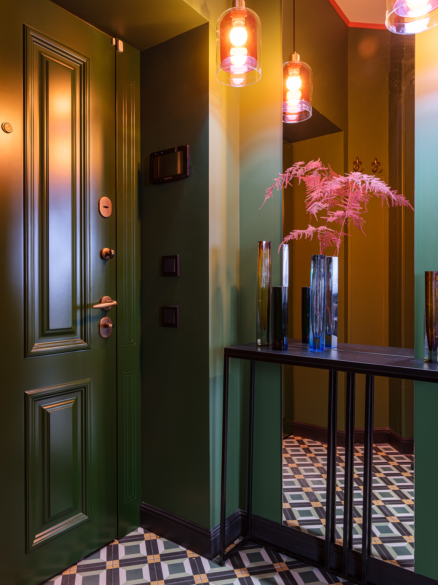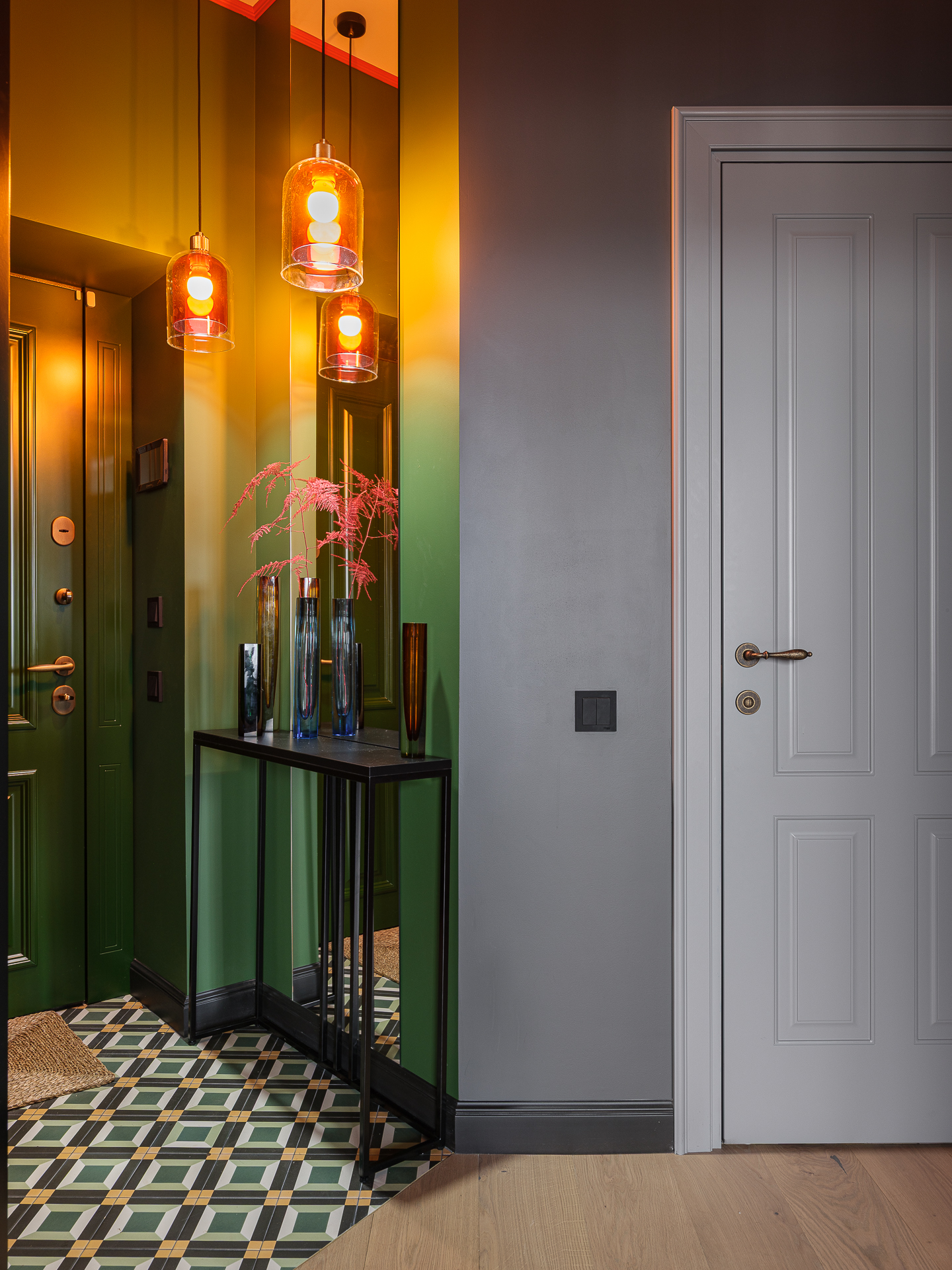 Каждая комната имеет своё цветовое решение. Так, например, входная зона приняла природный травяной цвет. Вектор цветовому сочетанию задает напольная плитка с геометрическим рисунком, на ней мы видим - зелёный оттенок и жёлтые элементы, которые мы, также можем наблюдать: в исполнении деревянного пола, на коврике у входной двери и в элементах декора. Продолжает цветовую гамму чёрный цвет, который есть, также, на рисунке плитки и дублируется в исполнении металлической консоли, черного лакового шкафа.