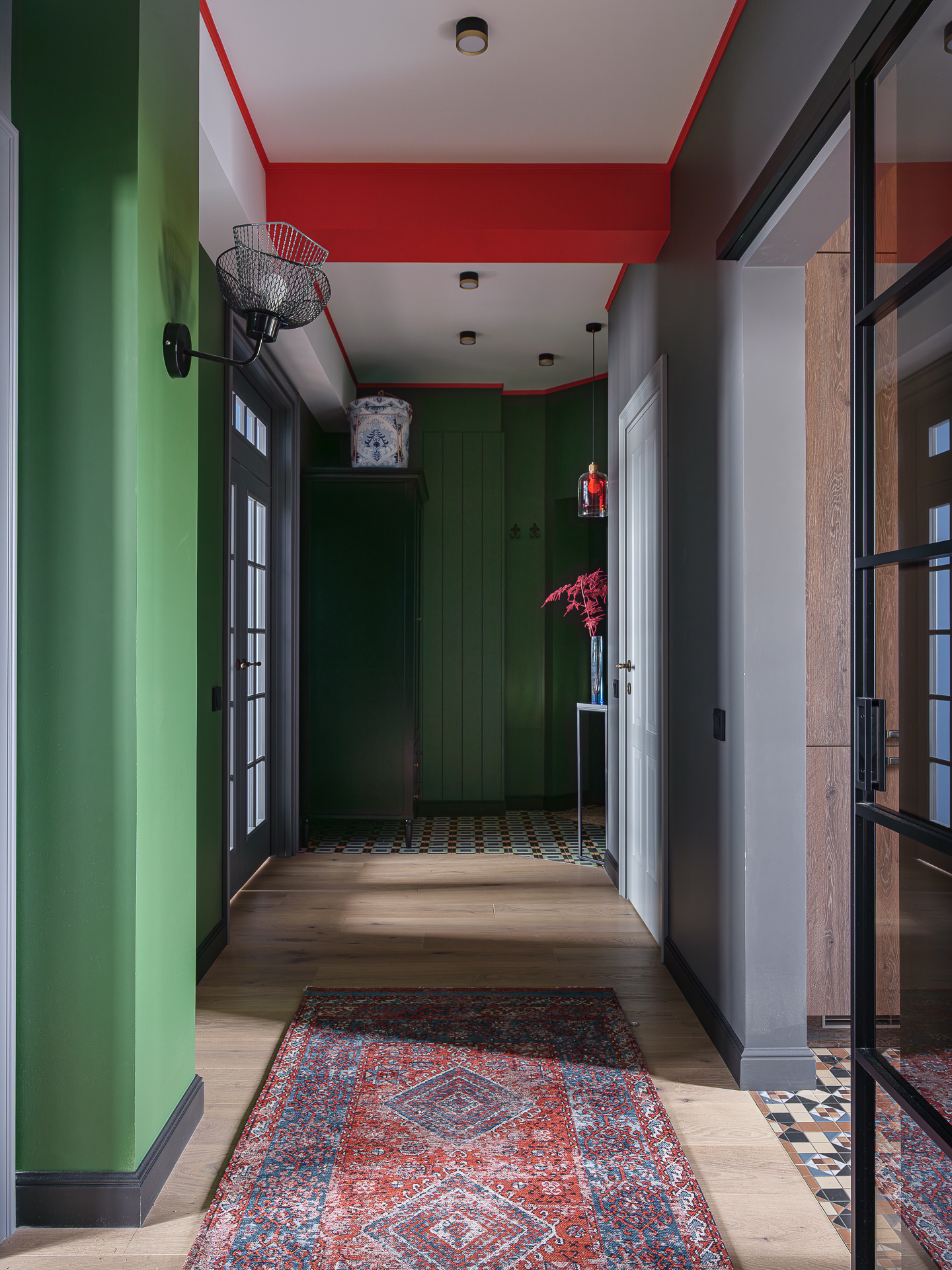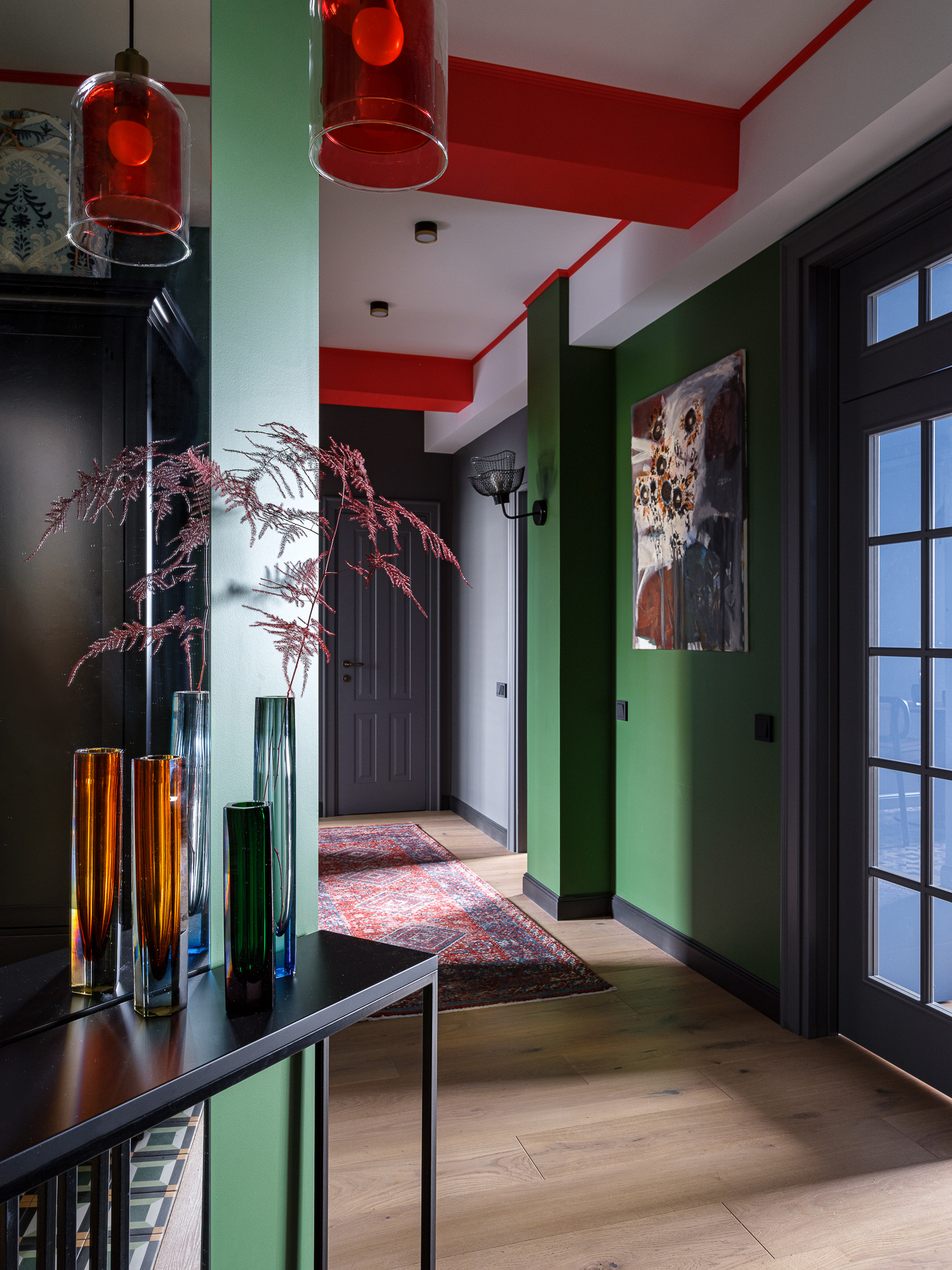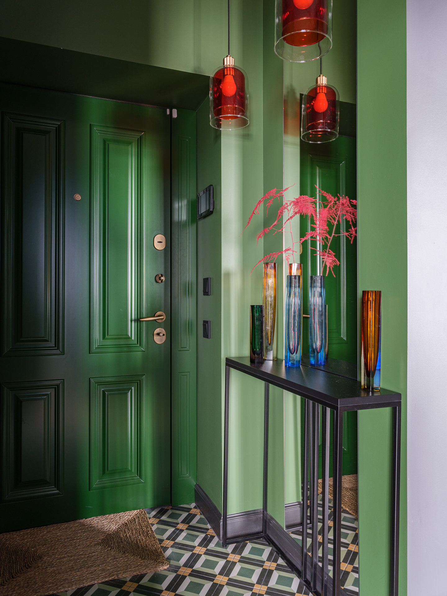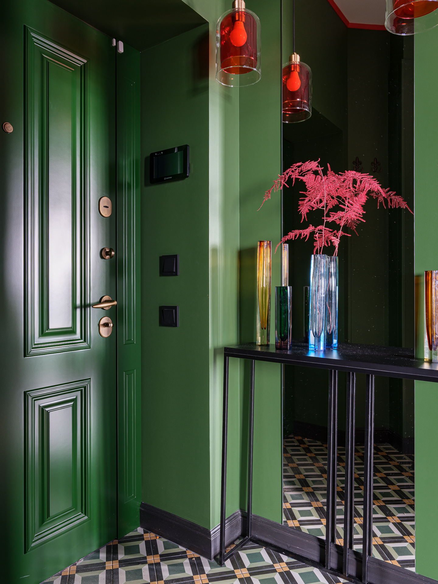 Каждая комната имеет своё цветовое решение. Так, например, входная зона приняла природный травяной цвет. Вектор цветовому сочетанию задает напольная плитка с геометрическим рисунком, на ней мы видим - зелёный оттенок и жёлтые элементы, которые мы, также можем наблюдать: в исполнении деревянного пола, на коврике у входной двери и в элементах декора. Продолжает цветовую гамму чёрный цвет, который есть, также, на рисунке плитки и дублируется в исполнении металлической консоли, черного лакового шкафа.