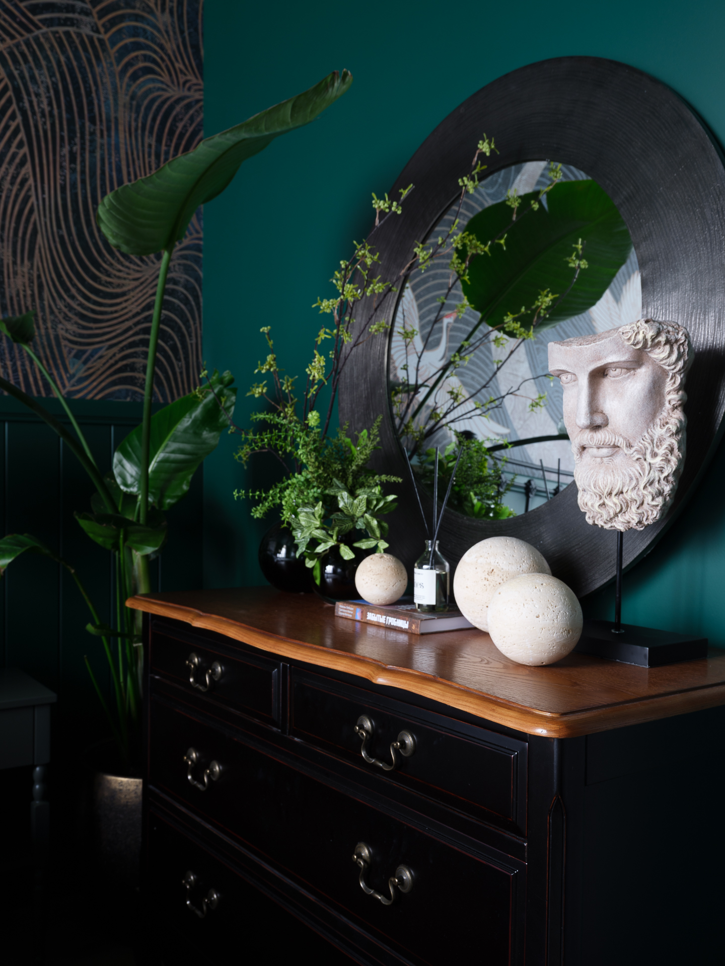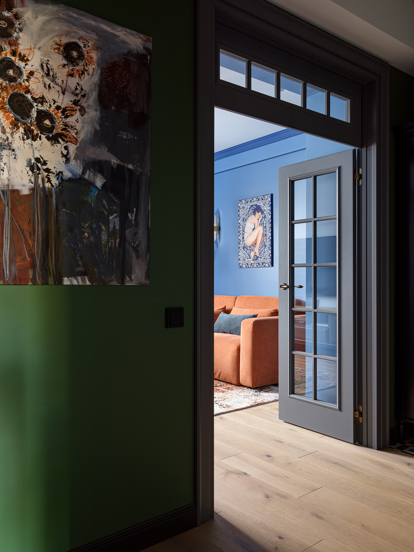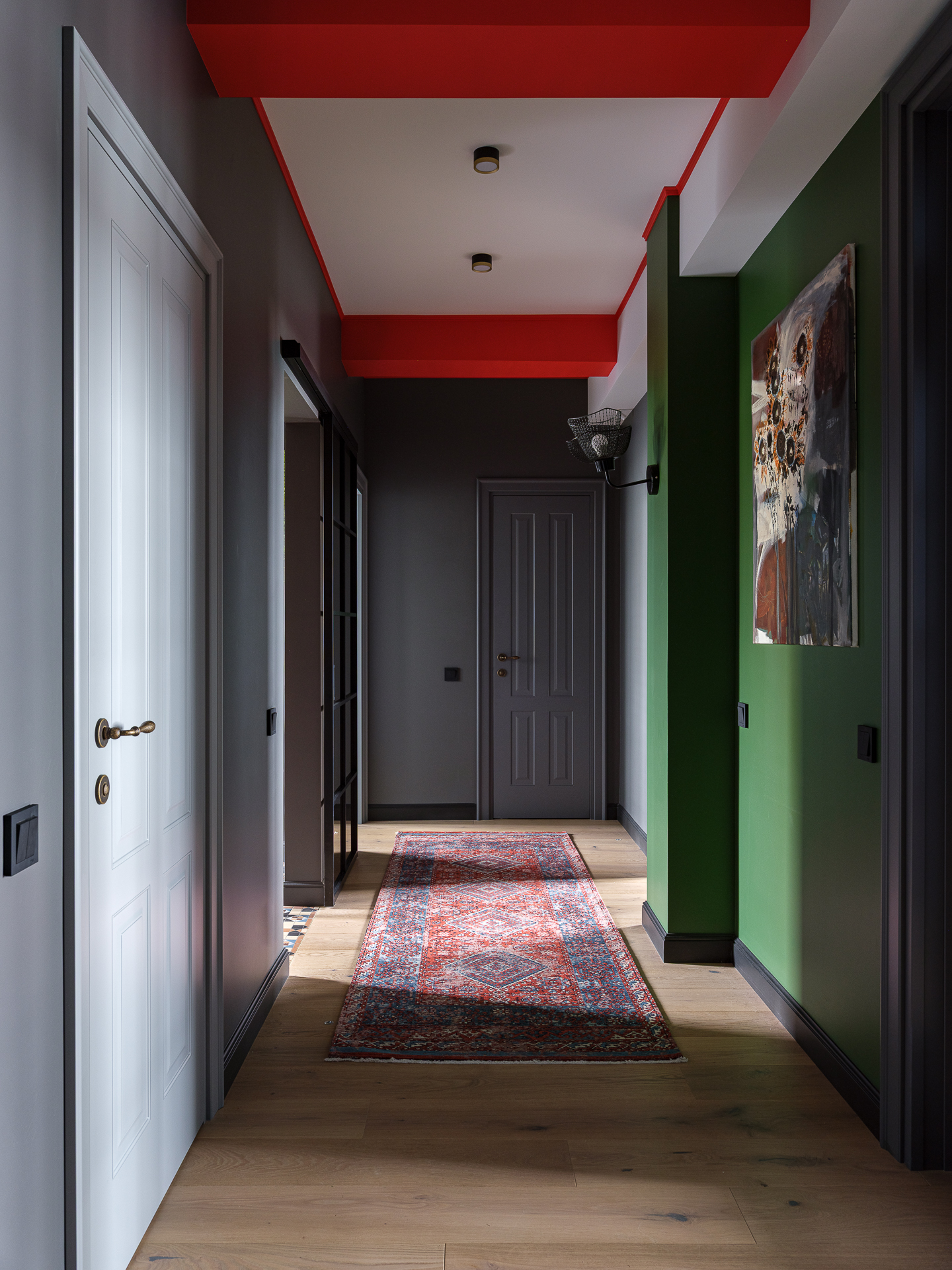 Для камерности потолок также выкрашен в тёмно-зеленый цвет, и переходом к стене выступает широкий классический карниз, за счёт размера которого мы «собираем» форму комнаты в квадрат – самая статичная фигура, внушающая чувство безопасности.