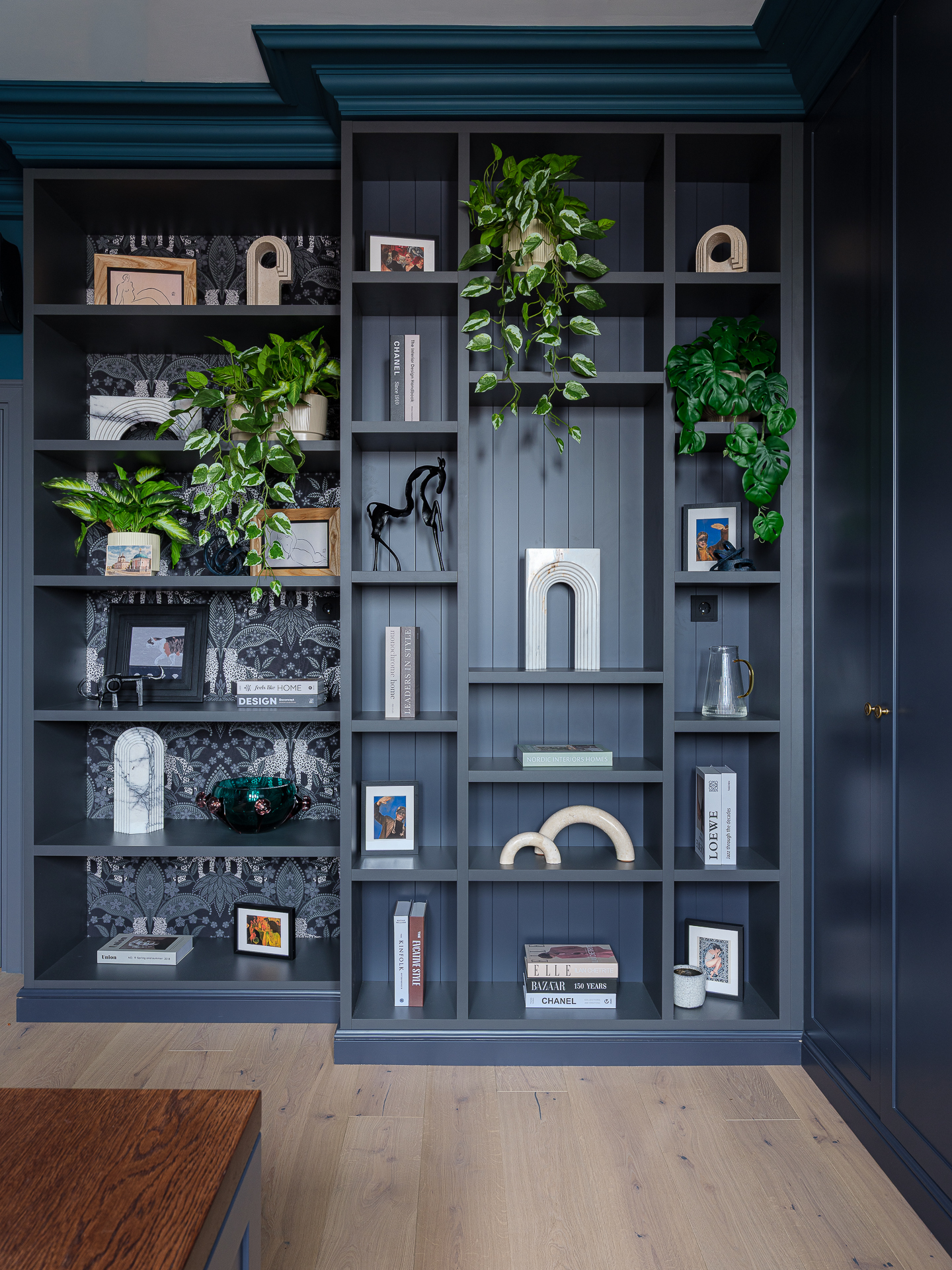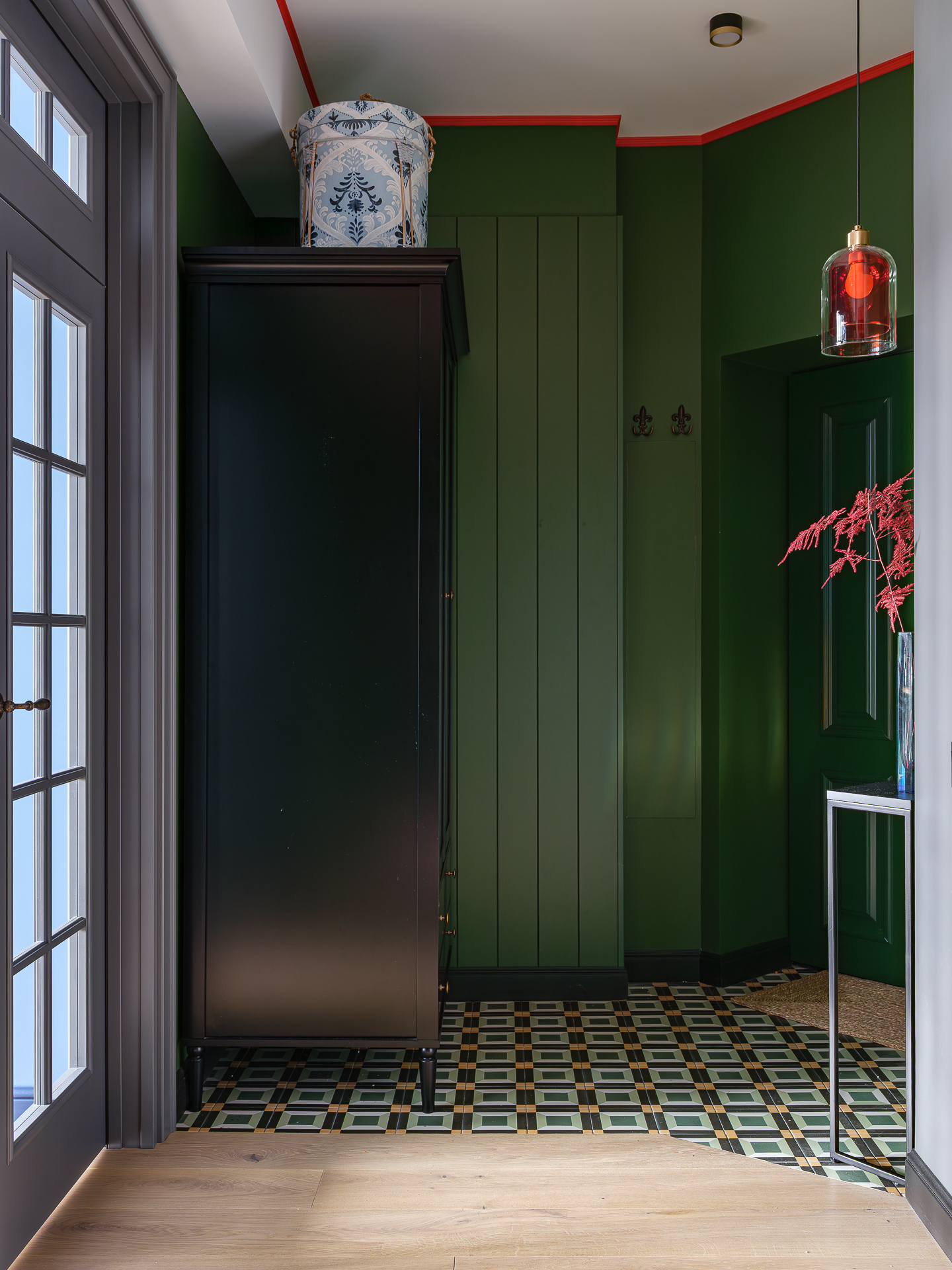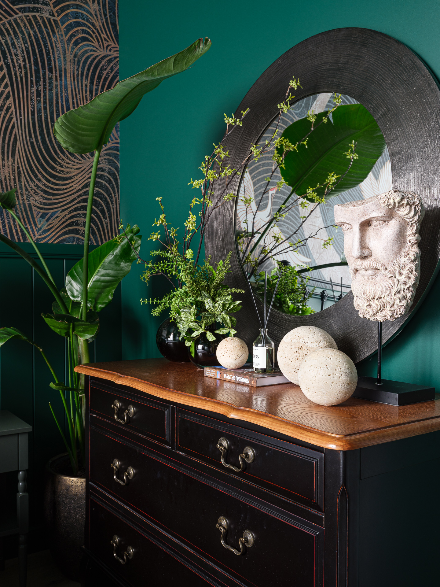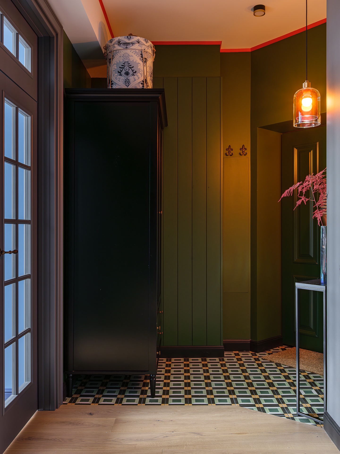 Для камерности потолок также выкрашен в тёмно-зеленый цвет, и переходом к стене выступает широкий классический карниз, за счёт размера которого мы «собираем» форму комнаты в квадрат – самая статичная фигура, внушающая чувство безопасности.