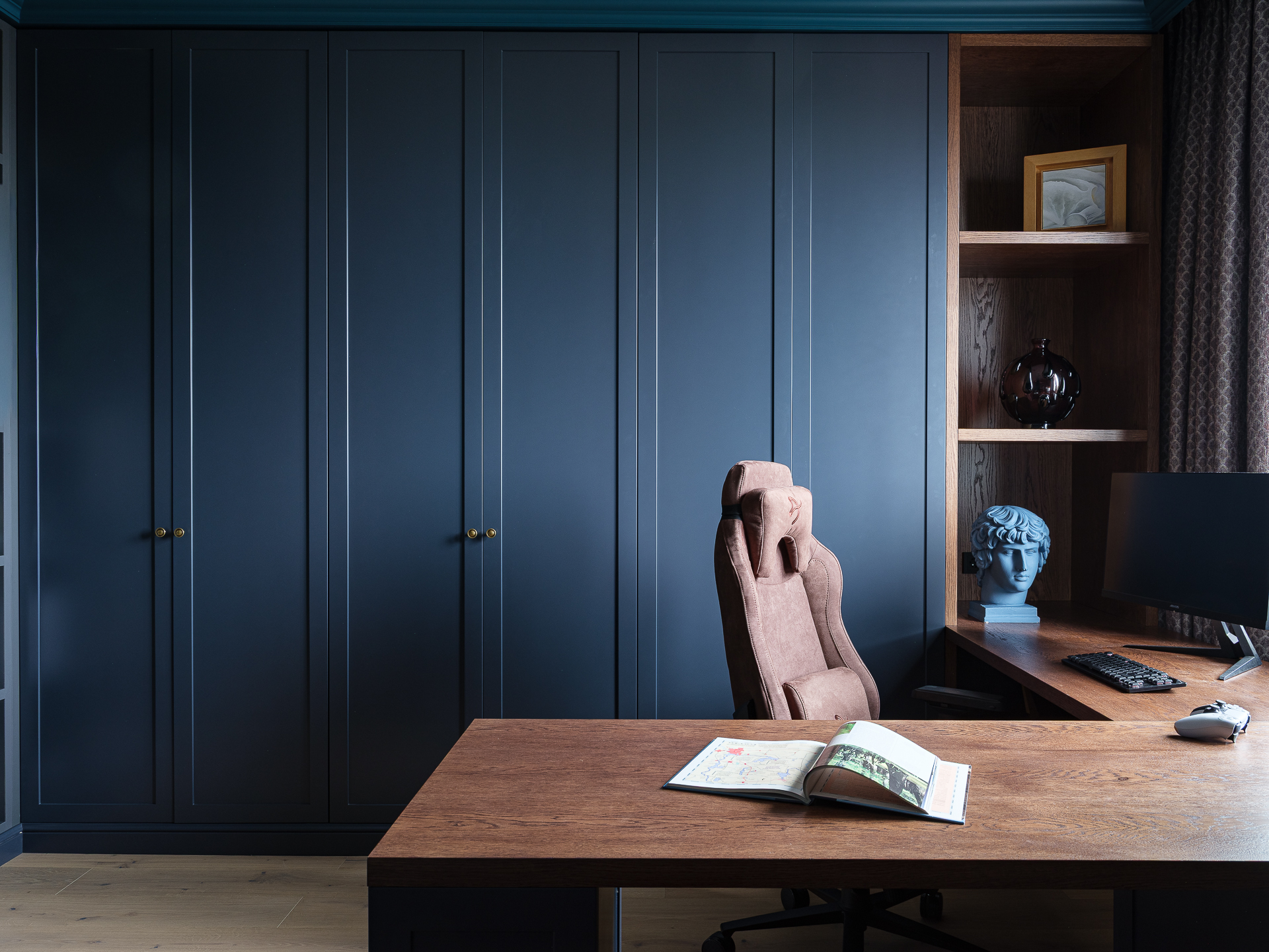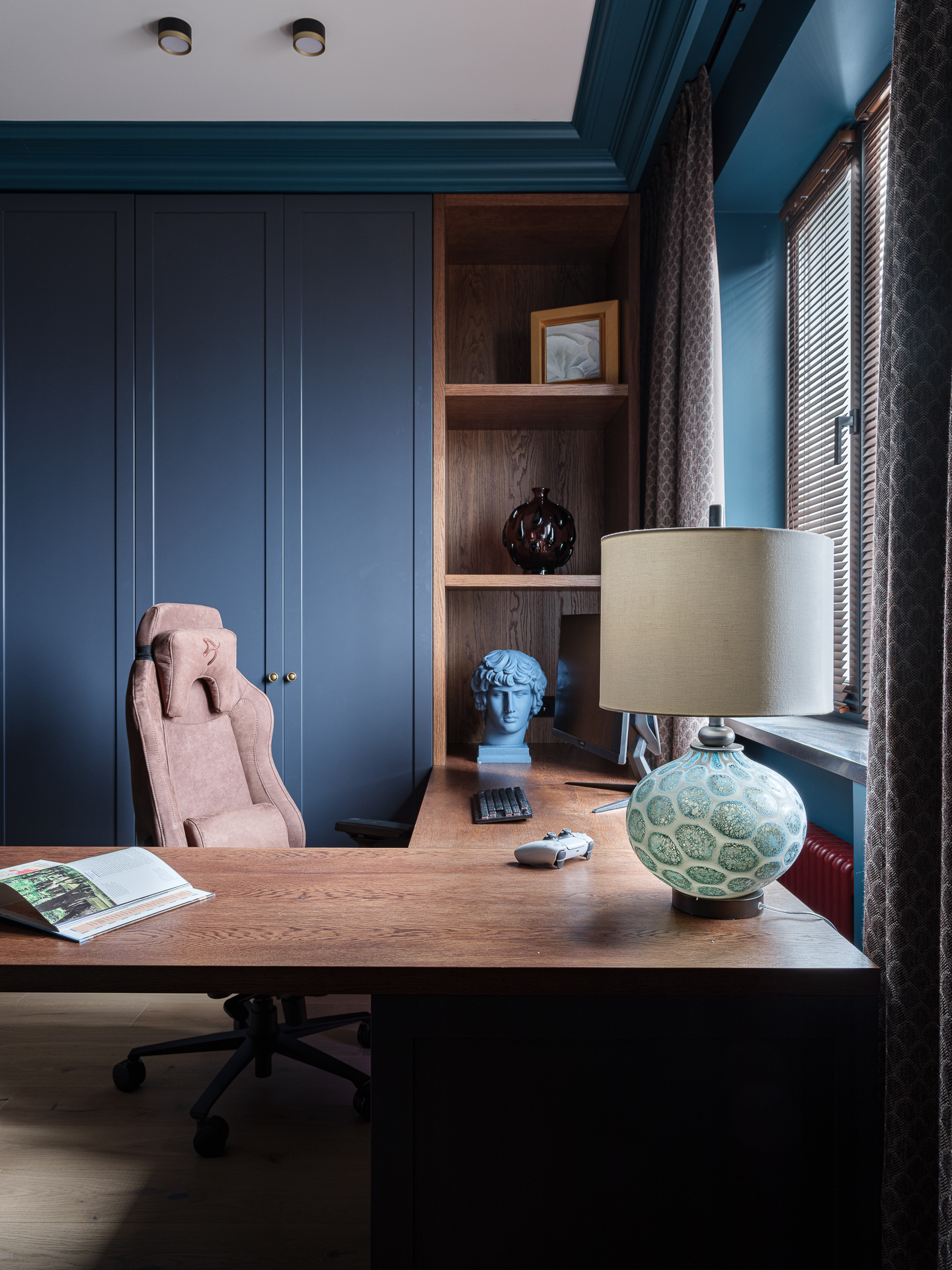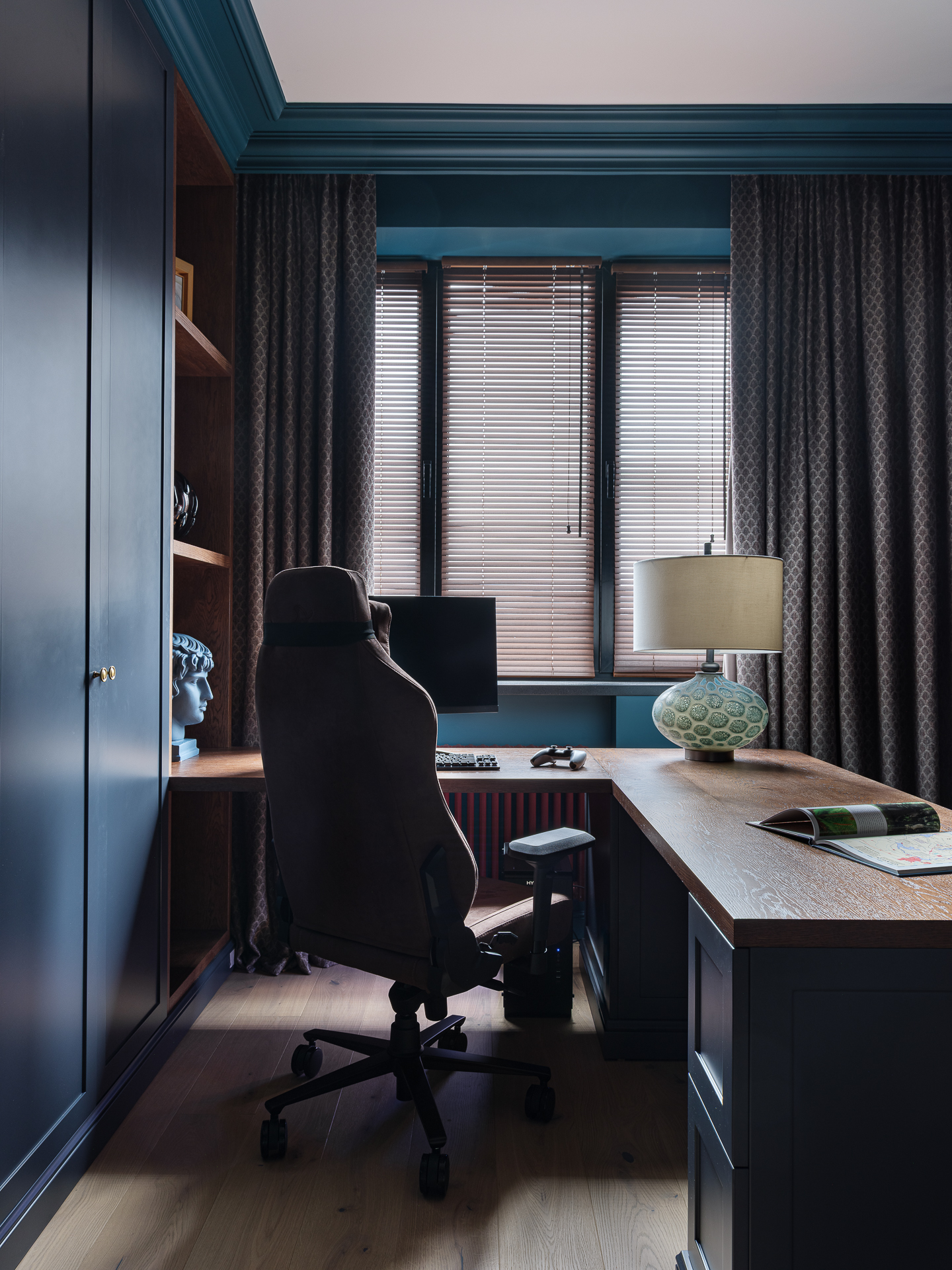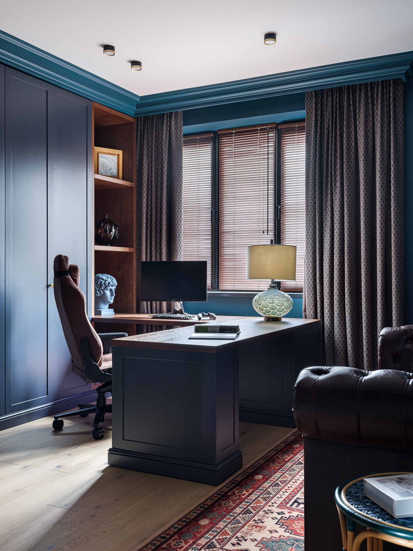 Кабинет получился самым спокойным и сдержанным по своему характеру. Здесь, как и во всех квартире преобладают темные оттенки: стены выкрашены в насыщенный глубокий синий цвет, который идеально гармонирует с темно-коричневым кожаным стеганным диваном, отсылающим нас к английскому стилю. Серый встроенный стеллаж, также, подчеркивает консервативность и сдержанность пространства. Ярким акцентом в помещении - служит оранжевая голова Давида, которая разбавляет строгую атмосферу помещения.