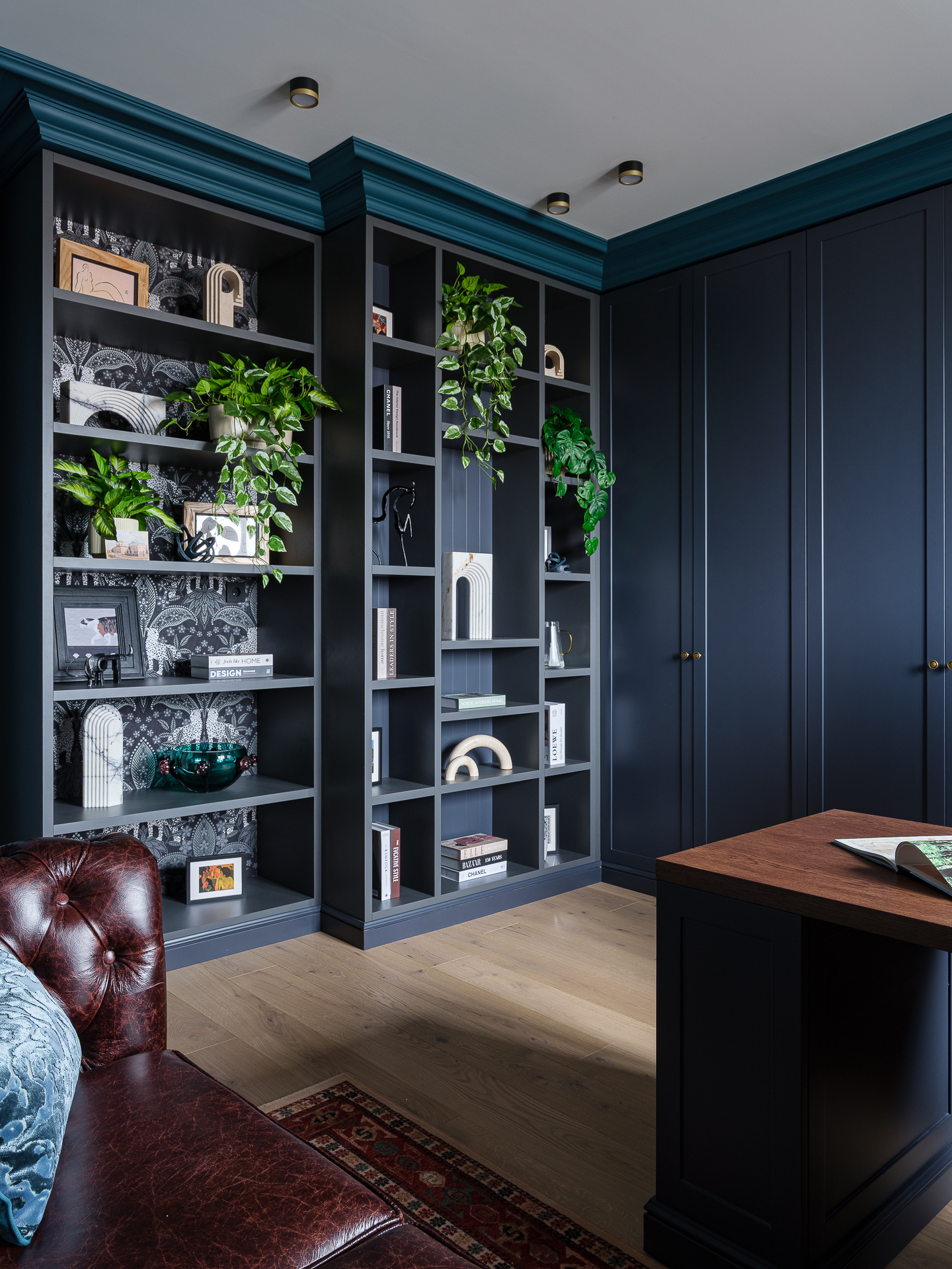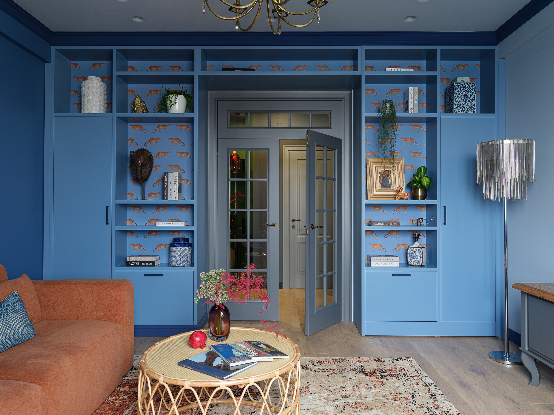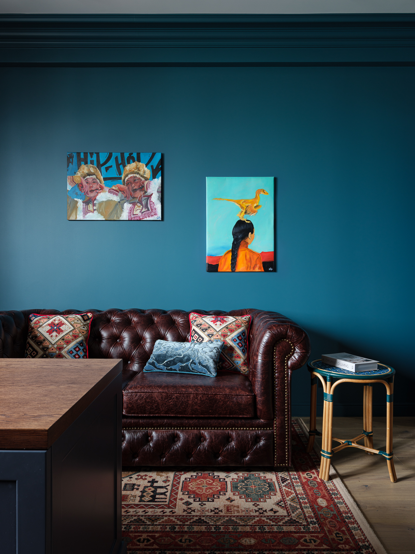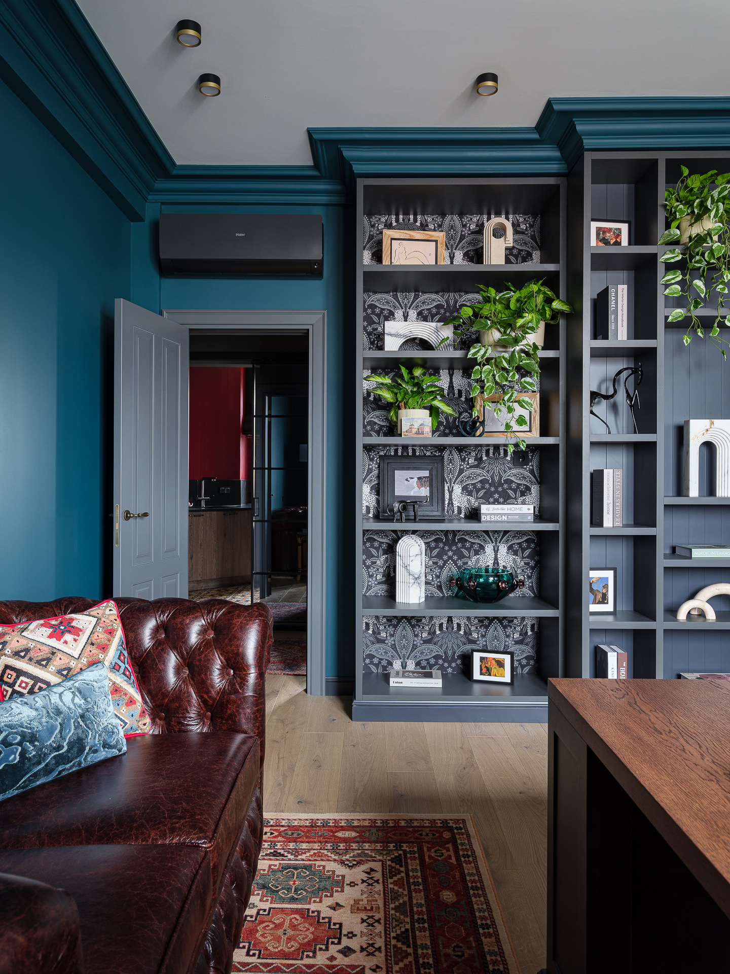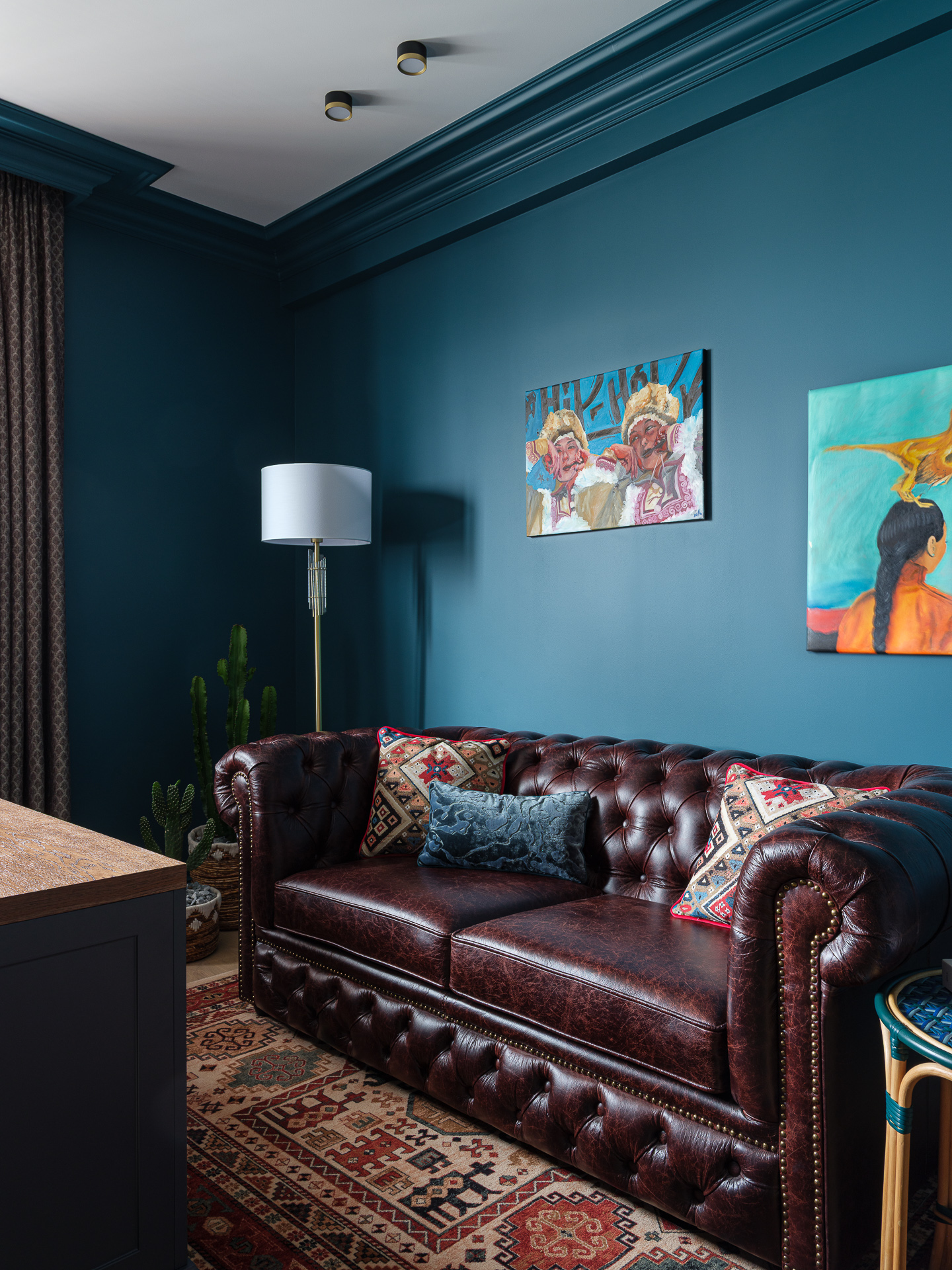 Кабинет получился самым спокойным и сдержанным по своему характеру. Здесь, как и во всех квартире преобладают темные оттенки: стены выкрашены в насыщенный глубокий синий цвет, который идеально гармонирует с темно-коричневым кожаным стеганным диваном, отсылающим нас к английскому стилю. Серый встроенный стеллаж, также, подчеркивает консервативность и сдержанность пространства. Ярким акцентом в помещении - служит оранжевая голова Давида, которая разбавляет строгую атмосферу помещения.