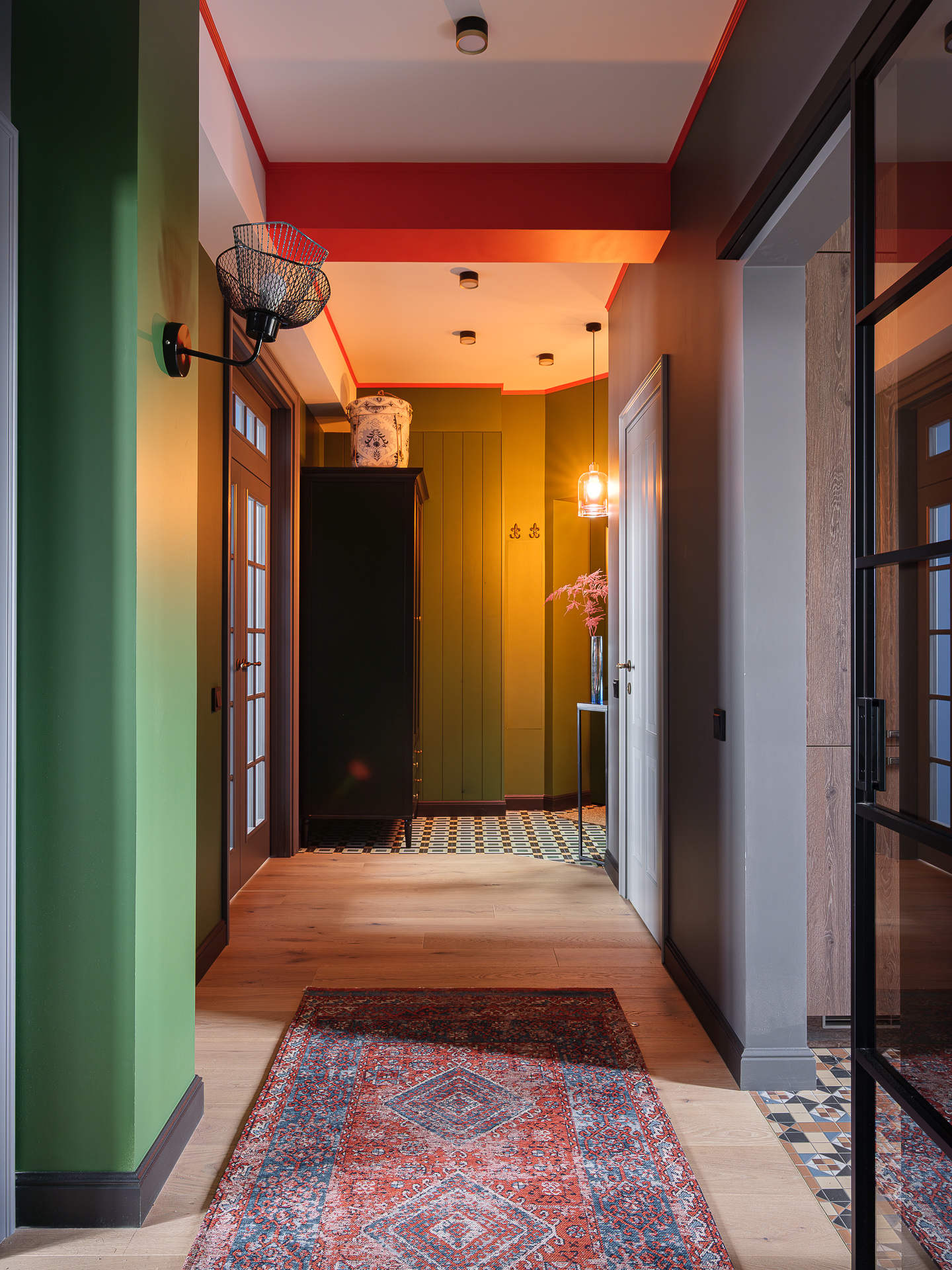 Для колорита, у консоли стоит этнический пуфик, в дополнении к которому над консолью игриво висят два жёлтых фонарика теплым светом и красной бахромой. Завершает весь концепт коридора – контрастный по своему сочетанию цветов этнический ковер, который также перекликается к этническими пуфиком и фонариками.