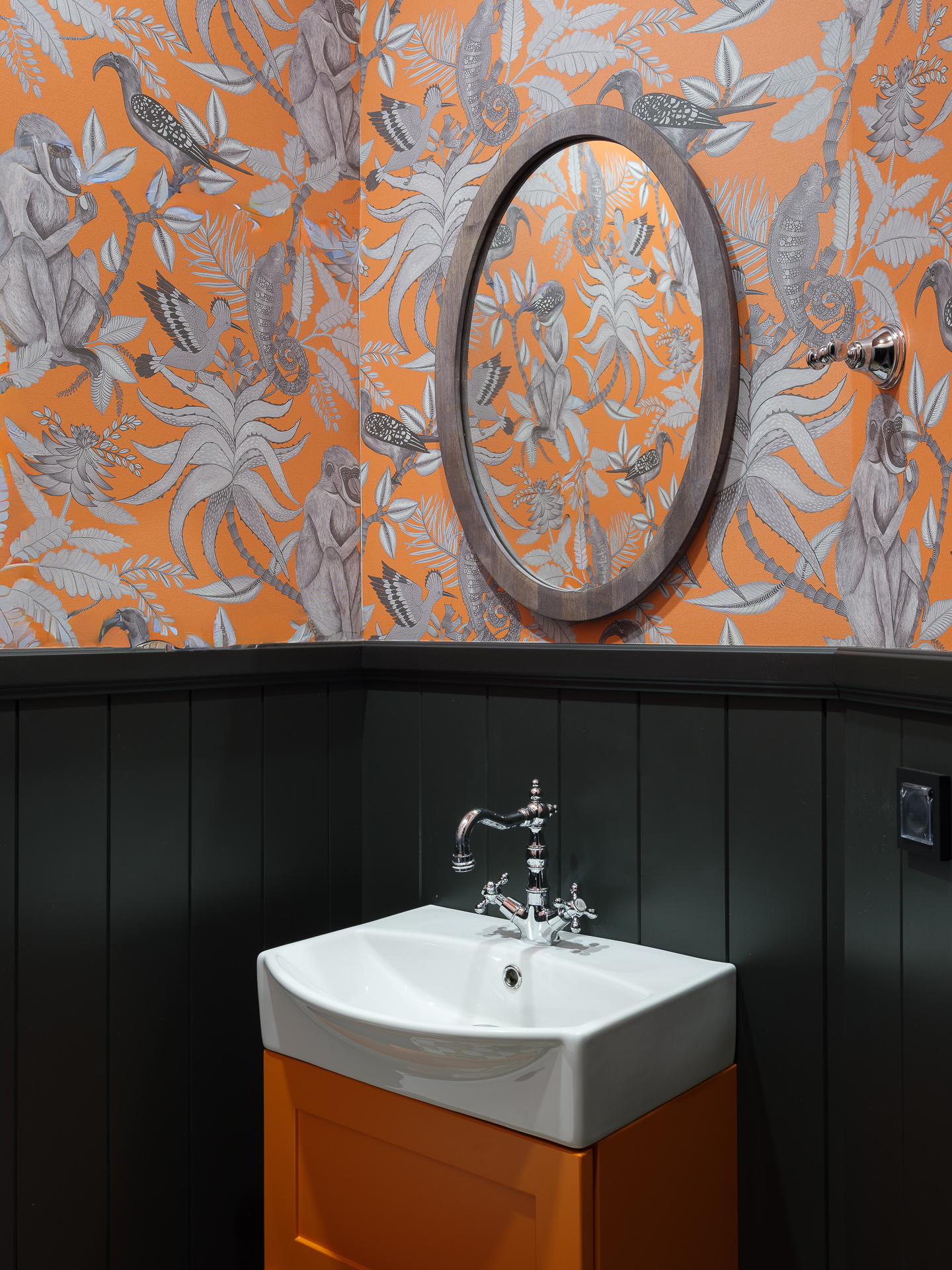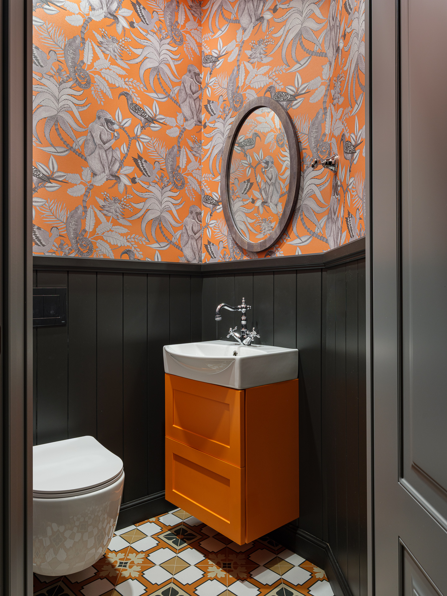 Гостевой санузел выполнен в винтажном стиле стиле по желанию заказчика. Здесь мы видим оранжевые обои с цветочными мотивами, переходящие в потолок и отделенные от него оранжевым карнизом.