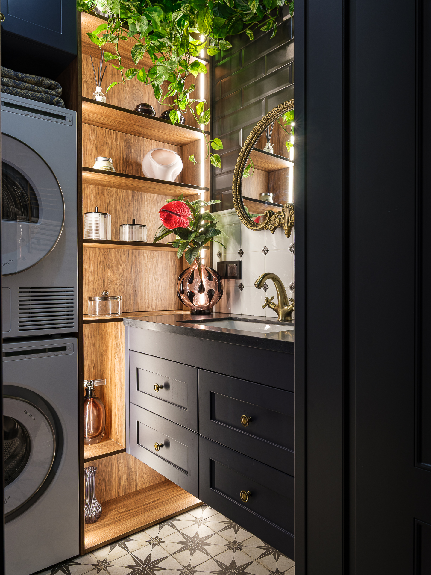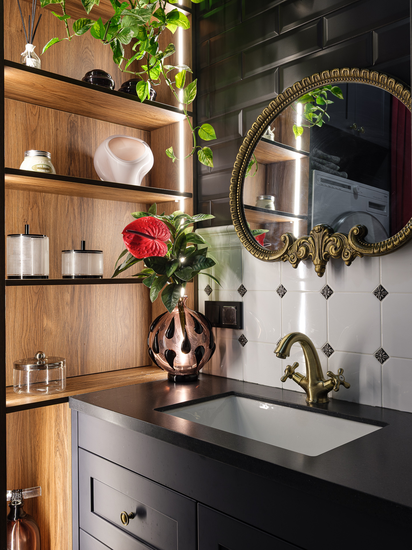 В ванной применены те же цветовые мотивы, что мы видим в спальне. Здесь мы использовали графитную плитку-кабанчик, в сочетании с полками открытого хранения в темном дереве. Также мы видим белый молдинг над раковиной. Эклектичность пространству придают навесные цветы и круглое зеркало в интересном кованном обрамлении.