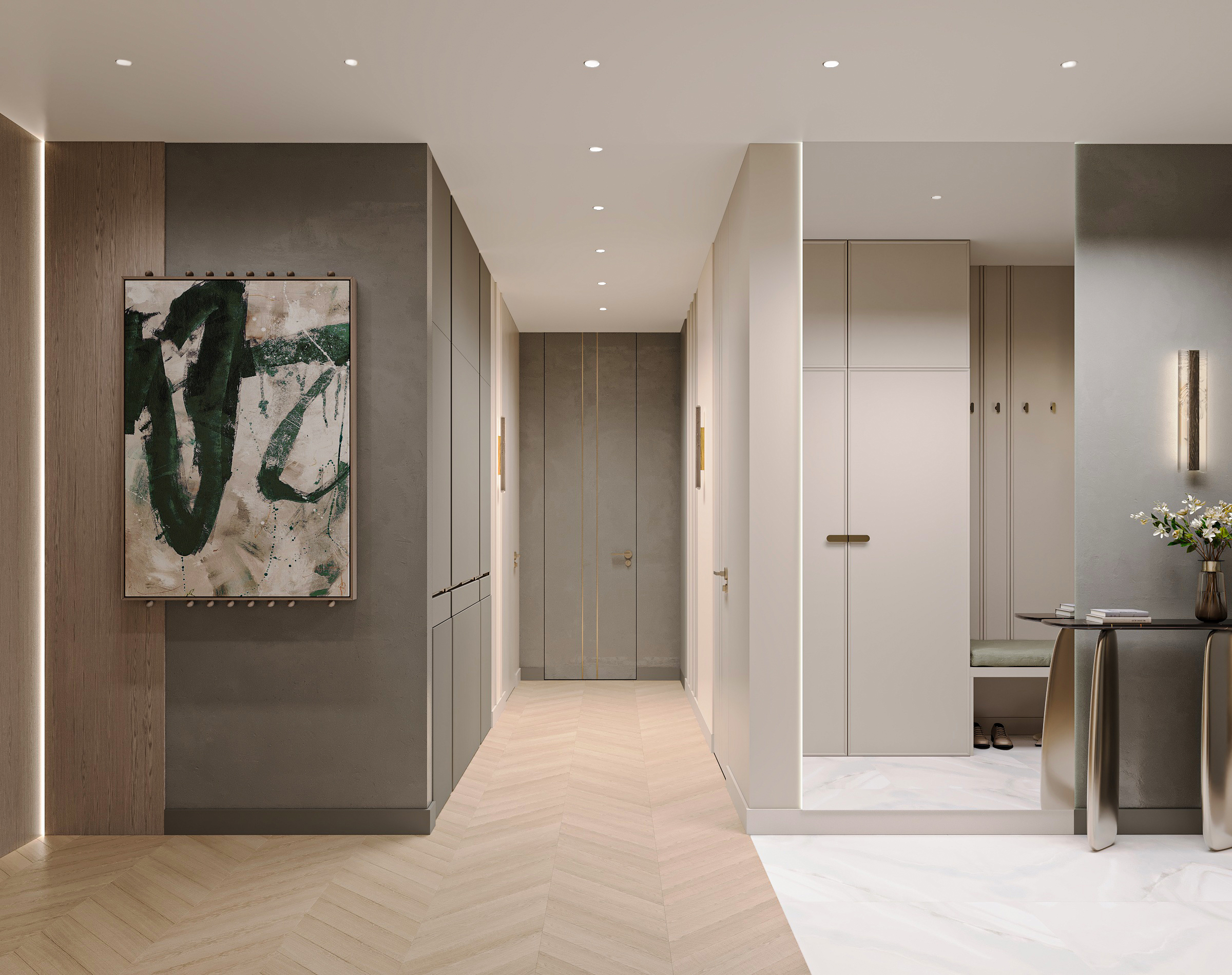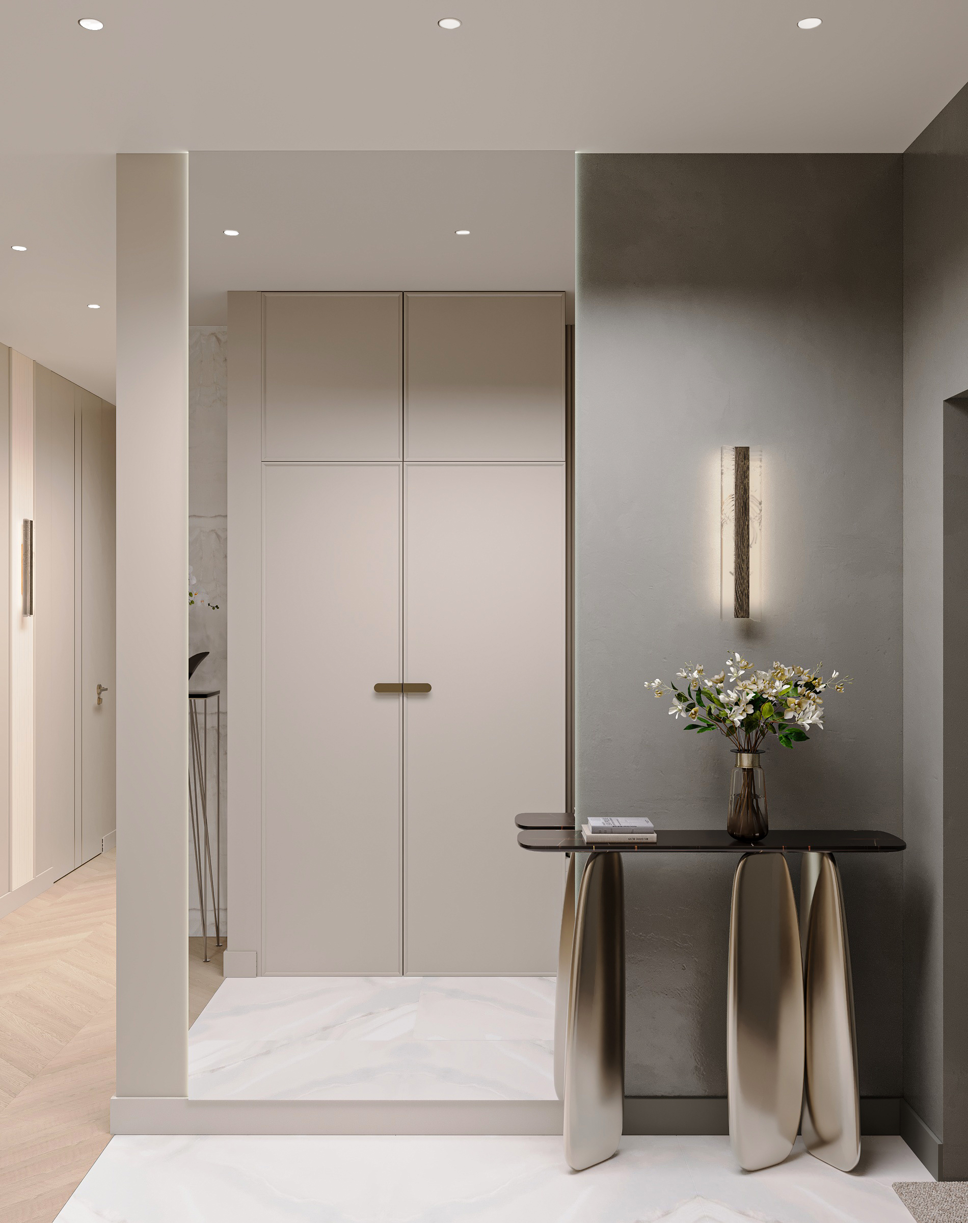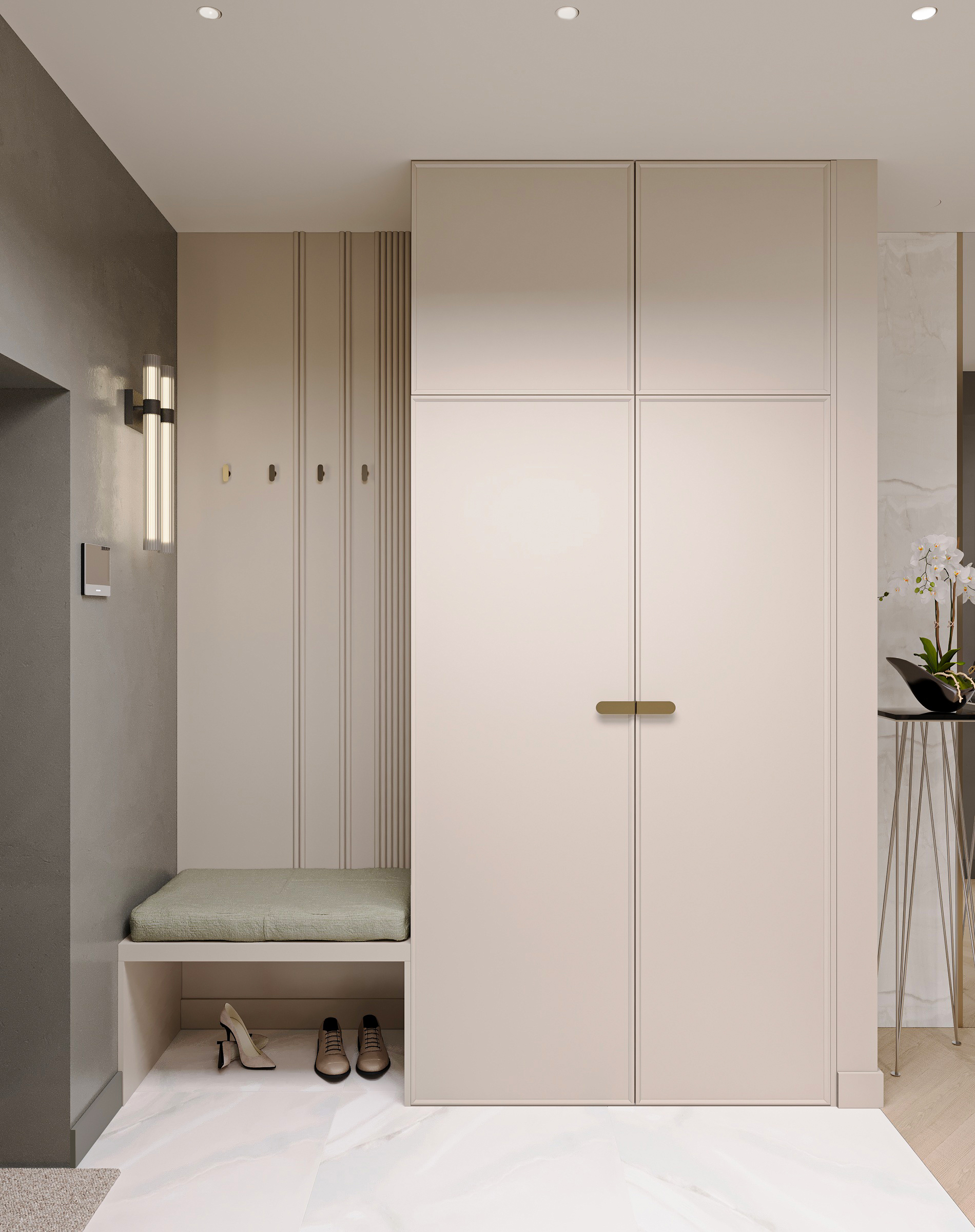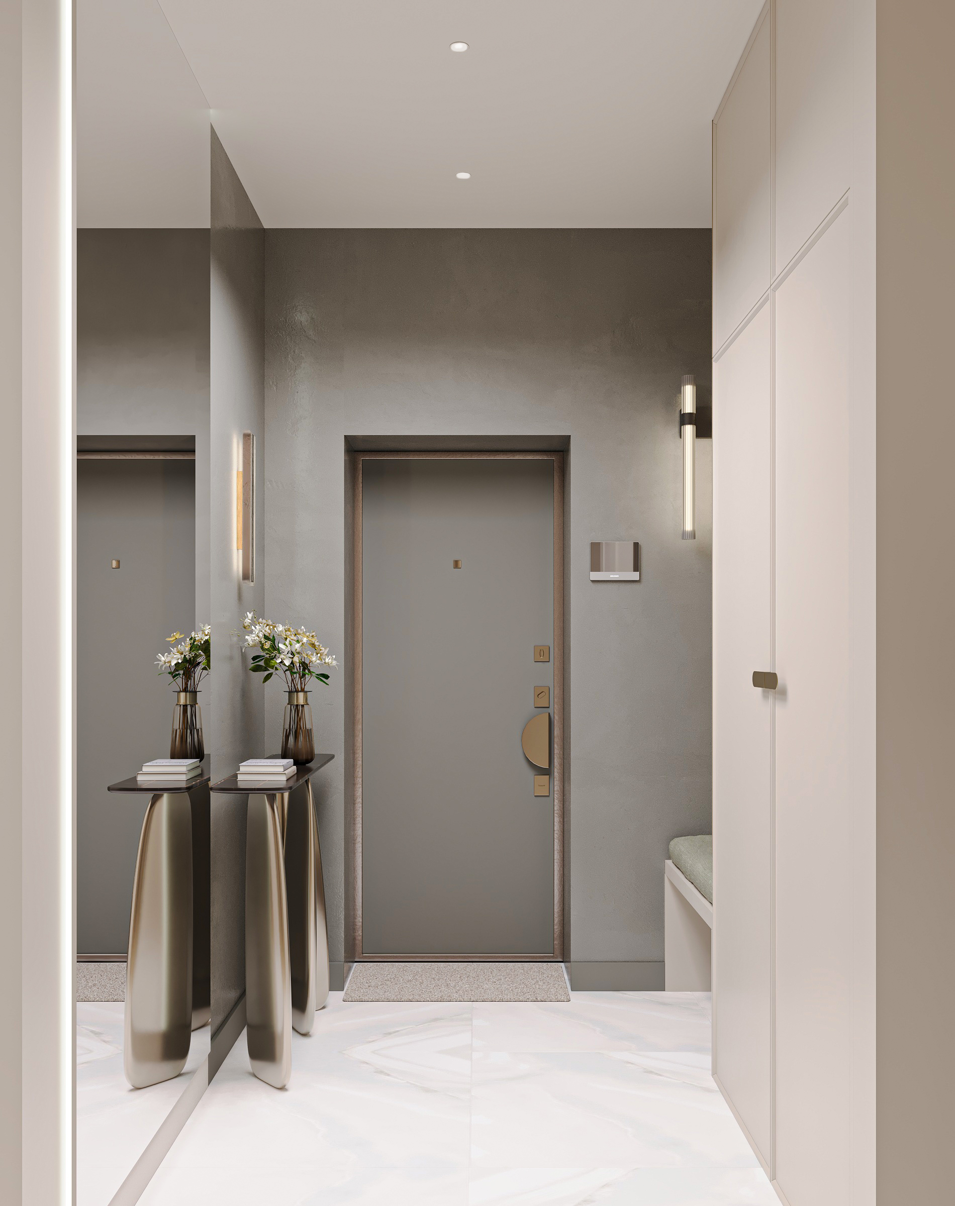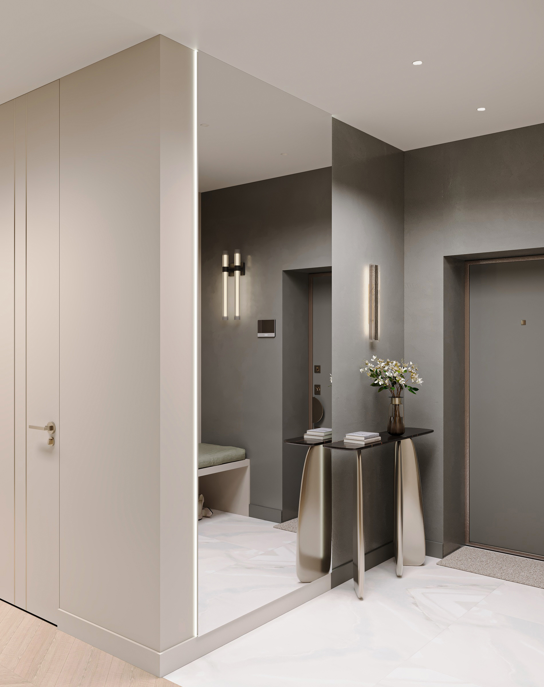 Дизайн прихожей выполнен в гармоничном сочетании мягких текстур и современных материалов. Зеркало с подсветкой и консолью на металлических ножках создаёт акцент, а шкаф с фасадами добавляет функциональности и уюта. Сдержанная гамма серо-бежевых оттенков, латунные акценты и мраморный керамогранит делают пространство элегантным и выразительным.