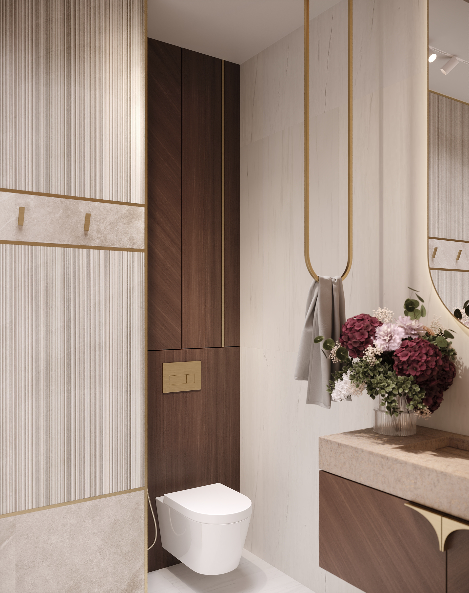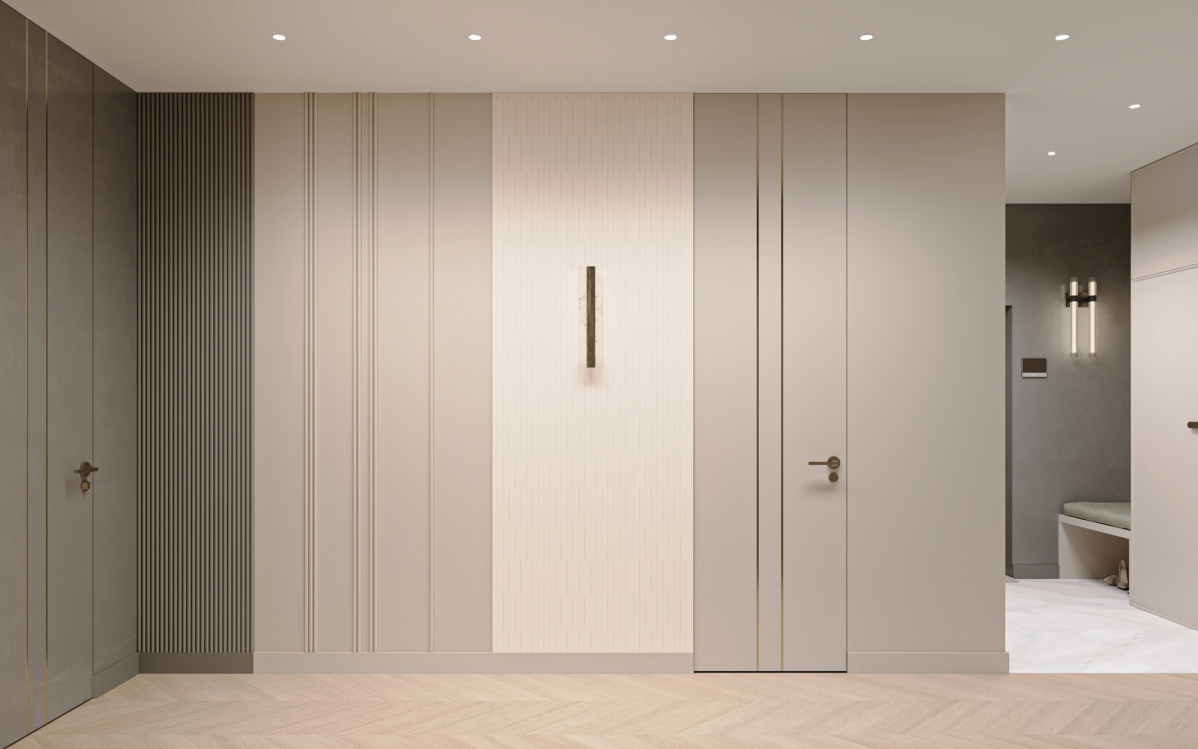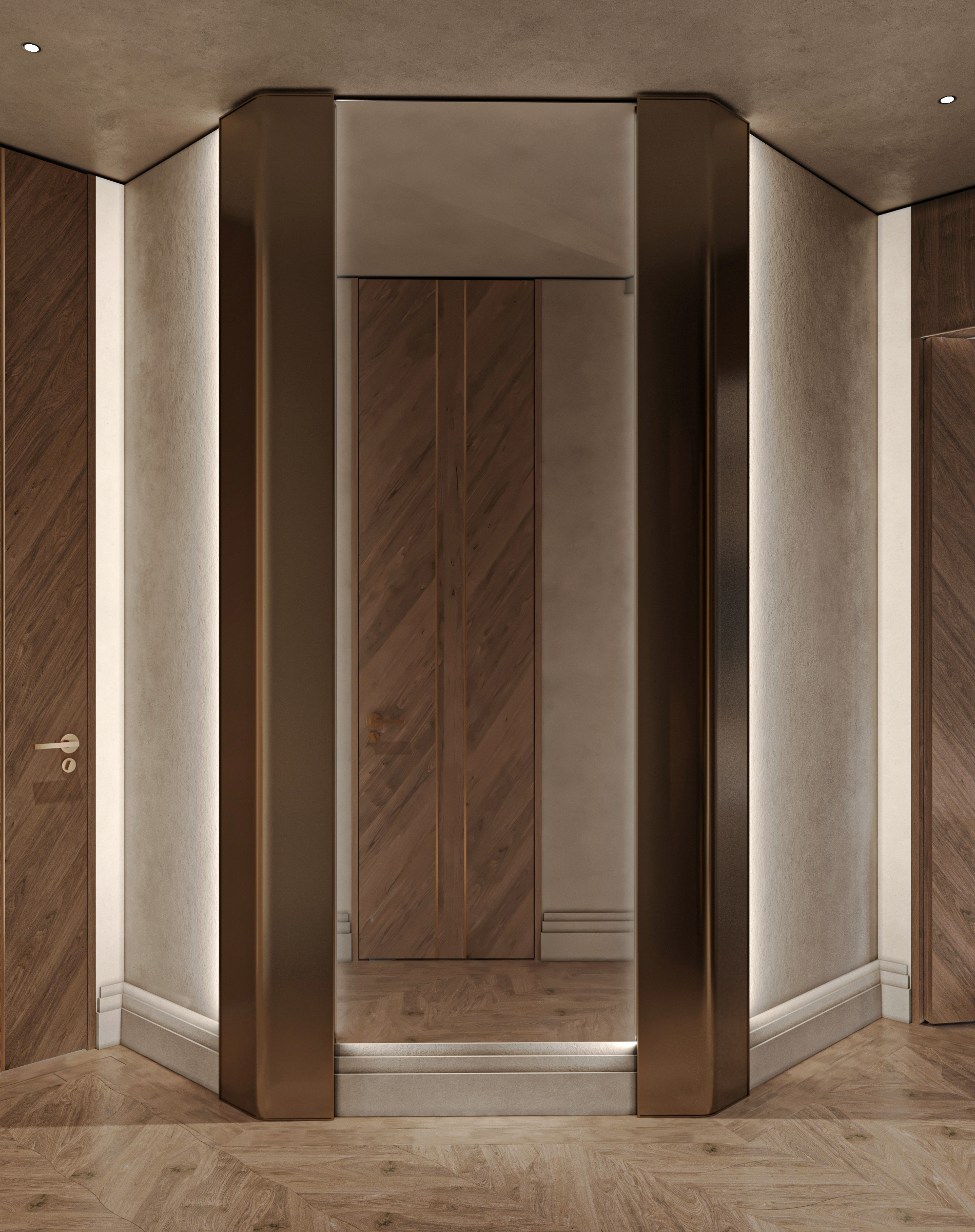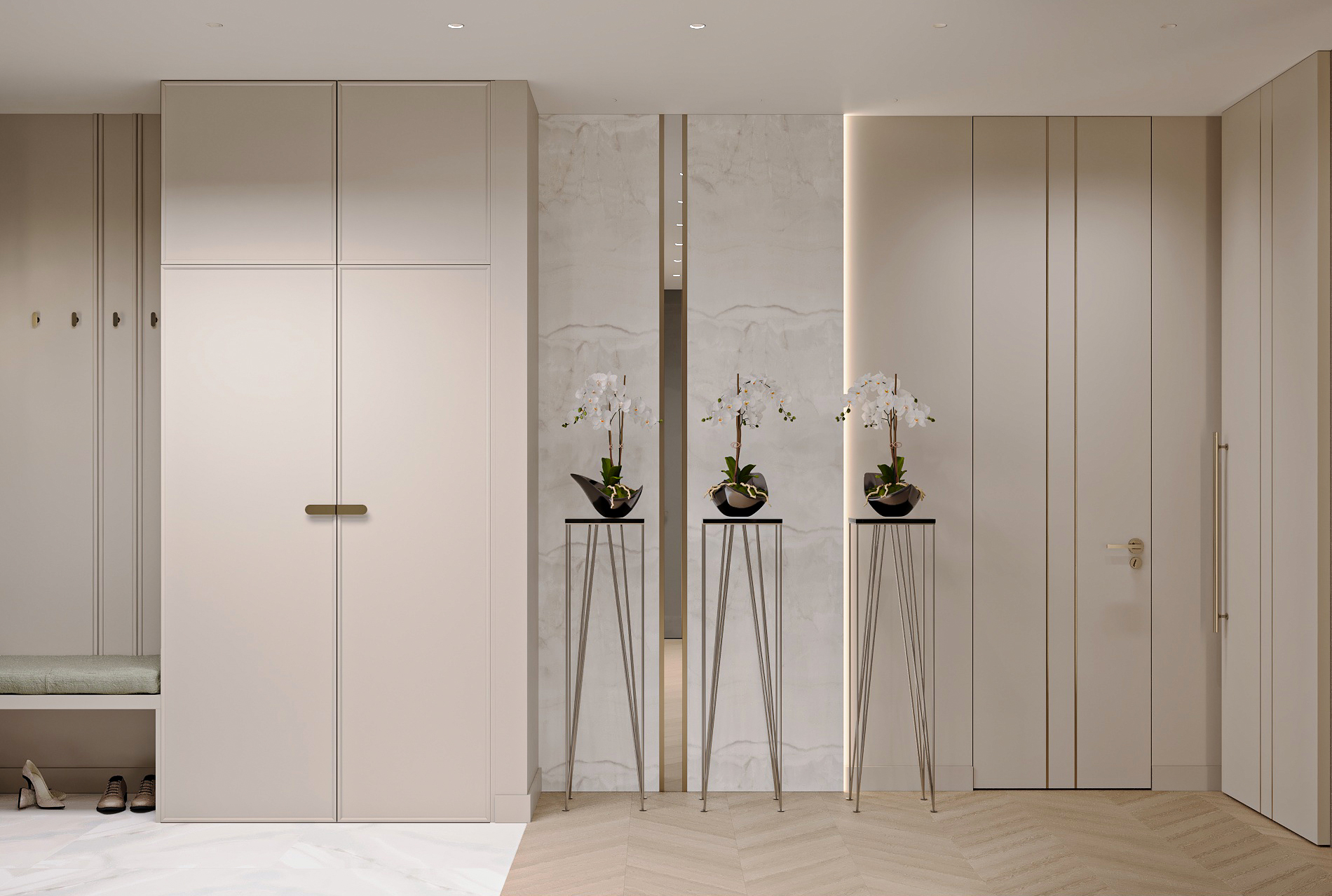 Дизайн прихожей выполнен в гармоничном сочетании мягких текстур и современных материалов. Зеркало с подсветкой и консолью на металлических ножках создаёт акцент, а шкаф с фасадами добавляет функциональности и уюта. Сдержанная гамма серо-бежевых оттенков, латунные акценты и мраморный керамогранит делают пространство элегантным и выразительным.