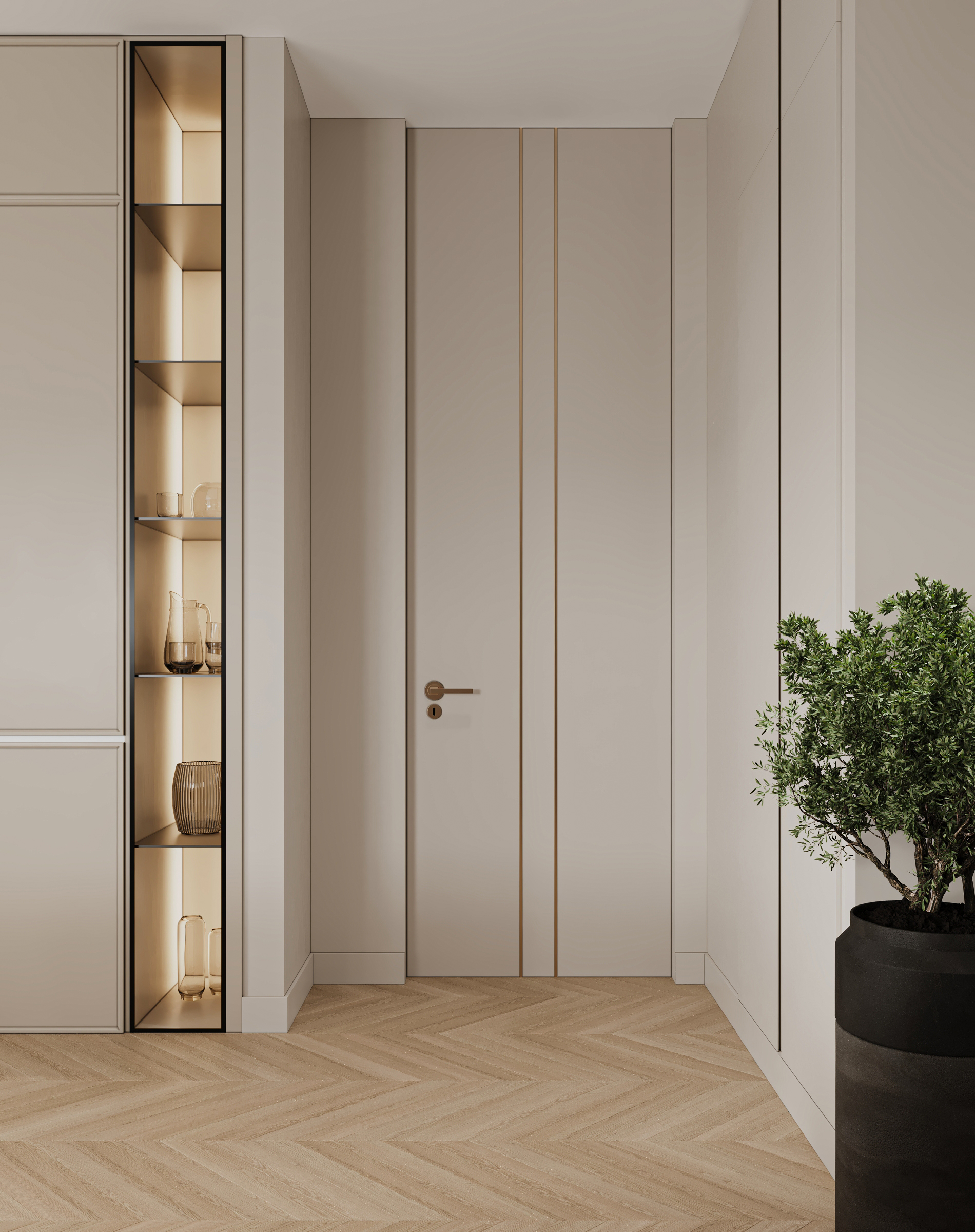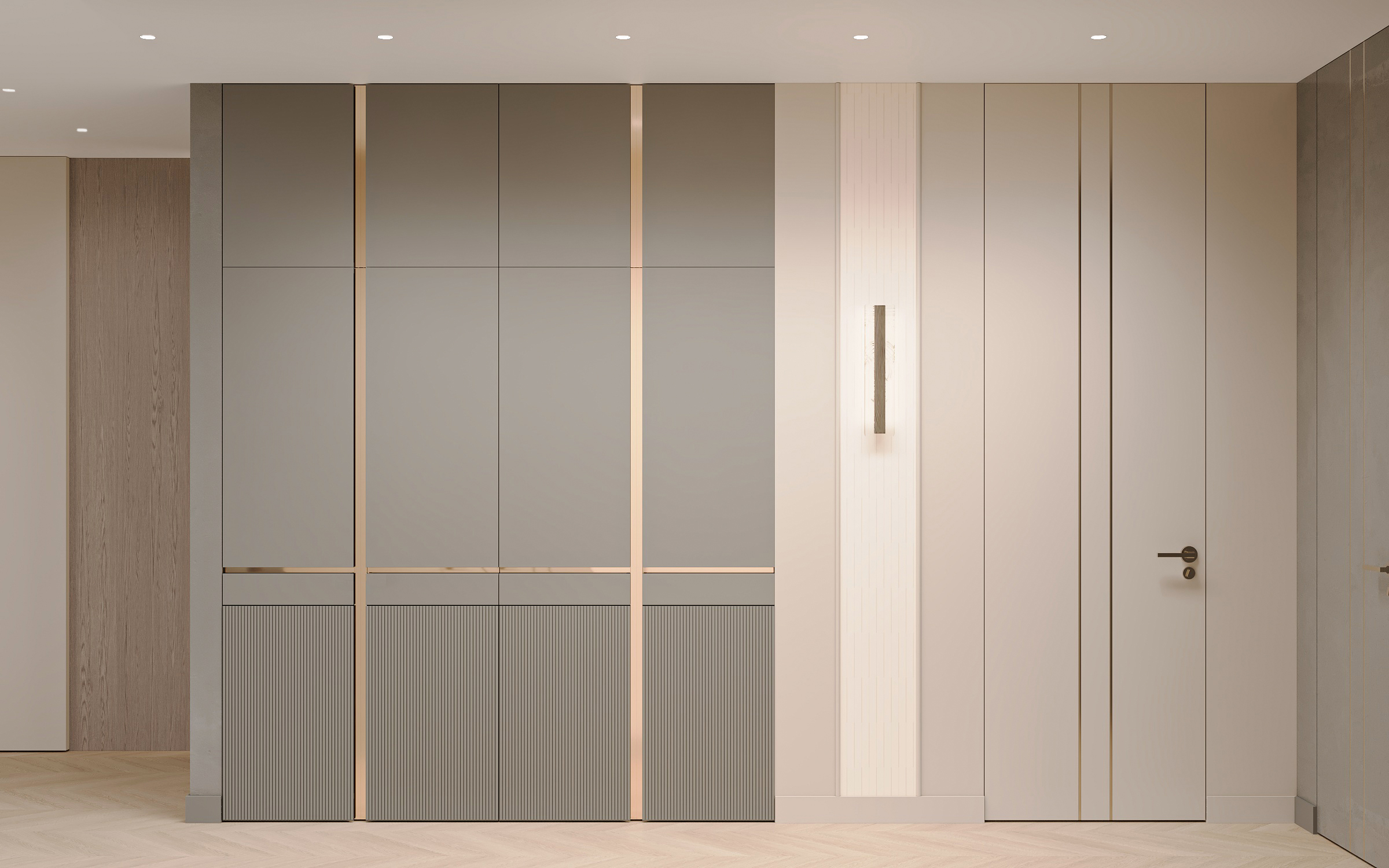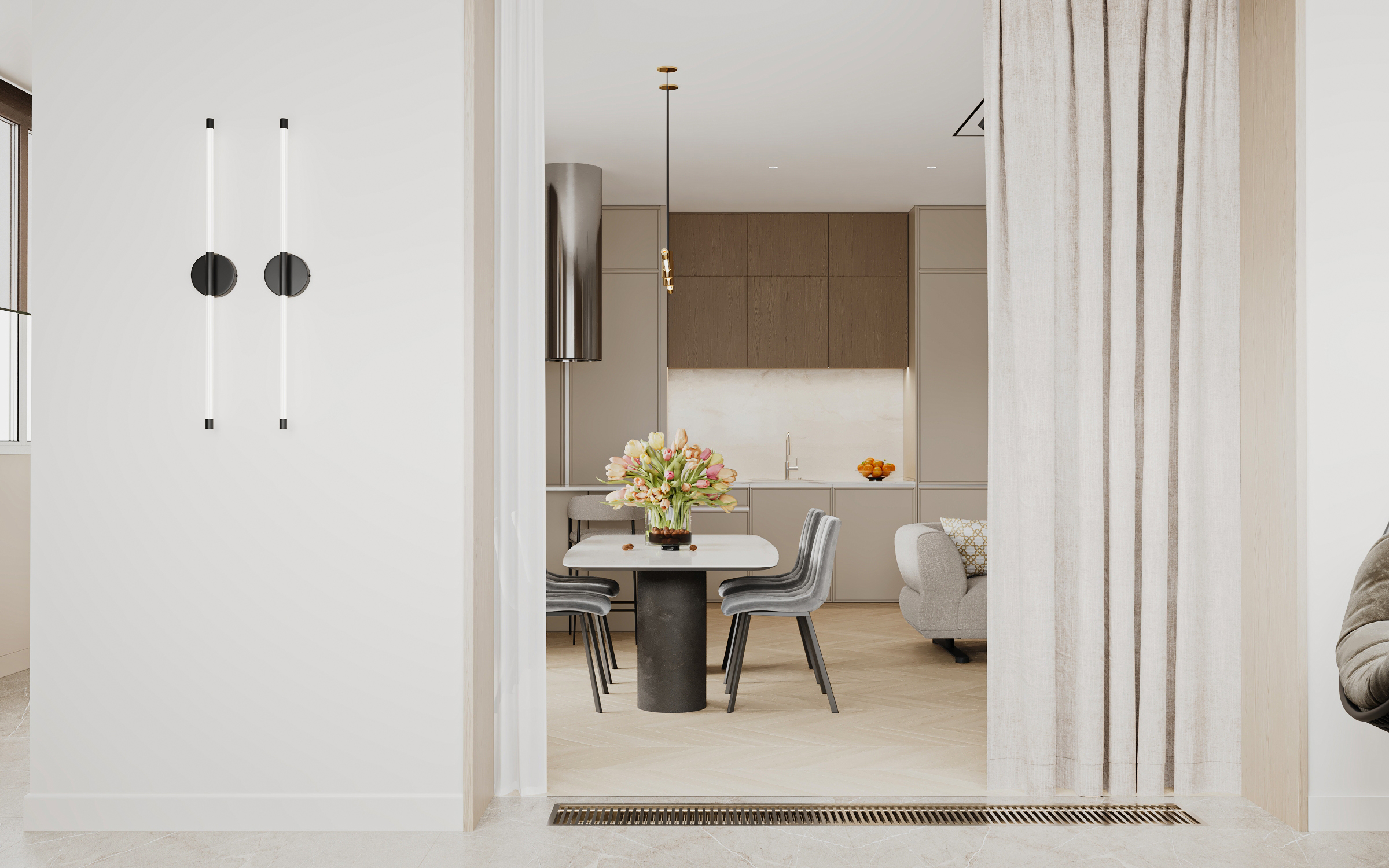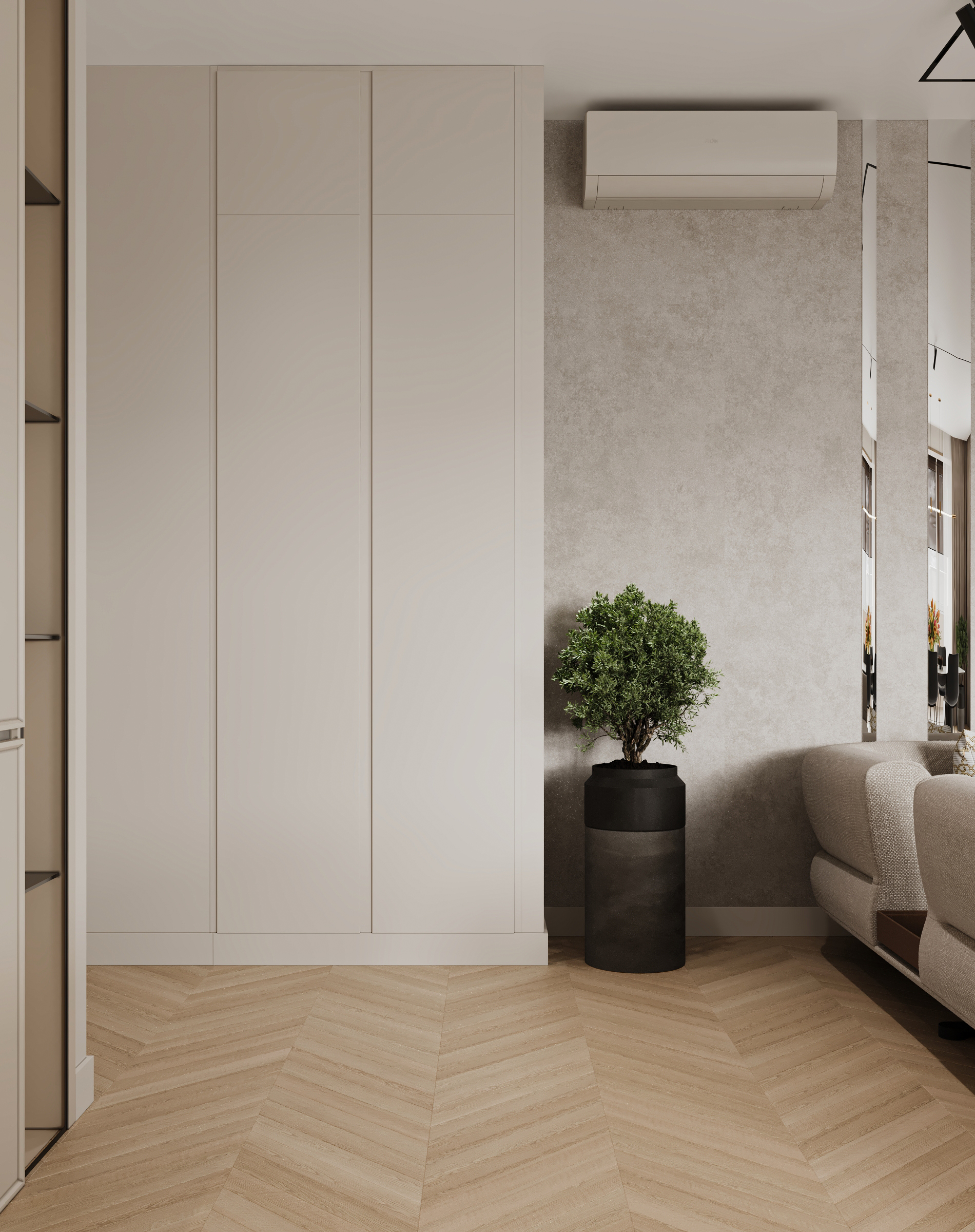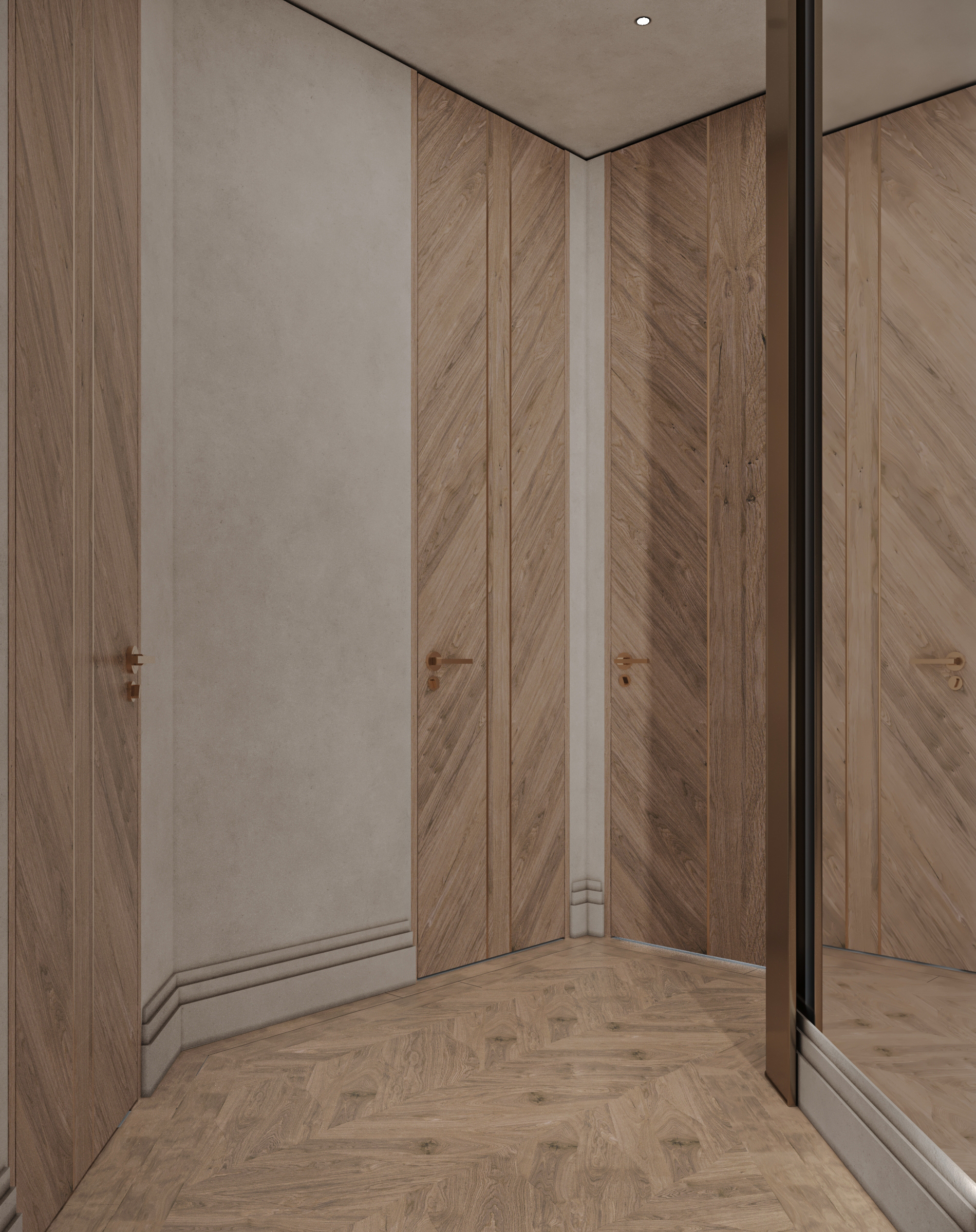 Дизайн прихожей выполнен в гармоничном сочетании мягких текстур и современных материалов. Зеркало с подсветкой и консолью на металлических ножках создаёт акцент, а шкаф с фасадами добавляет функциональности и уюта. Сдержанная гамма серо-бежевых оттенков, латунные акценты и мраморный керамогранит делают пространство элегантным и выразительным.