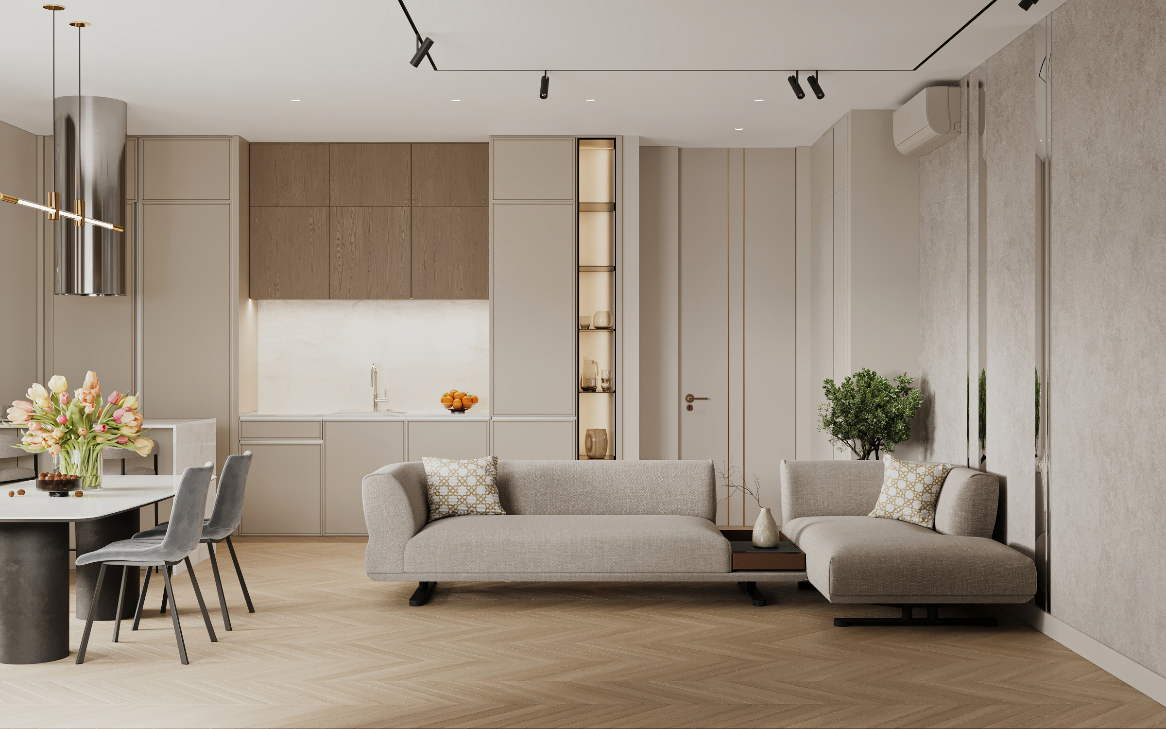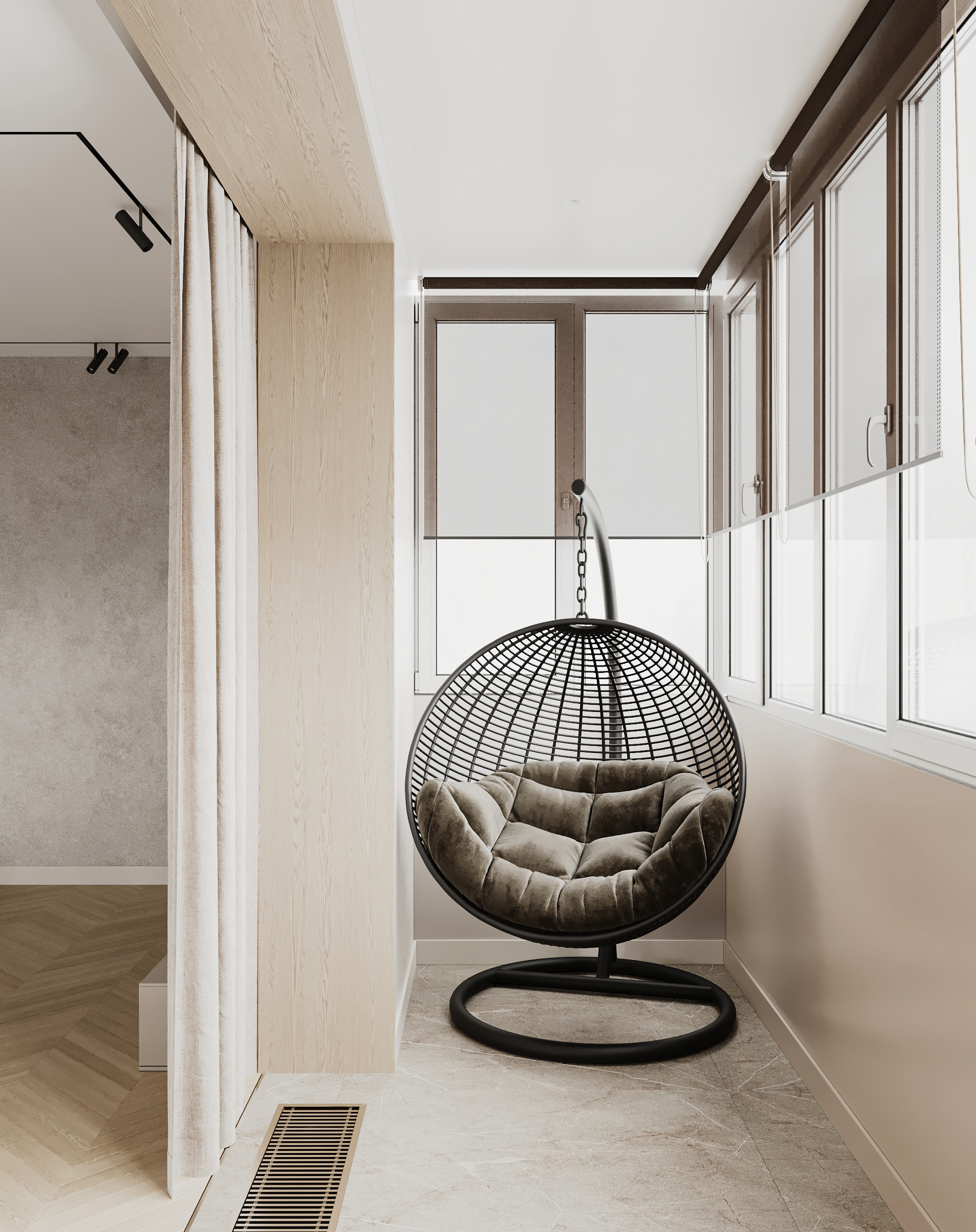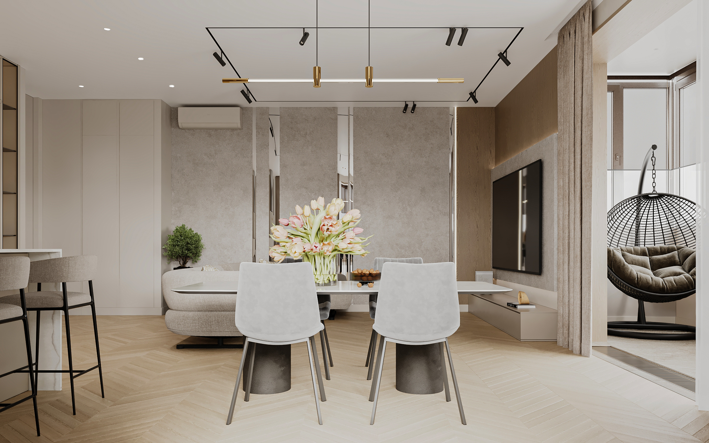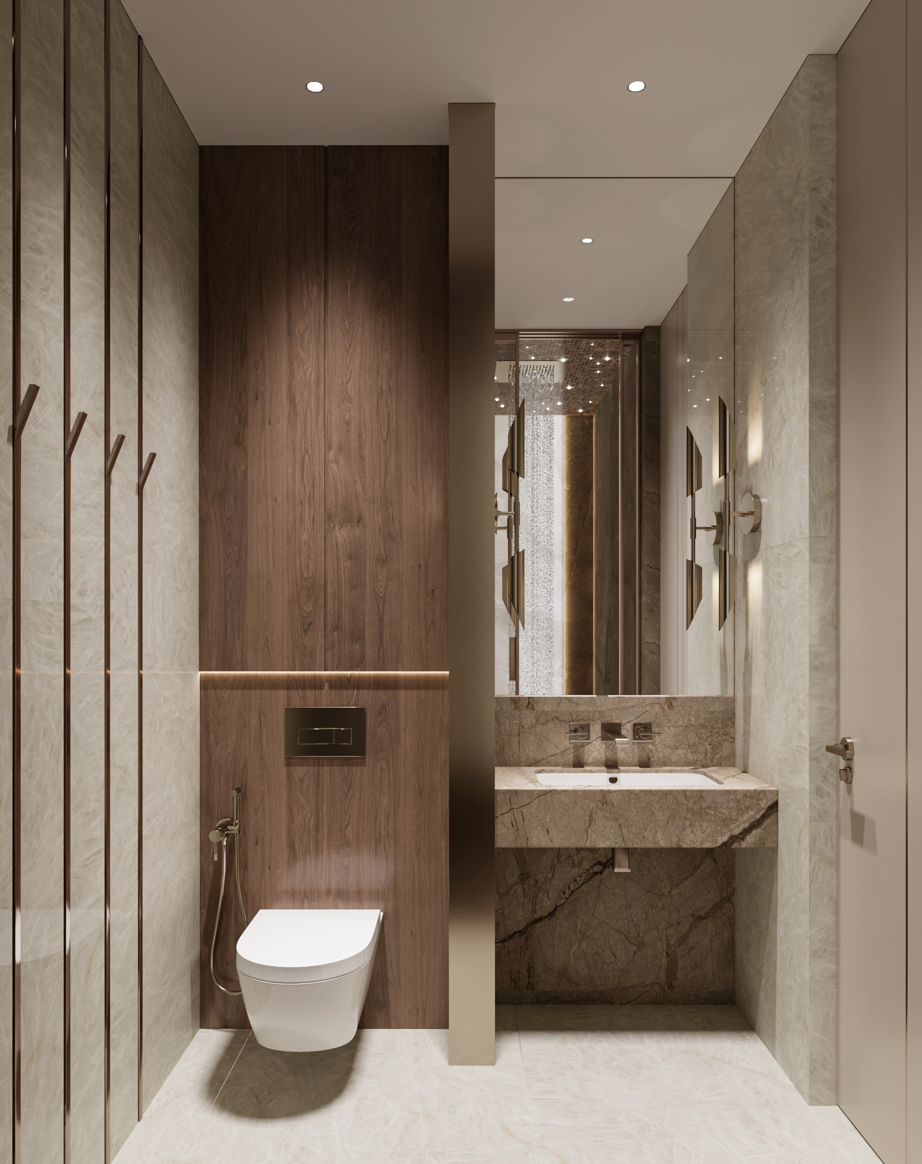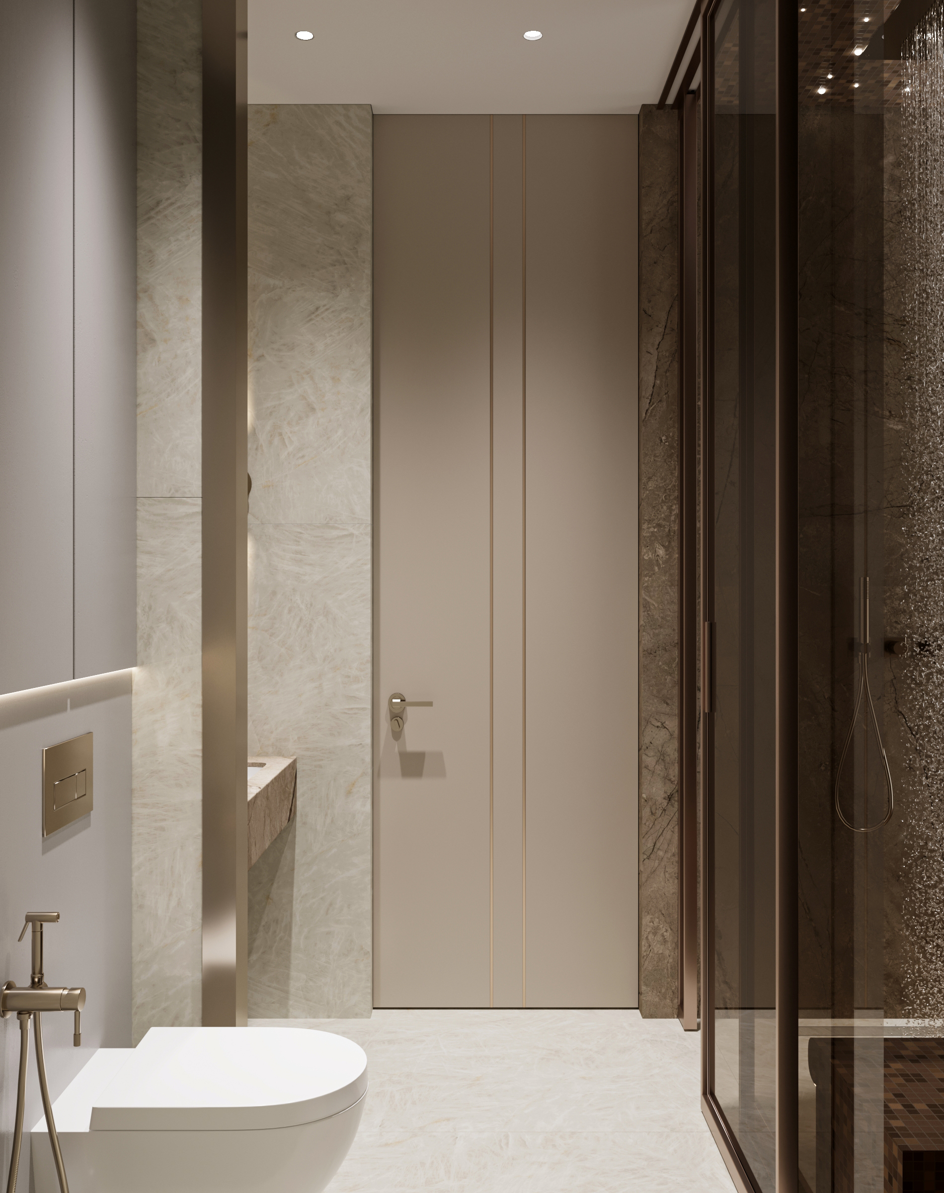 Дизайн прихожей выполнен в гармоничном сочетании мягких текстур и современных материалов. Зеркало с подсветкой и консолью на металлических ножках создаёт акцент, а шкаф с фасадами добавляет функциональности и уюта. Сдержанная гамма серо-бежевых оттенков, латунные акценты и мраморный керамогранит делают пространство элегантным и выразительным.