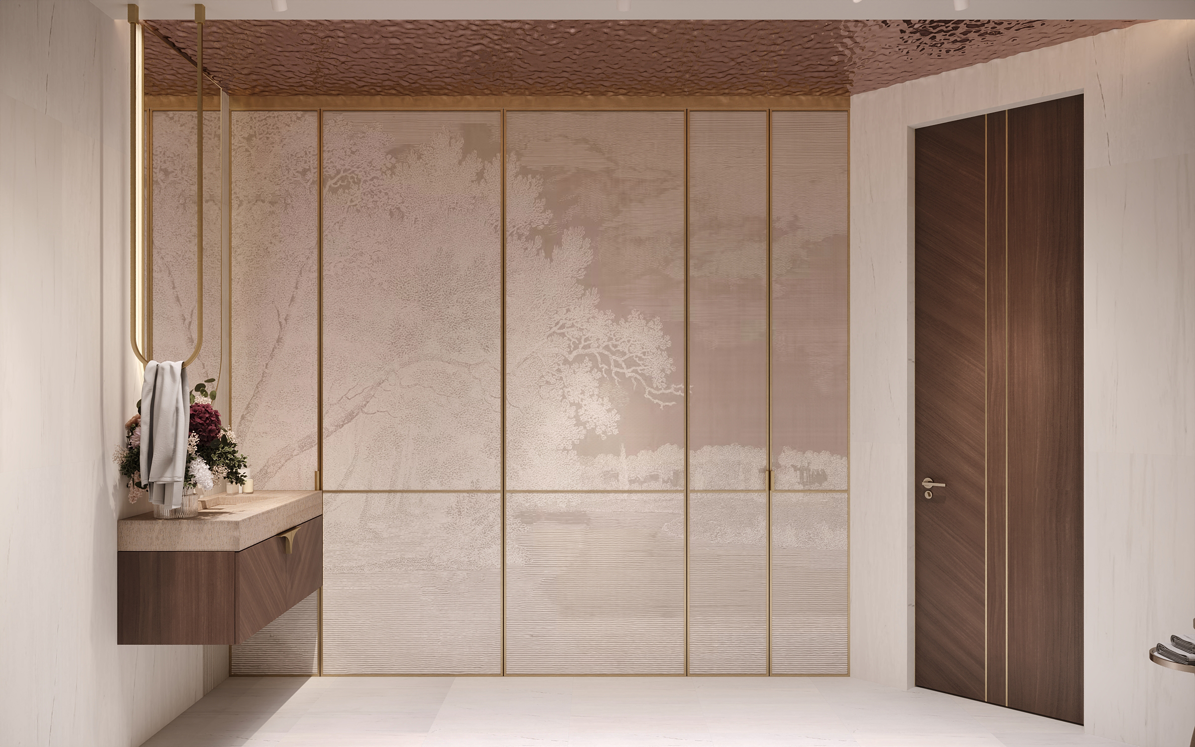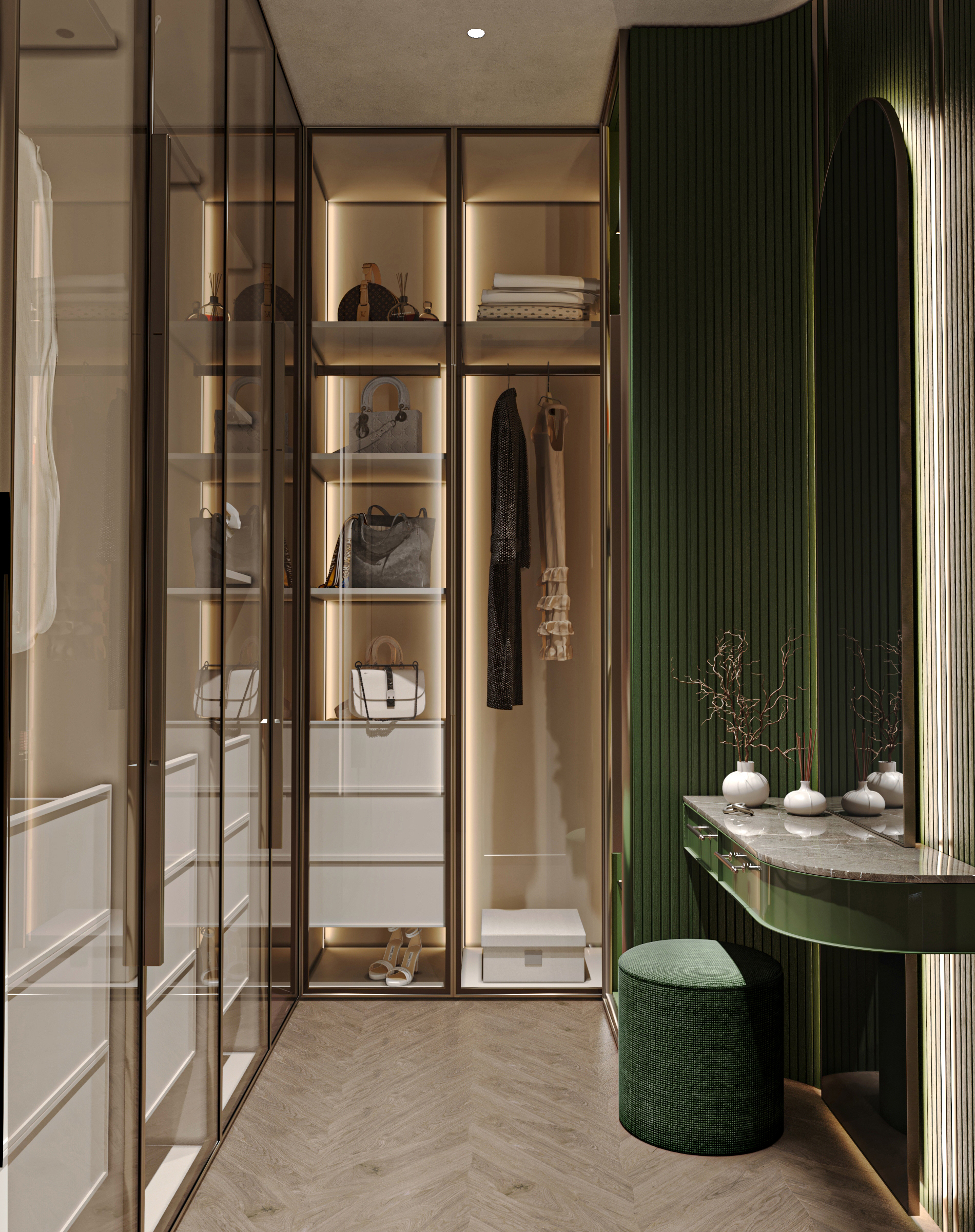 В этом же цвете решена и будуарная зона. Её мягкую скруглённую форму подчёркивает обивка из тонкого велюра, поднимающаяся до самого потолка. Арочное зеркало в нише с подсветкой повторяет изгибы, усиливая ощущение уюта. Столешница из бежевого камня с латунными элементами гармонирует со стеклянными фасадами вишнёвых ящиков.