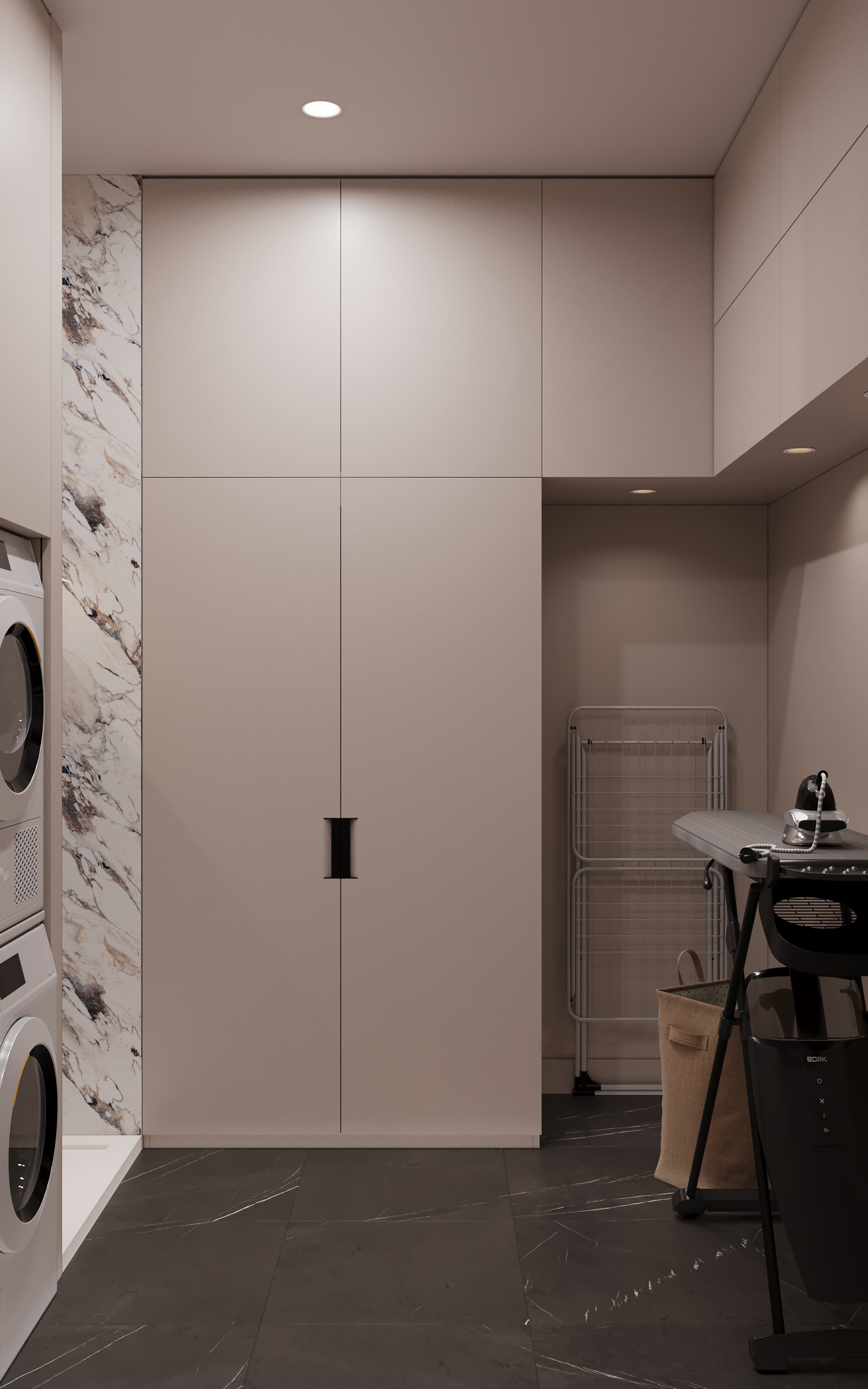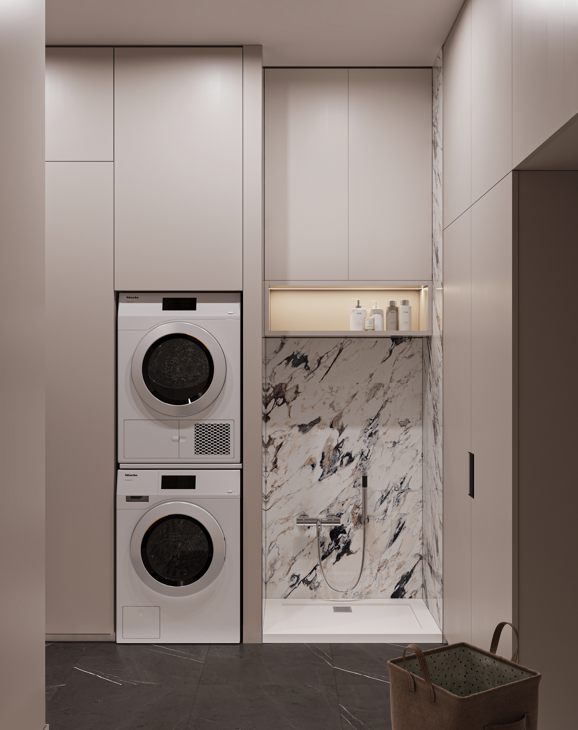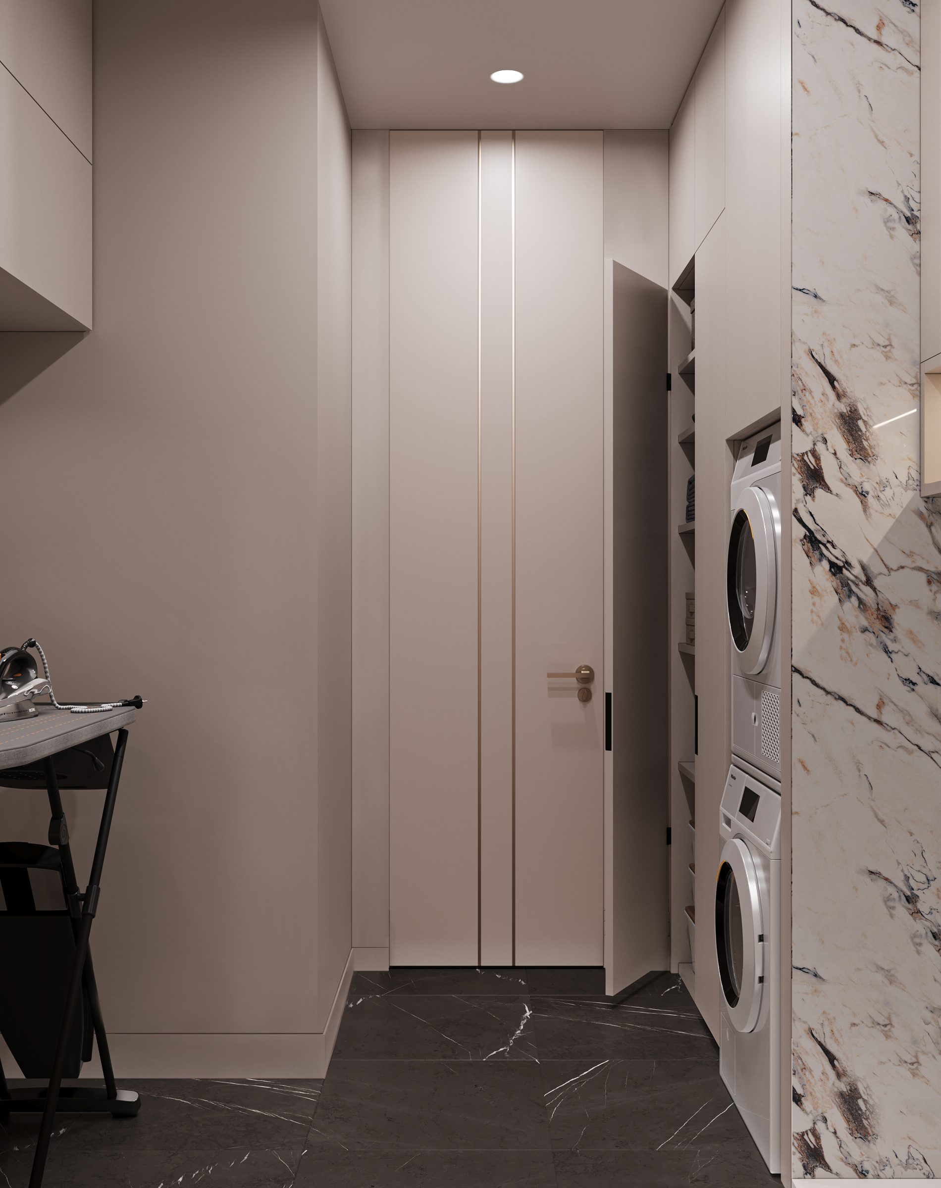 Постирочная комната, несмотря на утилитарность, полностью соответствует общей стилистике квартиры — это лаконичное и строгое пространство.