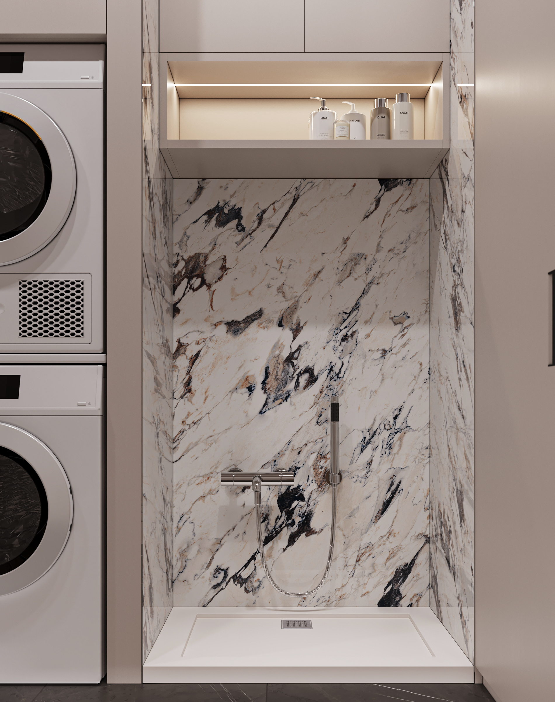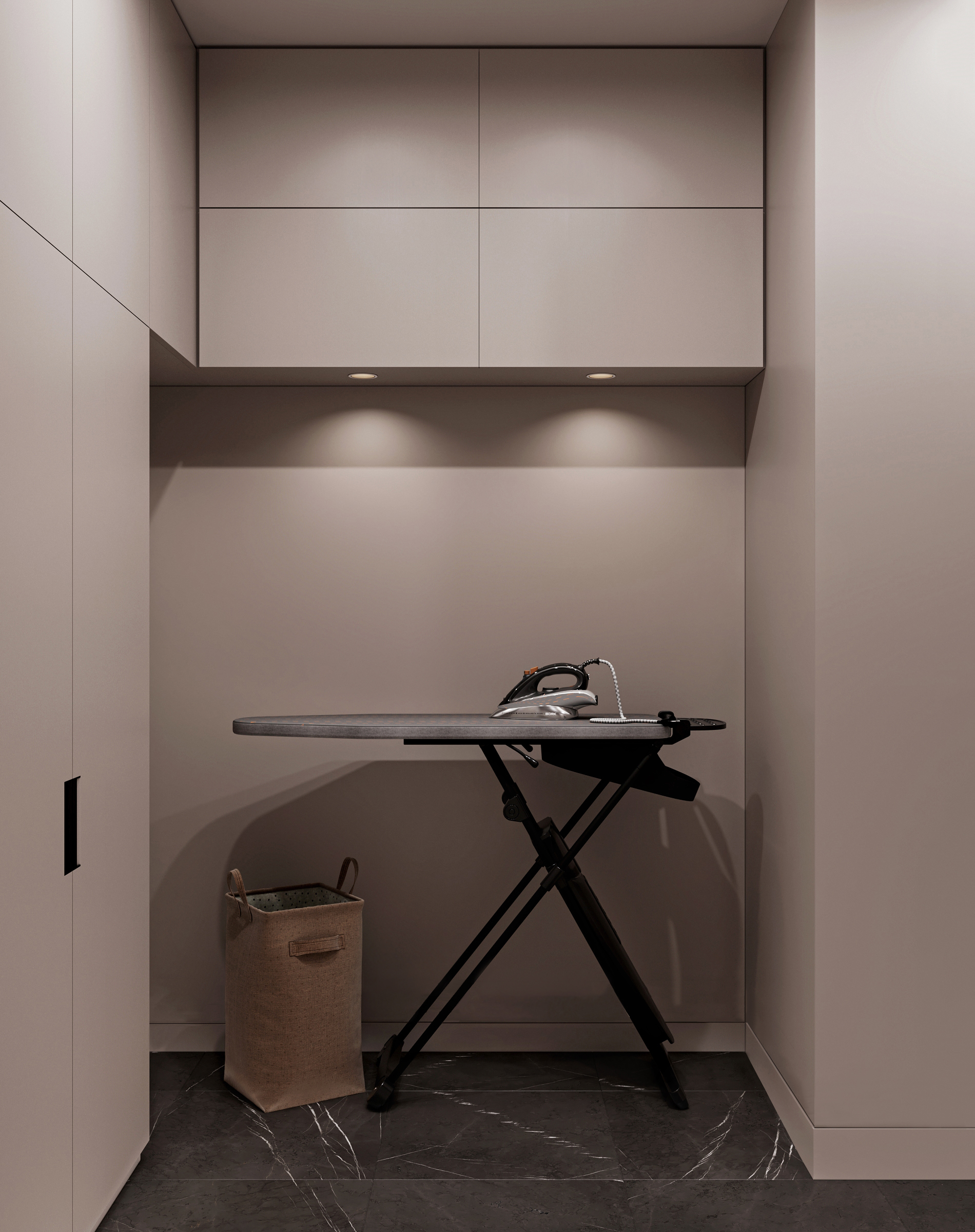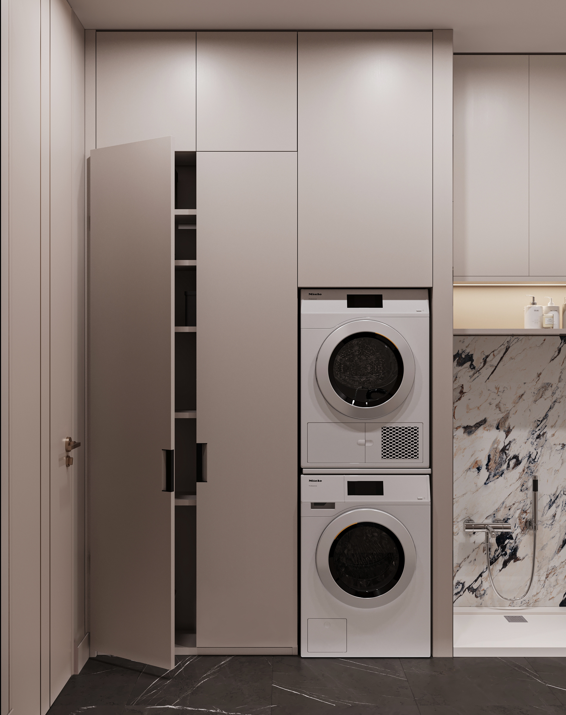Постирочная комната, несмотря на утилитарность, полностью соответствует общей стилистике квартиры — это лаконичное и строгое пространство.