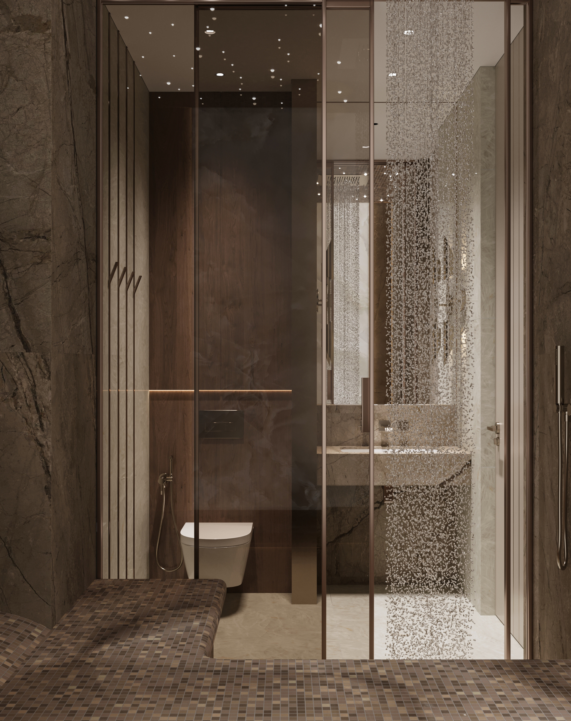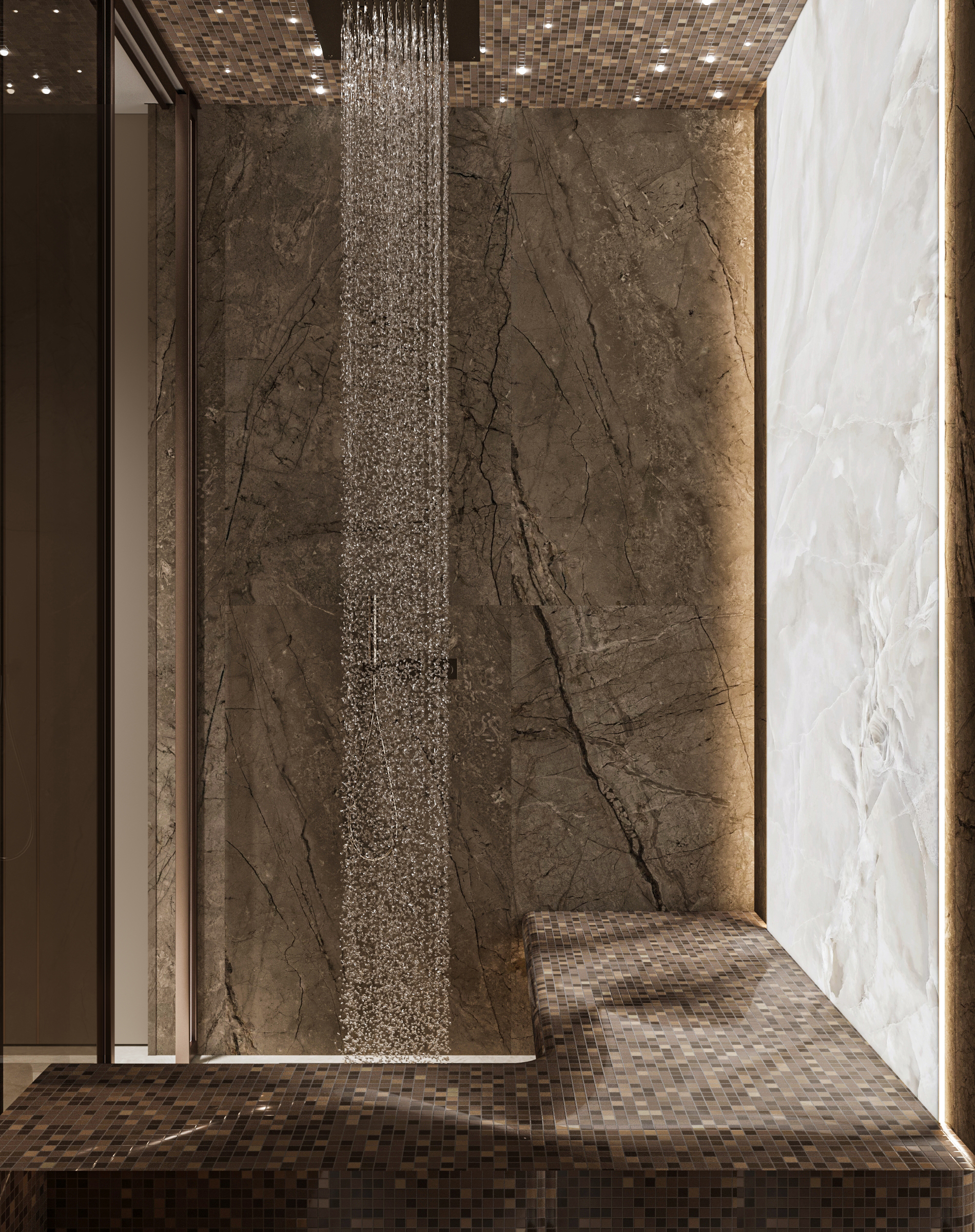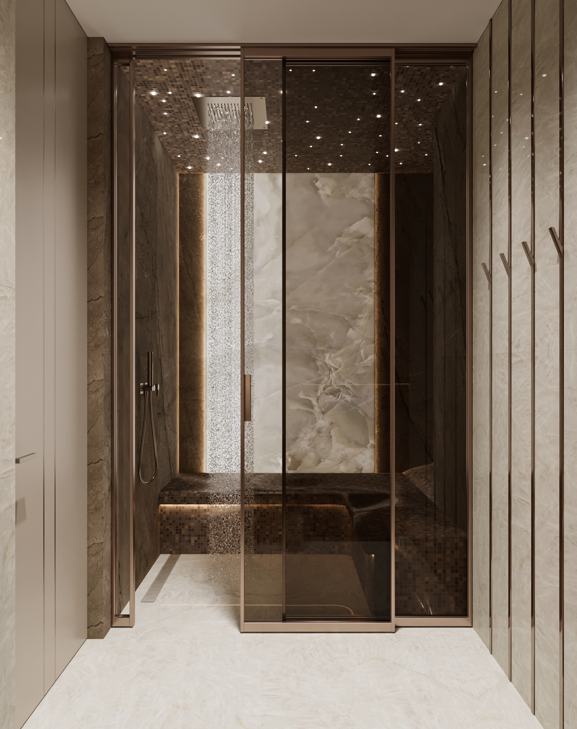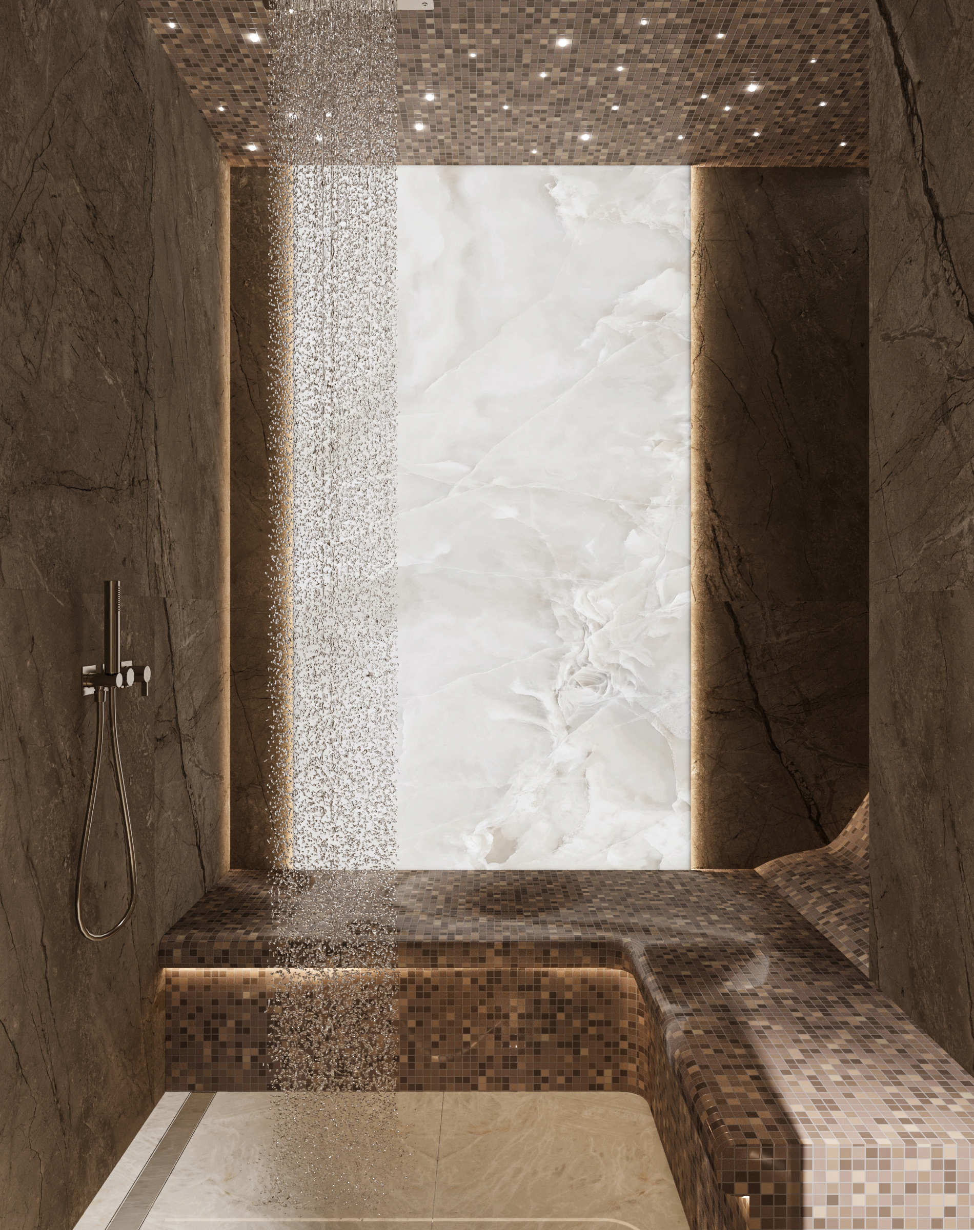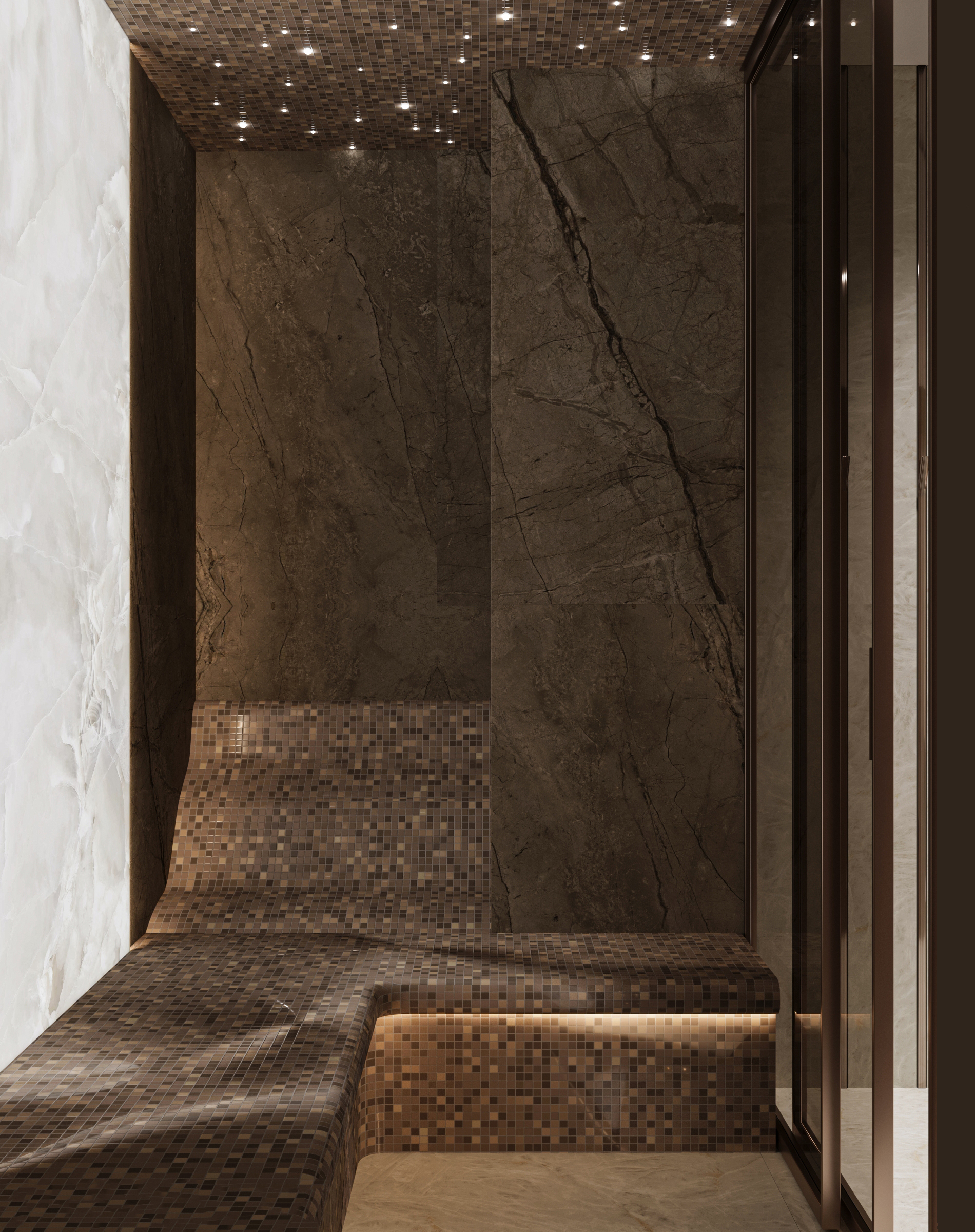 - Зона хаммама: Здесь царит камерная атмосфера, которую создаёт светящаяся панель из оникса. Чтобы пространство визуально не дробилось, пол выполнен в едином покрытии на всю зону, а перегородка — из лёгкого тонированного стекла в металлическом профиле.