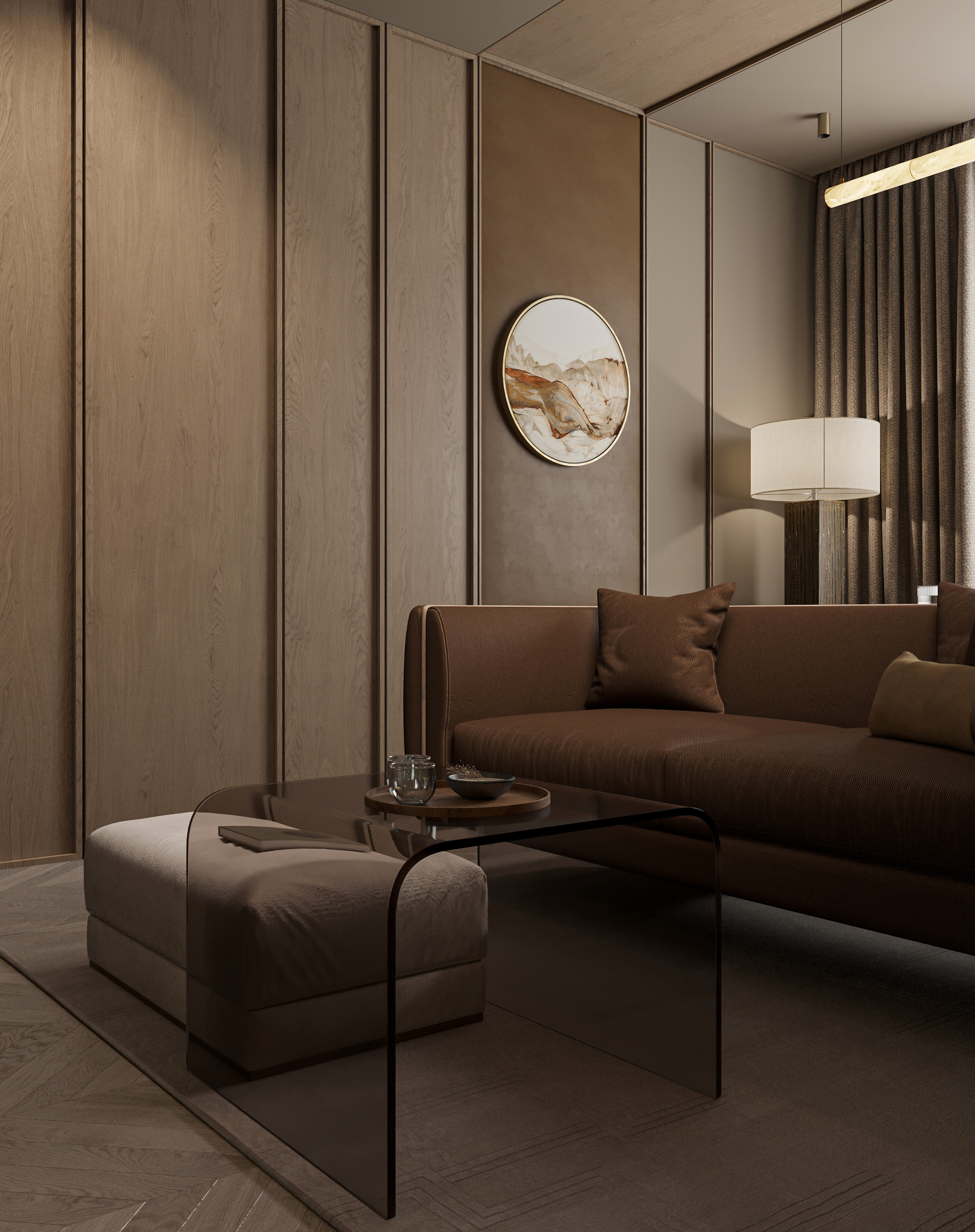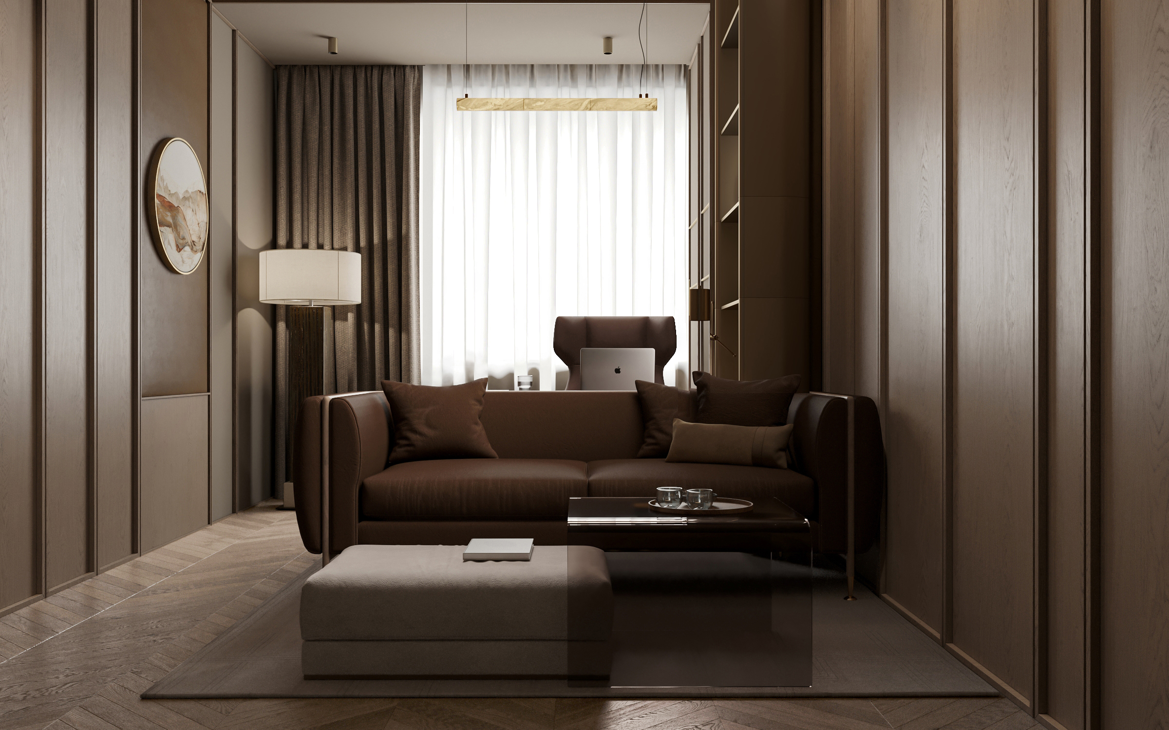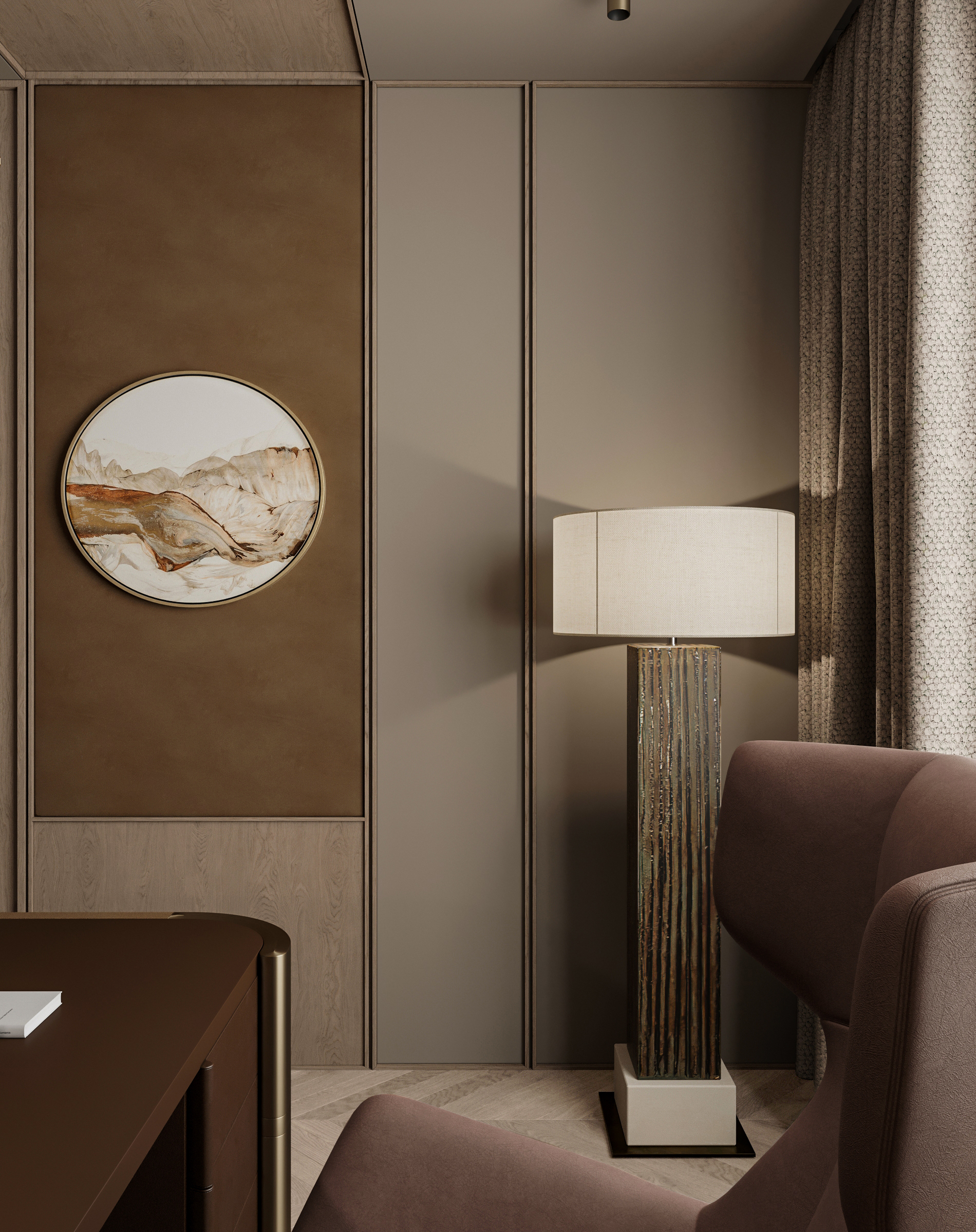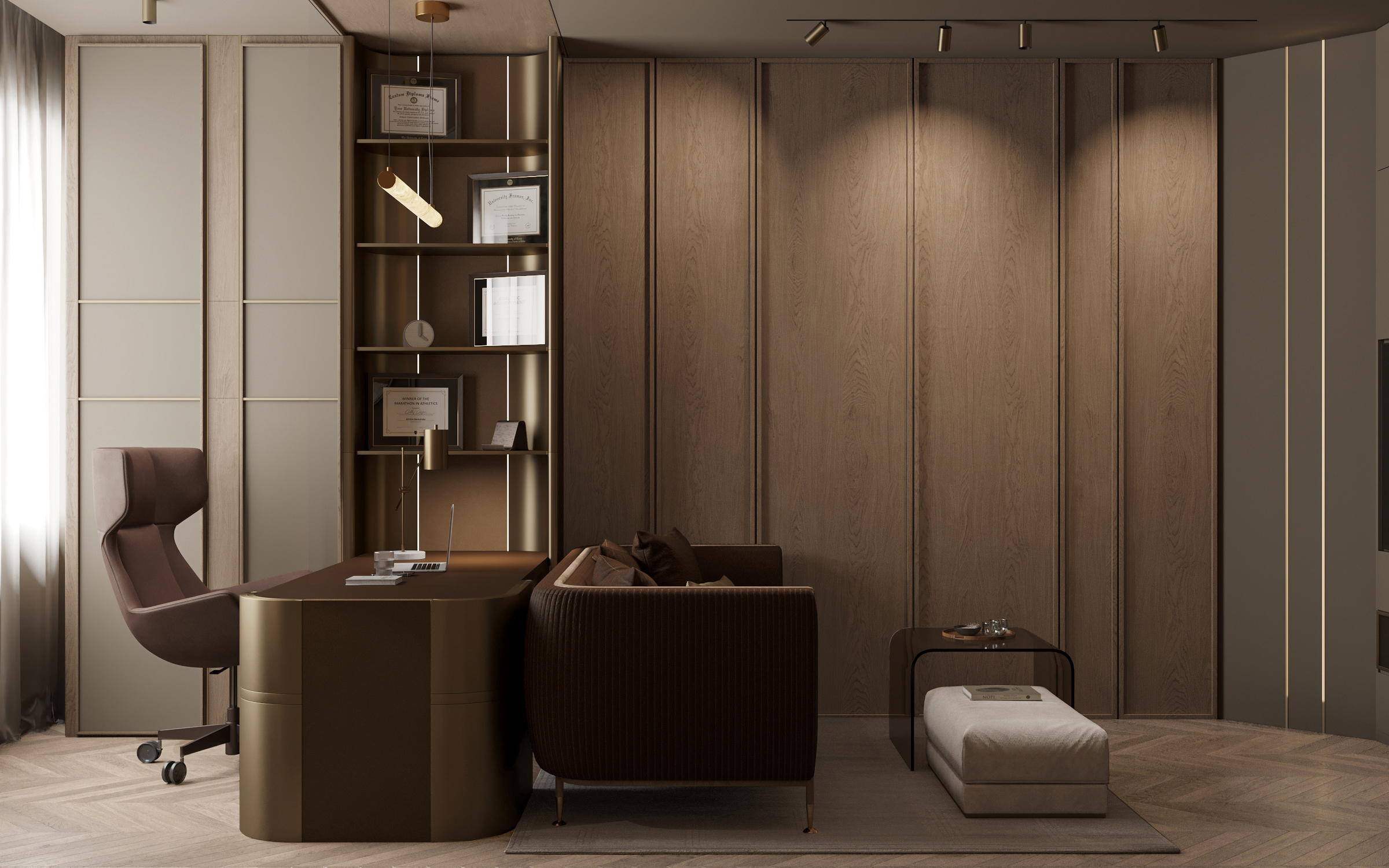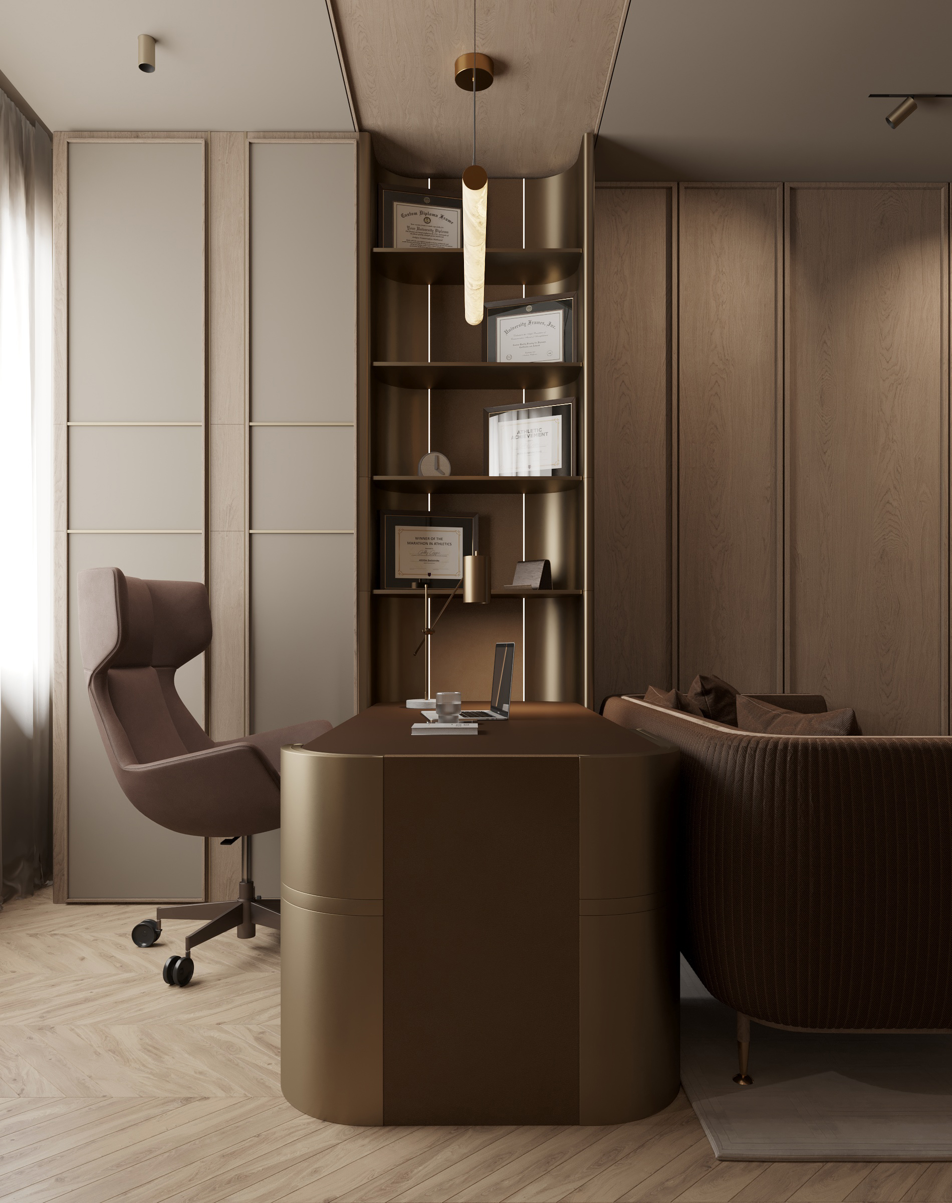 Этот кабинет отражает статус хозяина через благородные материалы: дерево, кожу и латунь. Цветовая гамма выдержана в сдержанных природных тонах — песочном, пыльно-оливковом и терракотовом, что настраивает на рабочий лад. Композиционным центром стала монументальная рабочая зона. Этим же приёмом решены стены в диванной зоне. Фасады шкафа за столом обтянуты кожей в тонких металлических рамках, а на противоположной стене тот же материал заключён в деревянные багеты. Деревянная панель на потолке визуально разделяет пространство на три функциональные зоны. Для организации высокого дверного проёма блок кондиционера был смещён.