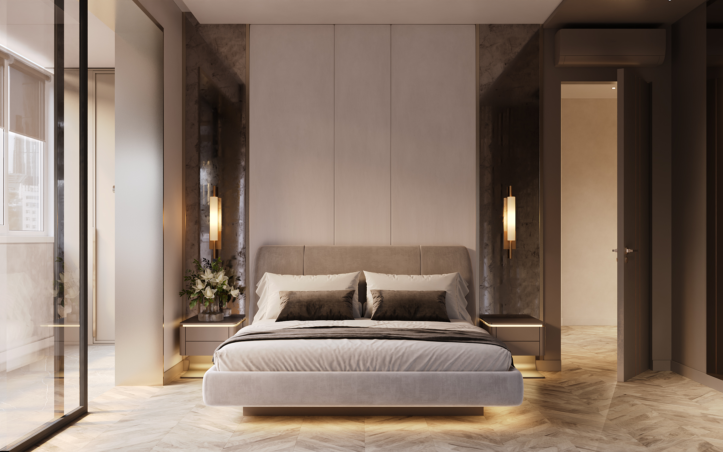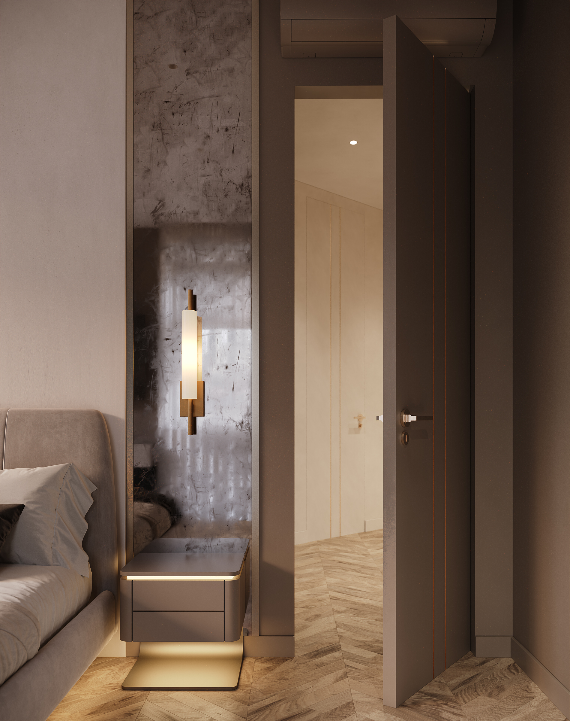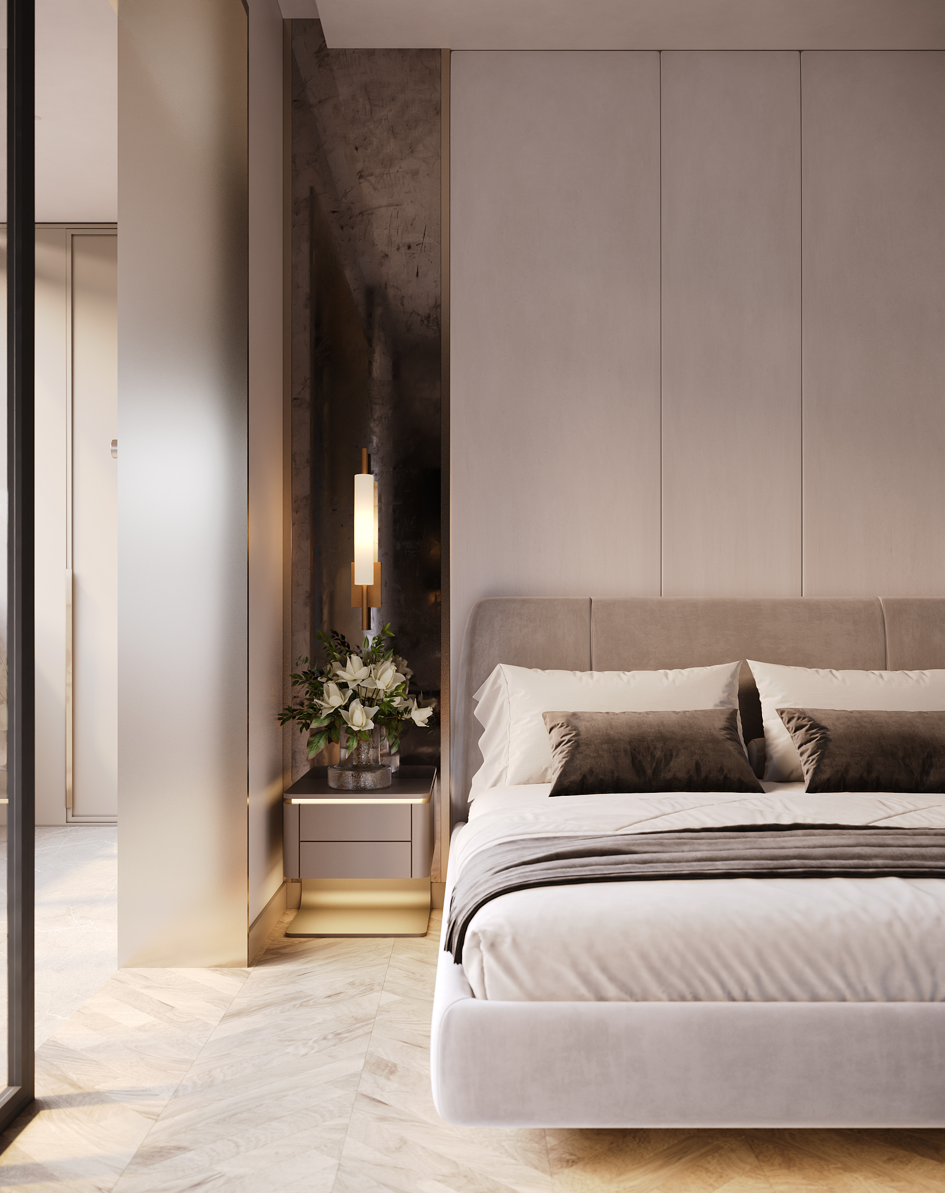 Акцентная стена за изголовьем сочетает три материала: тонированные зеркала, песчаник и белый мрамор. Стыки подчеркнуты латунными вставками, а подсветка добавляет глубины.