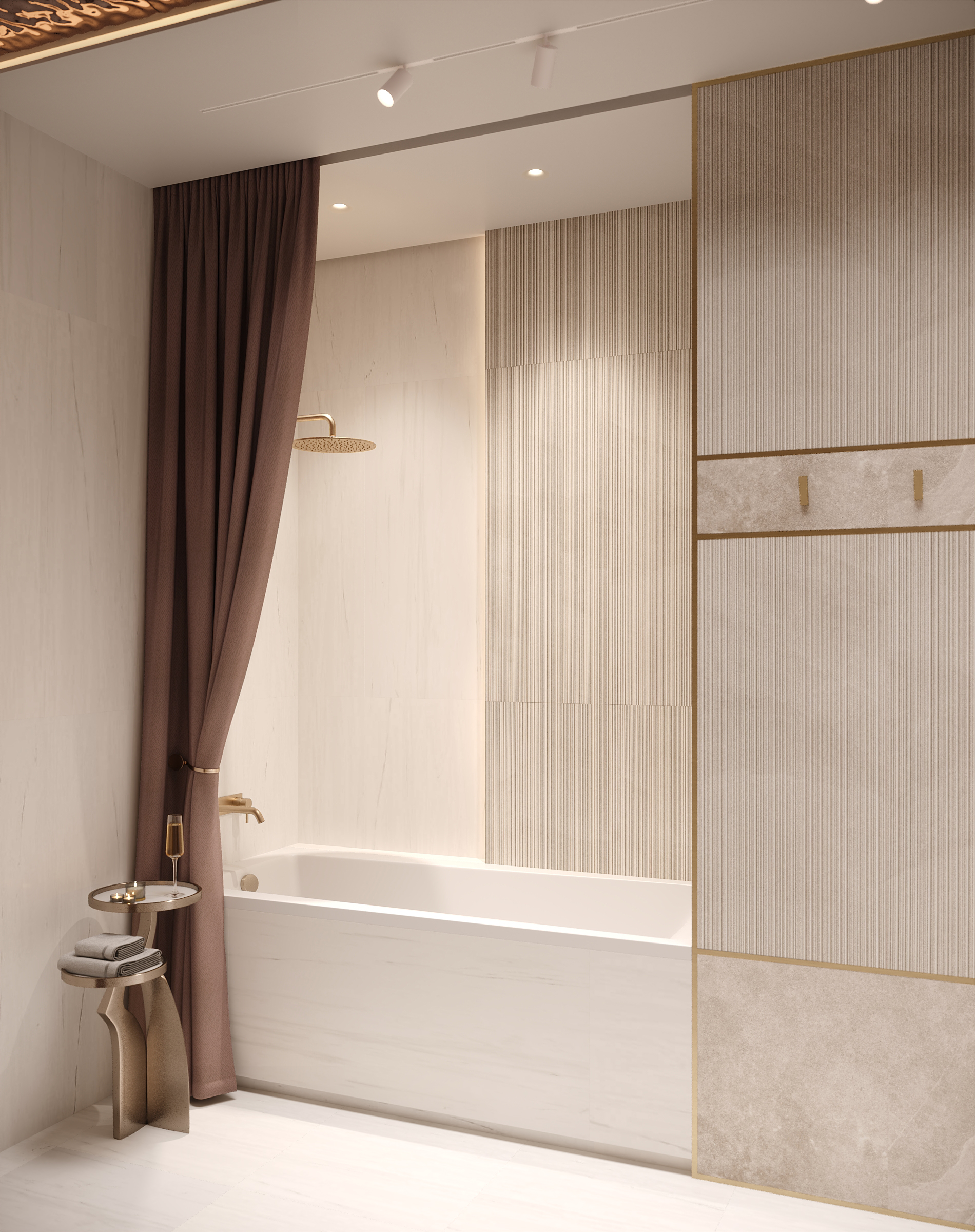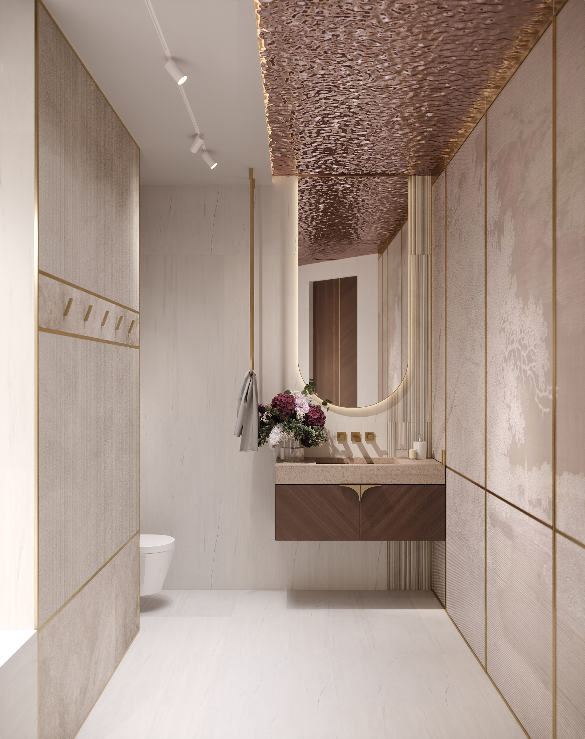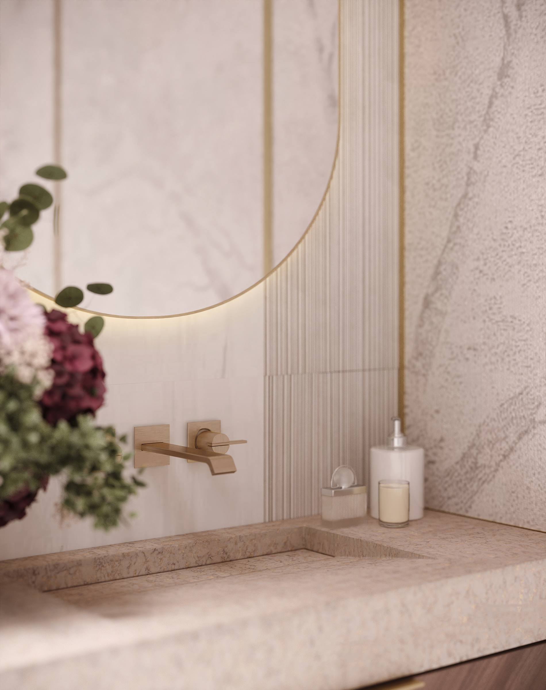 Напольное покрытие и оставшиеся стены отделаны керамогранитом с текстурой оникса, что добавляет пространству лёгкости и вновь обращается к нежной концепции, созданной для хозяйки.