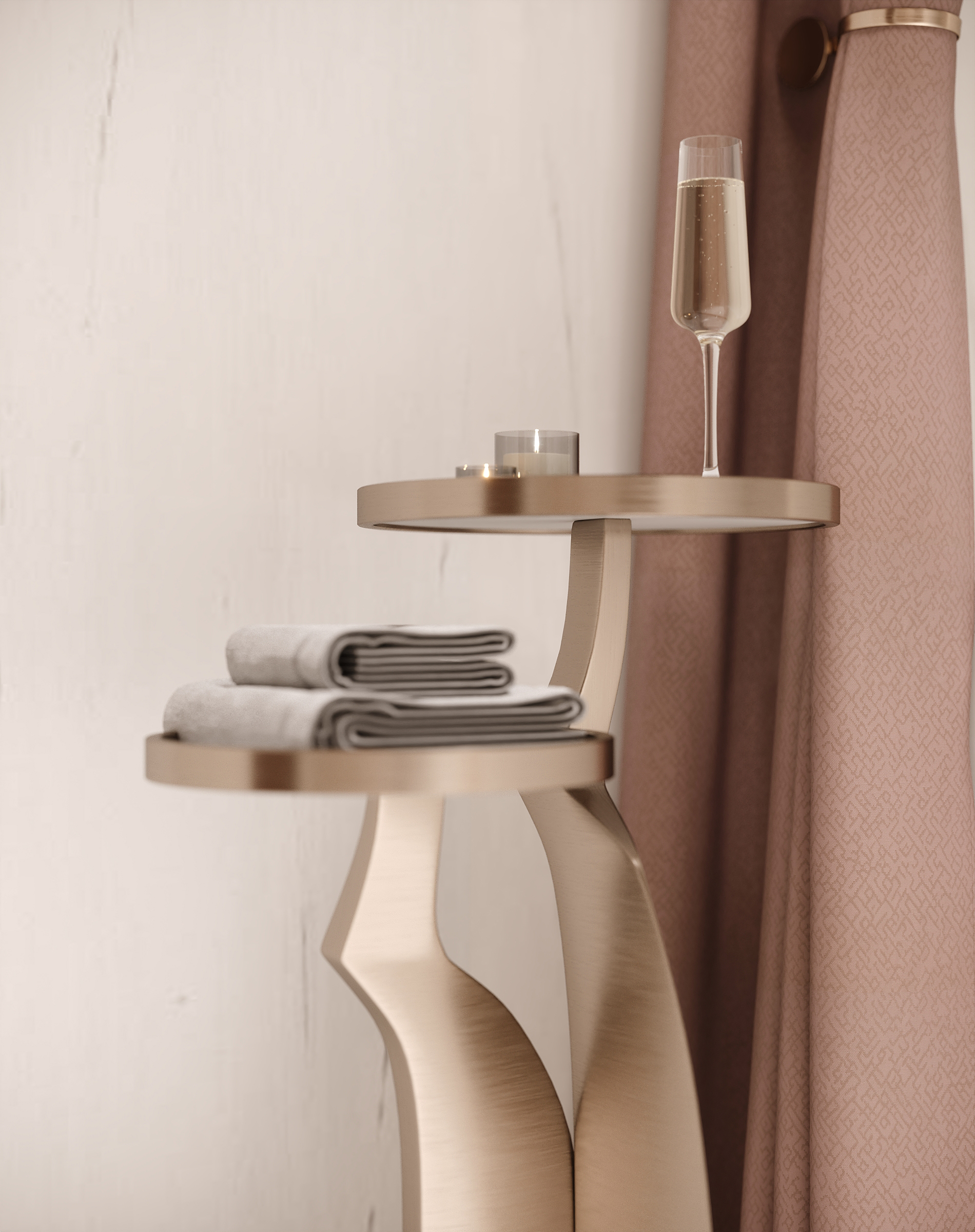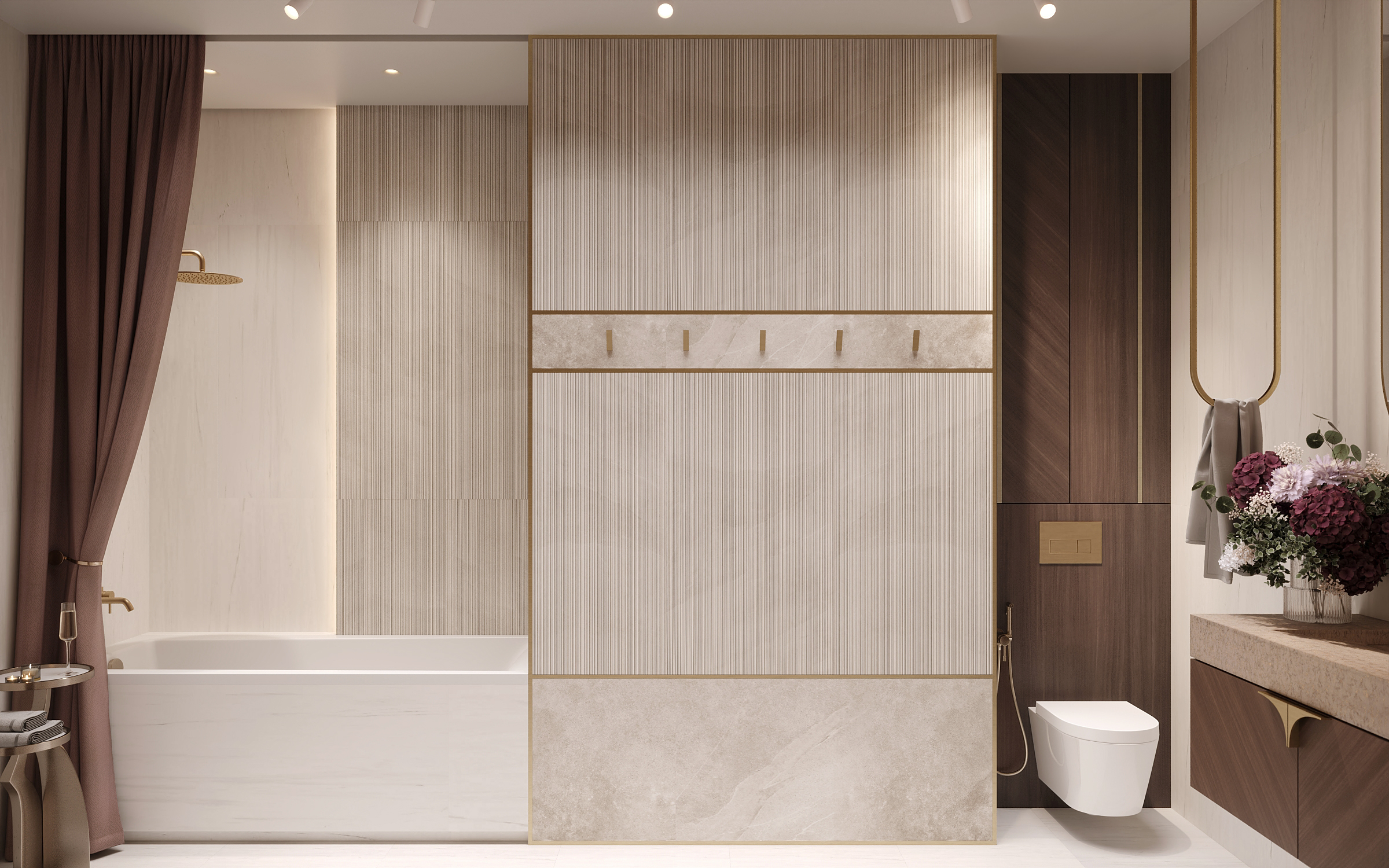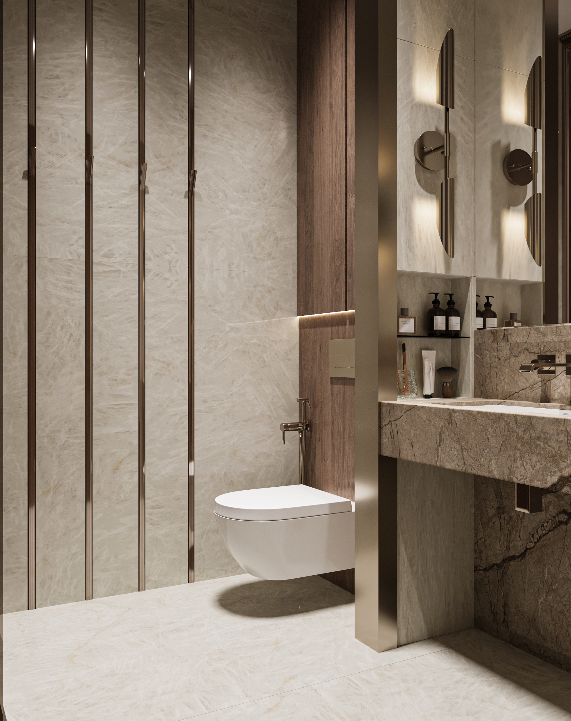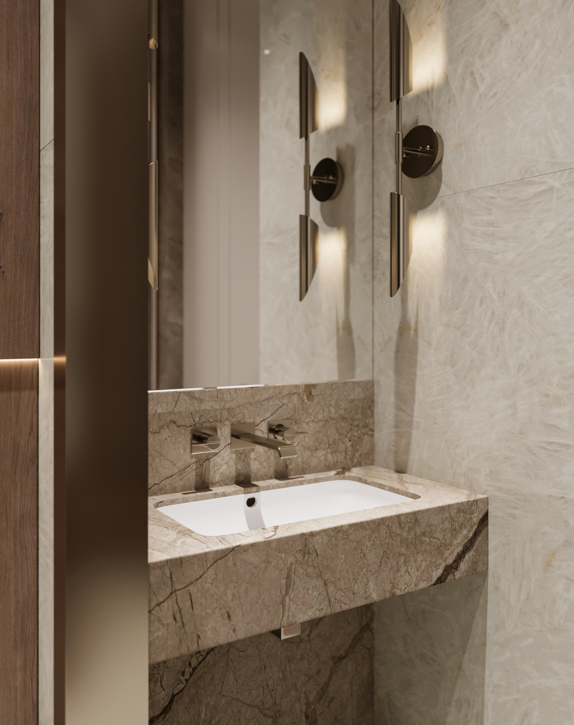 Напольное покрытие и оставшиеся стены отделаны керамогранитом с текстурой оникса, что добавляет пространству лёгкости и вновь обращается к нежной концепции, созданной для хозяйки.