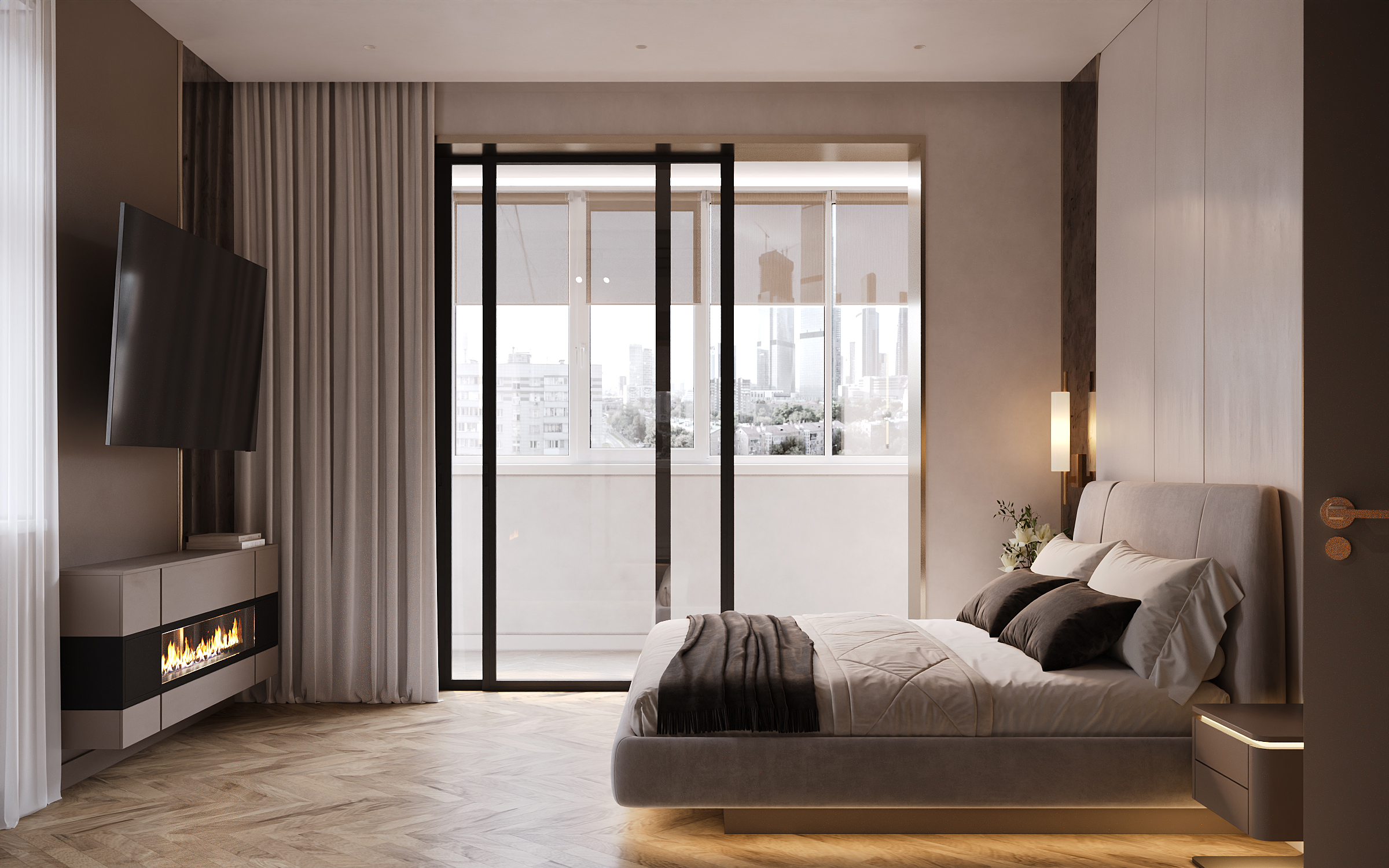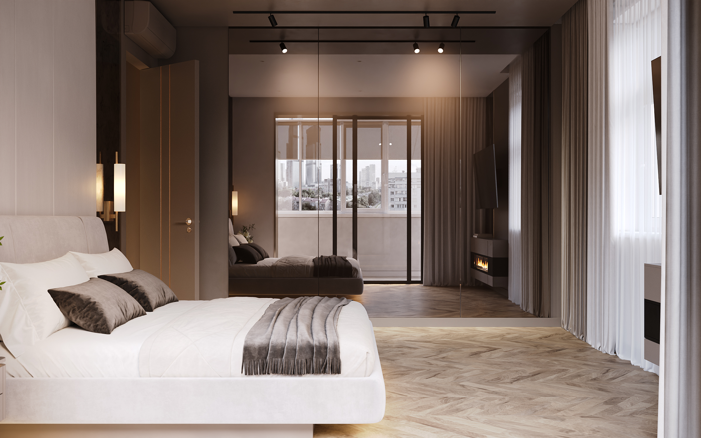 В качестве доминанты выступает единственный, но яркий акцент — стеклянная перегородка в гардеробную в металлическом профиле. Она эффектно контрастирует со спокойным основным цветом стен — нежным айвори.