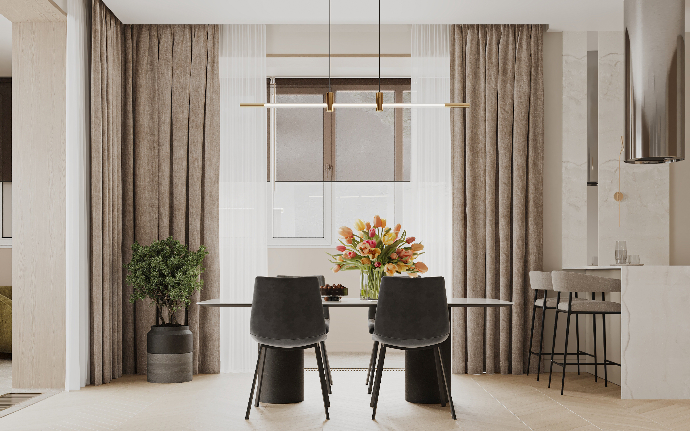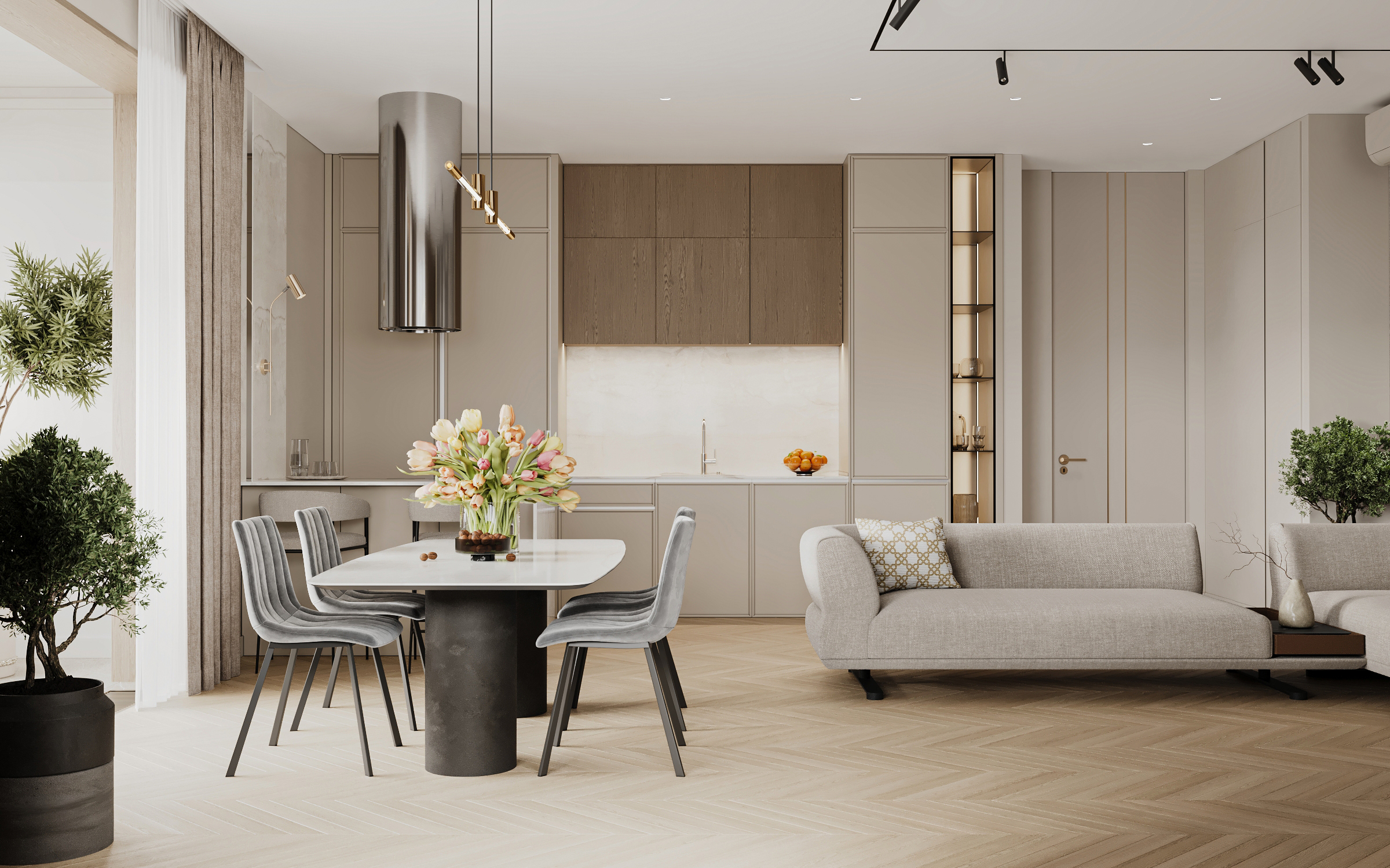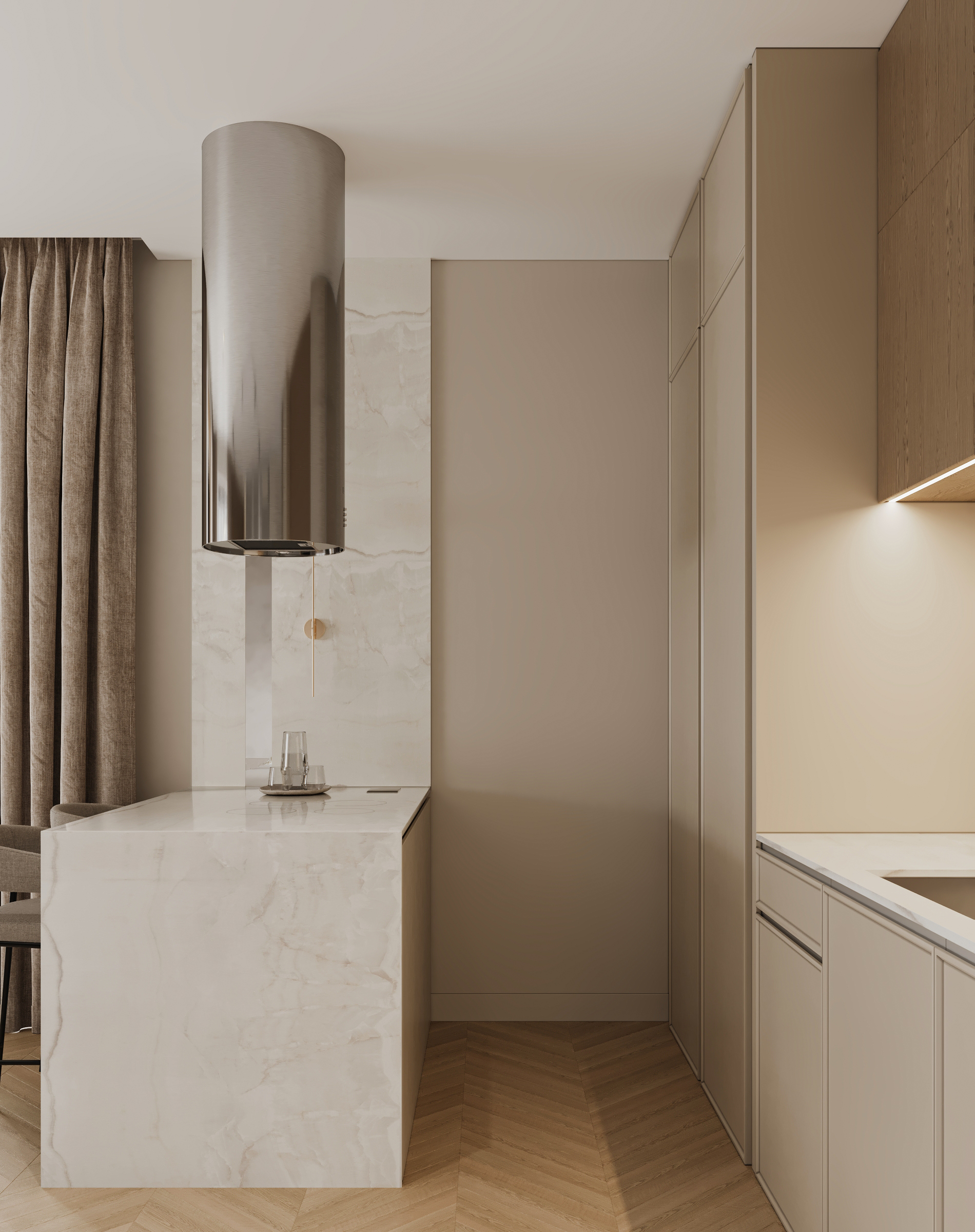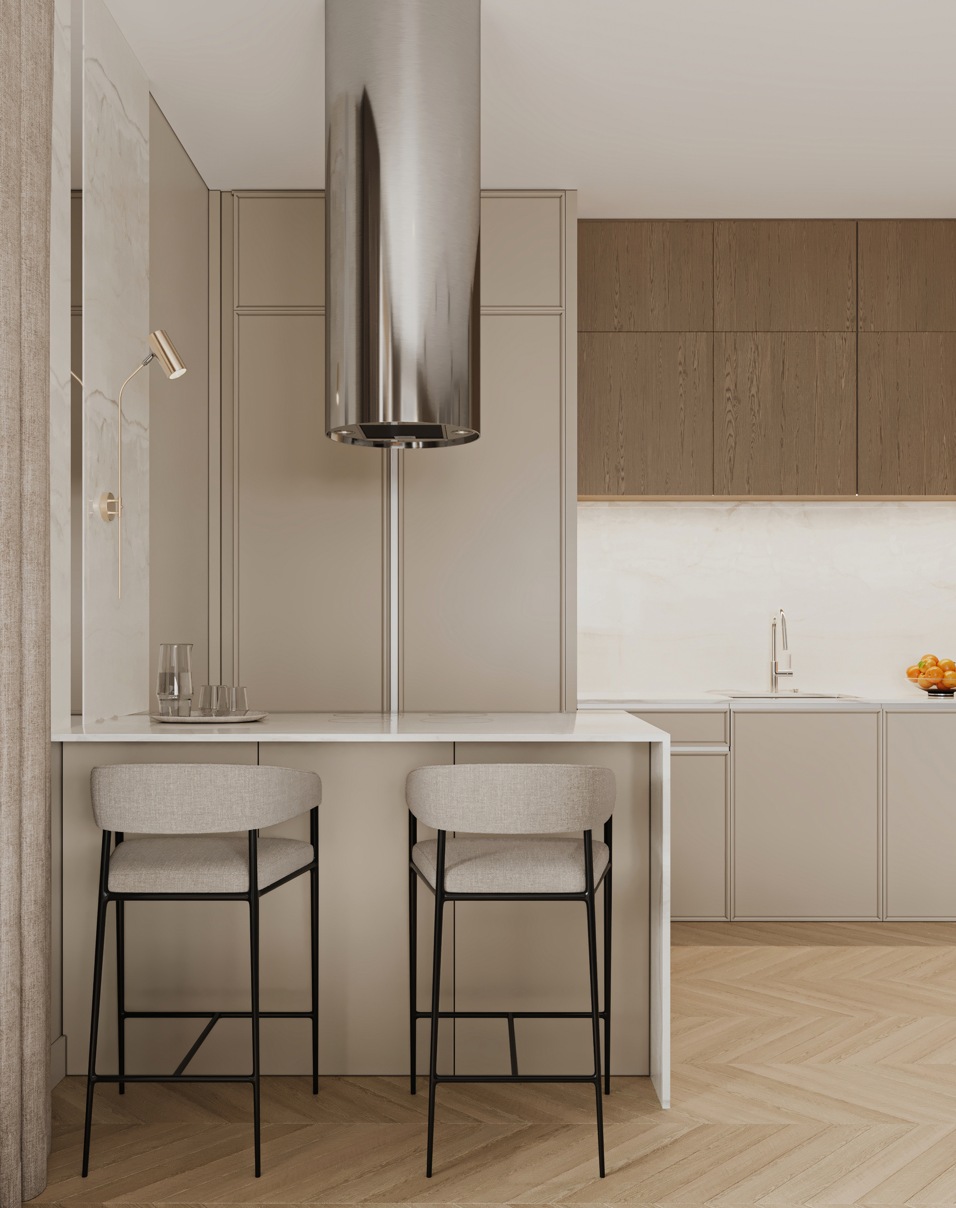На кухне акцентом является остров, который выполняет функцию стола для завтрака и вечерних посиделок в кругу близких людей. Фасады кухни минималистичные, выполнены в гладком шпоне и эмали в нейтральном бежевом оттенке.
