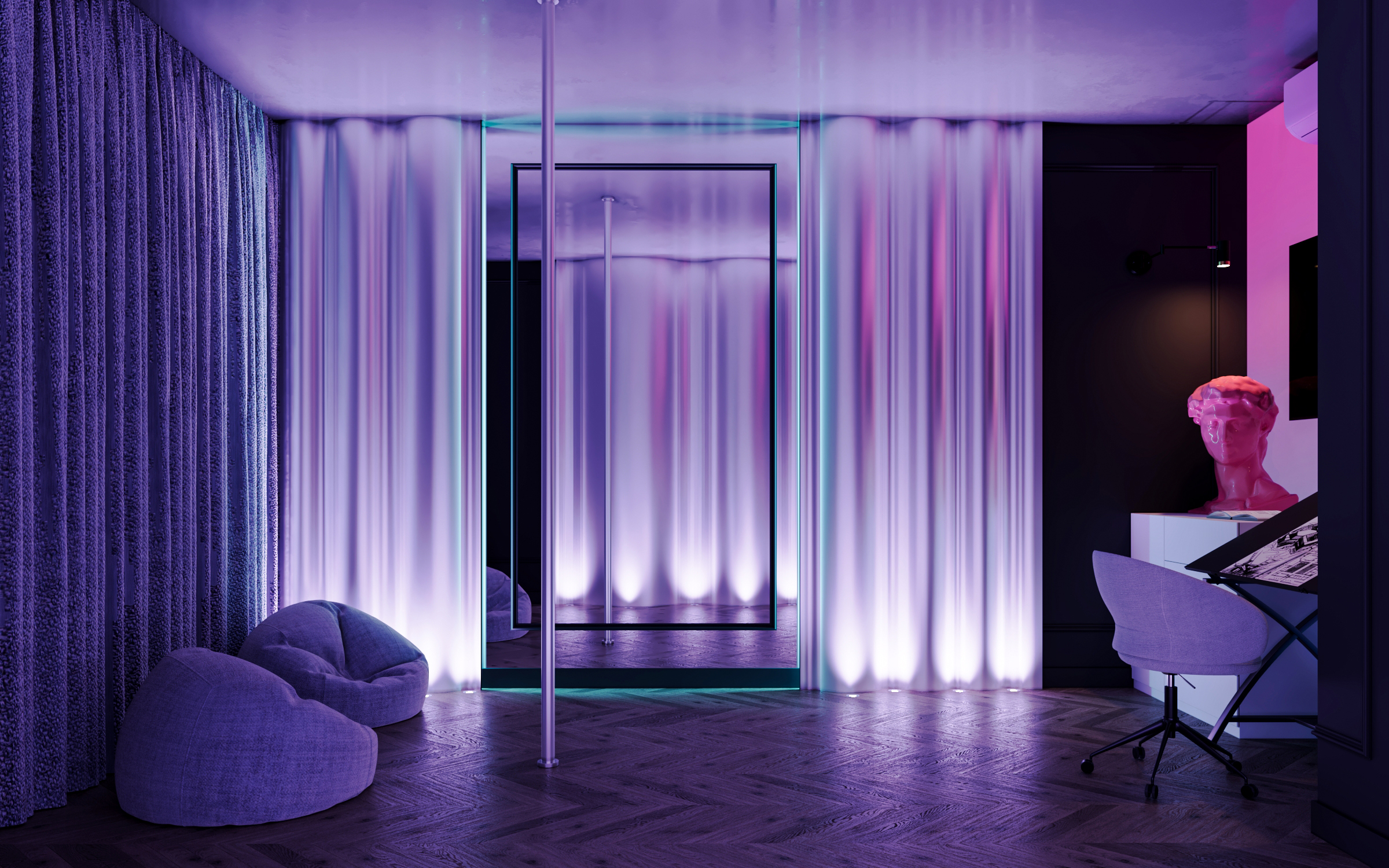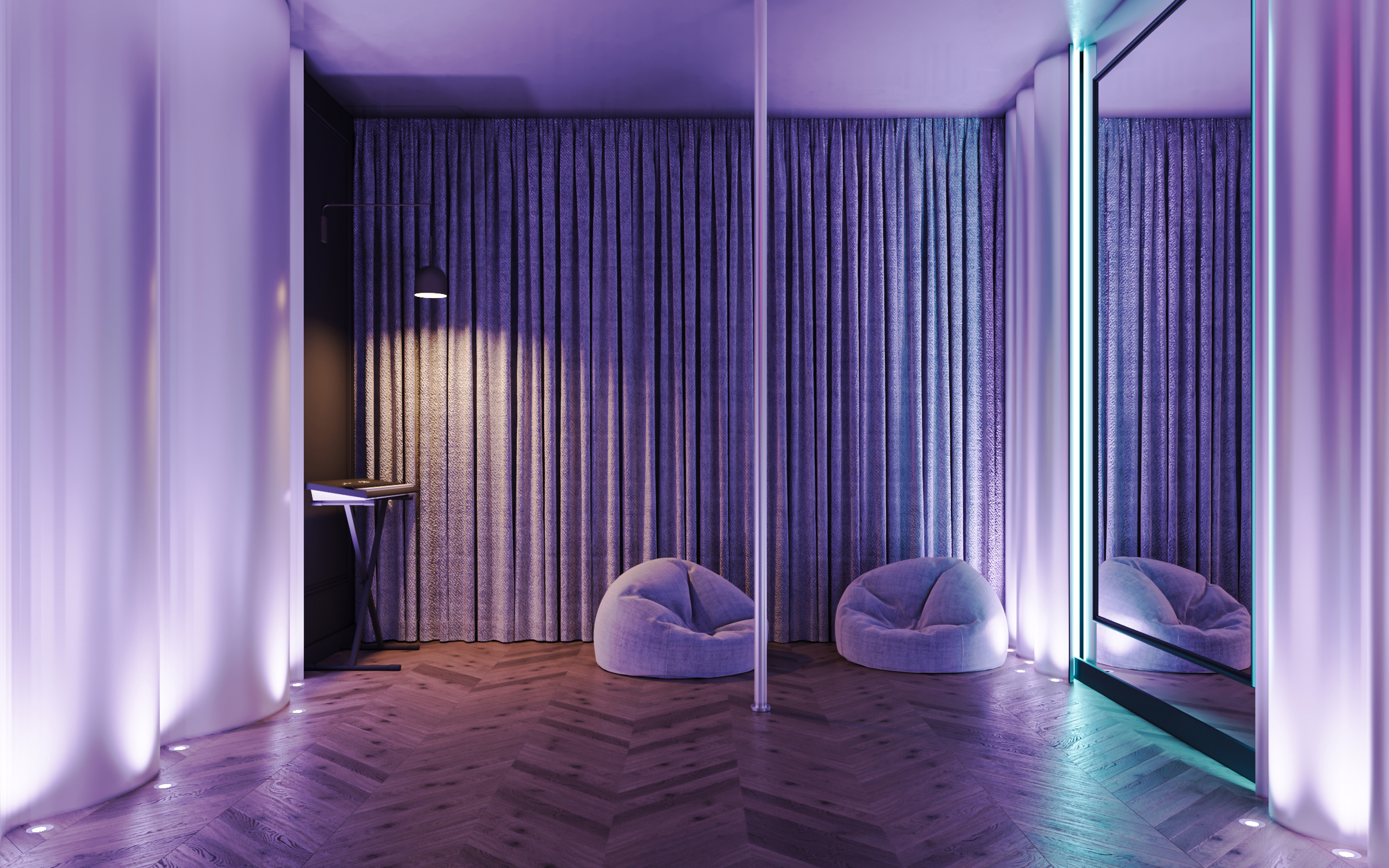 Самая игривая комната проекта задаёт настроение с помощью волнообразных рифлёных панелей. Они отражают подсветку пола, создавая томную, глубокую атмосферу.