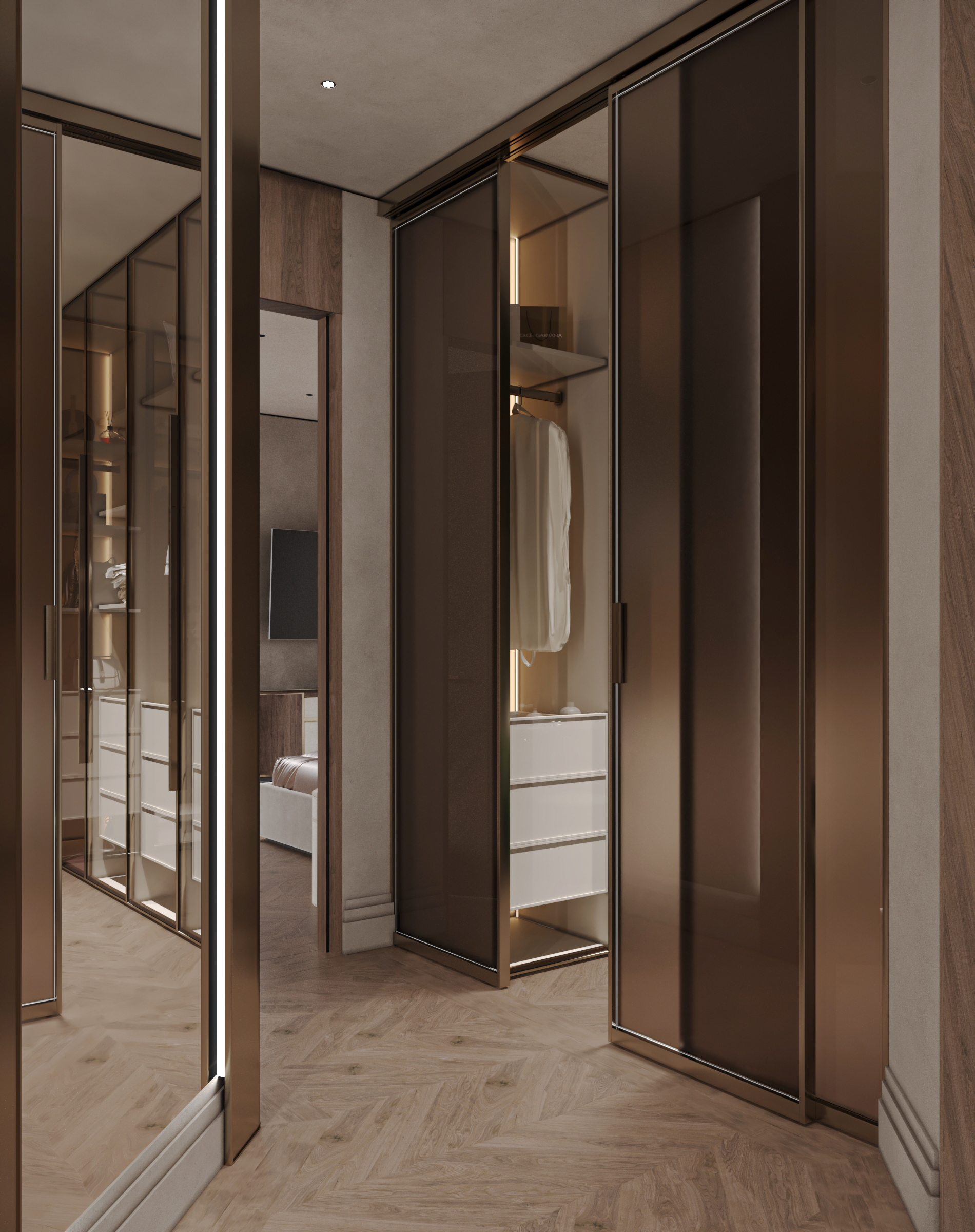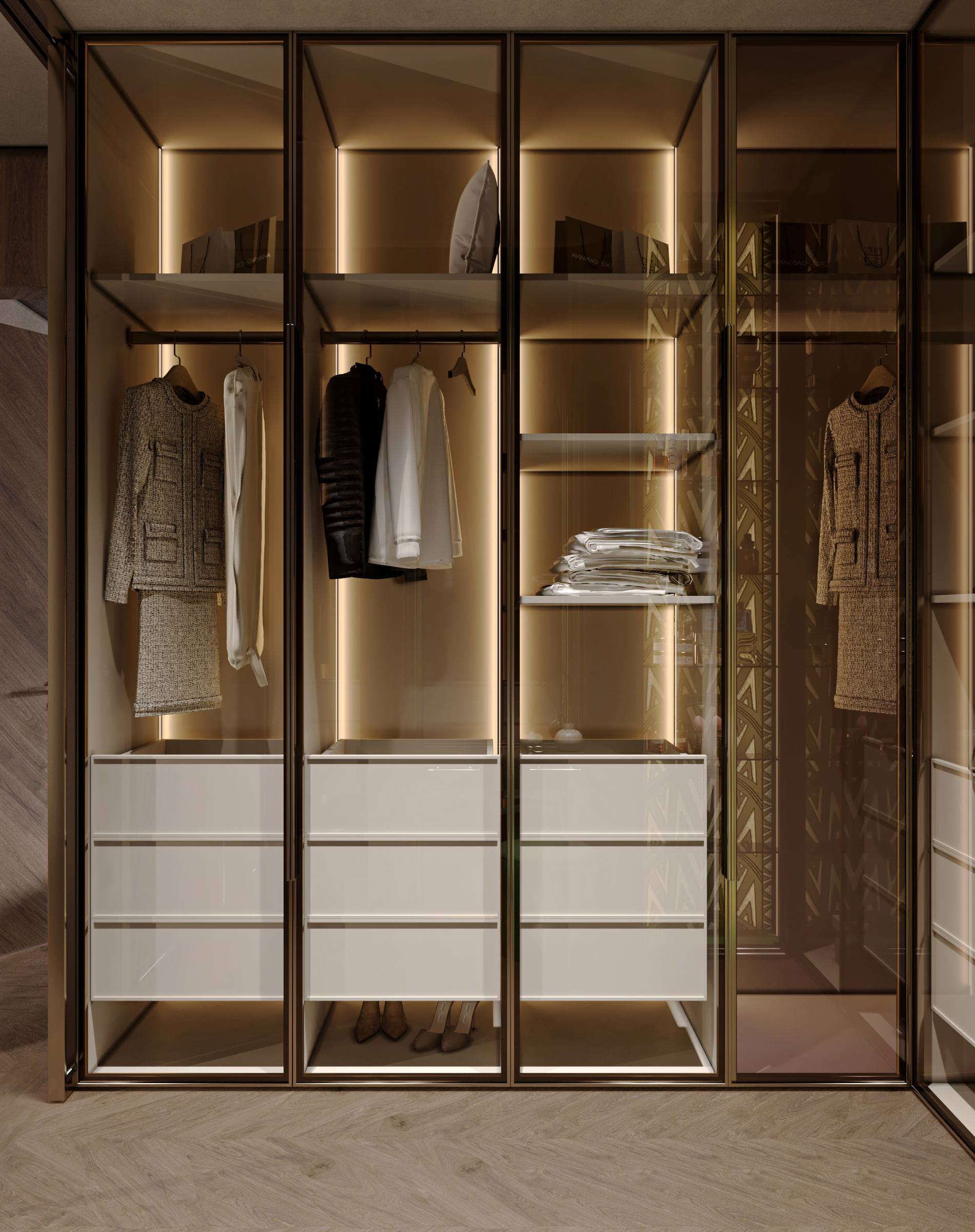 Гардеробная выдержана в единой цветовой палитре: шкаф сливается со стенами, а его прозрачные стеклянные фасады открывают взгляду внутреннее наполнение — выкатные ящики, обтянутые кожей рептилии глубокого винного оттенка.