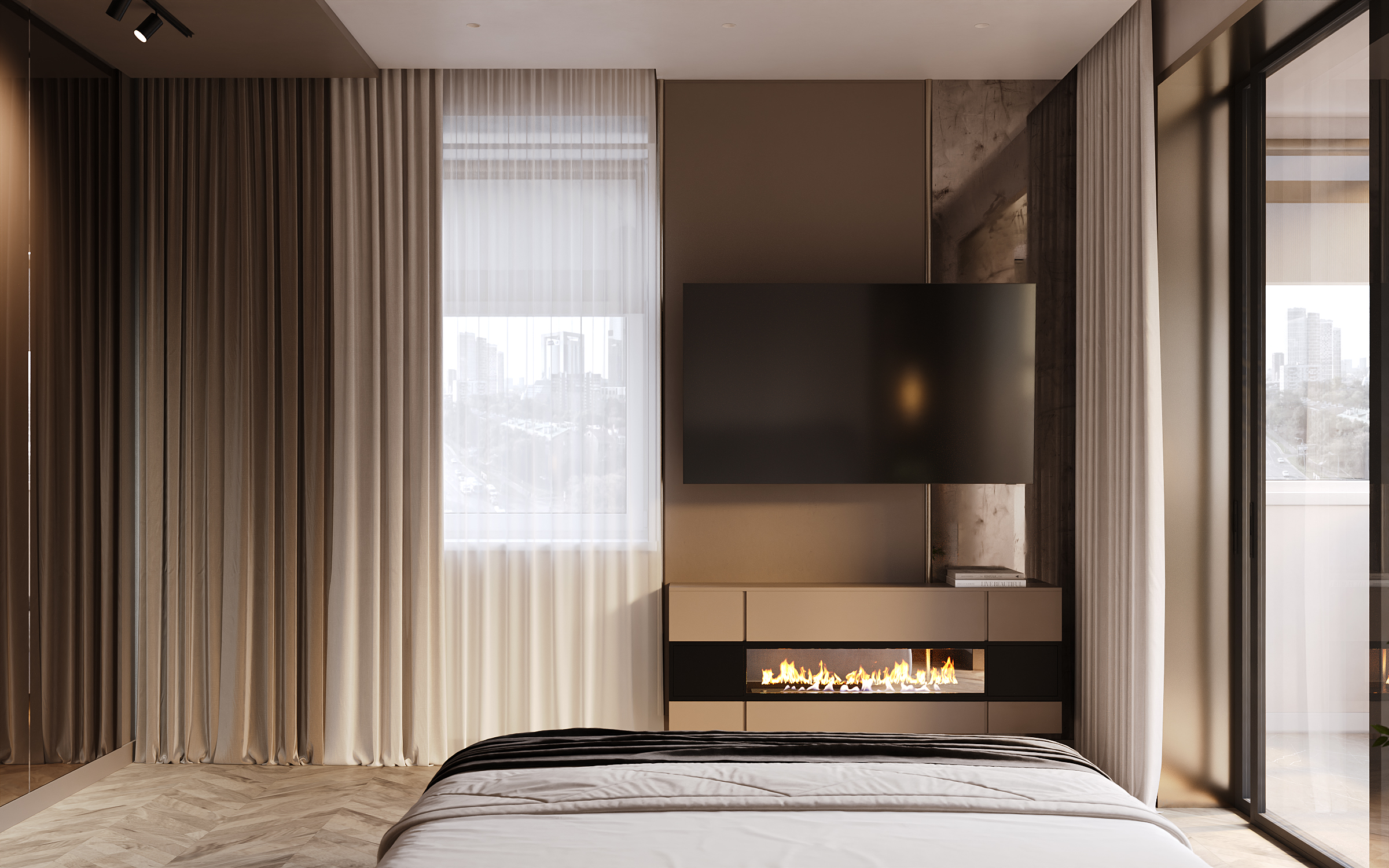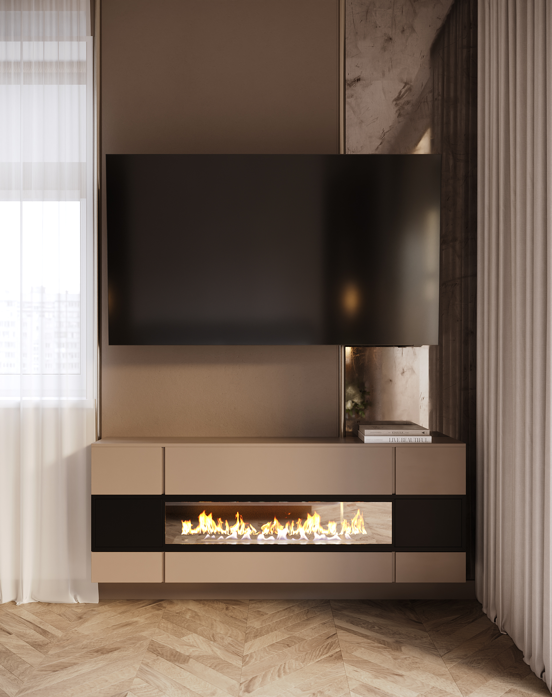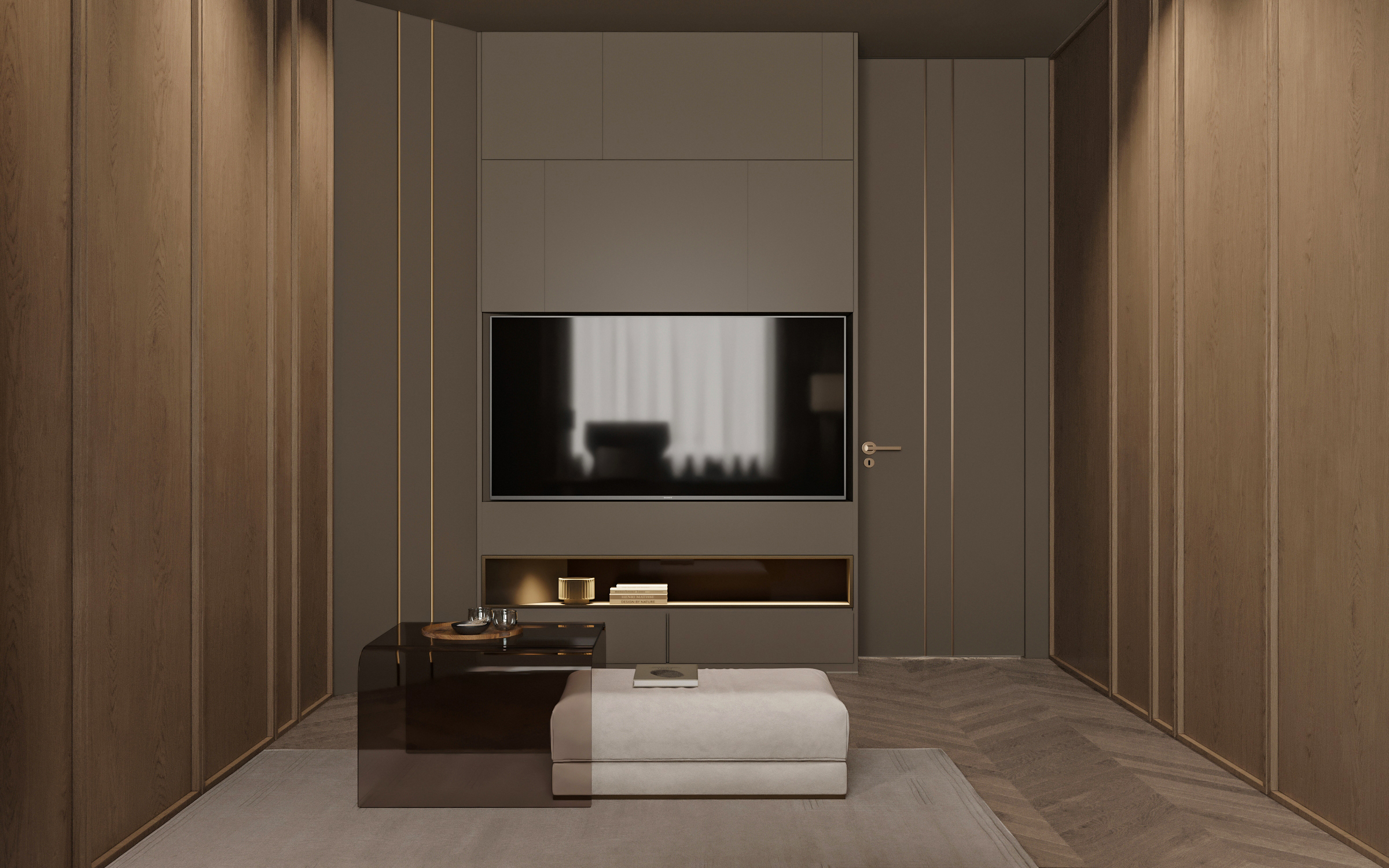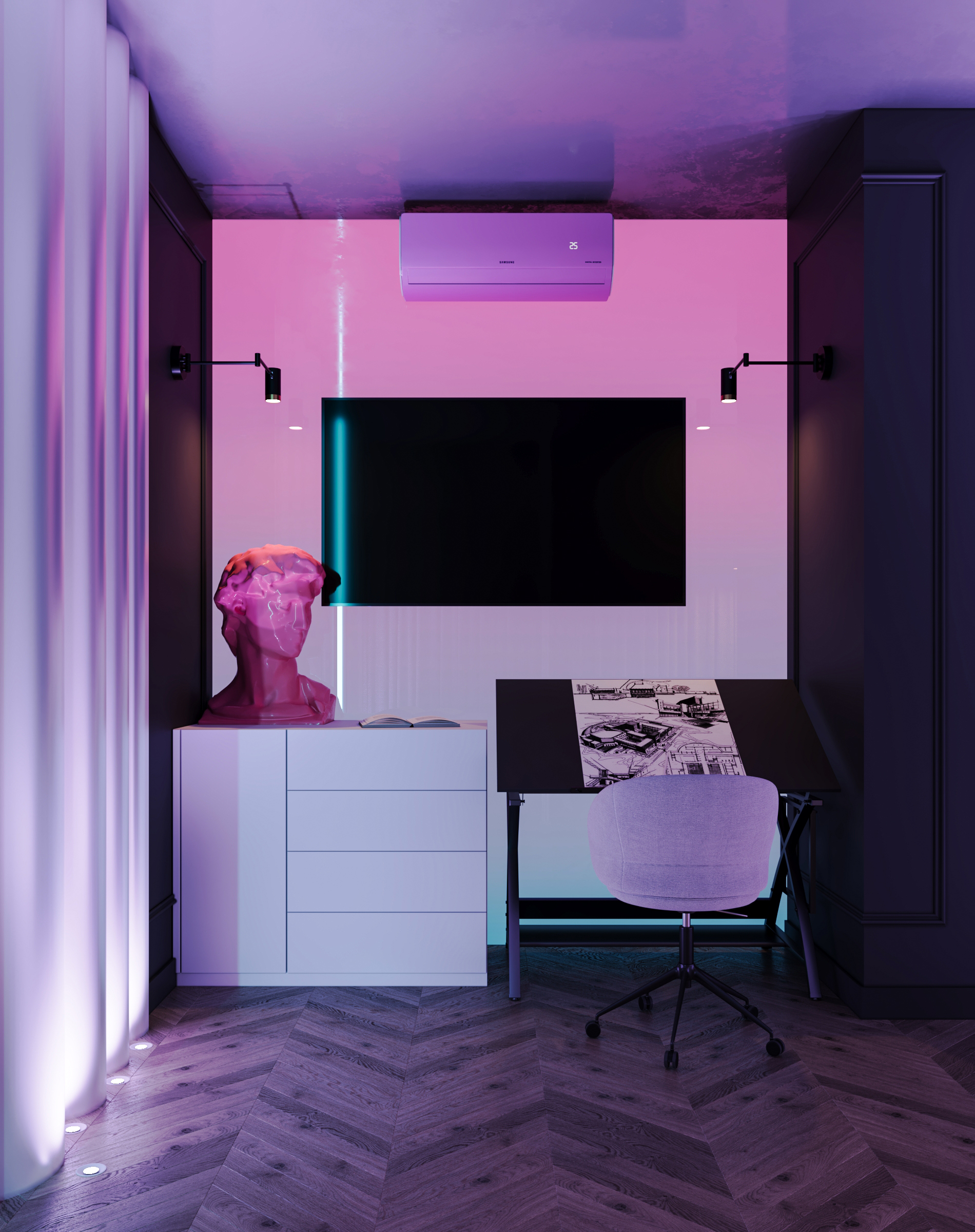 Фокусом служит рабочая зона: светящаяся панель с плавным градиентом и 4K-плазма. По бокам — симметричные бра с тёплым акцентным светом, идеальным для вечера.