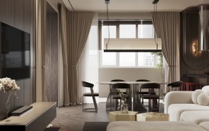 В обеденной зоне стол будет выполнен по индивидуальному заказу, столешница будет сделана из натурального камня, а опорные ножки являются элементом ар-деко, которые называются «рога буйвола». Стулья будут бренда Eichholtz. Над обеденной зоной повисла интересная по своей форме люстра Tunnel бренда Baxter, которая будет привлекать ваше внимания, а также создавать интимную атмосферу, во время ужина.
