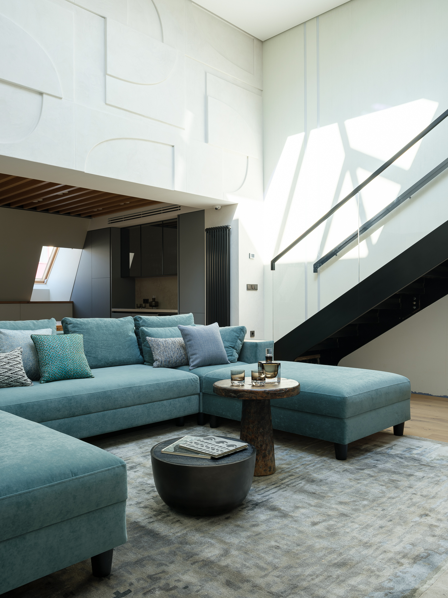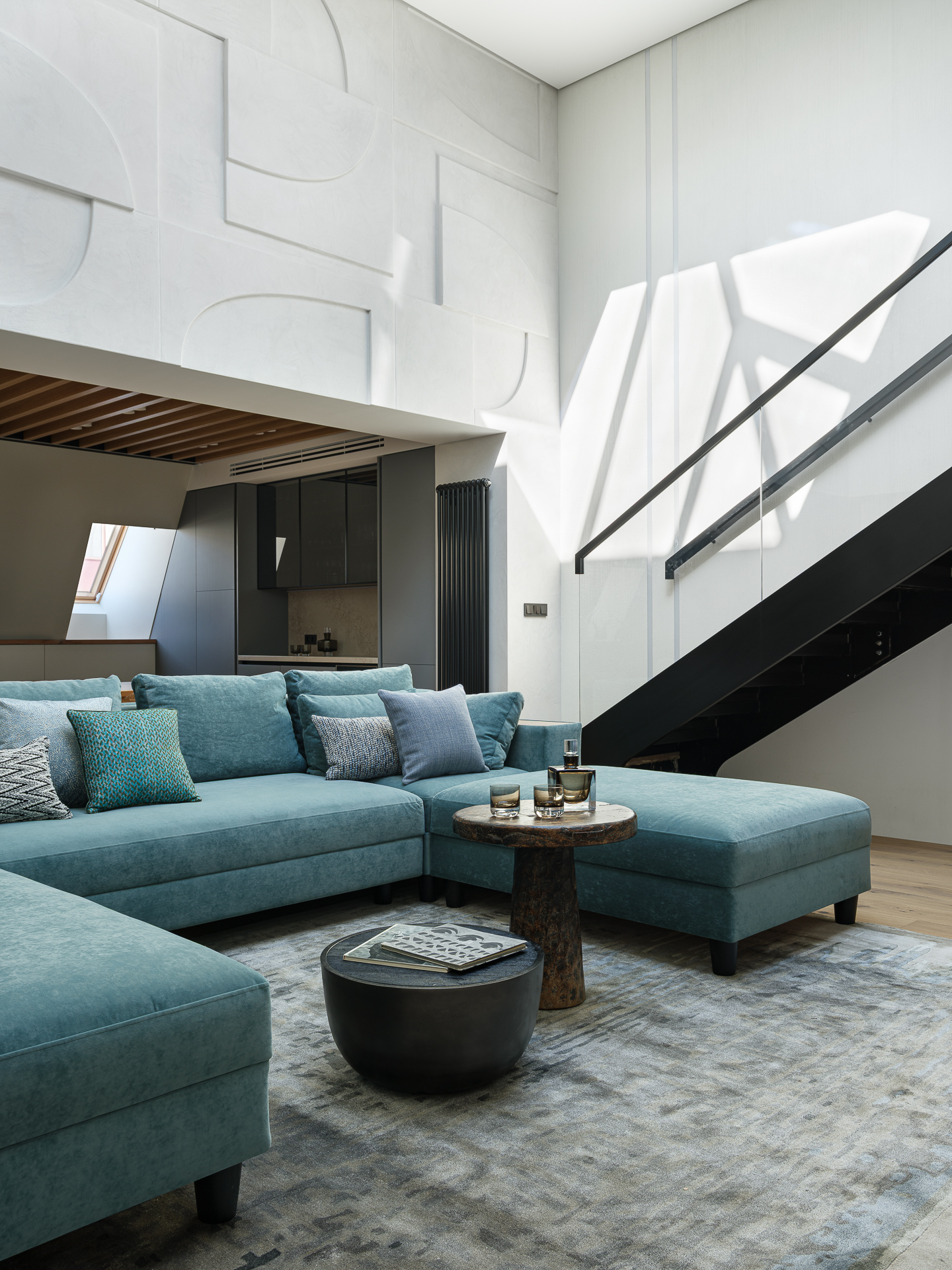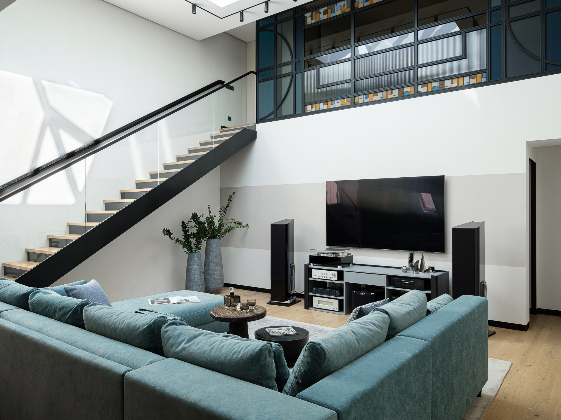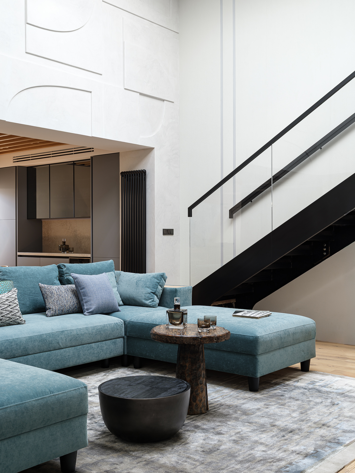 - Гостиная, как и вся квартира, сделана в современном стиле. Особенность данной гостиной – наличие светового фонаря в крыше. Гостиная разрабатывалась, как место для основного времяпрепровождения всей семьи. Большой П-образный диван для комфортного просмотра ТВ. Задача была повторить, имеющийся на тот момент в квартире, дизайн лестницы, а именно деревянные ступени и стеклоограждение. Основную концепцию лестницы сохранили, заменив лестничный косоур на тетиву и интегрировав под лестницу шкаф для хранения коллекции CD, DVD дисков и виниловых пластиной. Также, у клиента в наличии акустическое оборудование, которое необходимо было интегрировать в проект.