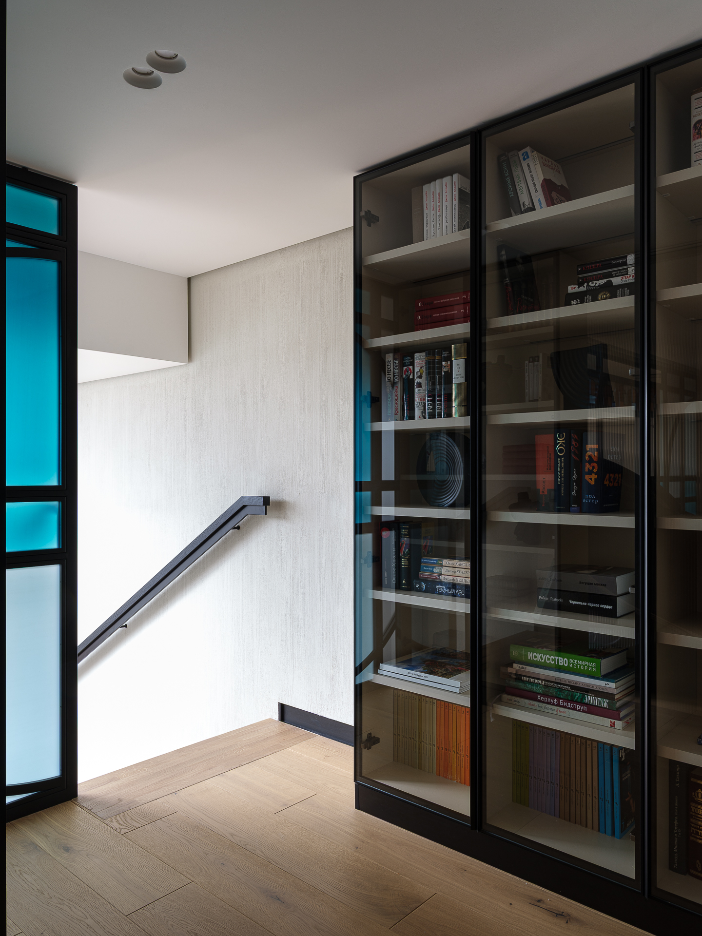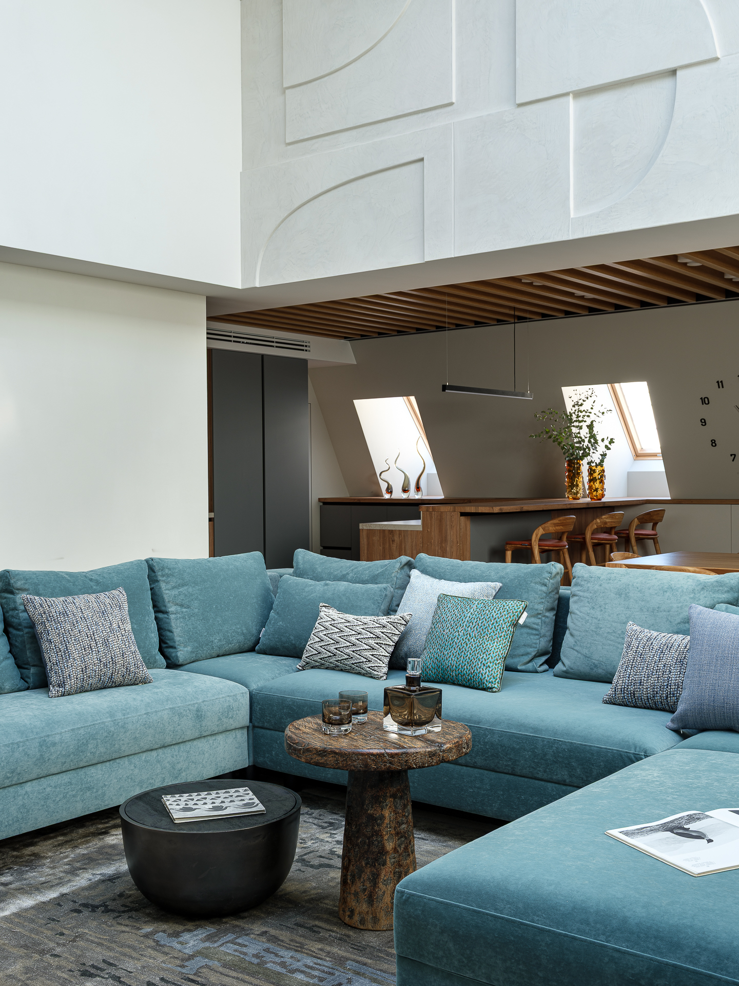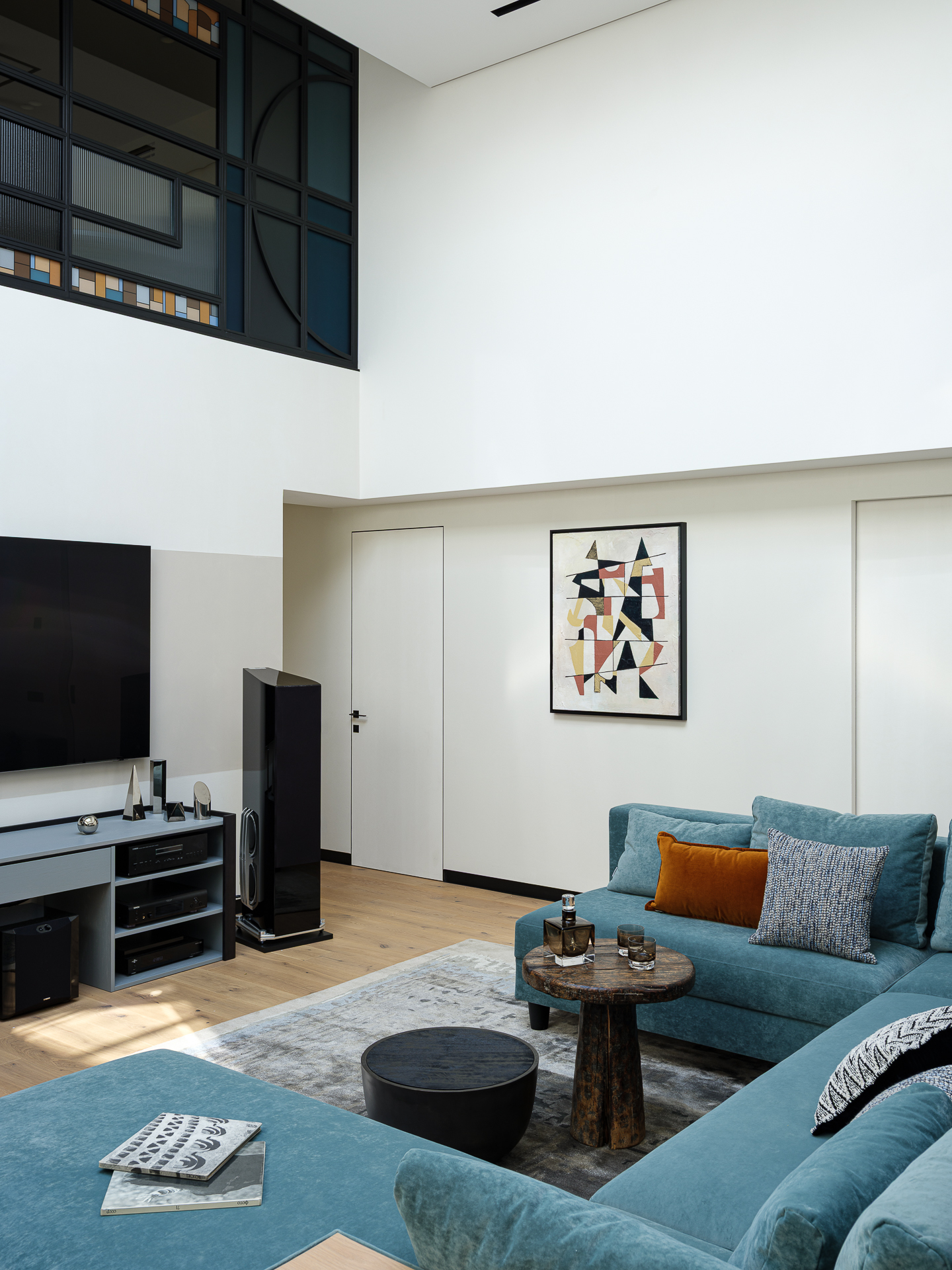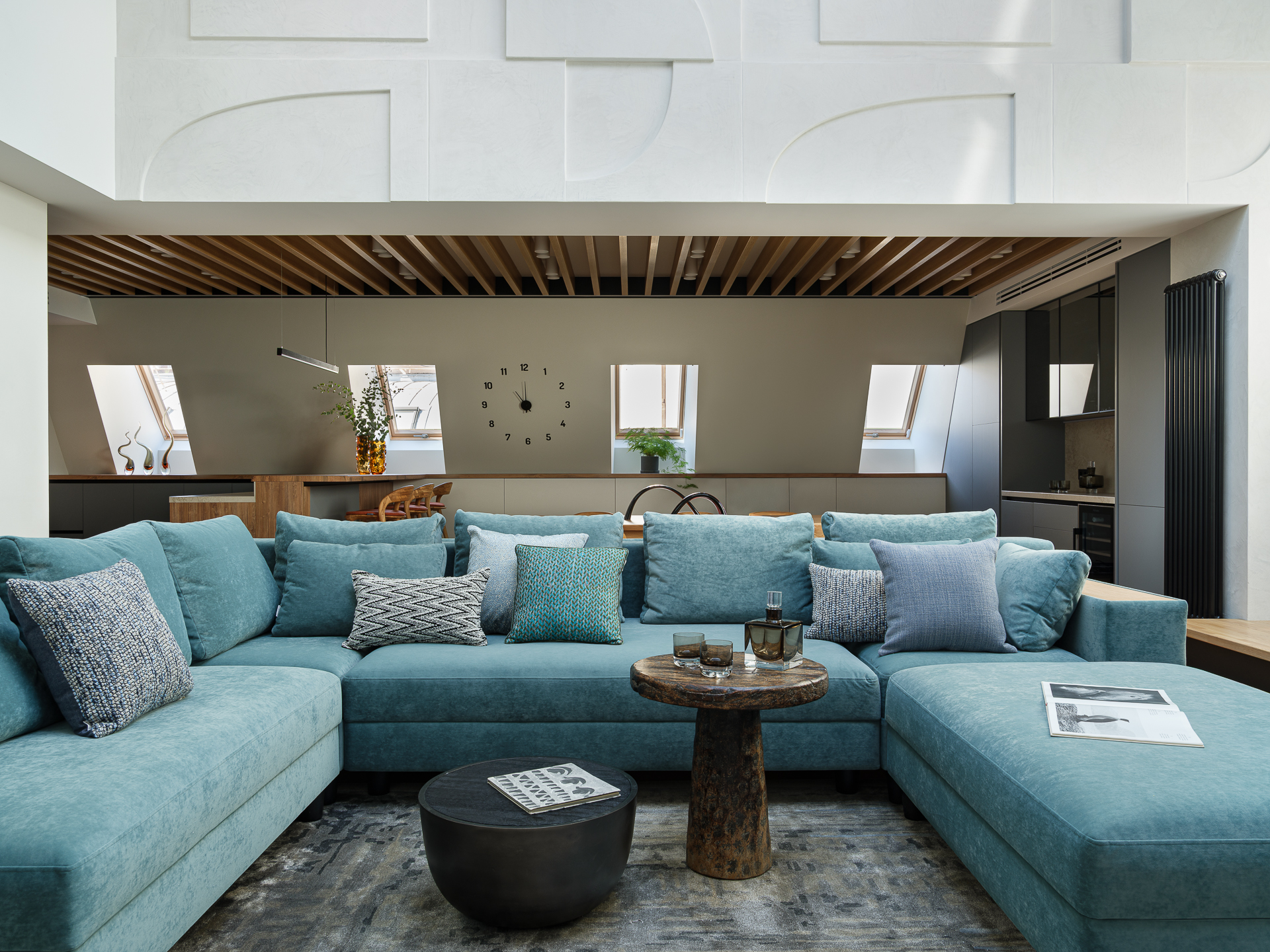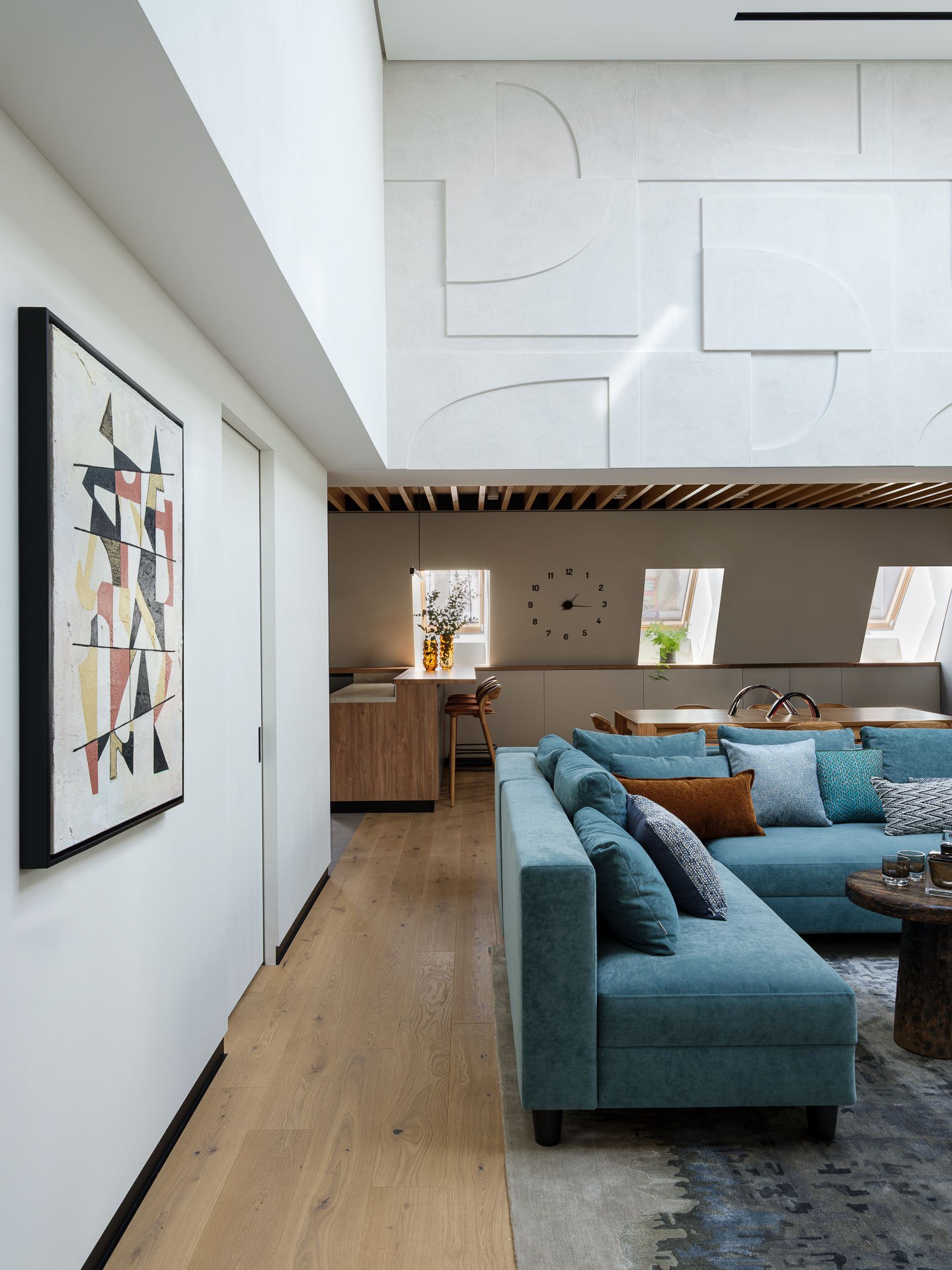 - Гостиная, как и вся квартира, сделана в современном стиле. Особенность данной гостиной – наличие светового фонаря в крыше. Гостиная разрабатывалась, как место для основного времяпрепровождения всей семьи. Большой П-образный диван для комфортного просмотра ТВ. Задача была повторить, имеющийся на тот момент в квартире, дизайн лестницы, а именно деревянные ступени и стеклоограждение. Основную концепцию лестницы сохранили, заменив лестничный косоур на тетиву и интегрировав под лестницу шкаф для хранения коллекции CD, DVD дисков и виниловых пластиной. Также, у клиента в наличии акустическое оборудование, которое необходимо было интегрировать в проект.