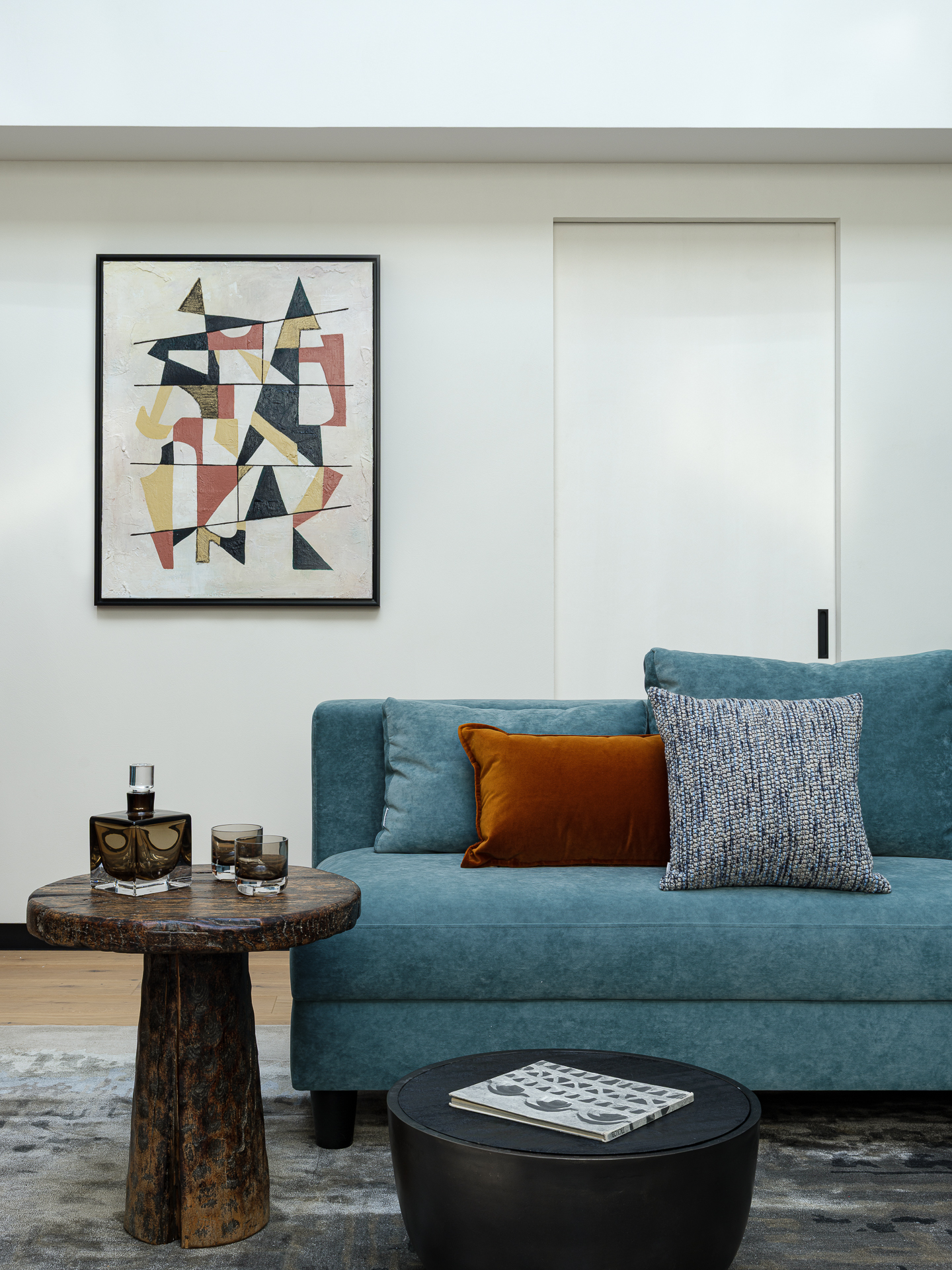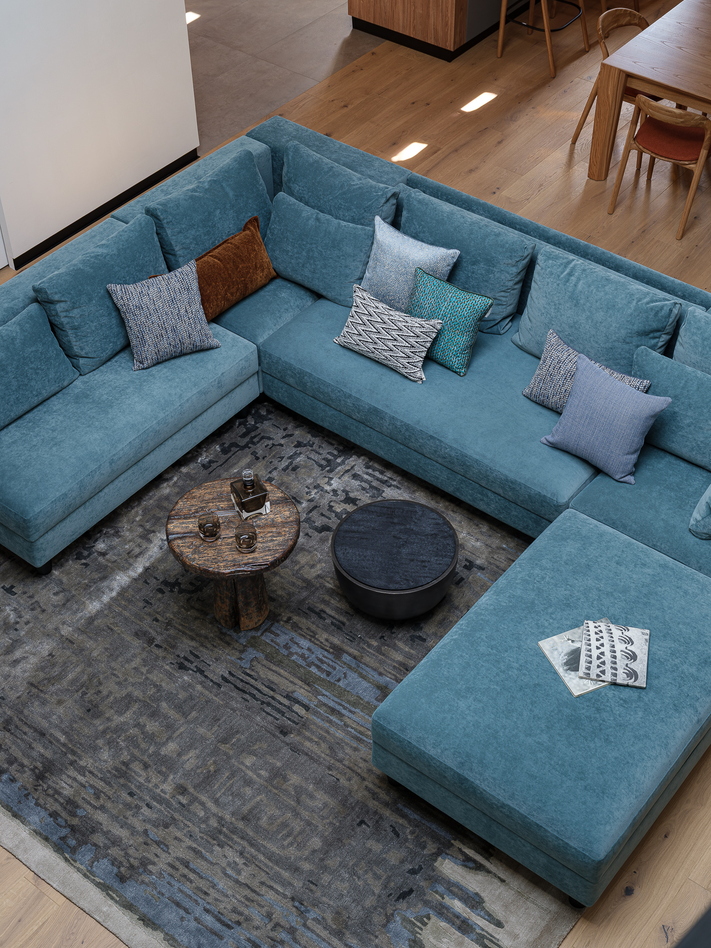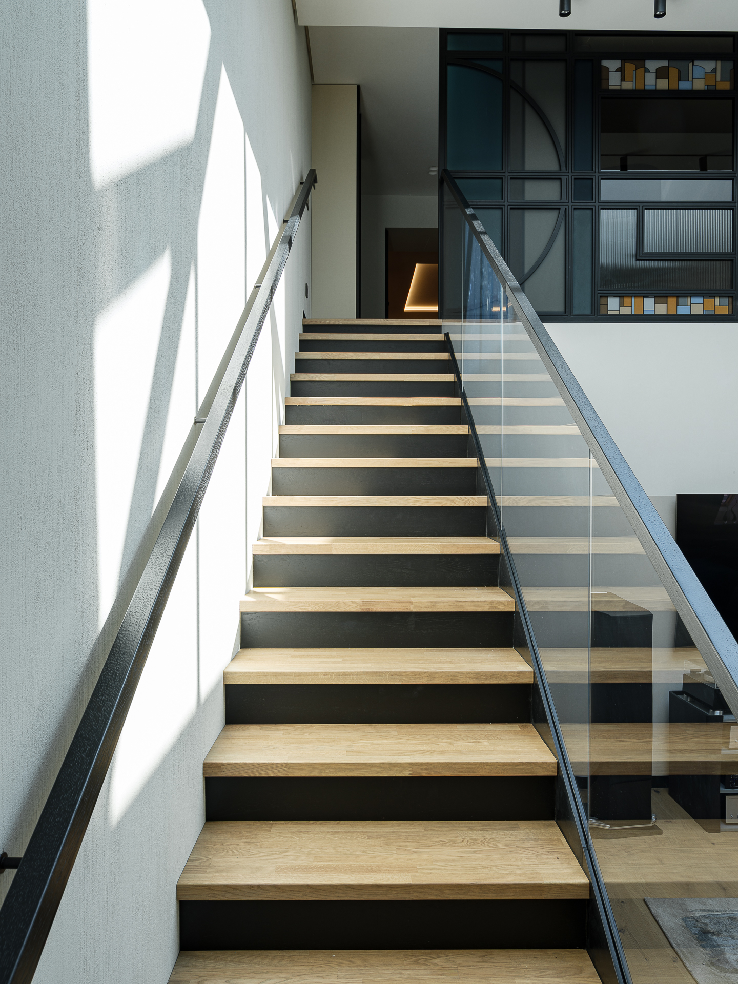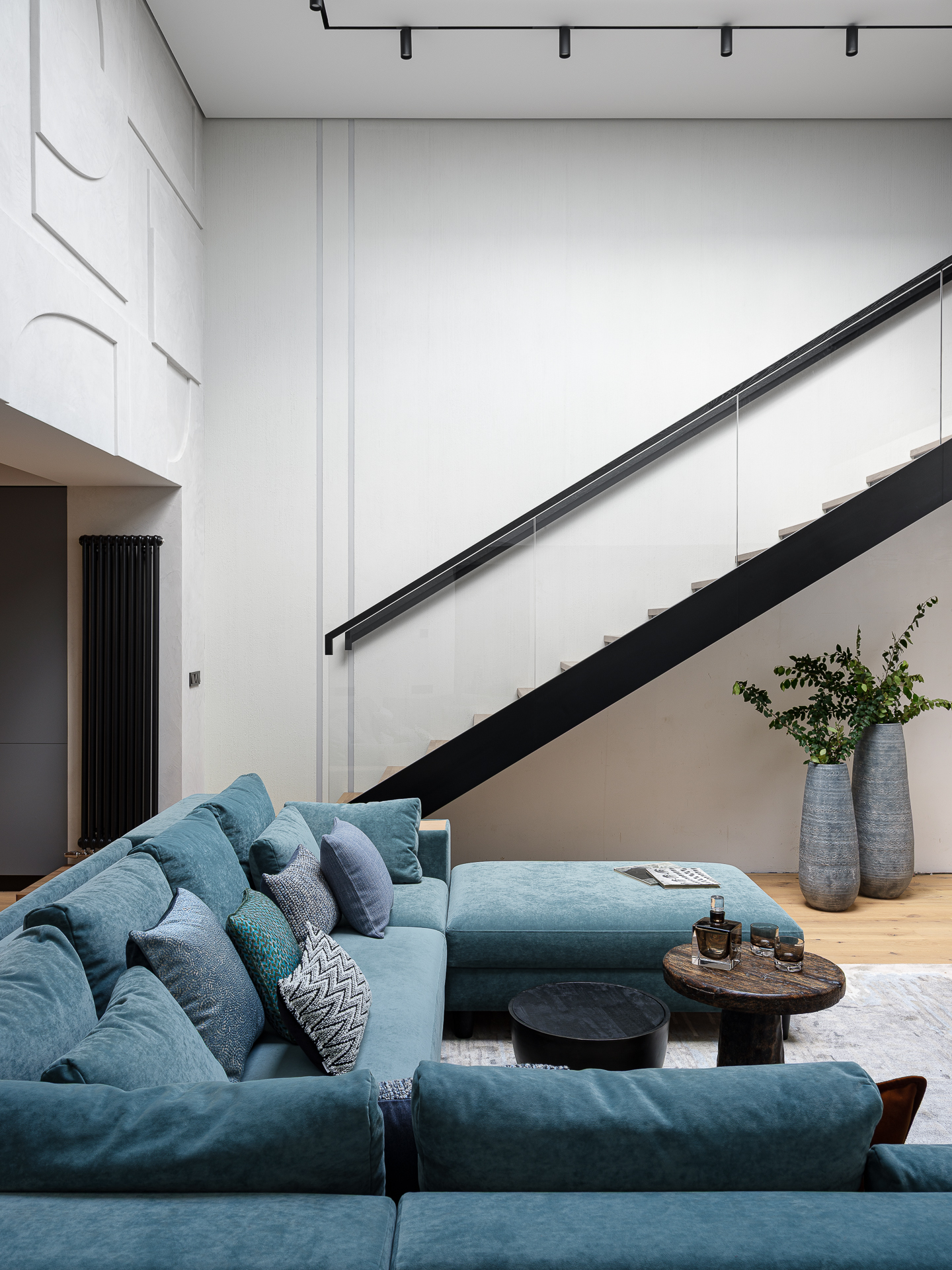 - Гостиная, как и вся квартира, сделана в современном стиле. Особенность данной гостиной – наличие светового фонаря в крыше. Гостиная разрабатывалась, как место для основного времяпрепровождения всей семьи. Большой П-образный диван для комфортного просмотра ТВ. Задача была повторить, имеющийся на тот момент в квартире, дизайн лестницы, а именно деревянные ступени и стеклоограждение. Основную концепцию лестницы сохранили, заменив лестничный косоур на тетиву и интегрировав под лестницу шкаф для хранения коллекции CD, DVD дисков и виниловых пластиной. Также, у клиента в наличии акустическое оборудование, которое необходимо было интегрировать в проект.