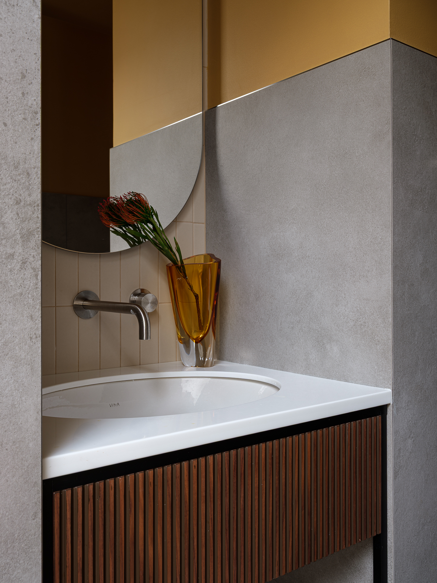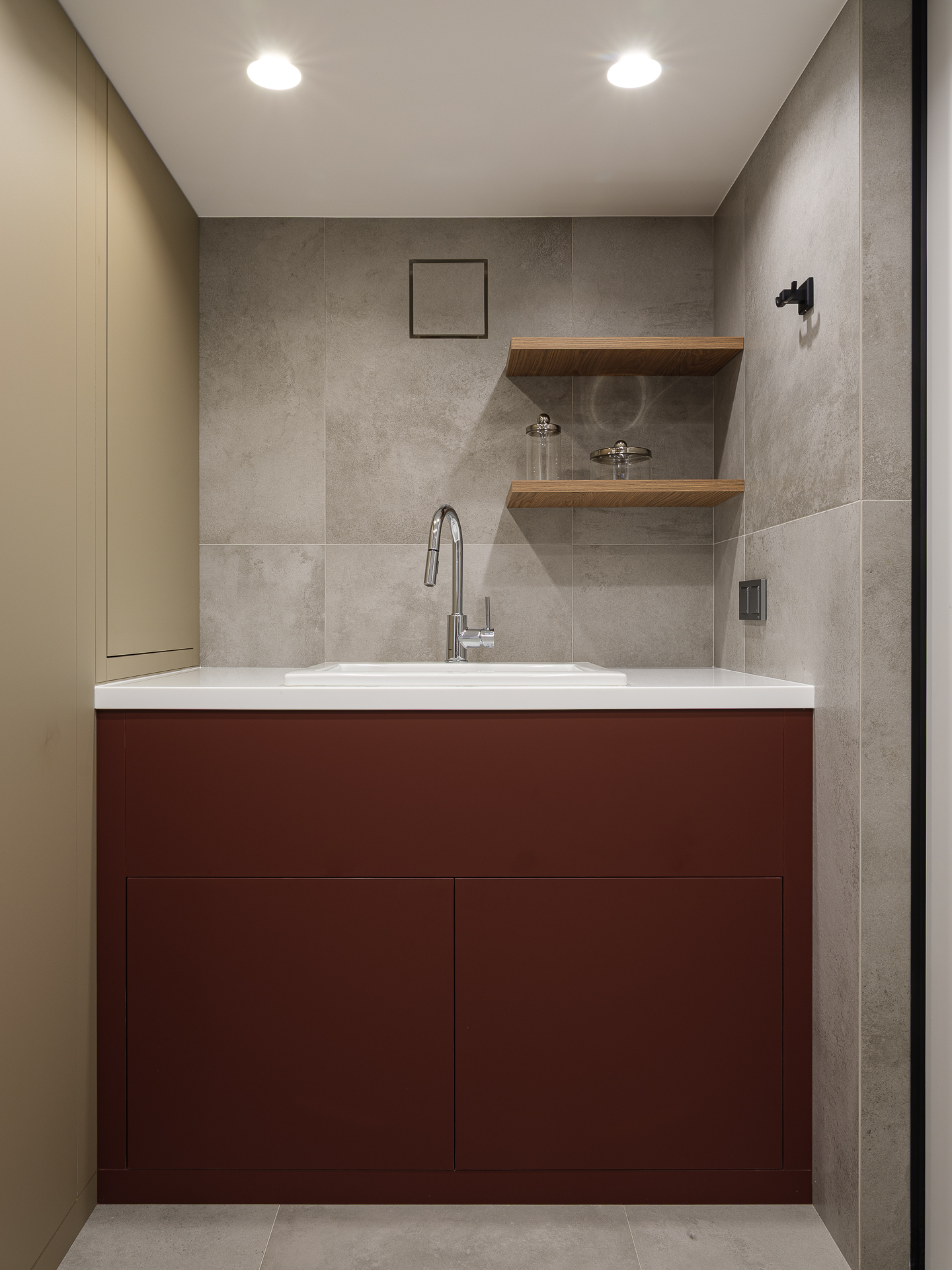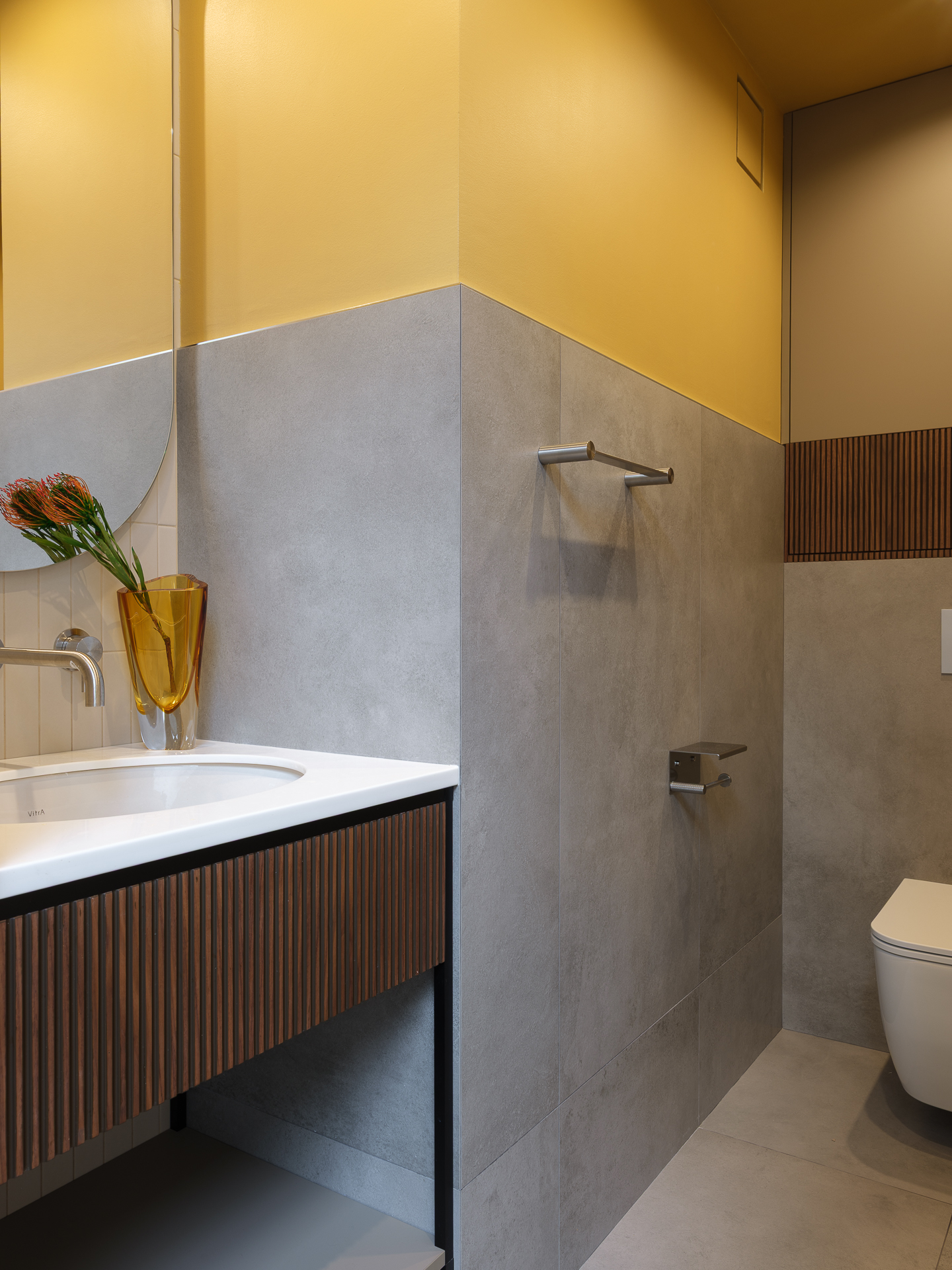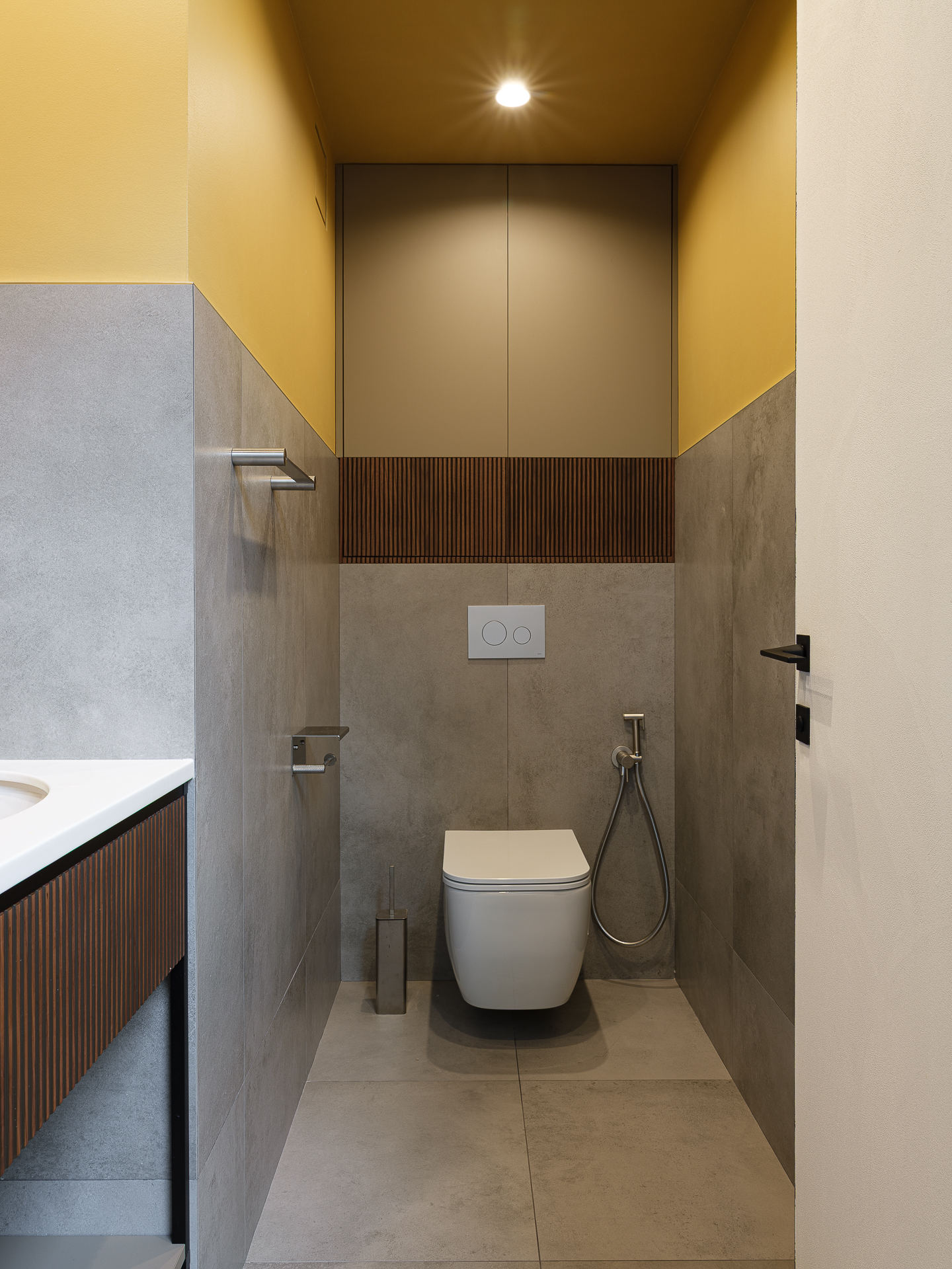 В гостевом санузле мы встречаем теплые оттенки, благодаря отделенной верхней части стены, которая выделена под покраску. Санузел, также подчеркивает лаконичность и современный дизайн квартиры.
