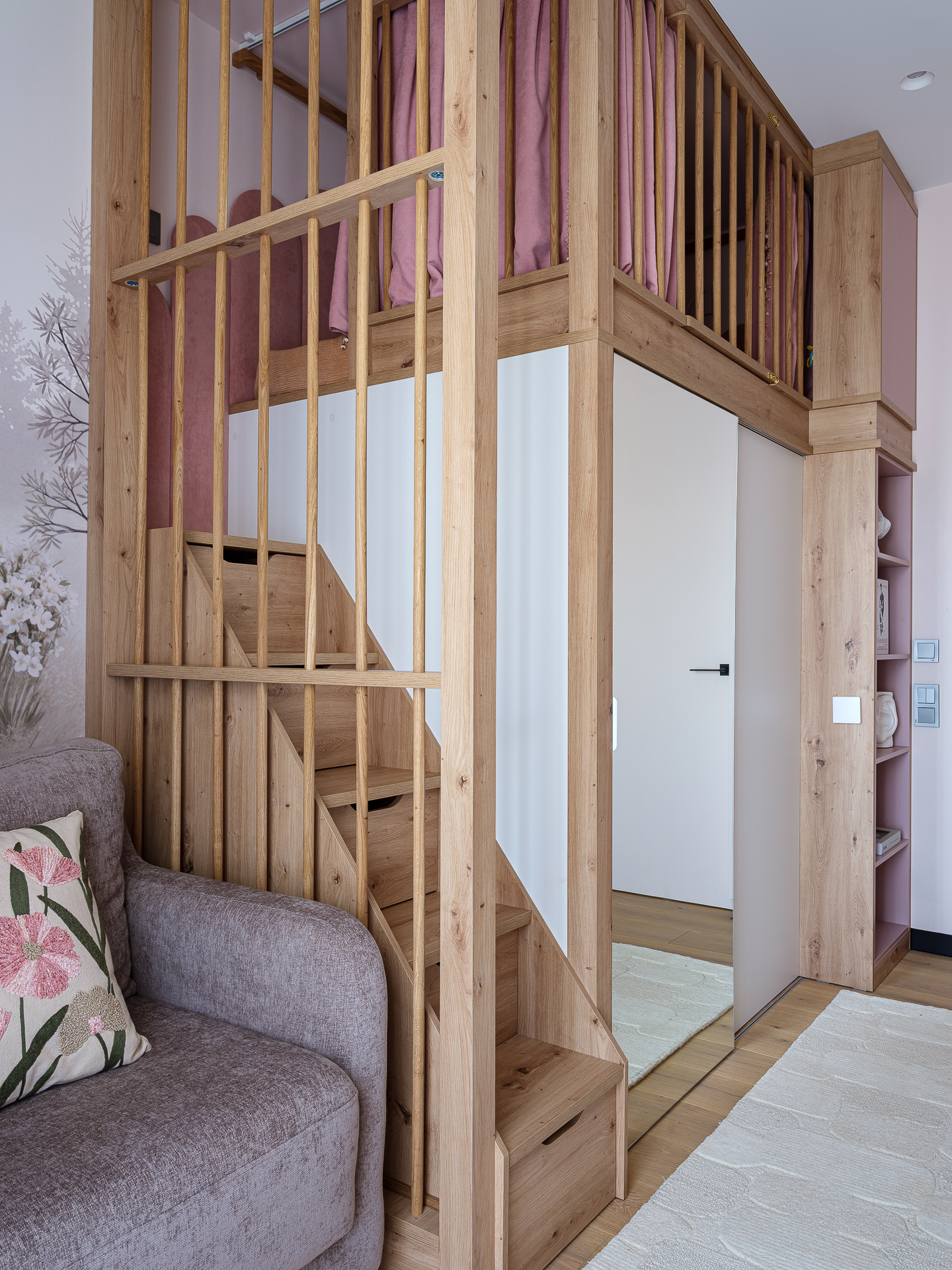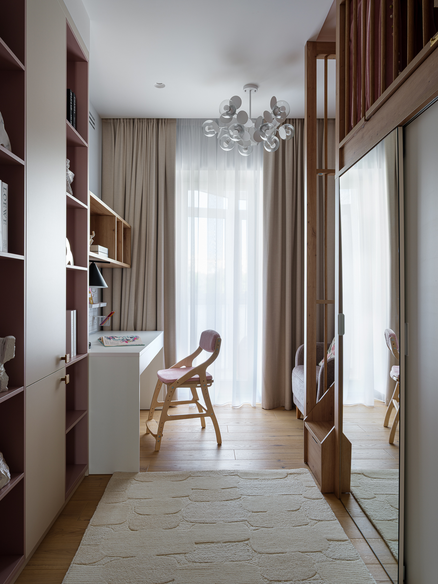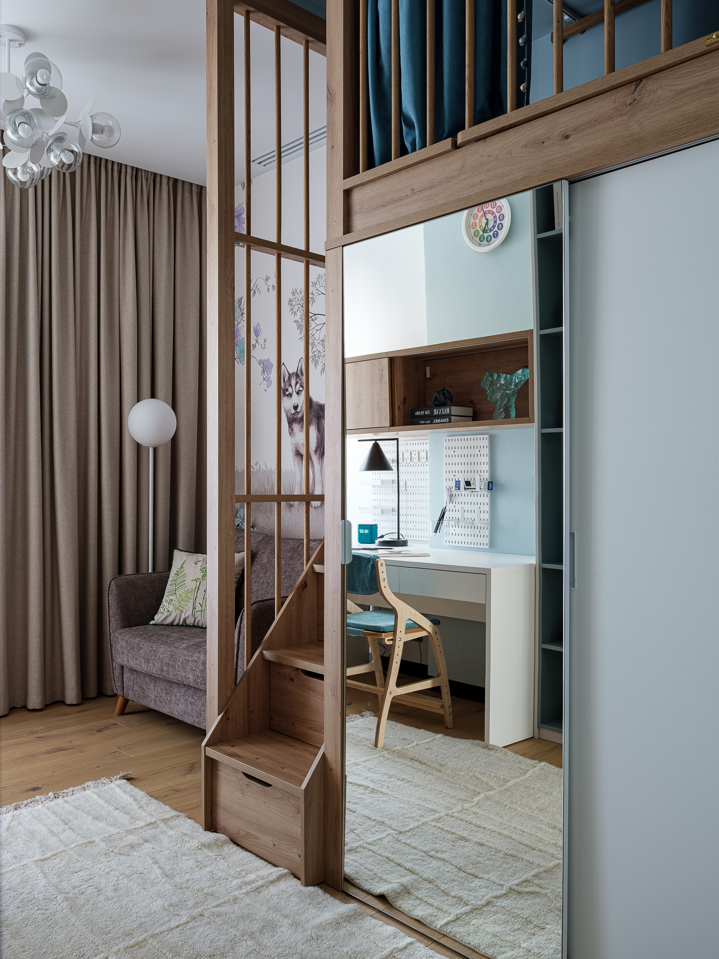 Так как в спальнях не было возможности разместить отдельные гардеробные, мы взяли за основу задумку клиентки с двухъярусной кроватью и встроенным шкафом под ней. Кровать на втором ярусе разработали с реечным ограждением и мягкими стеновыми панелями, под спальным местом отдельная гардеробная система хранения с раздвижными дверцами. В ступеньках выдвижные ящики. Рабочие места и компактные диванчики разместили у окна.