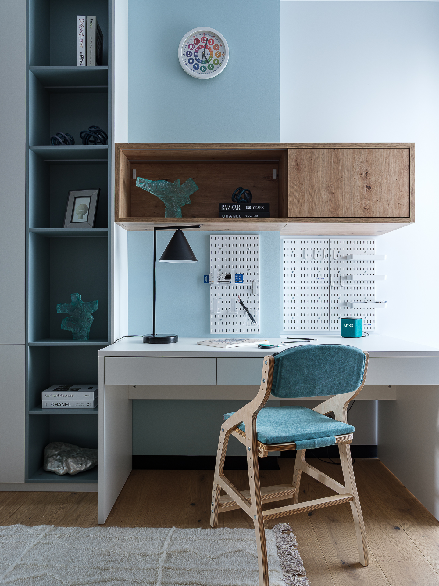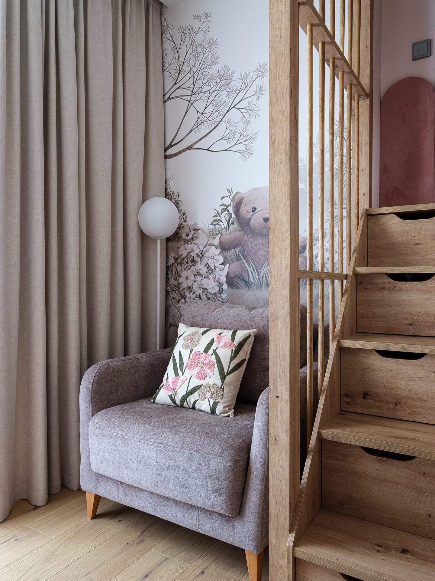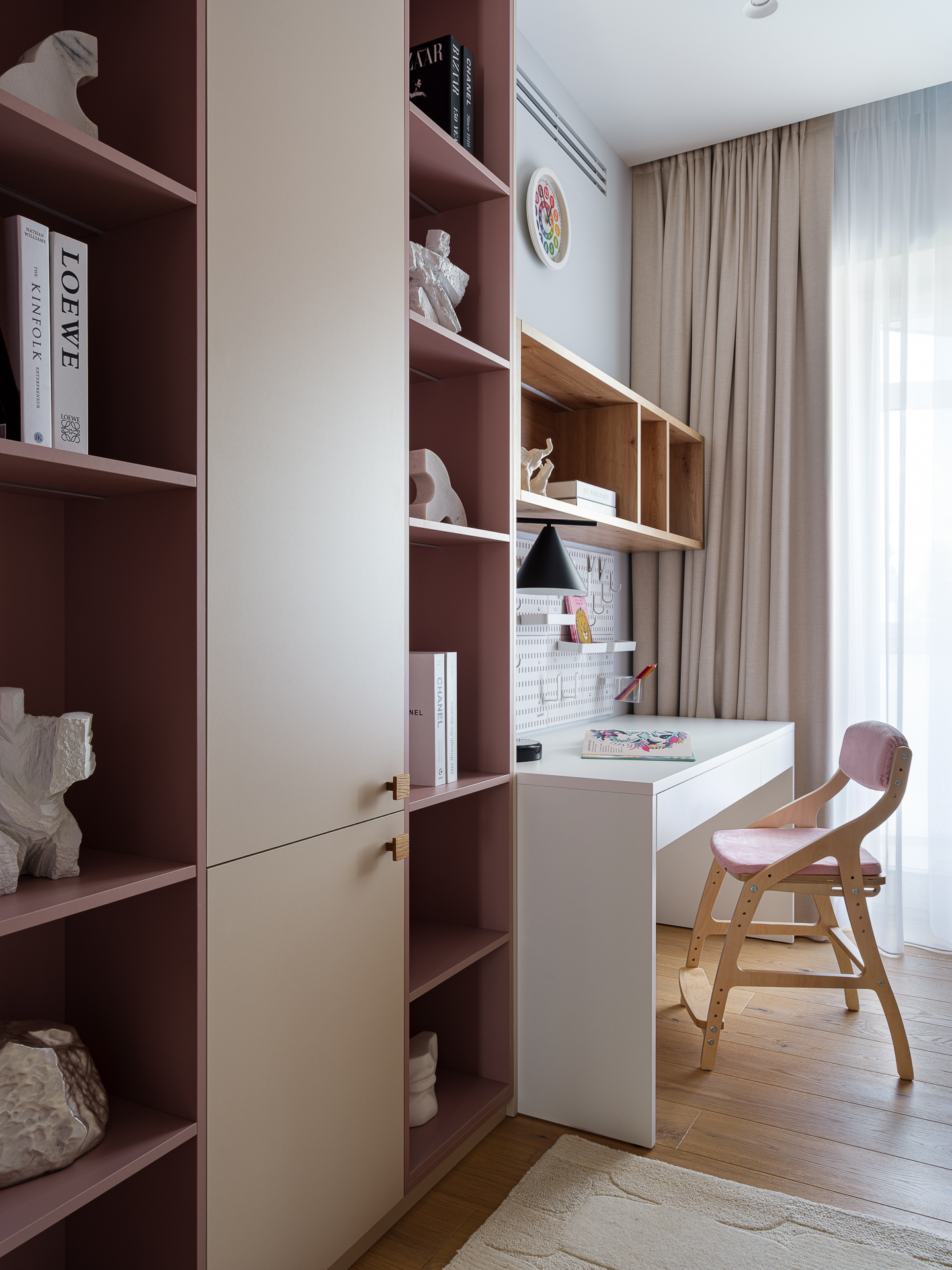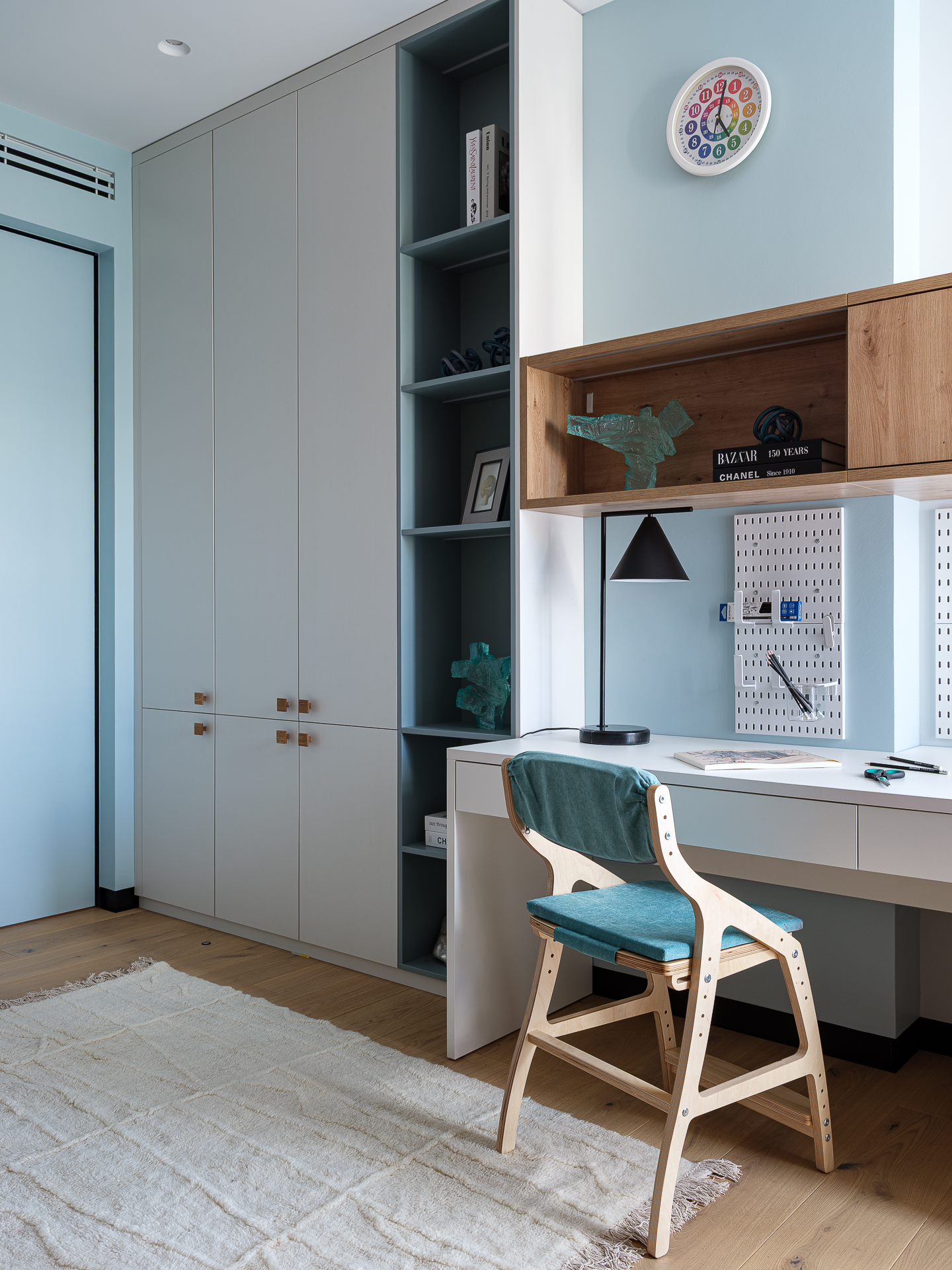Так как в спальнях не было возможности разместить отдельные гардеробные, мы взяли за основу задумку клиентки с двухъярусной кроватью и встроенным шкафом под ней. Кровать на втором ярусе разработали с реечным ограждением и мягкими стеновыми панелями, под спальным местом отдельная гардеробная система хранения с раздвижными дверцами. В ступеньках выдвижные ящики. Рабочие места и компактные диванчики разместили у окна.