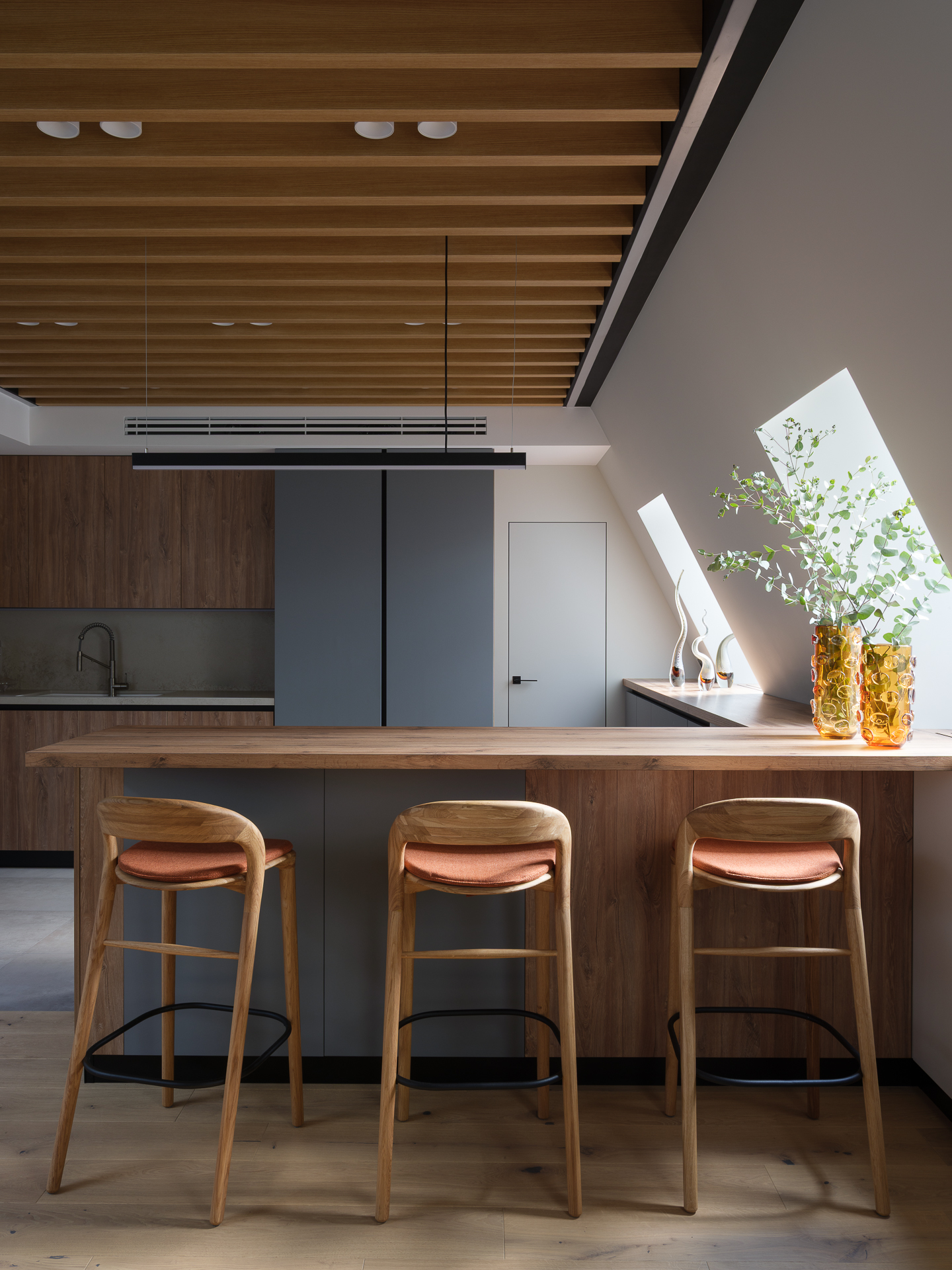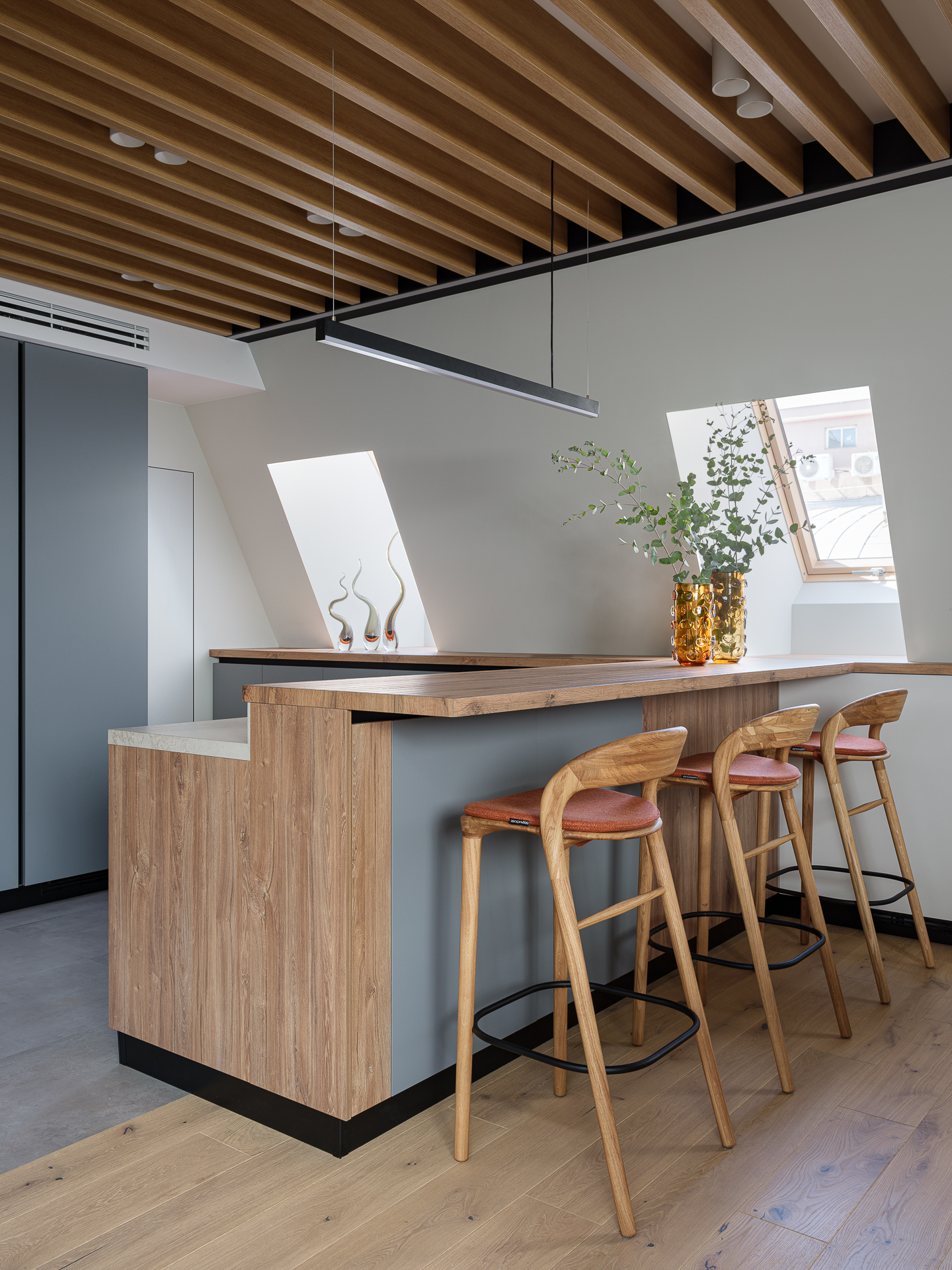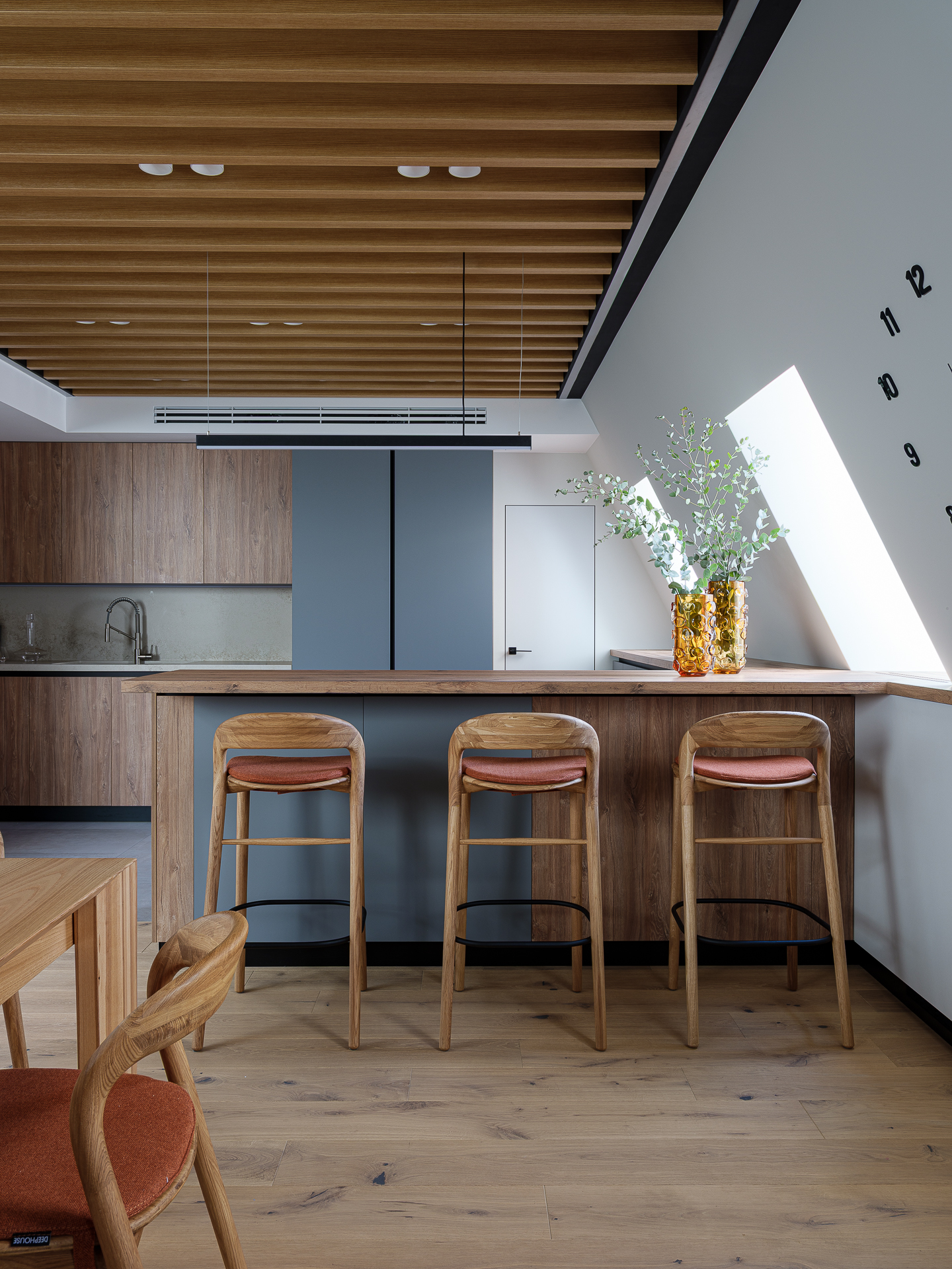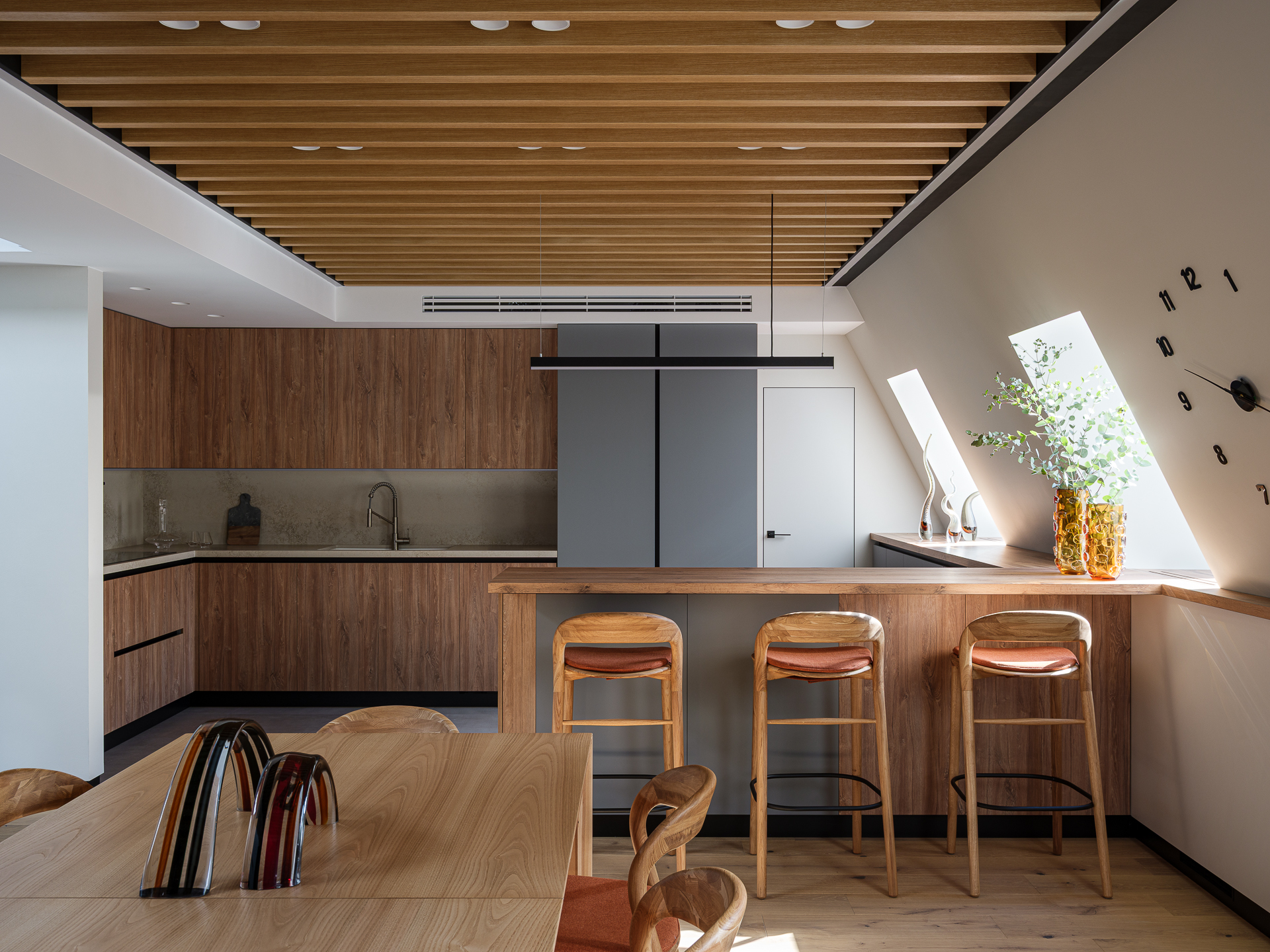 - Семейная кухня учитывает интересы каждого члена семьи. Уют создают теплые деревянные элементы в интерьере, деревянные мансардные окна. В этой зоне заказчикам хотелось видеть большой стол, мебельные решения для хранения кухонной техники и посуды. Отдельный холодильник и большую морозильную камеру. Заказчики любят готовить всей семьей, поэтому выделили несколько рабочих зон (в зоне кухни, у барной стойки) и обеденную зоны, так члены семьи могут совместить общение, приготовление пищи и не мешать друг другу. В подоконном пространстве мы предусмотрели место для закрытого хранения. В зоне кухни расположили большую варочную панель на пять конфорок и вместительную двойную мойку.