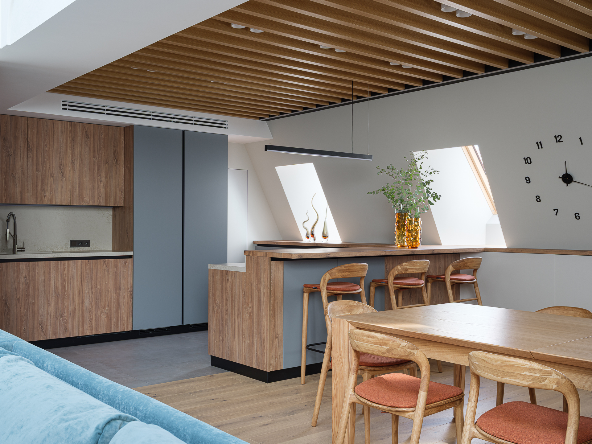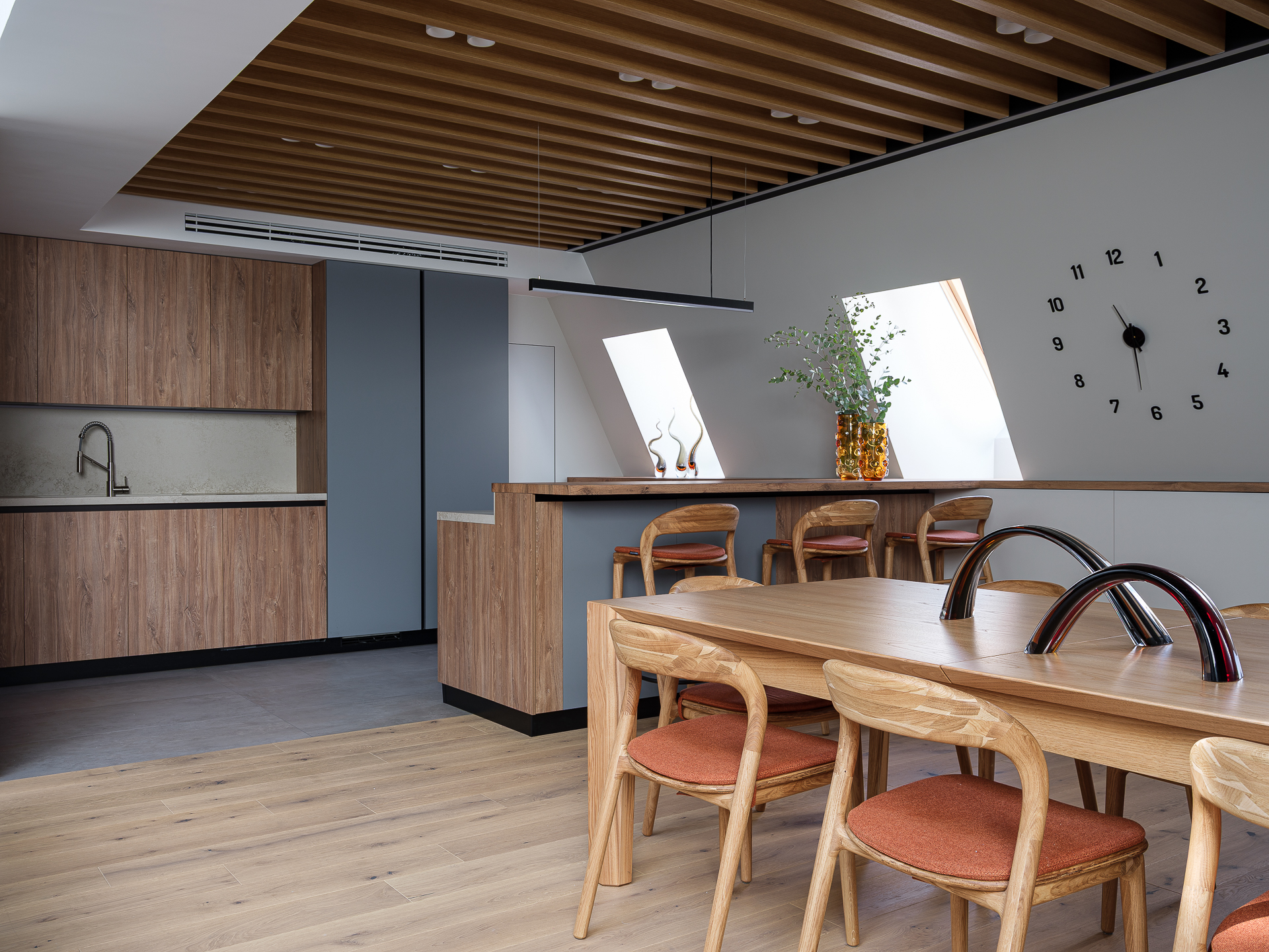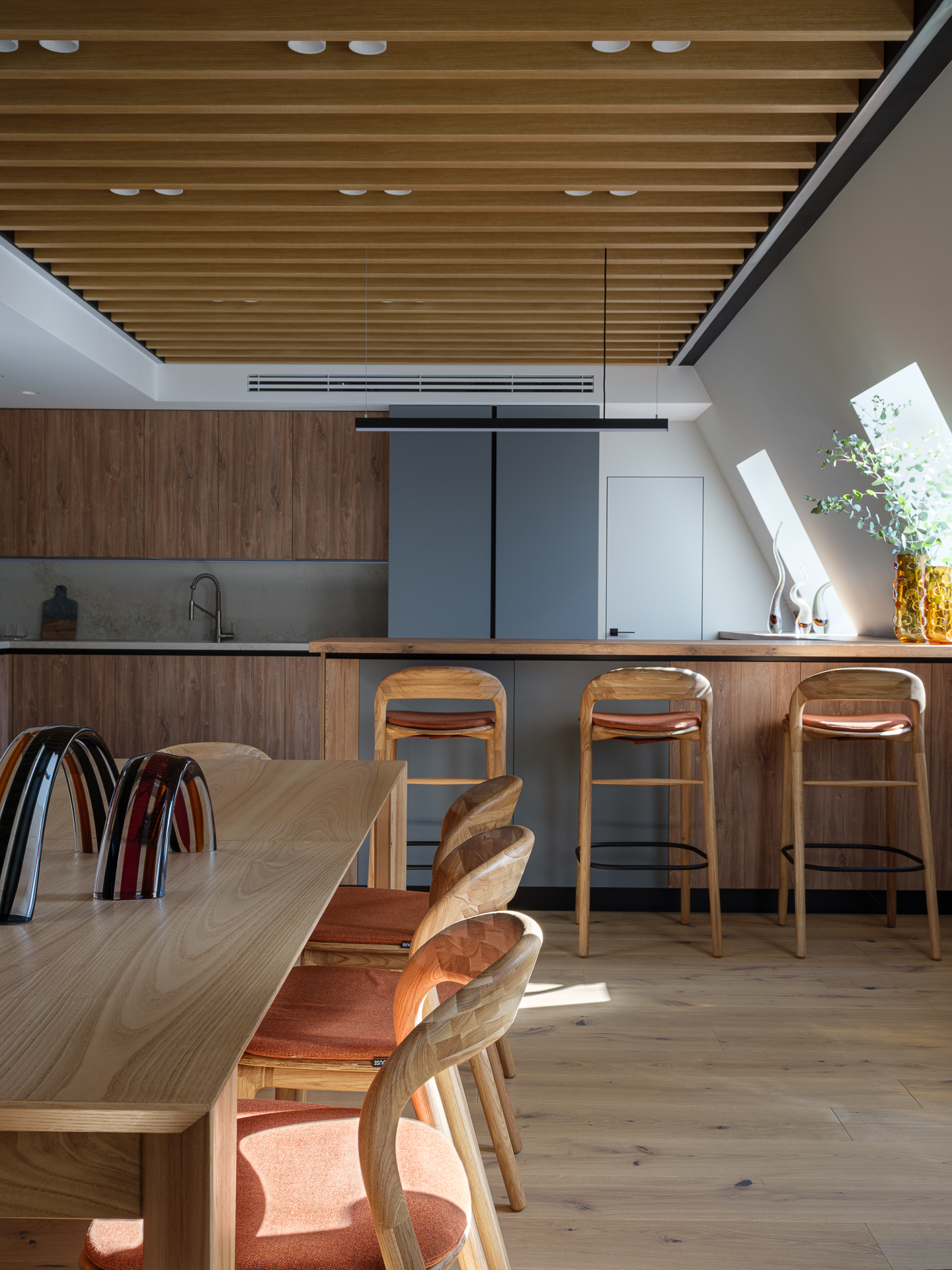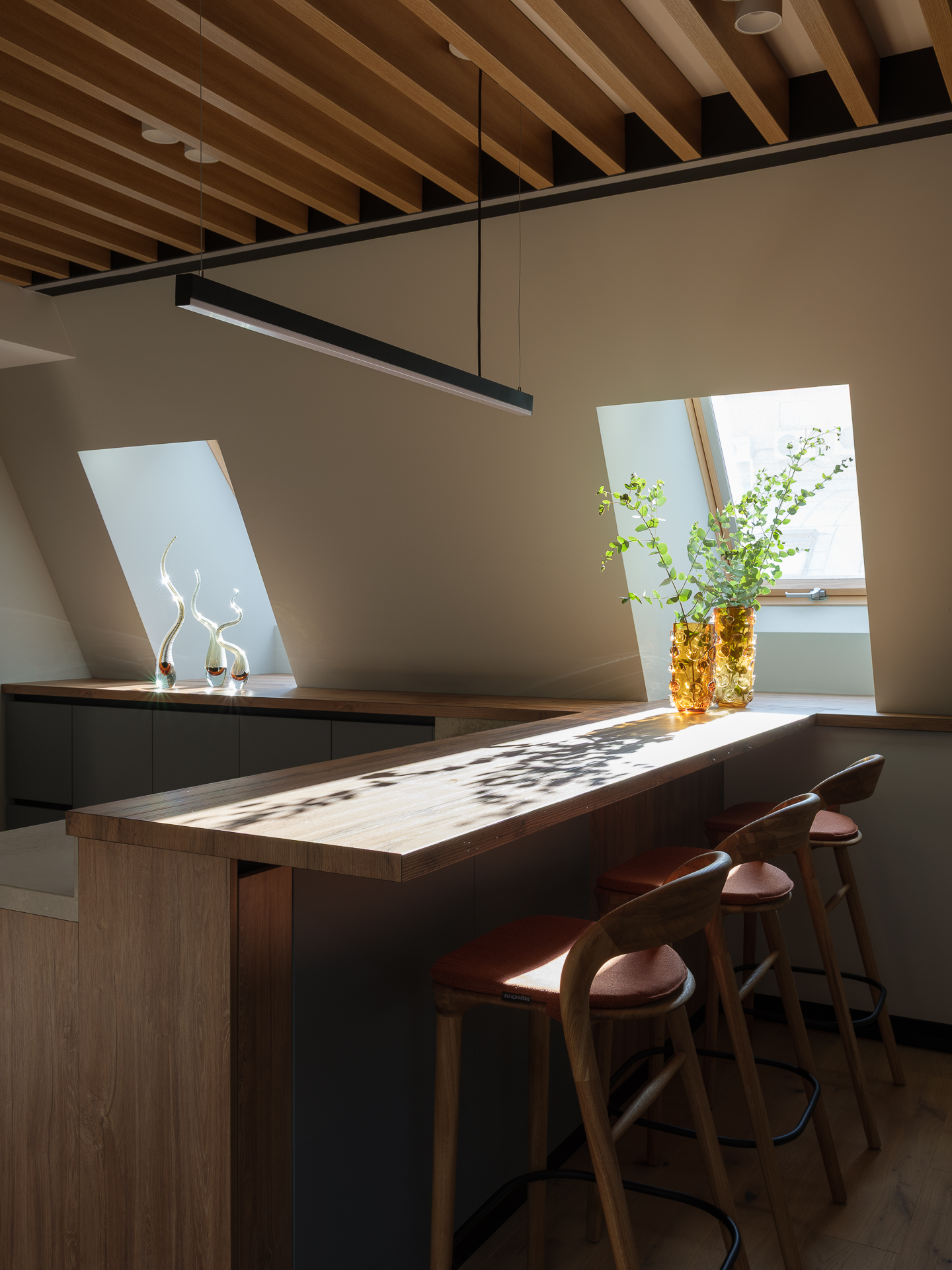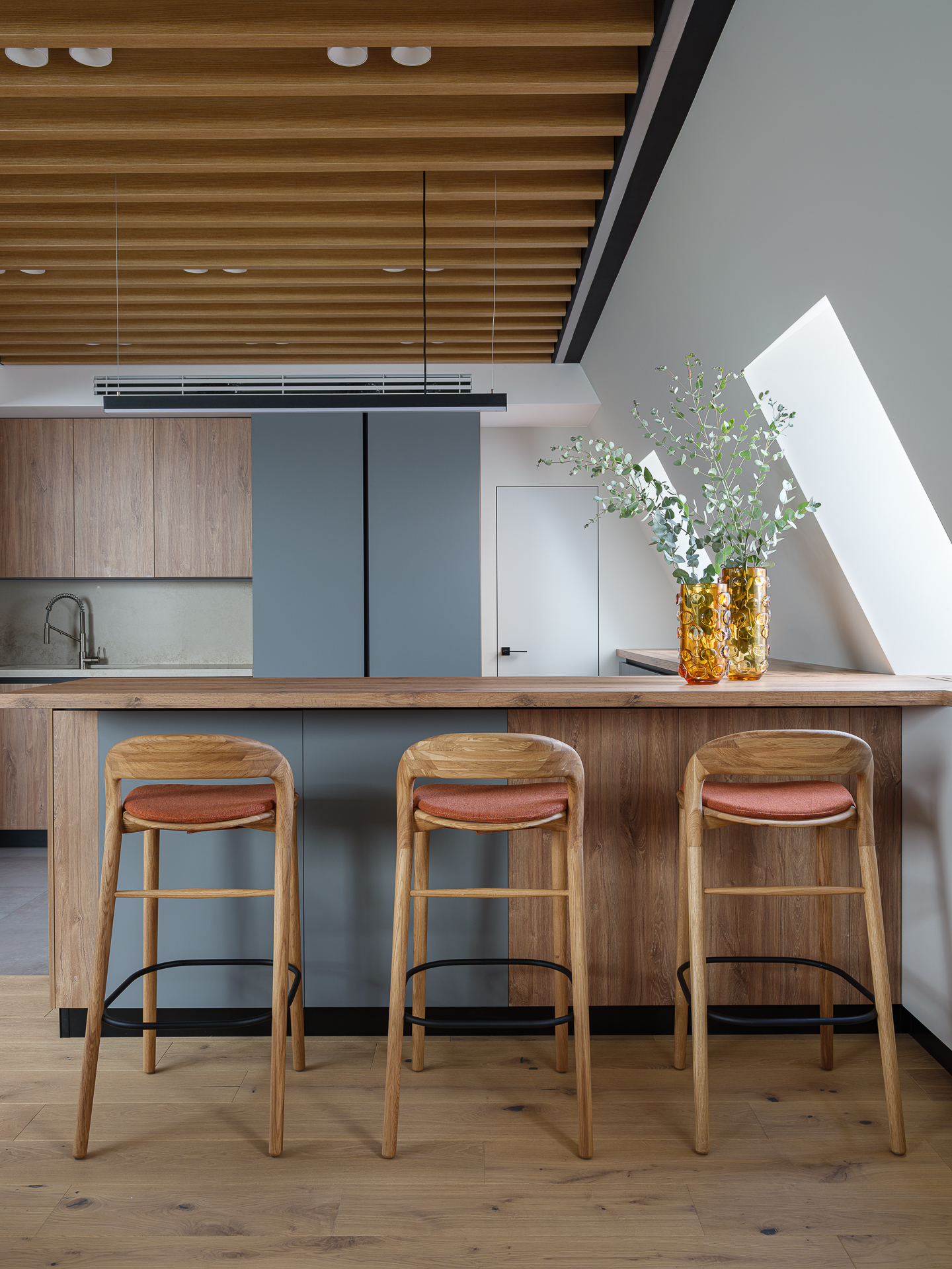 - Семейная кухня учитывает интересы каждого члена семьи. Уют создают теплые деревянные элементы в интерьере, деревянные мансардные окна. В этой зоне заказчикам хотелось видеть большой стол, мебельные решения для хранения кухонной техники и посуды. Отдельный холодильник и большую морозильную камеру. Заказчики любят готовить всей семьей, поэтому выделили несколько рабочих зон (в зоне кухни, у барной стойки) и обеденную зоны, так члены семьи могут совместить общение, приготовление пищи и не мешать друг другу. В подоконном пространстве мы предусмотрели место для закрытого хранения. В зоне кухни расположили большую варочную панель на пять конфорок и вместительную двойную мойку.