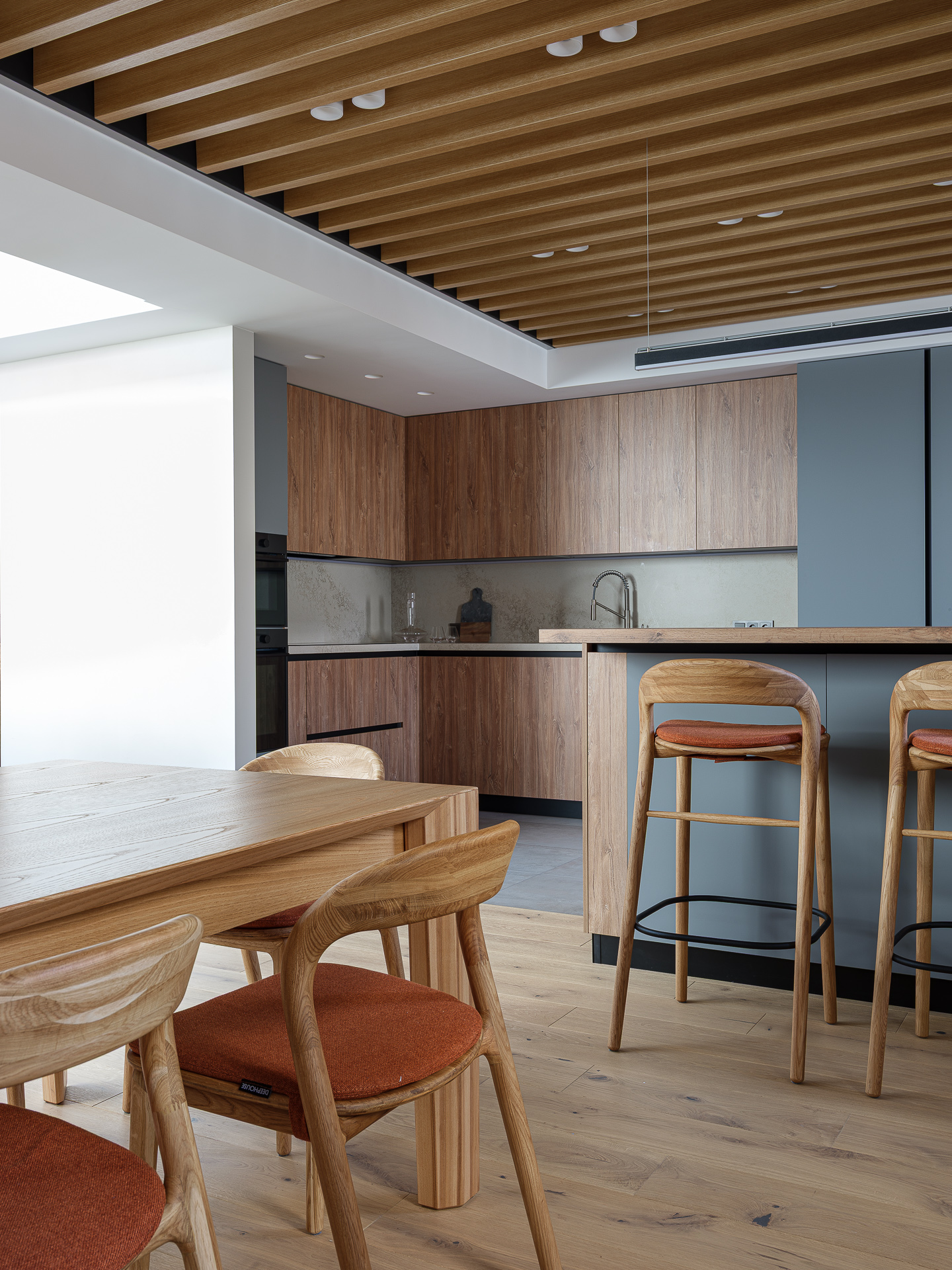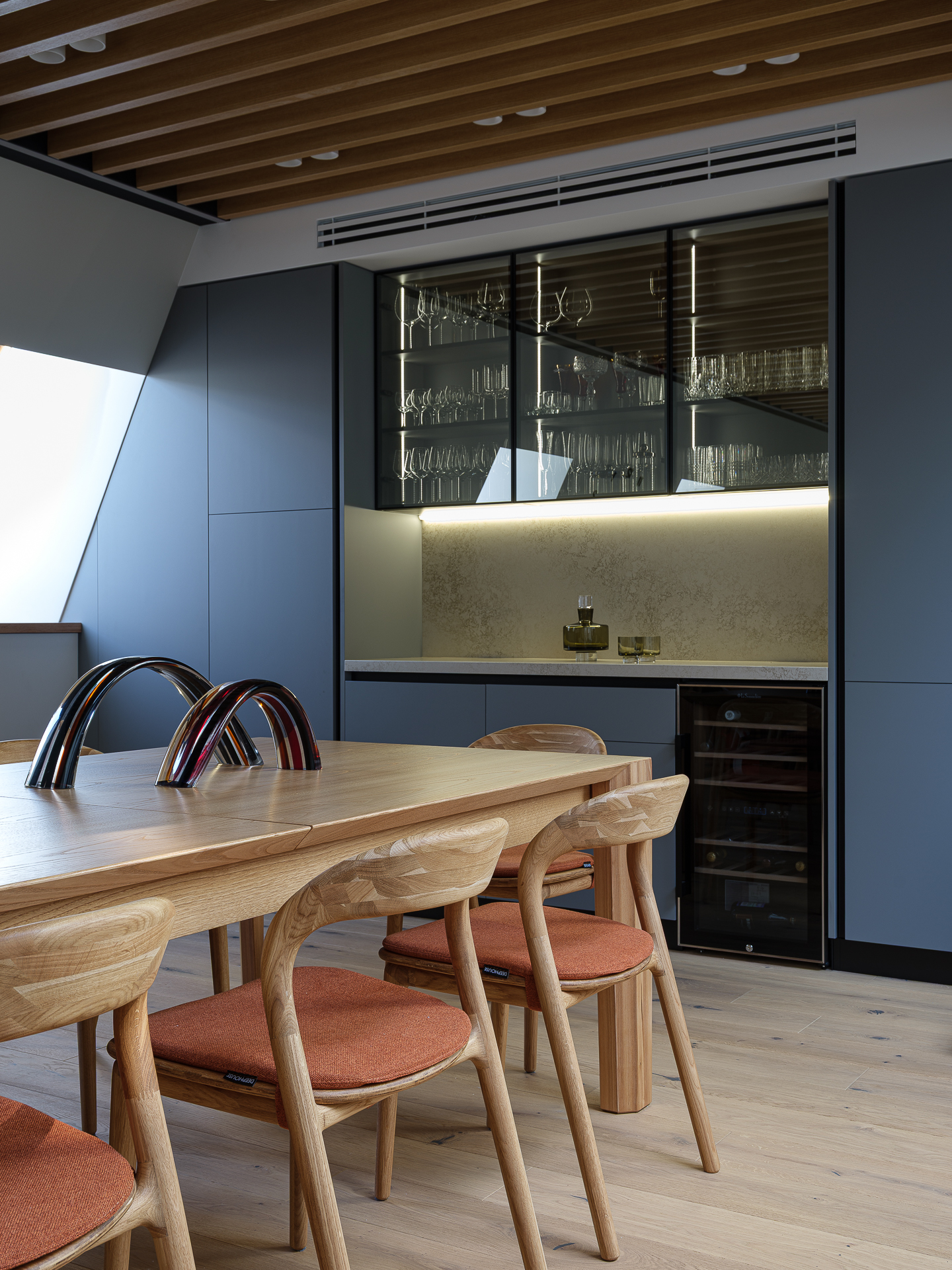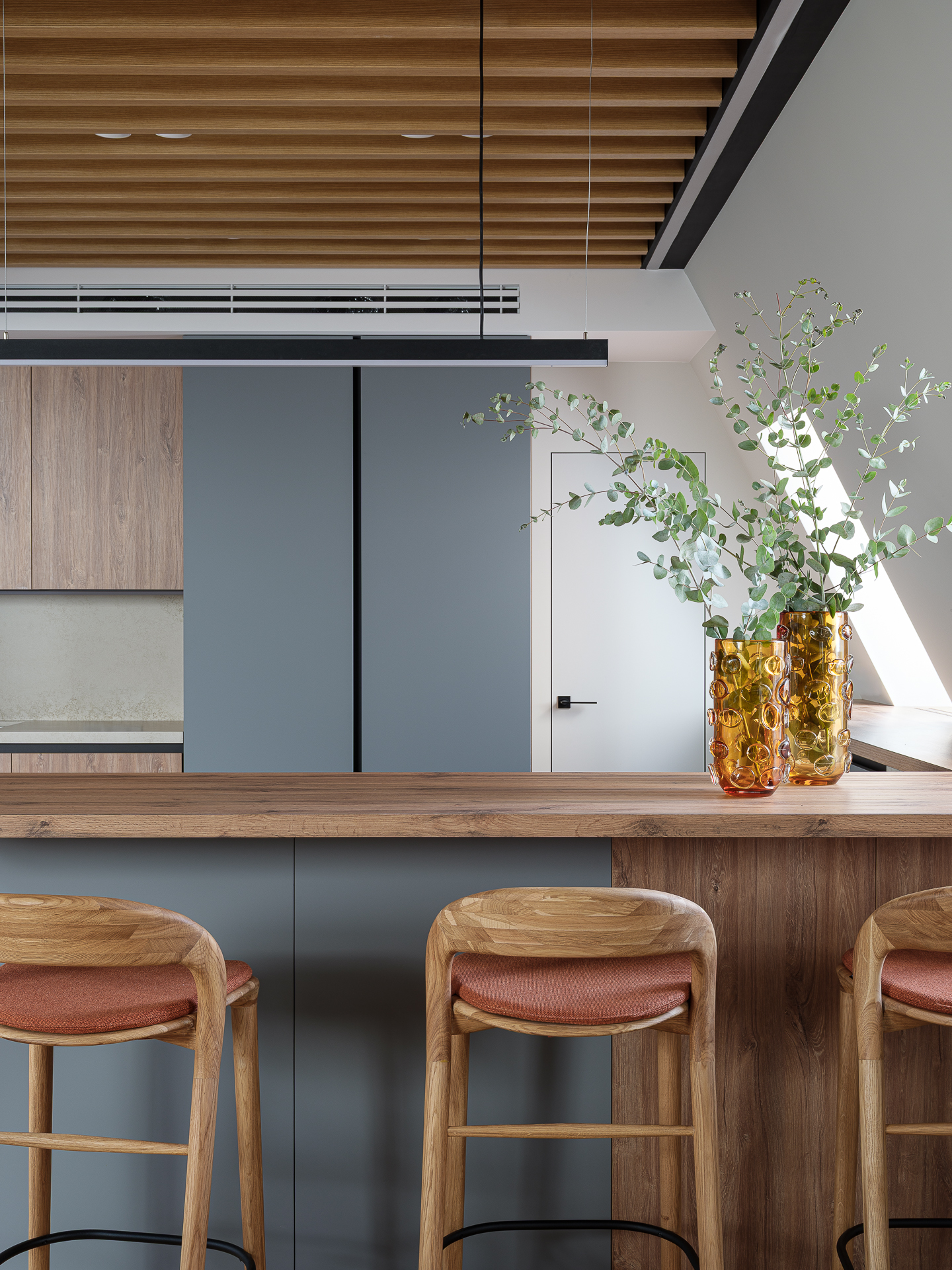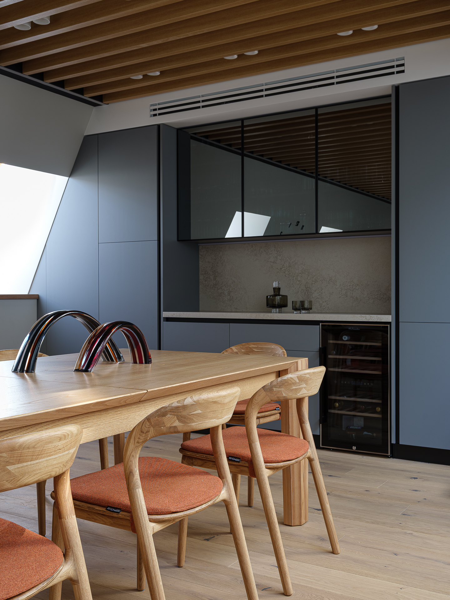 - Семейная кухня учитывает интересы каждого члена семьи. Уют создают теплые деревянные элементы в интерьере, деревянные мансардные окна. В этой зоне заказчикам хотелось видеть большой стол, мебельные решения для хранения кухонной техники и посуды. Отдельный холодильник и большую морозильную камеру. Заказчики любят готовить всей семьей, поэтому выделили несколько рабочих зон (в зоне кухни, у барной стойки) и обеденную зоны, так члены семьи могут совместить общение, приготовление пищи и не мешать друг другу. В подоконном пространстве мы предусмотрели место для закрытого хранения. В зоне кухни расположили большую варочную панель на пять конфорок и вместительную двойную мойку.