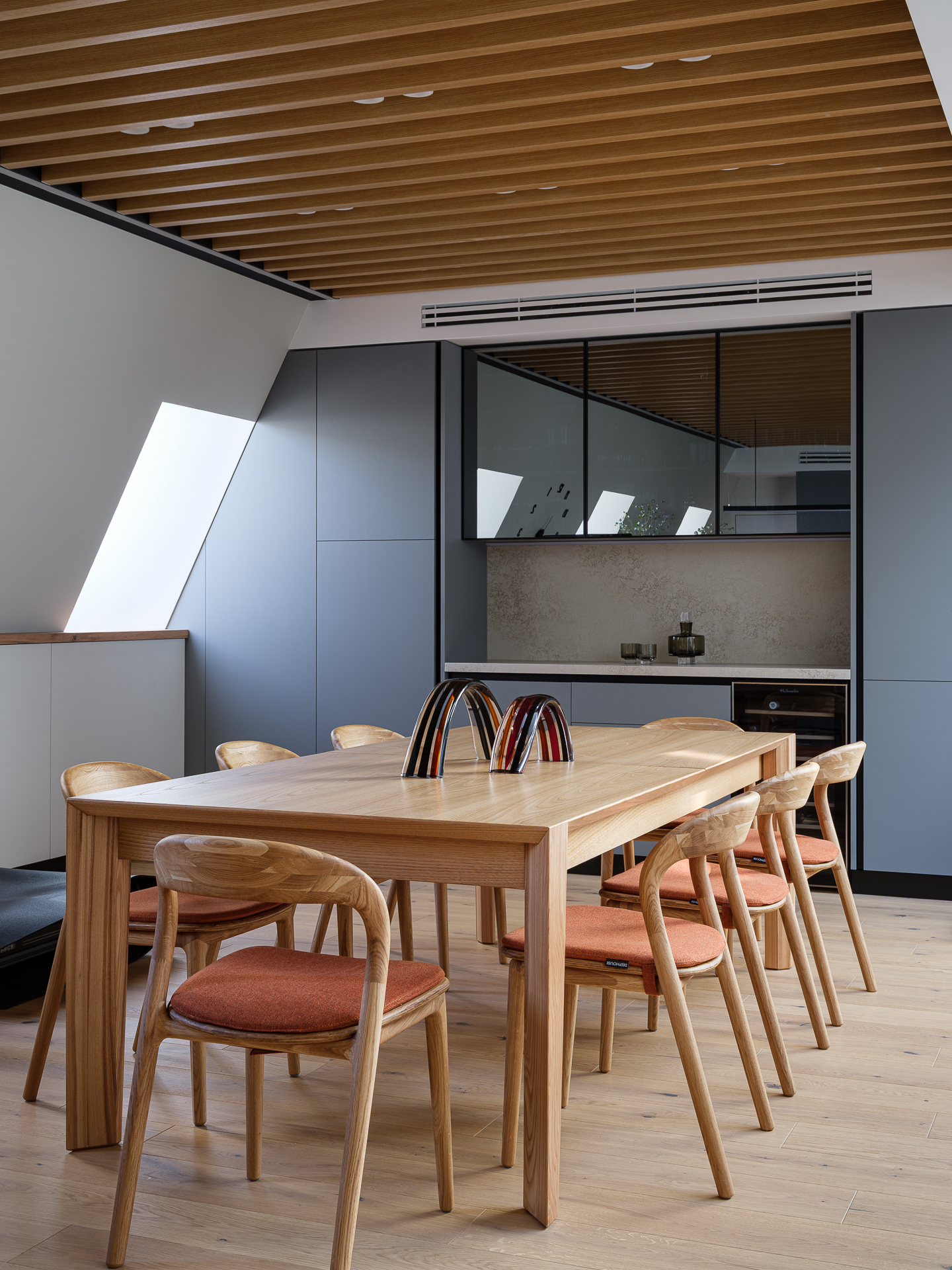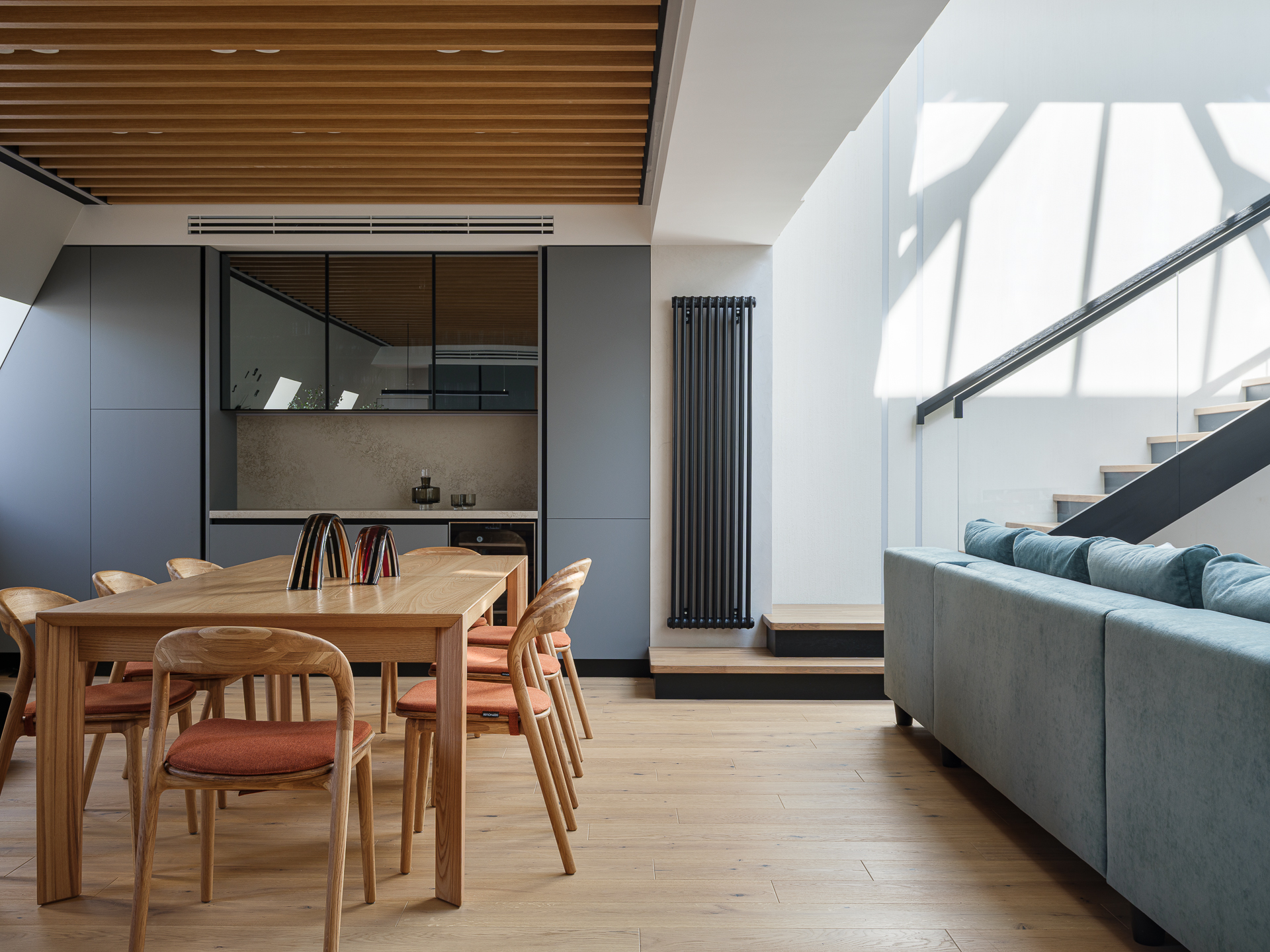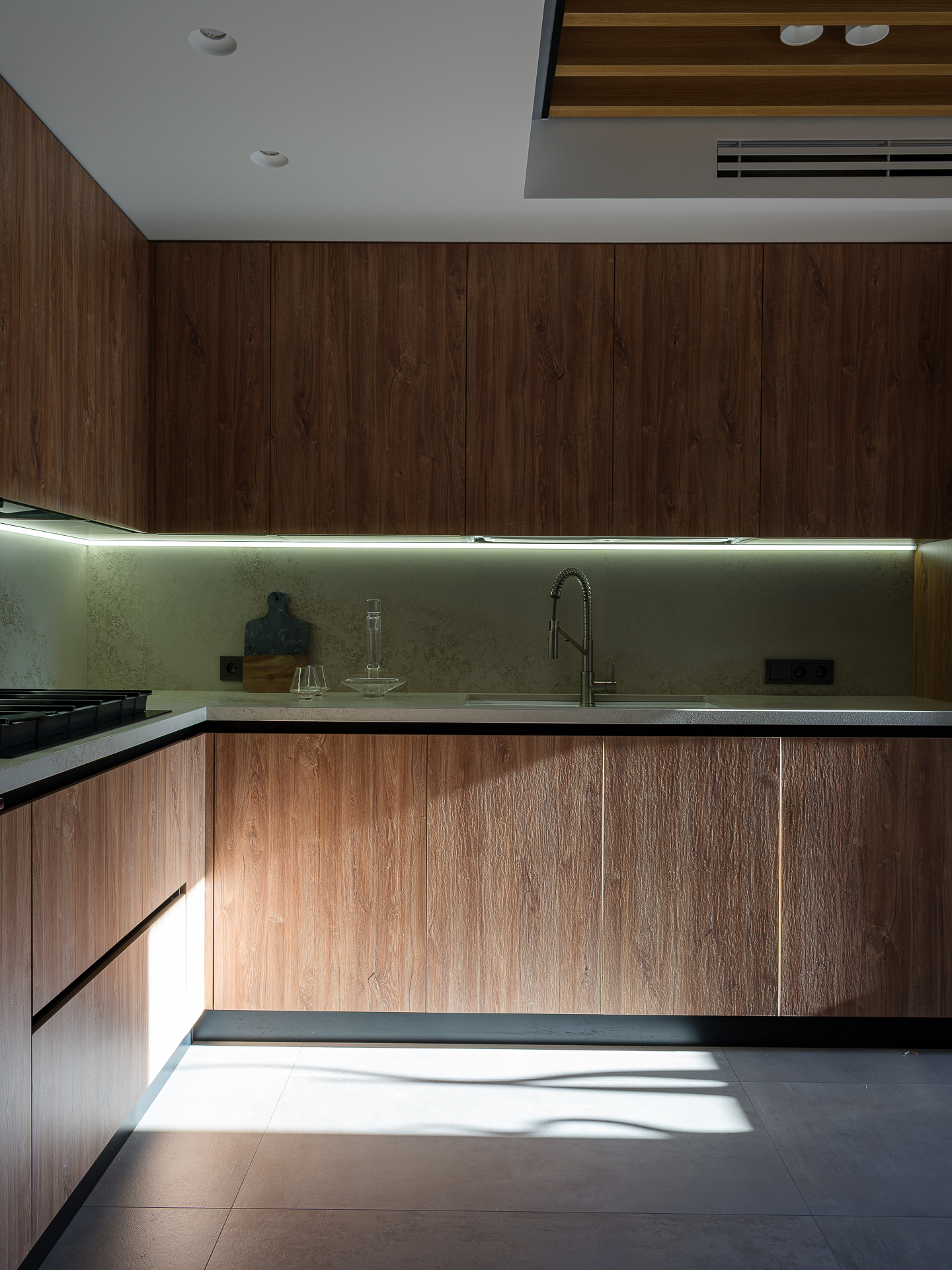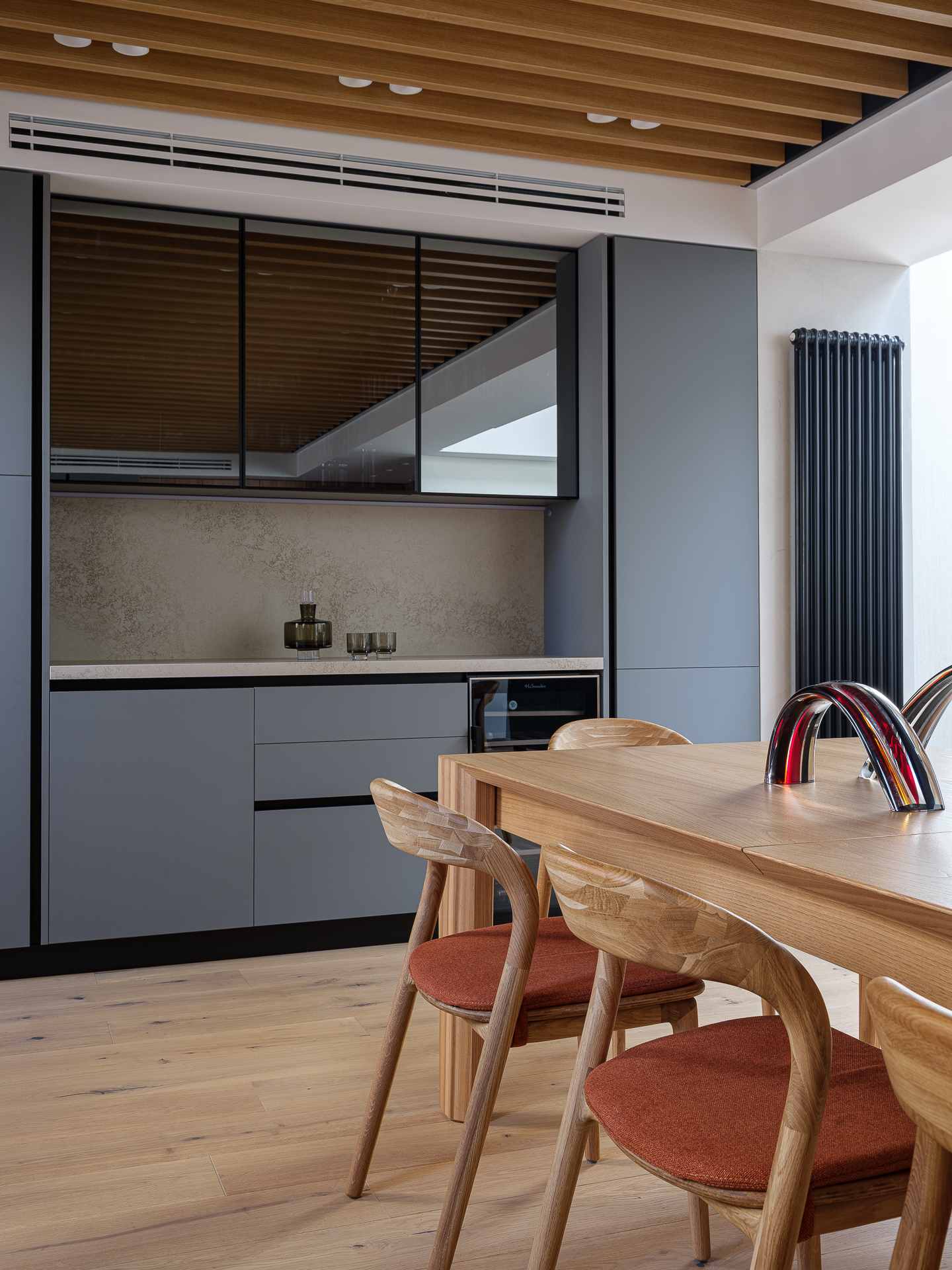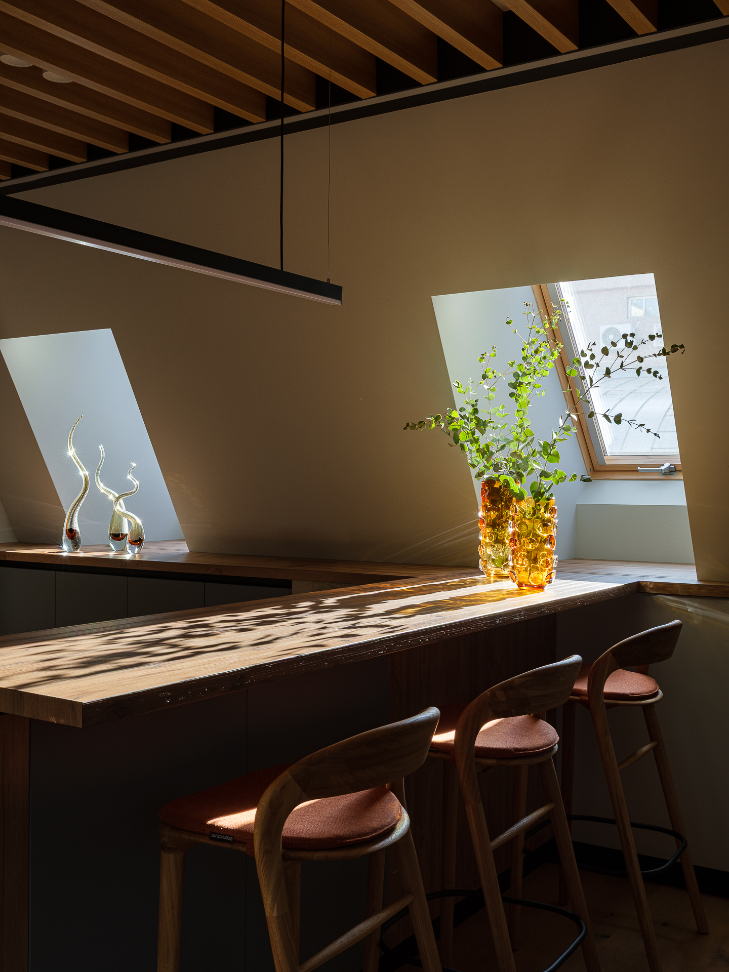 - Семейная кухня учитывает интересы каждого члена семьи. Уют создают теплые деревянные элементы в интерьере, деревянные мансардные окна. В этой зоне заказчикам хотелось видеть большой стол, мебельные решения для хранения кухонной техники и посуды. Отдельный холодильник и большую морозильную камеру. Заказчики любят готовить всей семьей, поэтому выделили несколько рабочих зон (в зоне кухни, у барной стойки) и обеденную зоны, так члены семьи могут совместить общение, приготовление пищи и не мешать друг другу. В подоконном пространстве мы предусмотрели место для закрытого хранения. В зоне кухни расположили большую варочную панель на пять конфорок и вместительную двойную мойку.