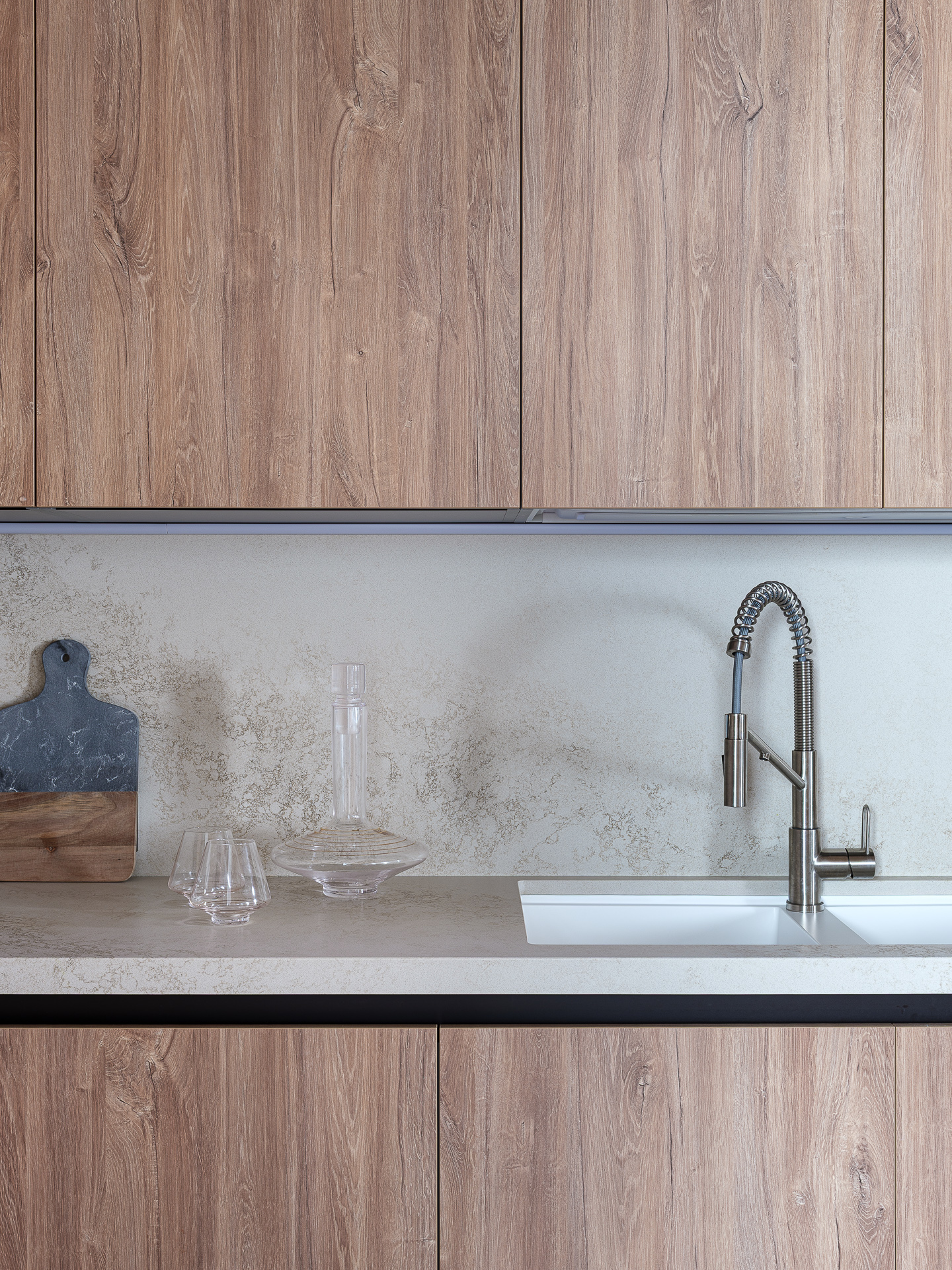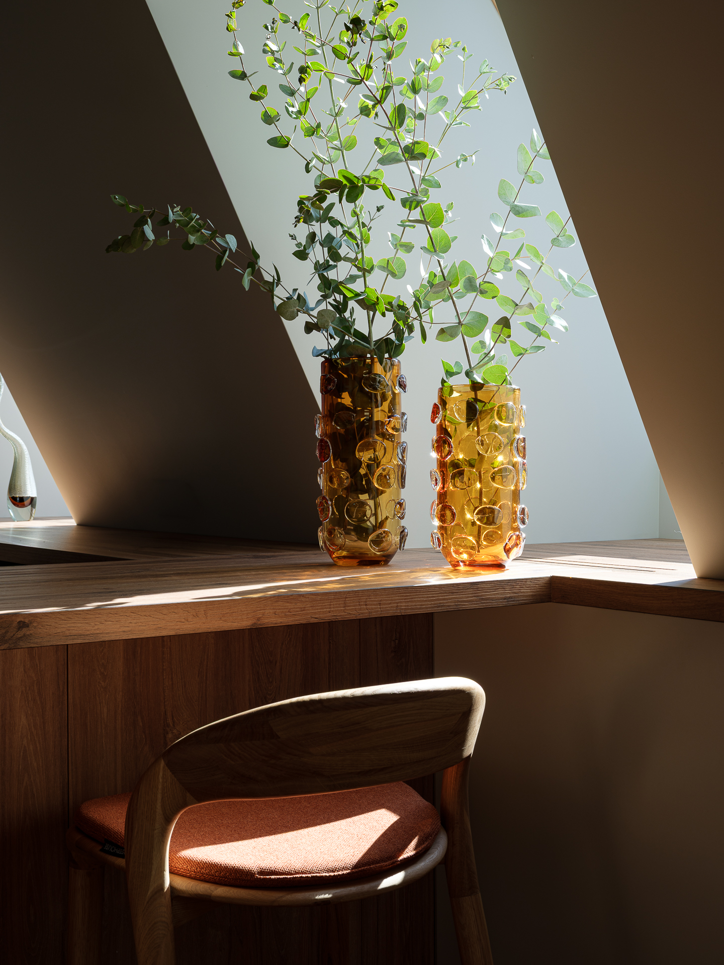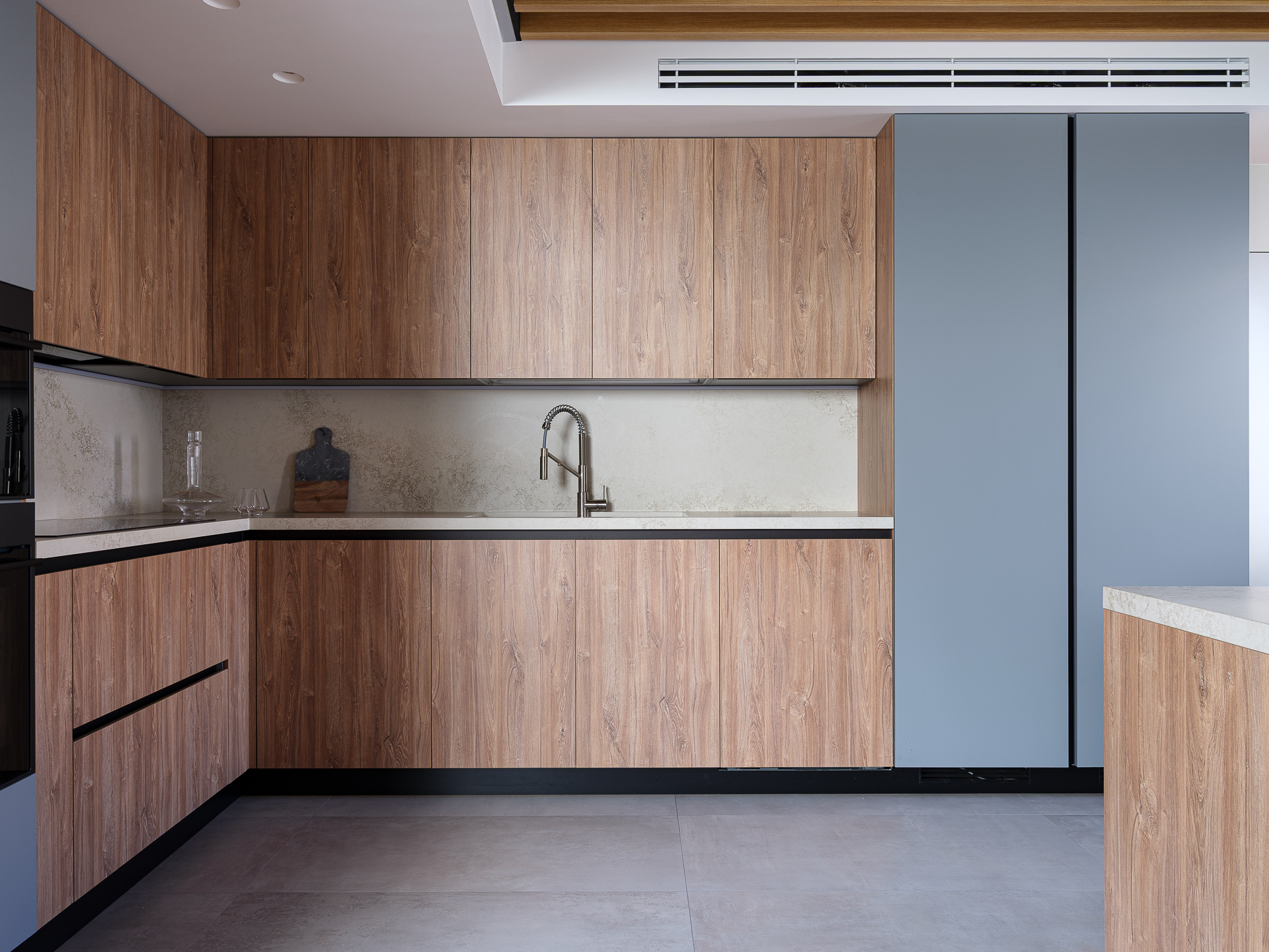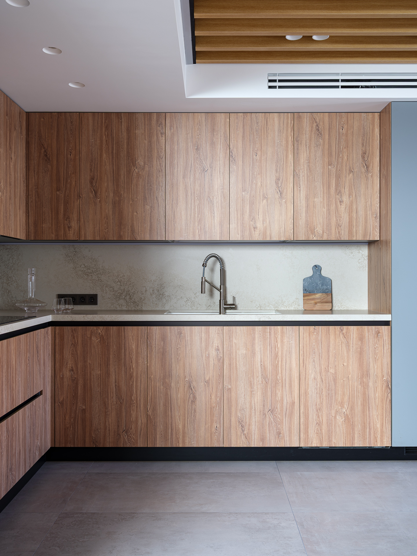 - Семейная кухня учитывает интересы каждого члена семьи. Уют создают теплые деревянные элементы в интерьере, деревянные мансардные окна. В этой зоне заказчикам хотелось видеть большой стол, мебельные решения для хранения кухонной техники и посуды. Отдельный холодильник и большую морозильную камеру. Заказчики любят готовить всей семьей, поэтому выделили несколько рабочих зон (в зоне кухни, у барной стойки) и обеденную зоны, так члены семьи могут совместить общение, приготовление пищи и не мешать друг другу. В подоконном пространстве мы предусмотрели место для закрытого хранения. В зоне кухни расположили большую варочную панель на пять конфорок и вместительную двойную мойку.