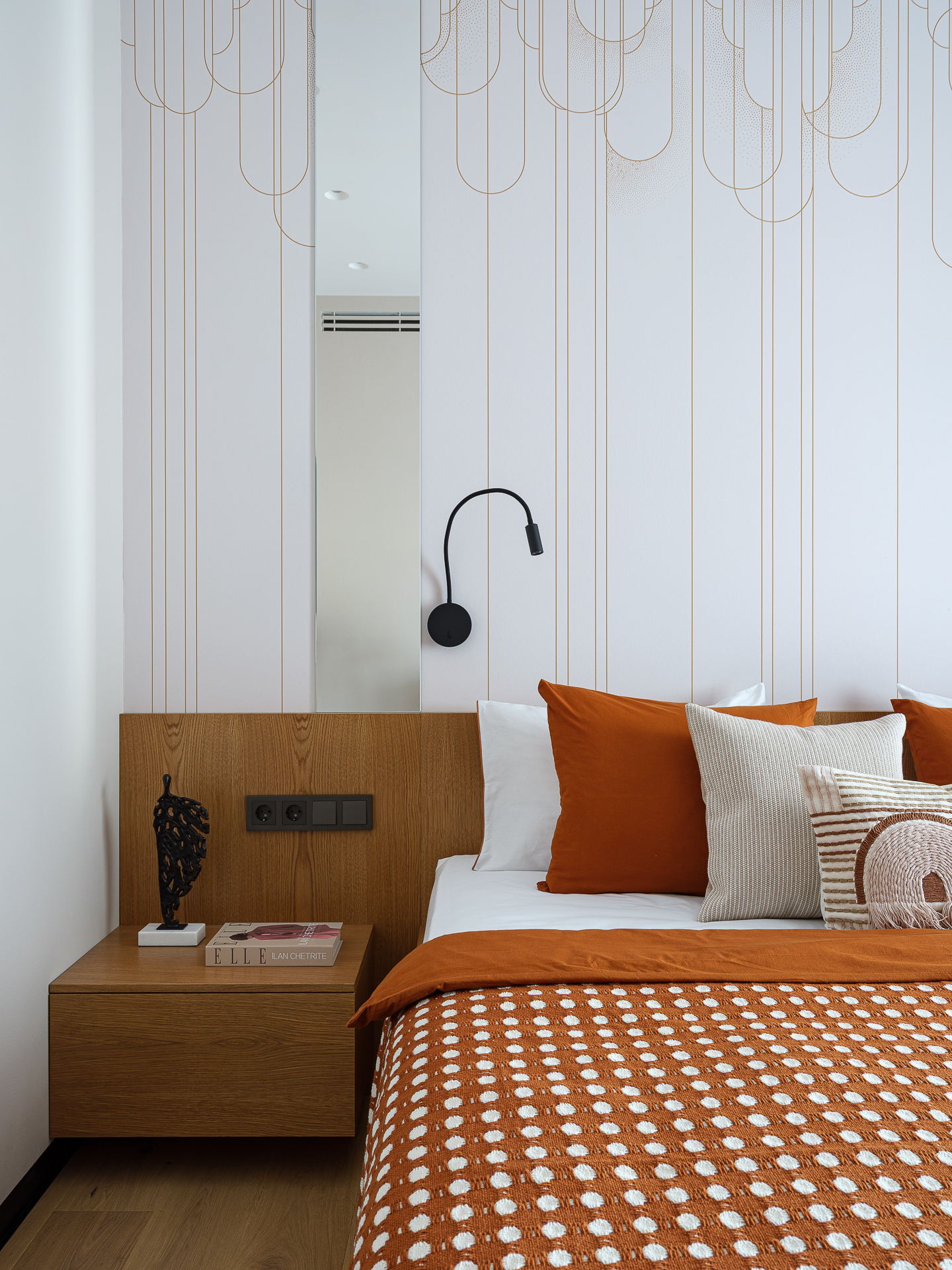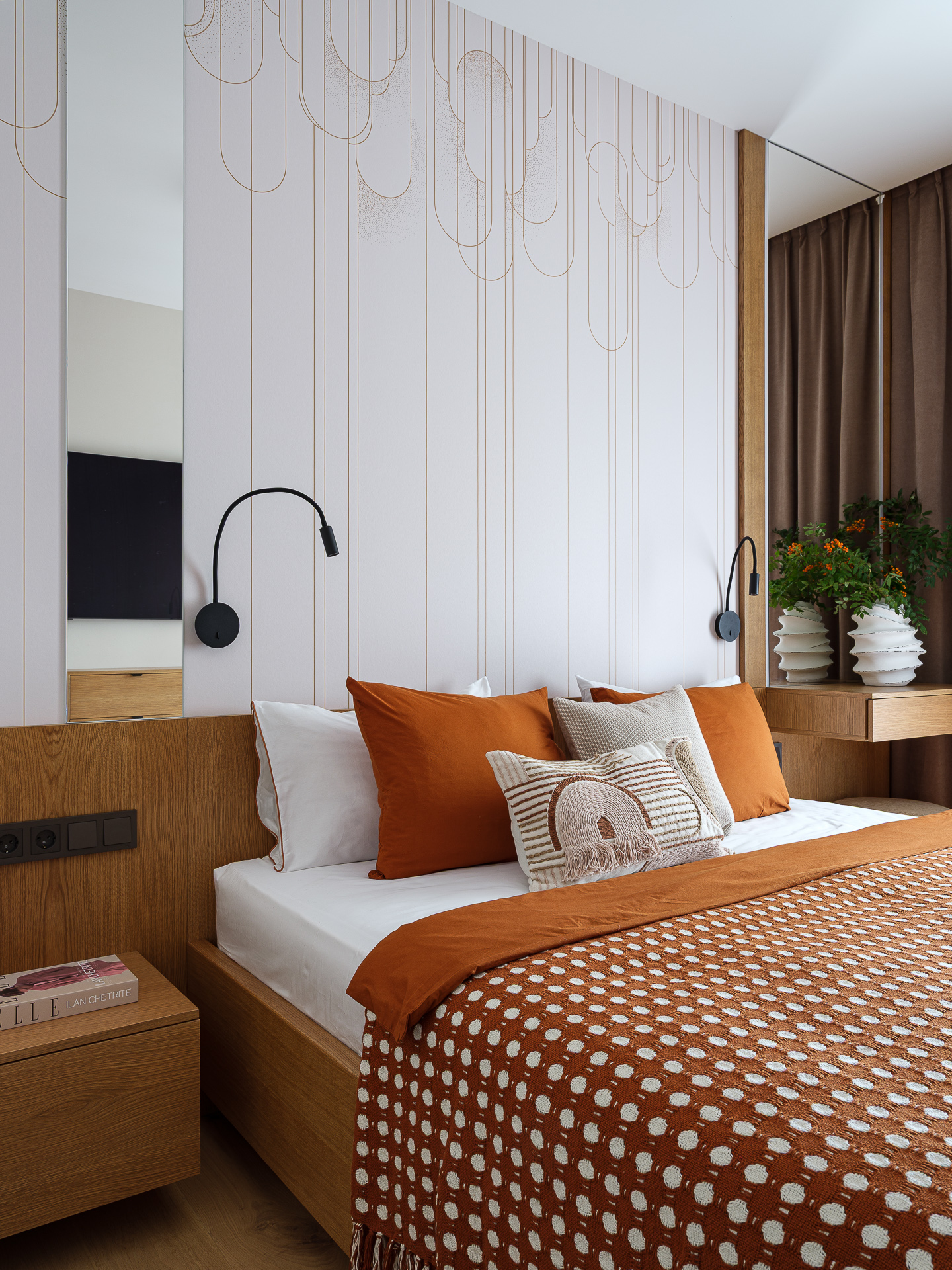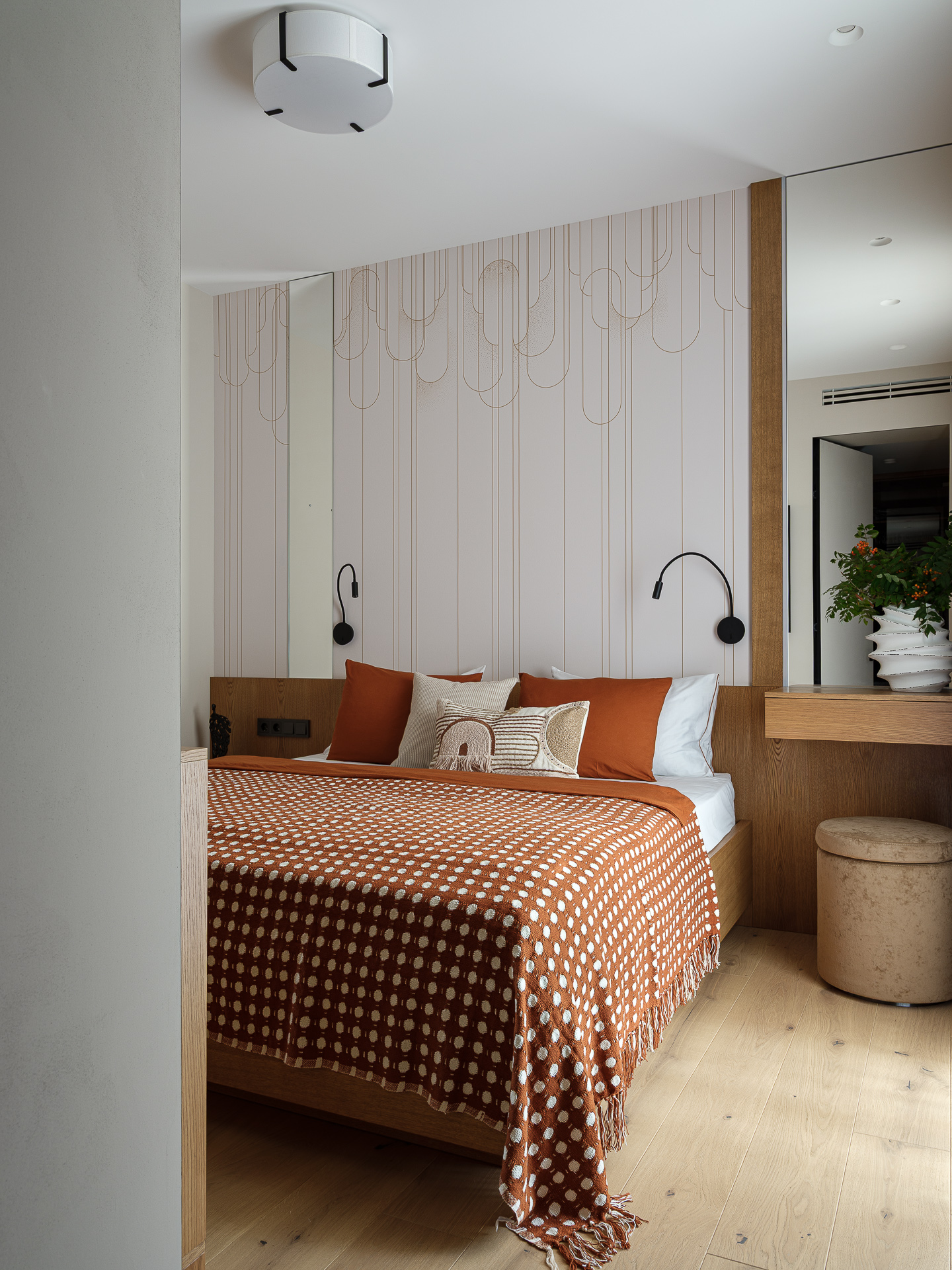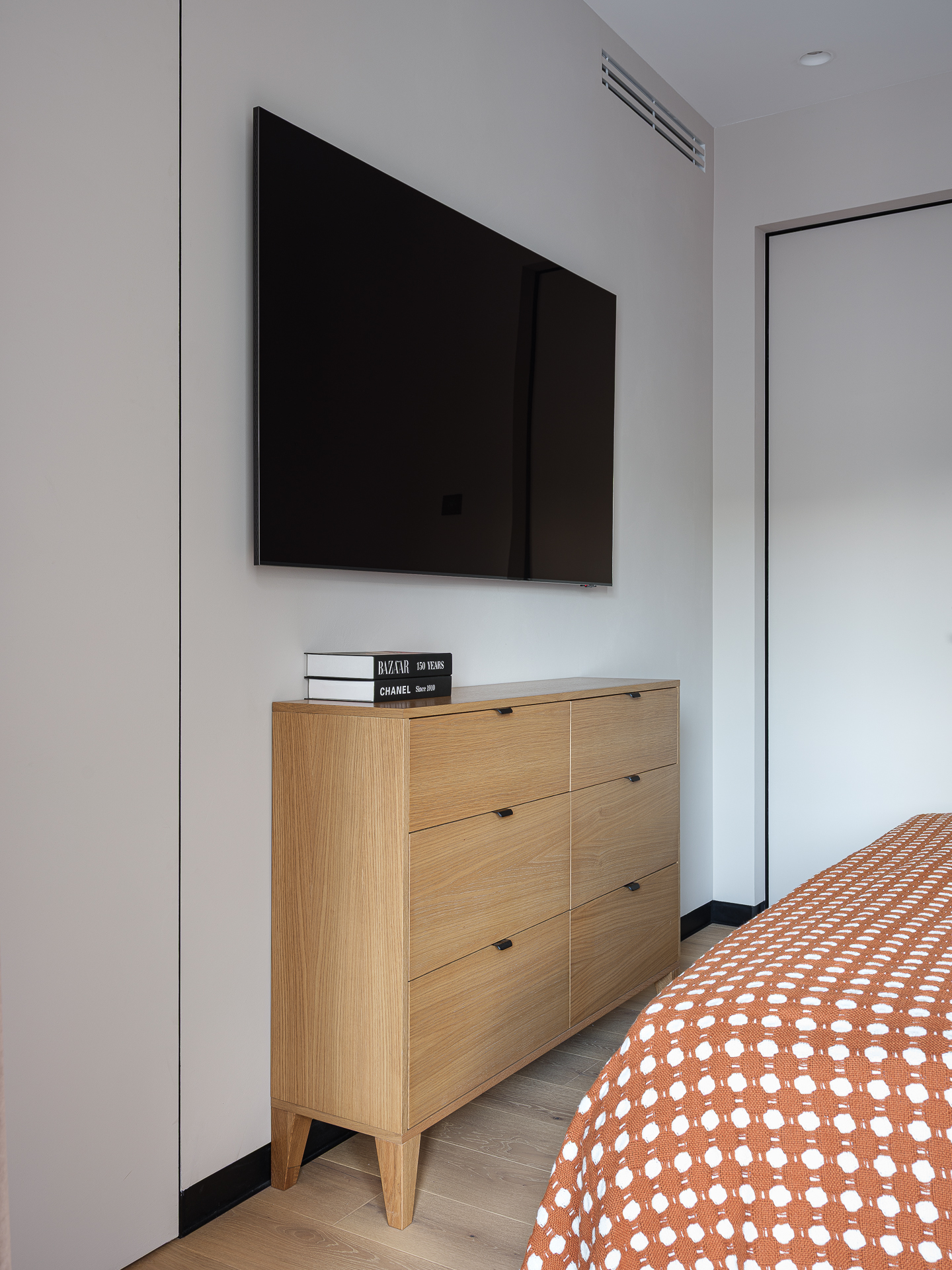 Заказчикам хотелось создать отдельную мастер зону, в которой будет спальня, санузел и много места для хранения. Был продуман с клиентами мастер блок, который включает в себя спальню, санузел и гардеробную. Спальню выполнили в монохромных оттенках, но с добавлением не ярких цветовых акцентов. В проект добавили большую деревянную кровать с «парящим эффектом». За счет спокойных оттенков и небольших габаритов помещения, спальня получилась уютной и спокойной.