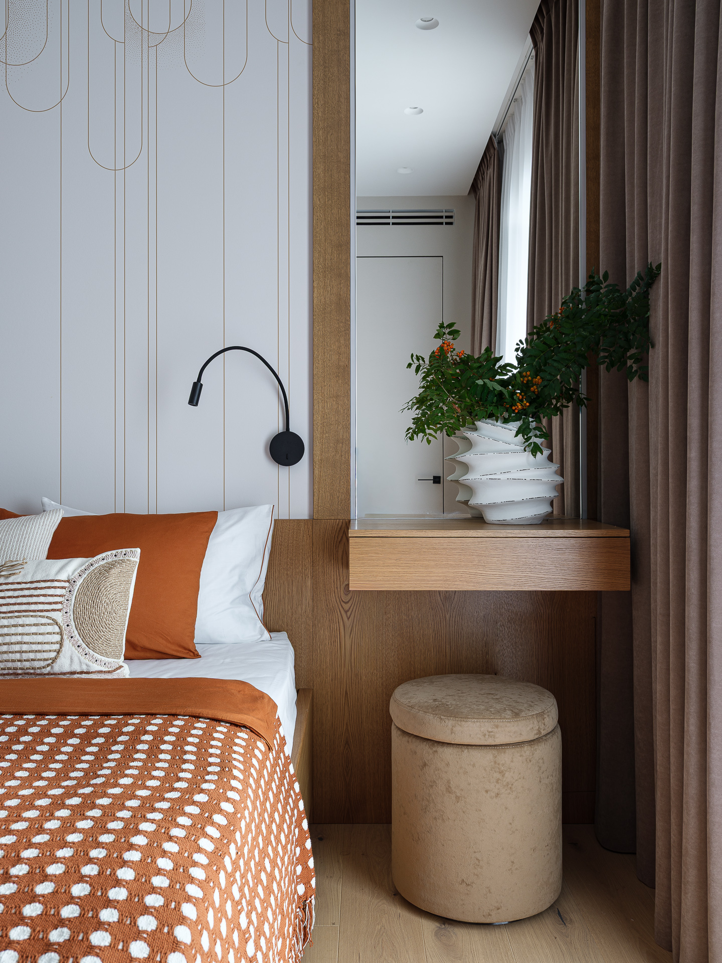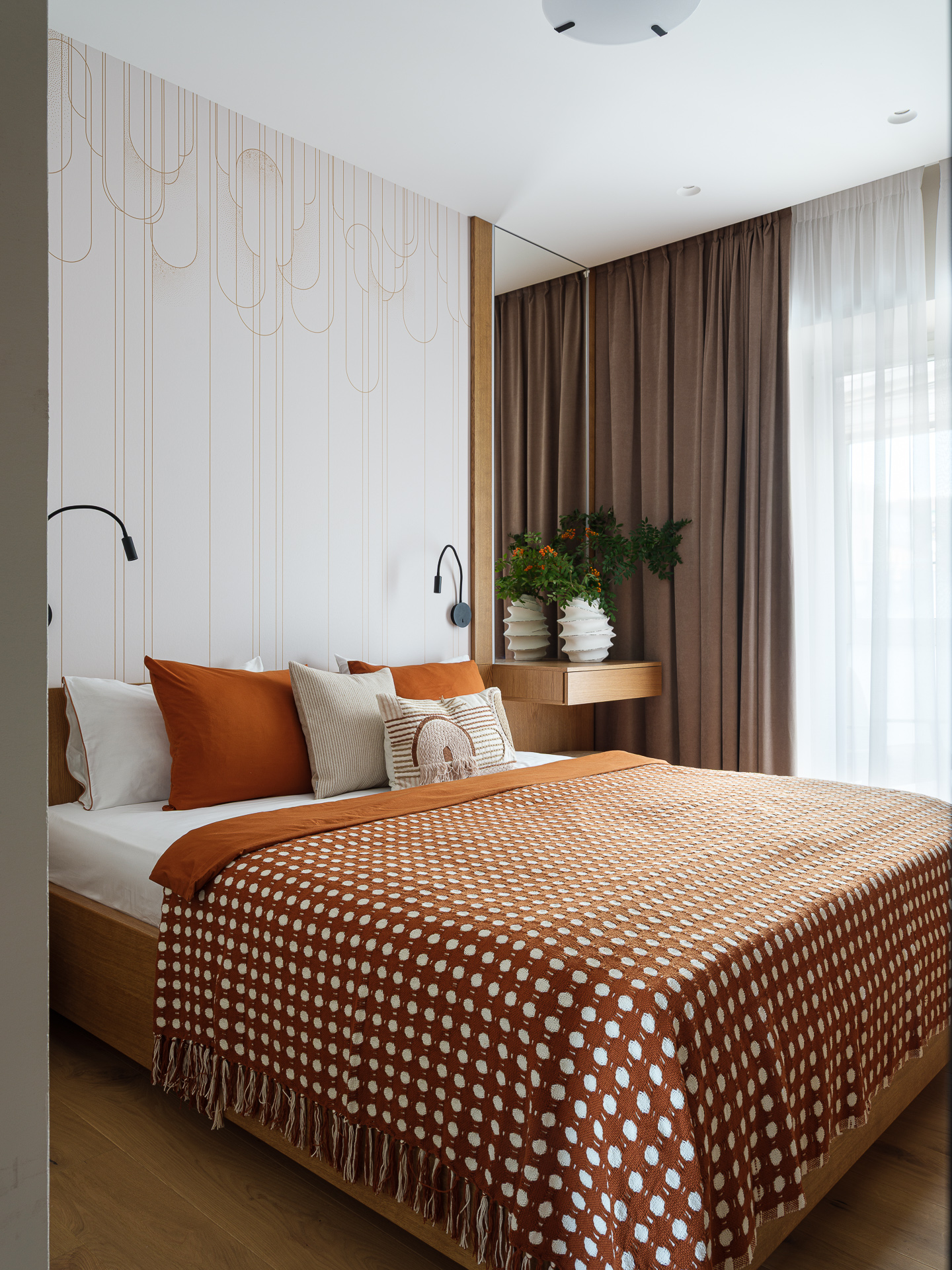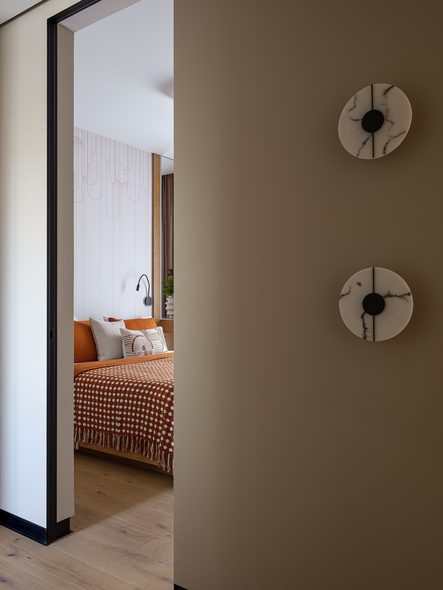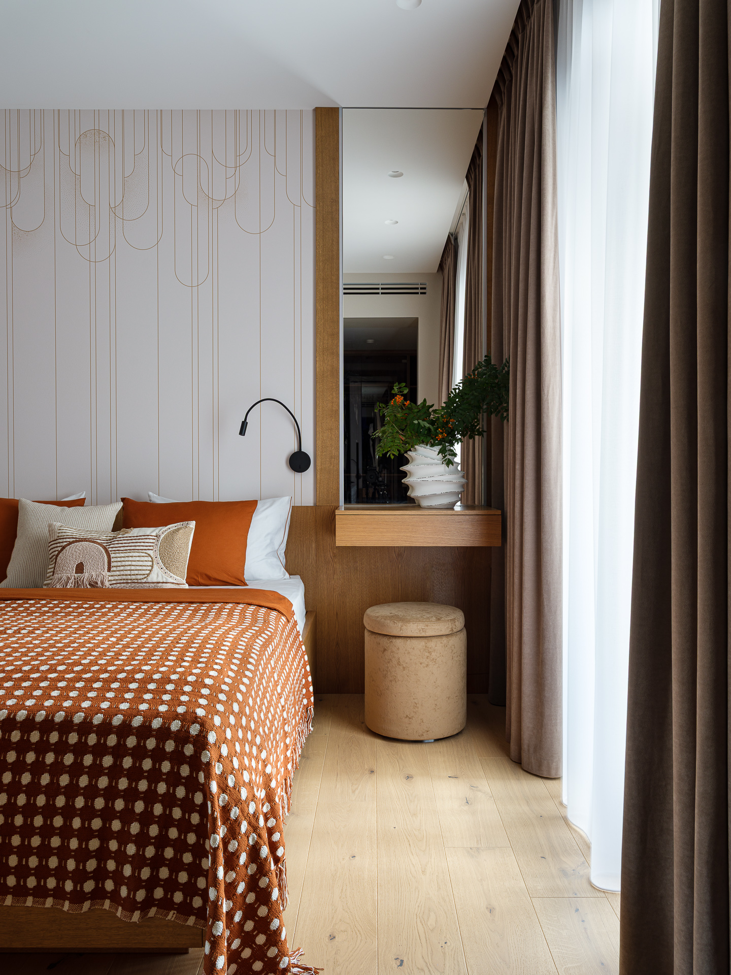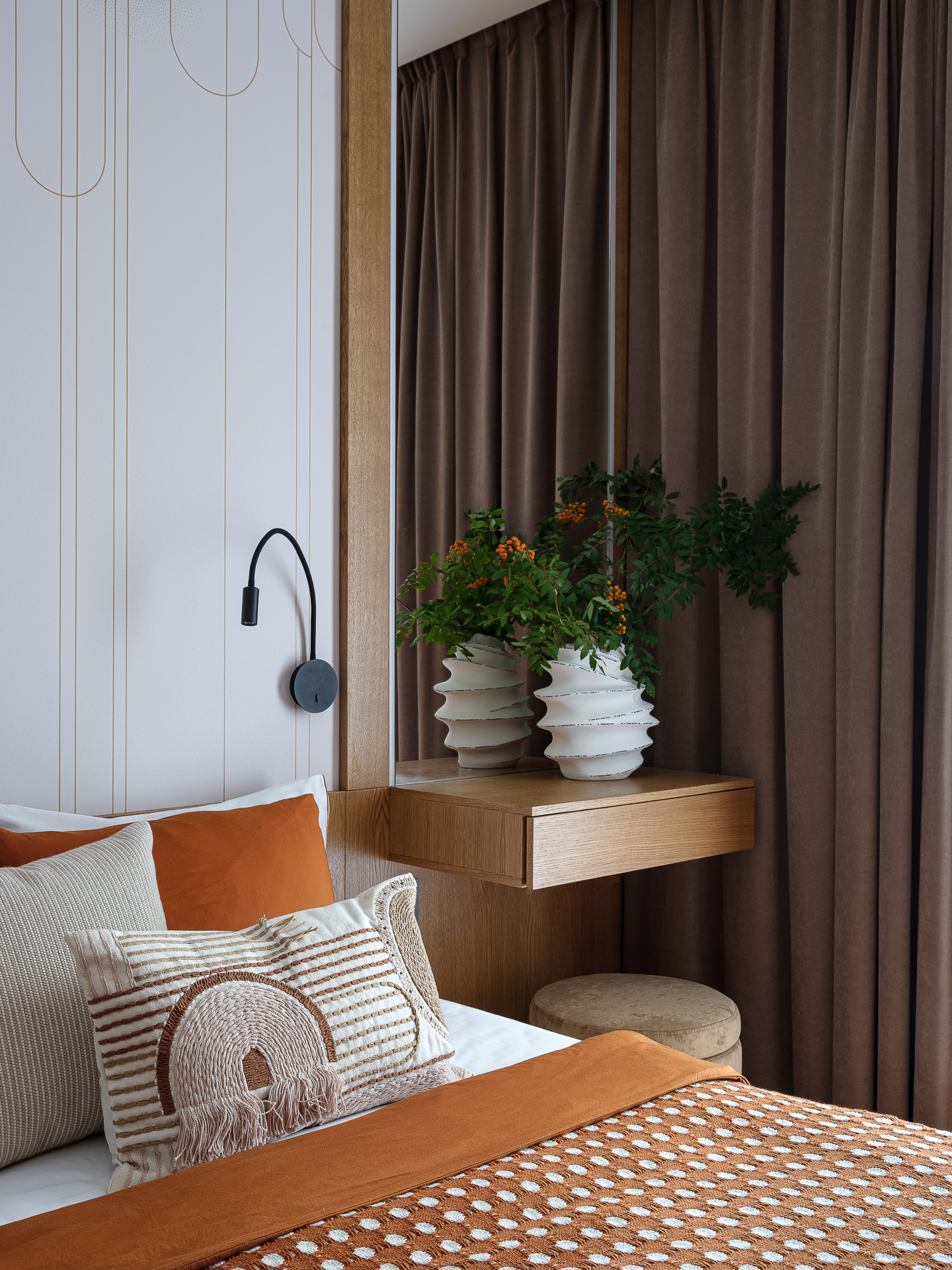 Заказчикам хотелось создать отдельную мастер зону, в которой будет спальня, санузел и много места для хранения. Был продуман с клиентами мастер блок, который включает в себя спальню, санузел и гардеробную. Спальню выполнили в монохромных оттенках, но с добавлением не ярких цветовых акцентов. В проект добавили большую деревянную кровать с «парящим эффектом». За счет спокойных оттенков и небольших габаритов помещения, спальня получилась уютной и спокойной.