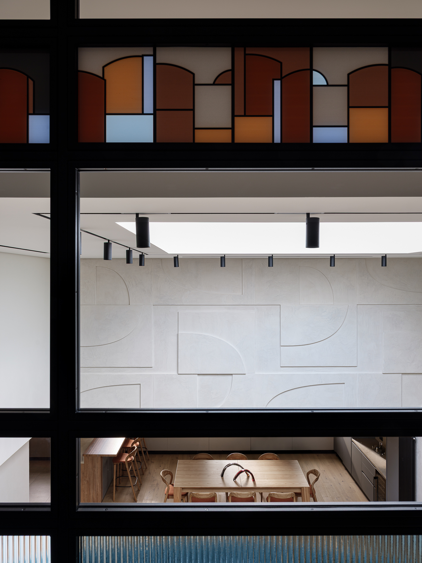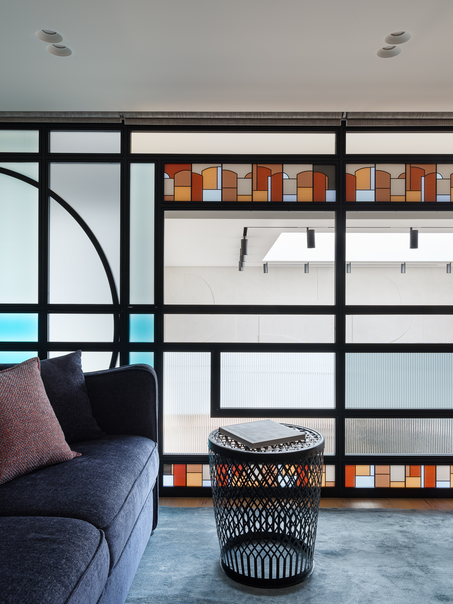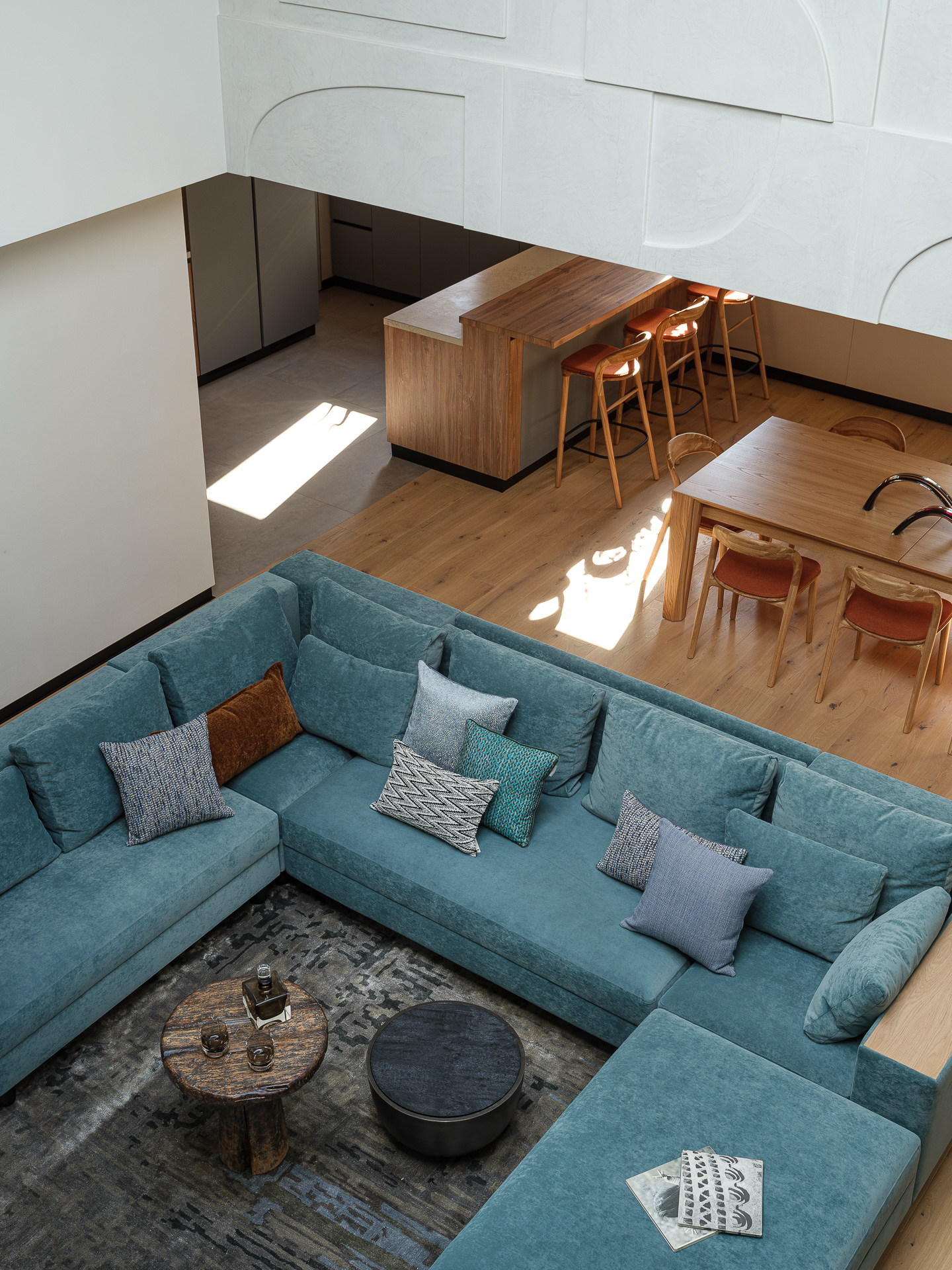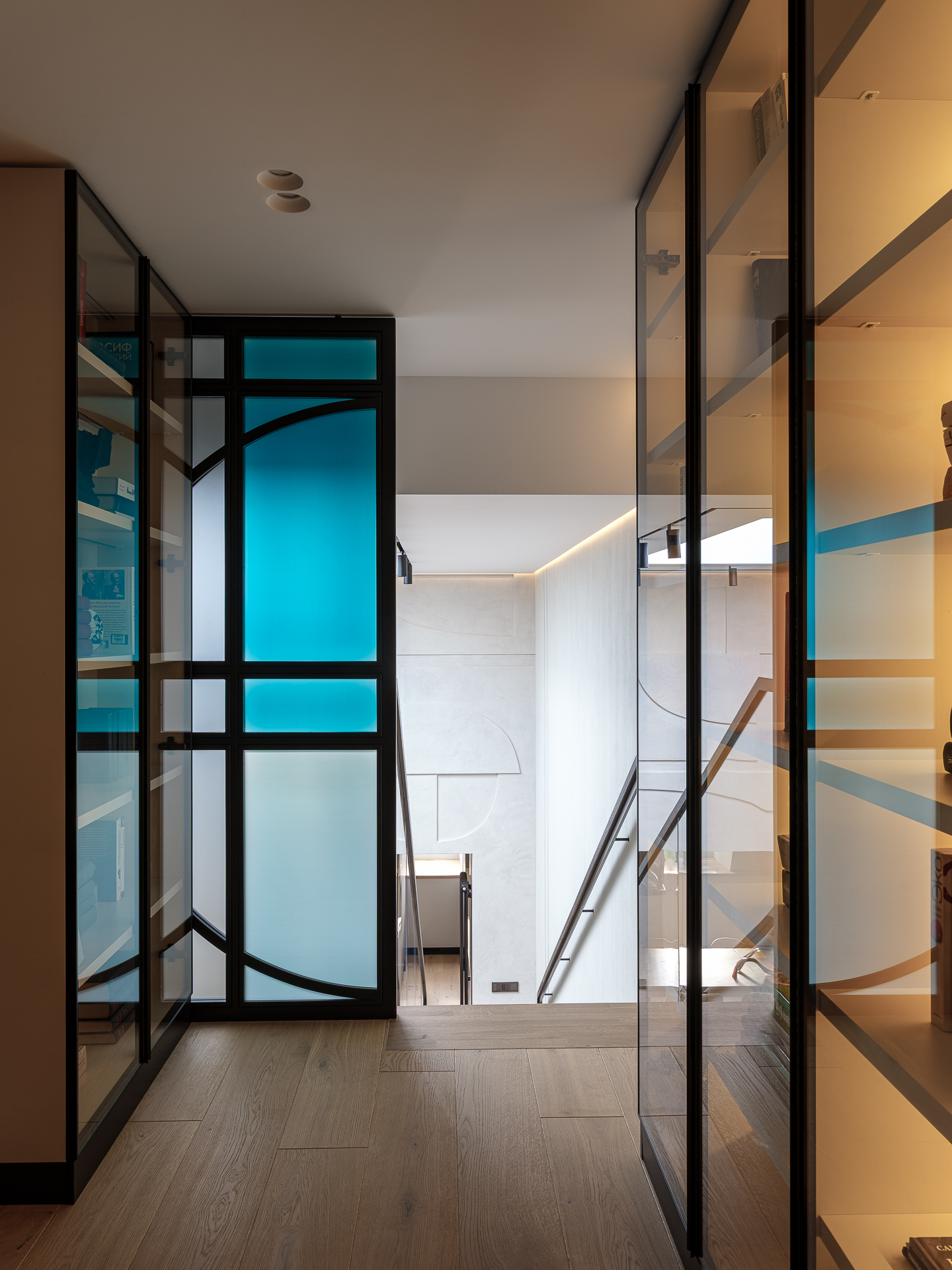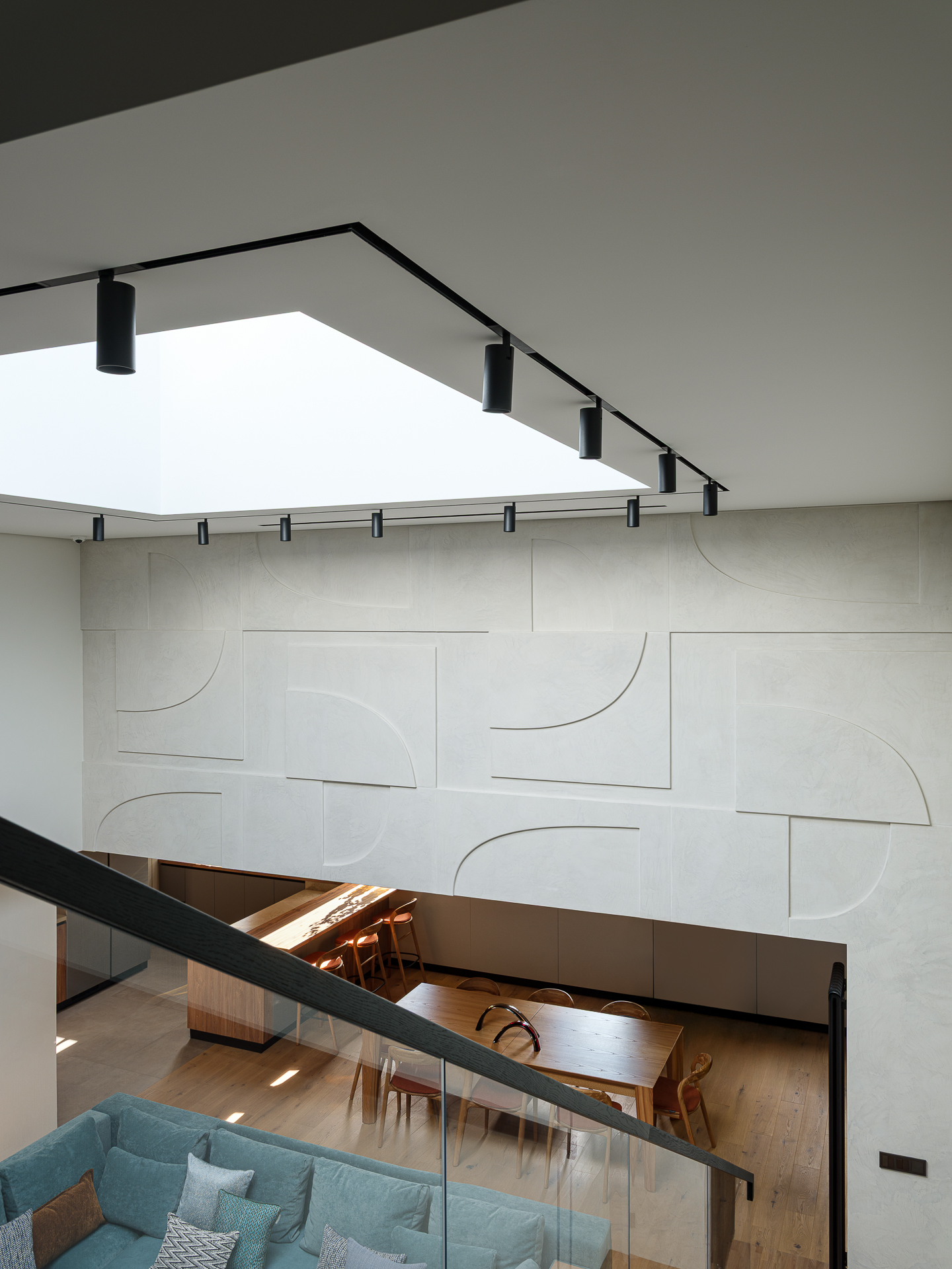 - Стена в зоне лестнице, до разработки дизайн проекта, была выполнена декоративной штукатуркой и напоминала клиентам стены в аэропорте Тель-Авива. Пожелаем было интегрировать аналогичный рисунок стены в проект. Стена на втором уровне над диваном частично повторяет геометрию перегородки-витража напротив.