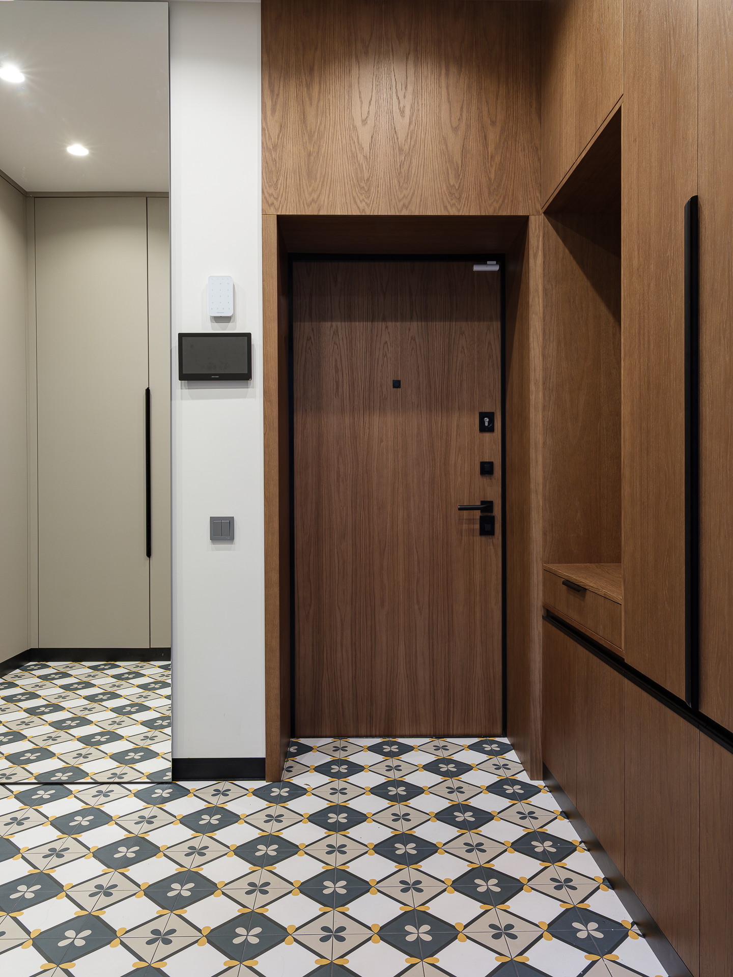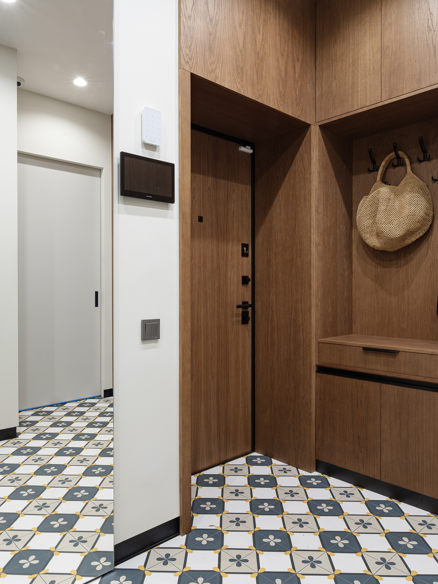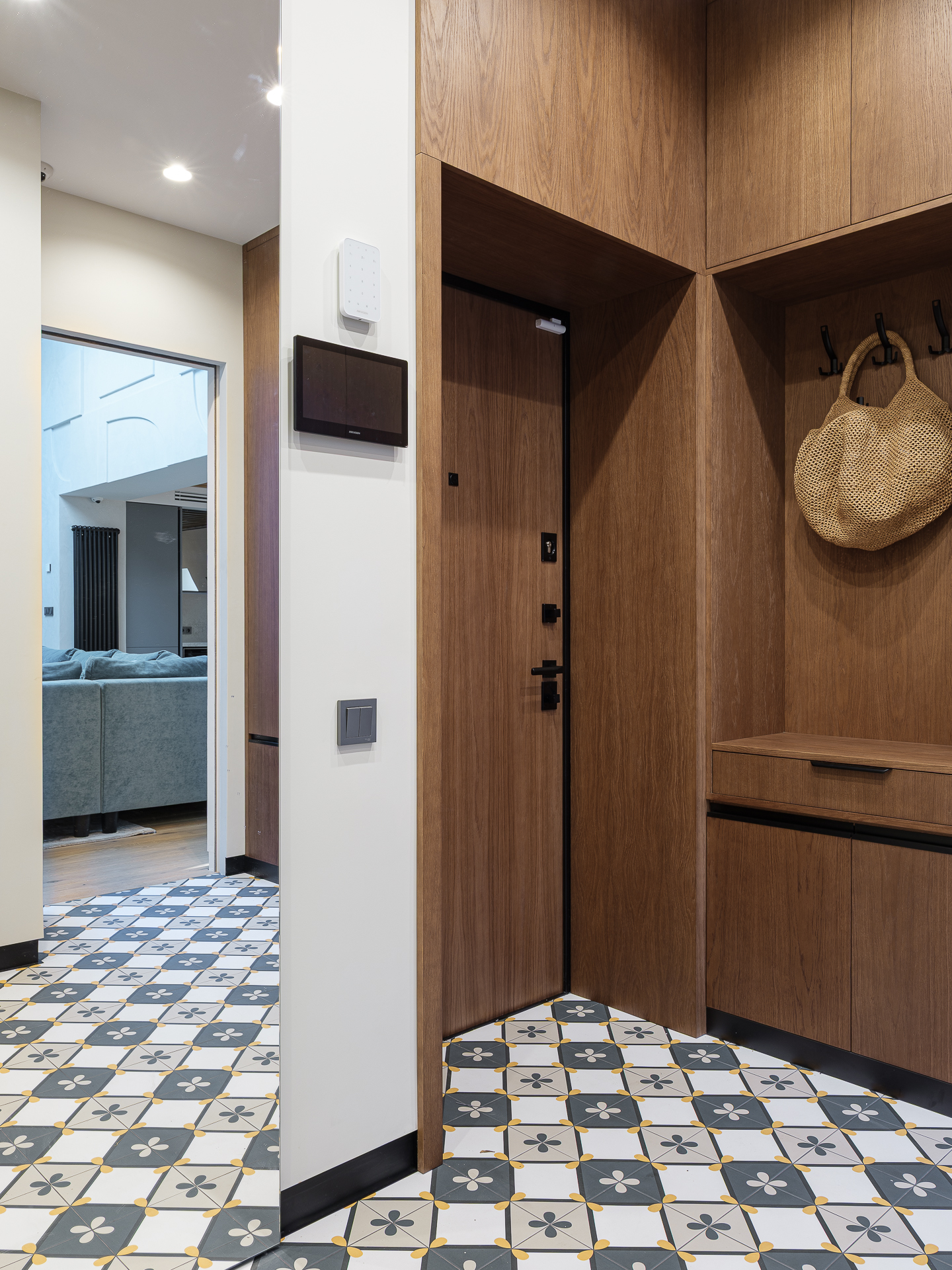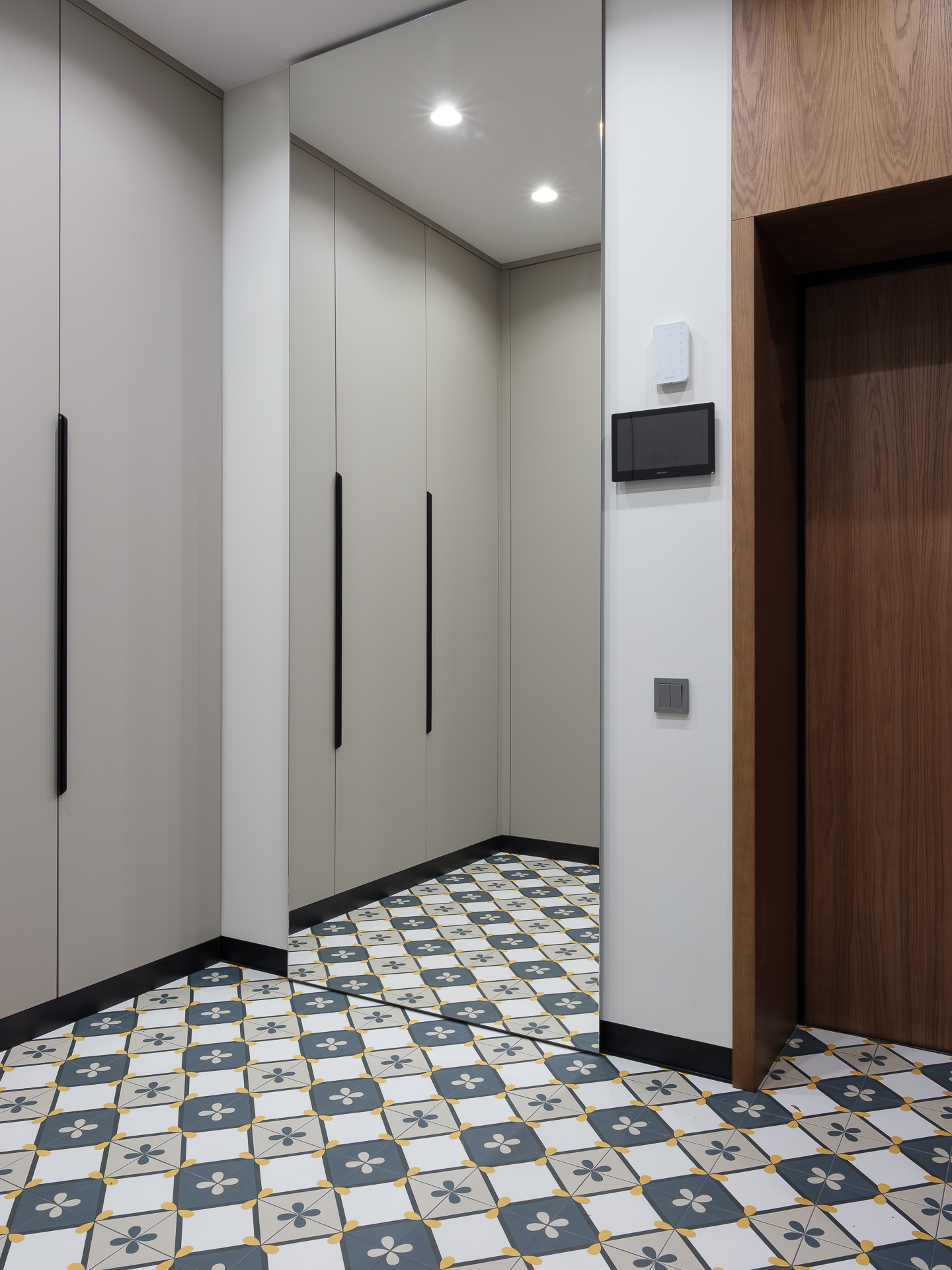 Перед студией стояла задача - организовать хранение и не захламлять пространство. Разработали встроенную систему хранения, отказавшись от открытых полочек для аксессуаров. Решено было минимизировать наличие светлых оттенков во входной зоне, так как дети еще маленькие и после прогулки и активных игр на улице, высока вероятность появления отпечатков маленьких ручек на стенах. Поверхности решено сделать практичными и легкими в уборке. В наличии у клиента ключница с котиками, которую интегрировали в проект. Сама прихожая изолирована от основной части квартиры, как отдельная гардеробная.
