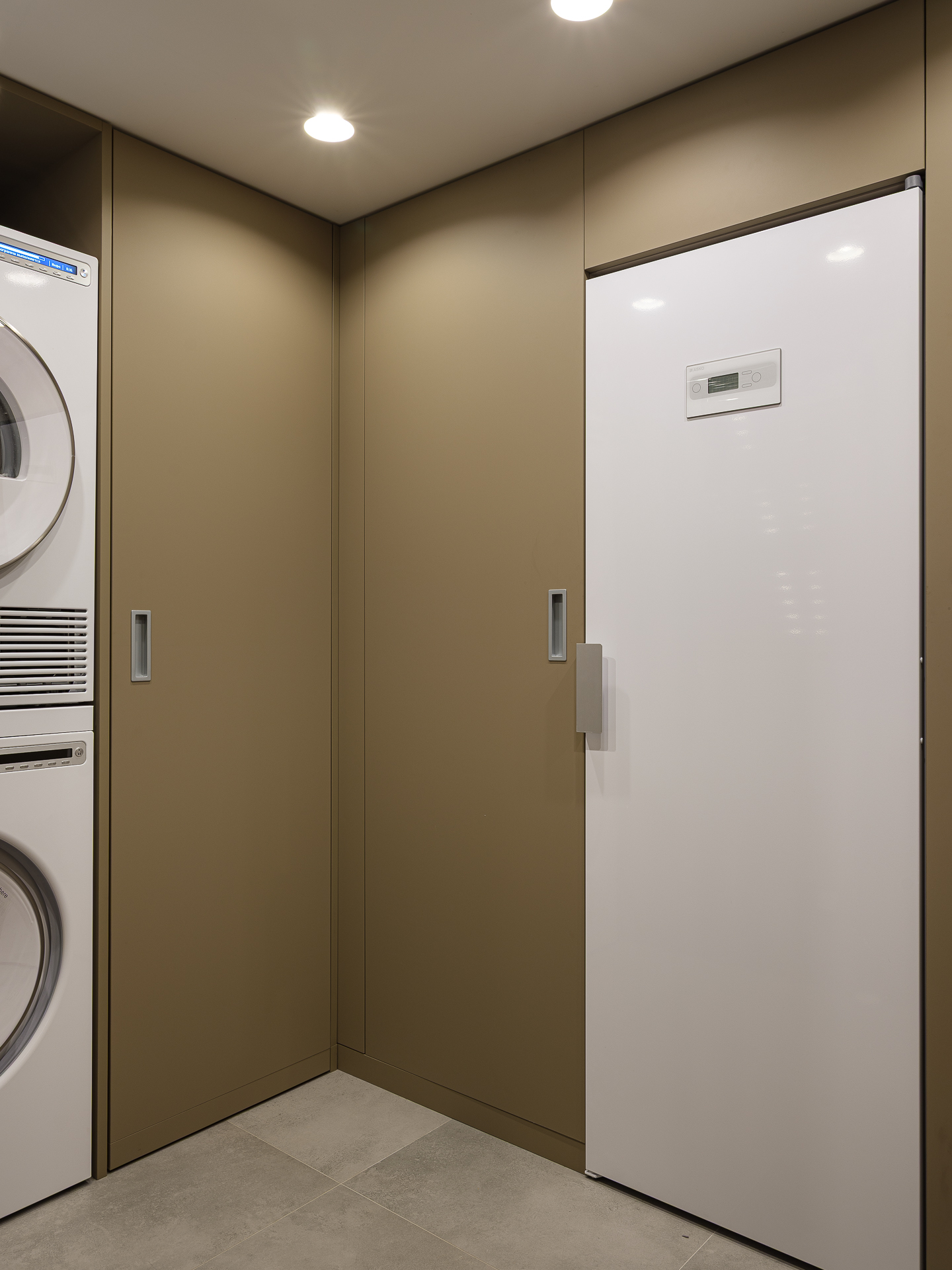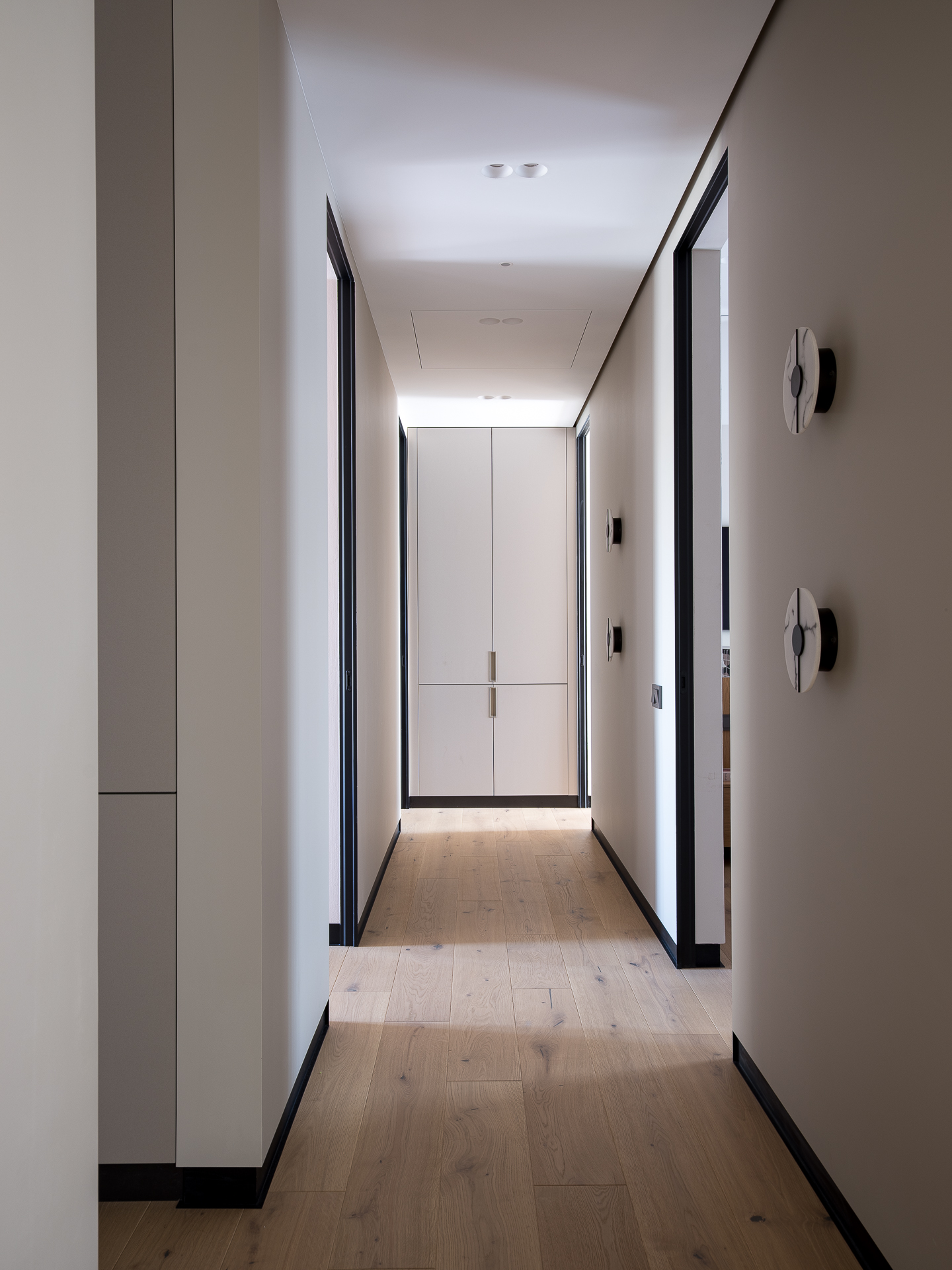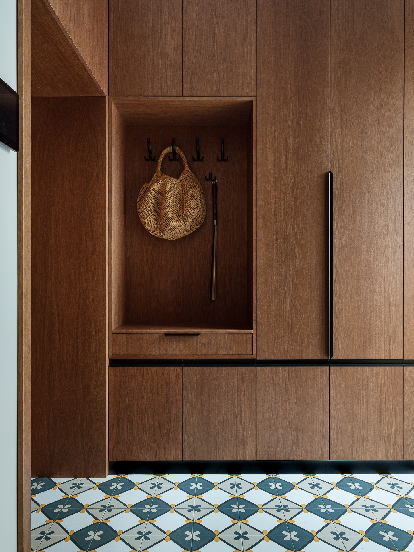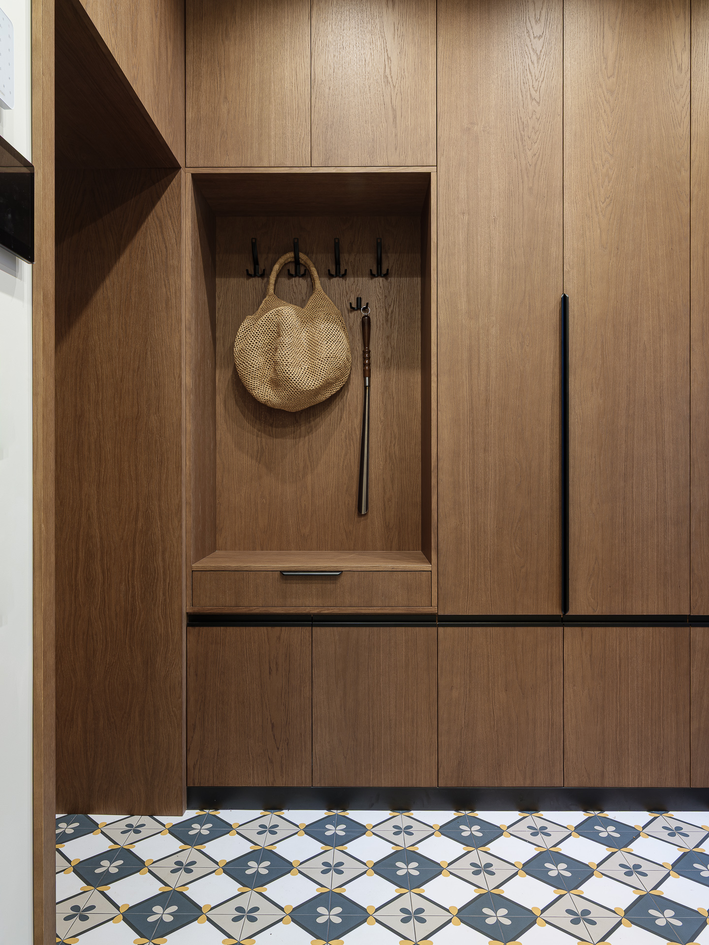 Перед студией стояла задача - организовать хранение и не захламлять пространство. Разработали встроенную систему хранения, отказавшись от открытых полочек для аксессуаров. Решено было минимизировать наличие светлых оттенков во входной зоне, так как дети еще маленькие и после прогулки и активных игр на улице, высока вероятность появления отпечатков маленьких ручек на стенах. Поверхности решено сделать практичными и легкими в уборке. В наличии у клиента ключница с котиками, которую интегрировали в проект. Сама прихожая изолирована от основной части квартиры, как отдельная гардеробная.