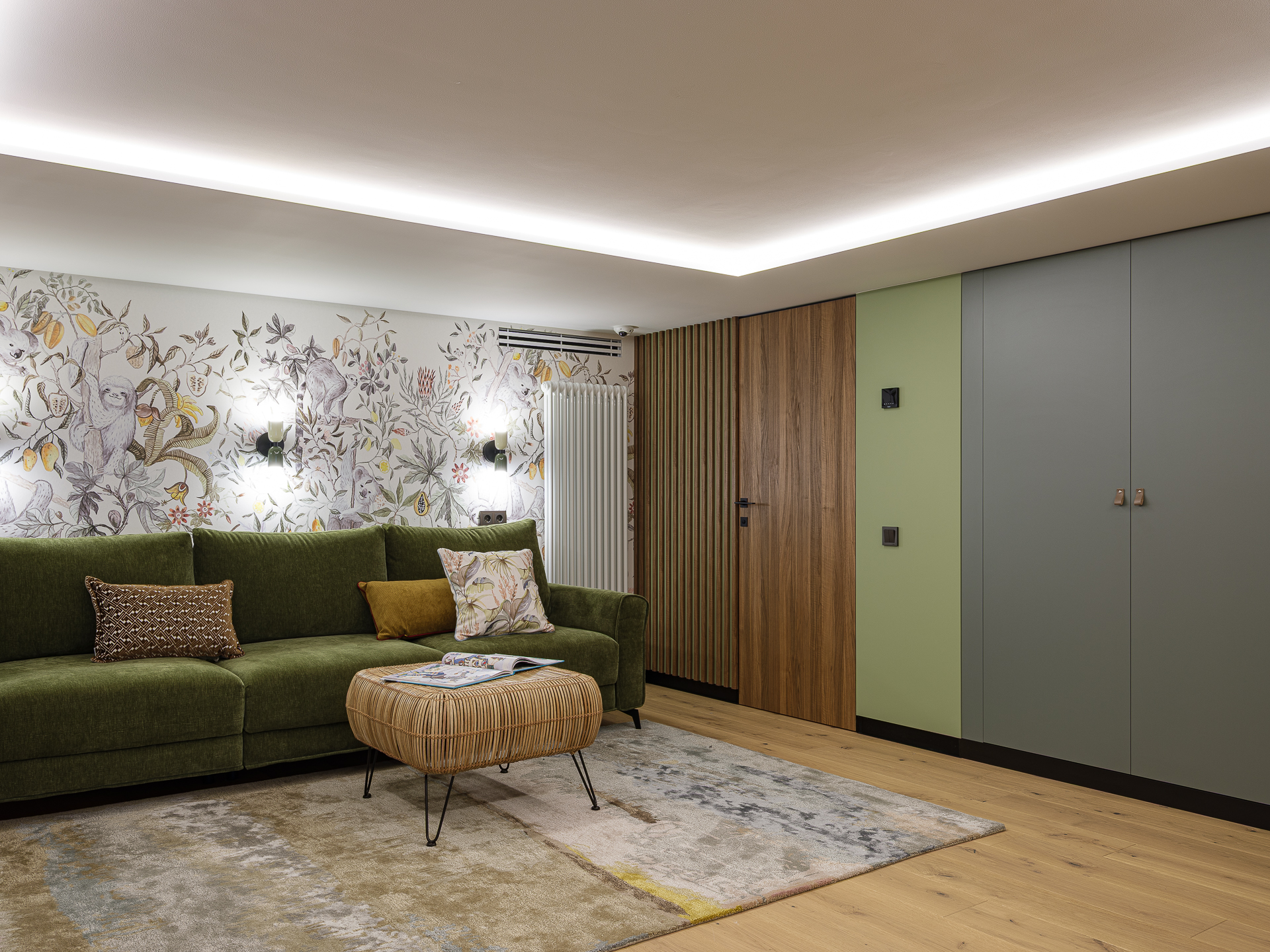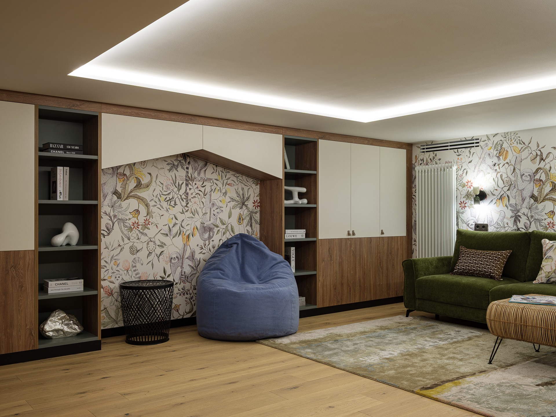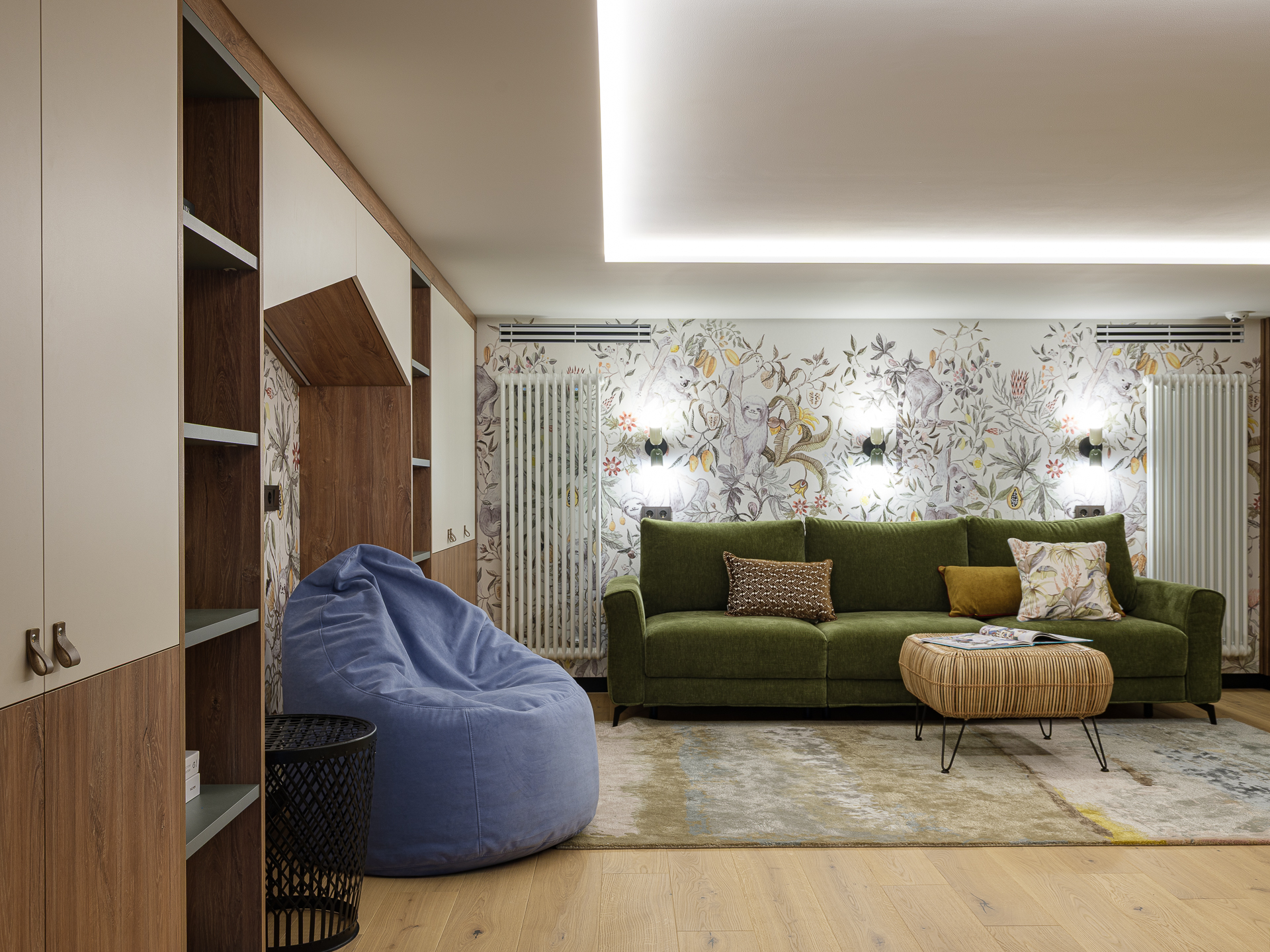 Так как, в семье живут три ребенка, мы предусмотрели помещение под игровую комнату. Получилась светлое уютное помещение, с мягкими оливковыми акцентами, в виде оливковых дверей шкафа, встроенных полок, а также, мягкого приятного оливкового дивана, на котором можно отдыхать, играть, и смотреть фильмы. В помещении мы также, разместили телевизионную панель с игровой приставкой, для того чтобы всей семьей играть в PC-игры. Также, игривости пространству добавляет акцентная цветовая стена с цветочными элементами.