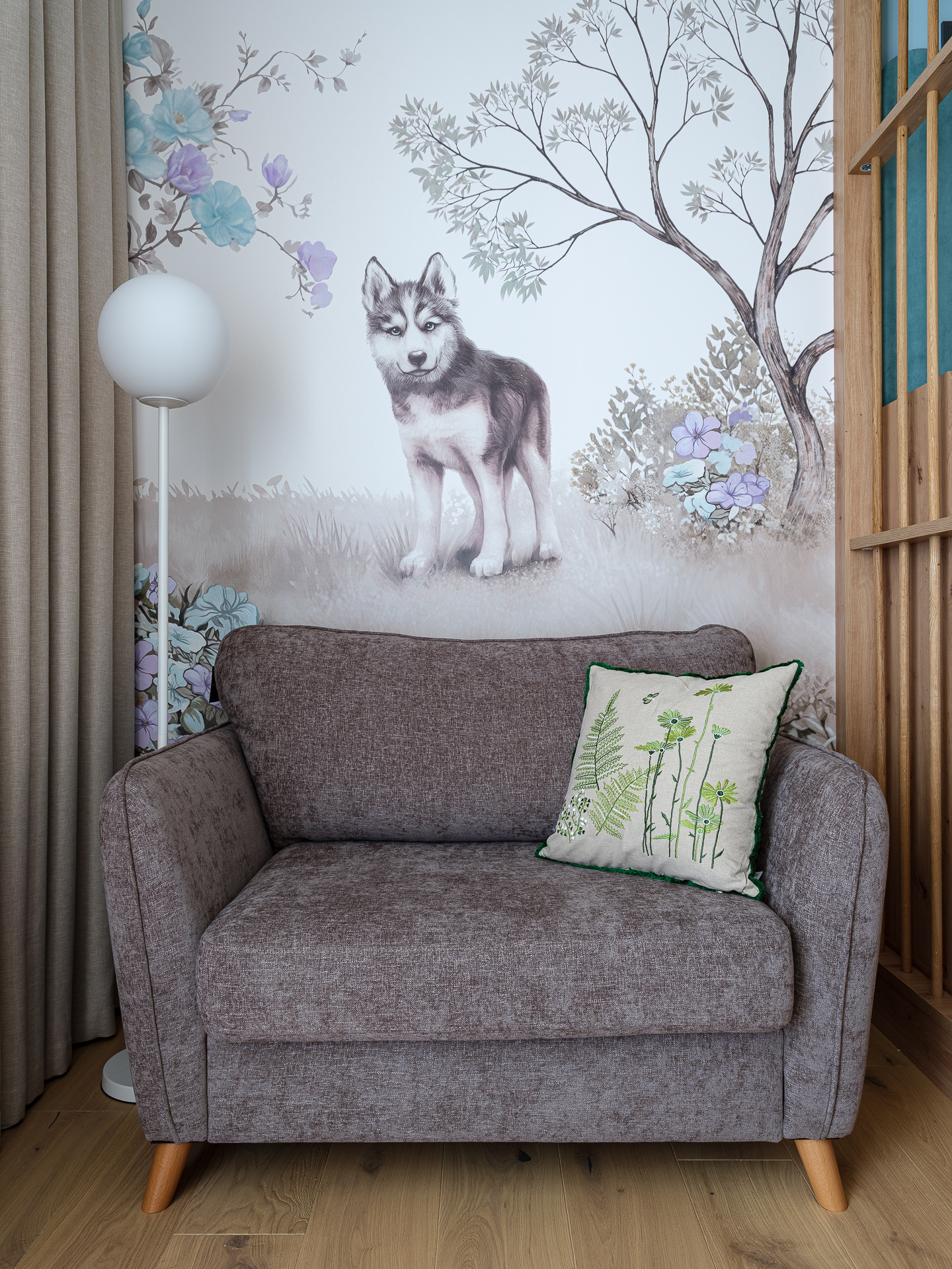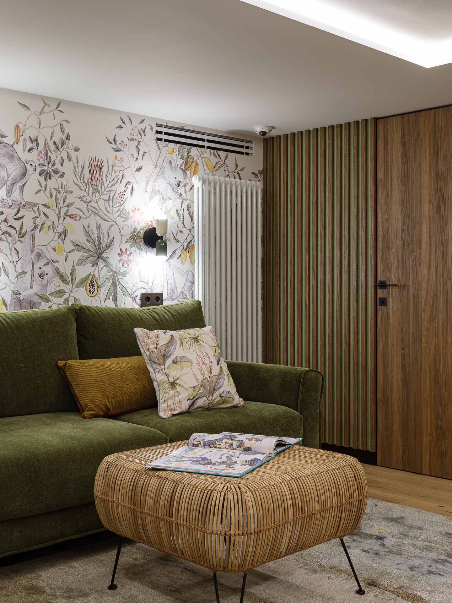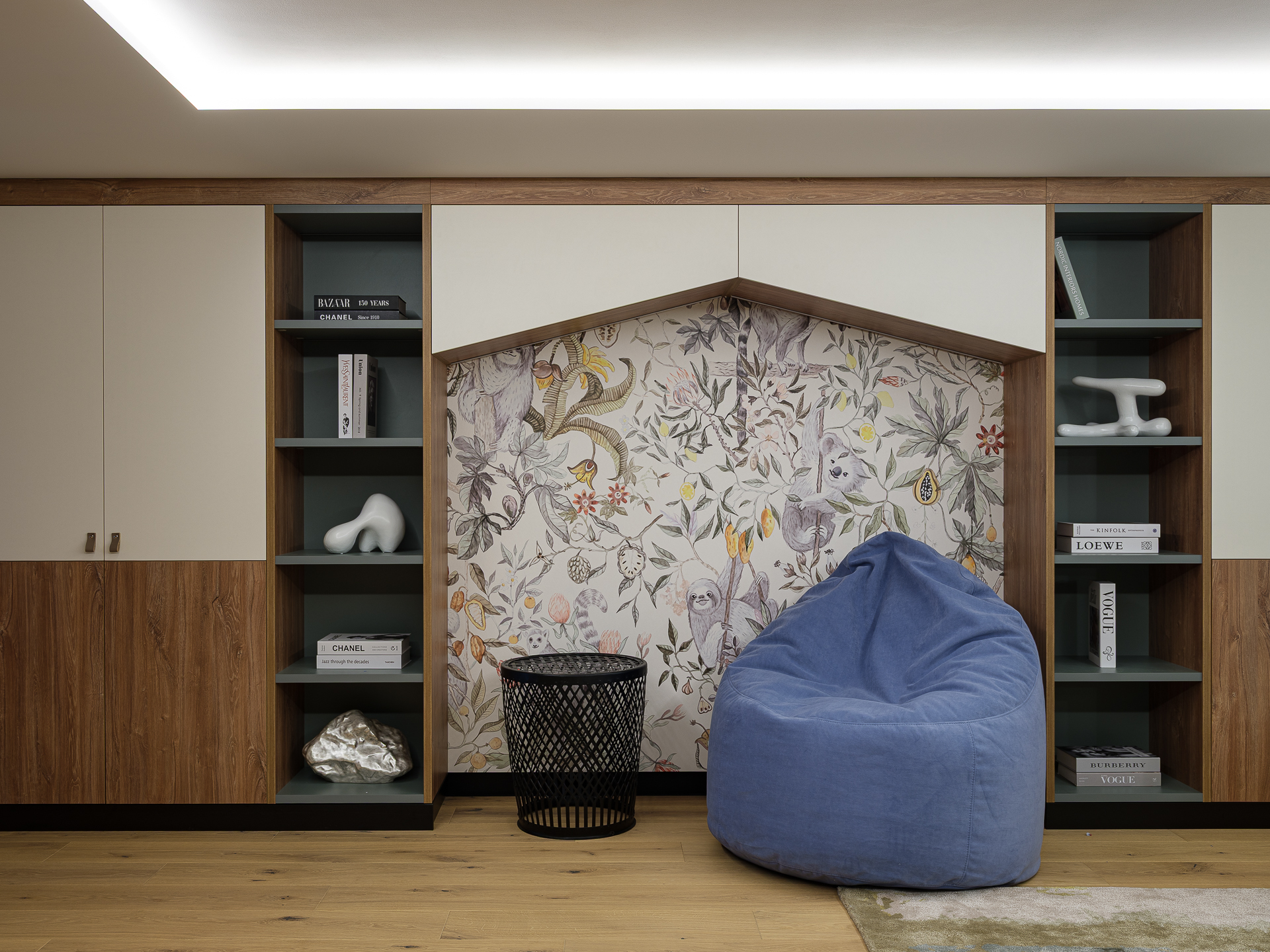 Так как, в семье живут три ребенка, мы предусмотрели помещение под игровую комнату. Получилась светлое уютное помещение, с мягкими оливковыми акцентами, в виде оливковых дверей шкафа, встроенных полок, а также, мягкого приятного оливкового дивана, на котором можно отдыхать, играть, и смотреть фильмы. В помещении мы также, разместили телевизионную панель с игровой приставкой, для того чтобы всей семьей играть в PC-игры. Также, игривости пространству добавляет акцентная цветовая стена с цветочными элементами.