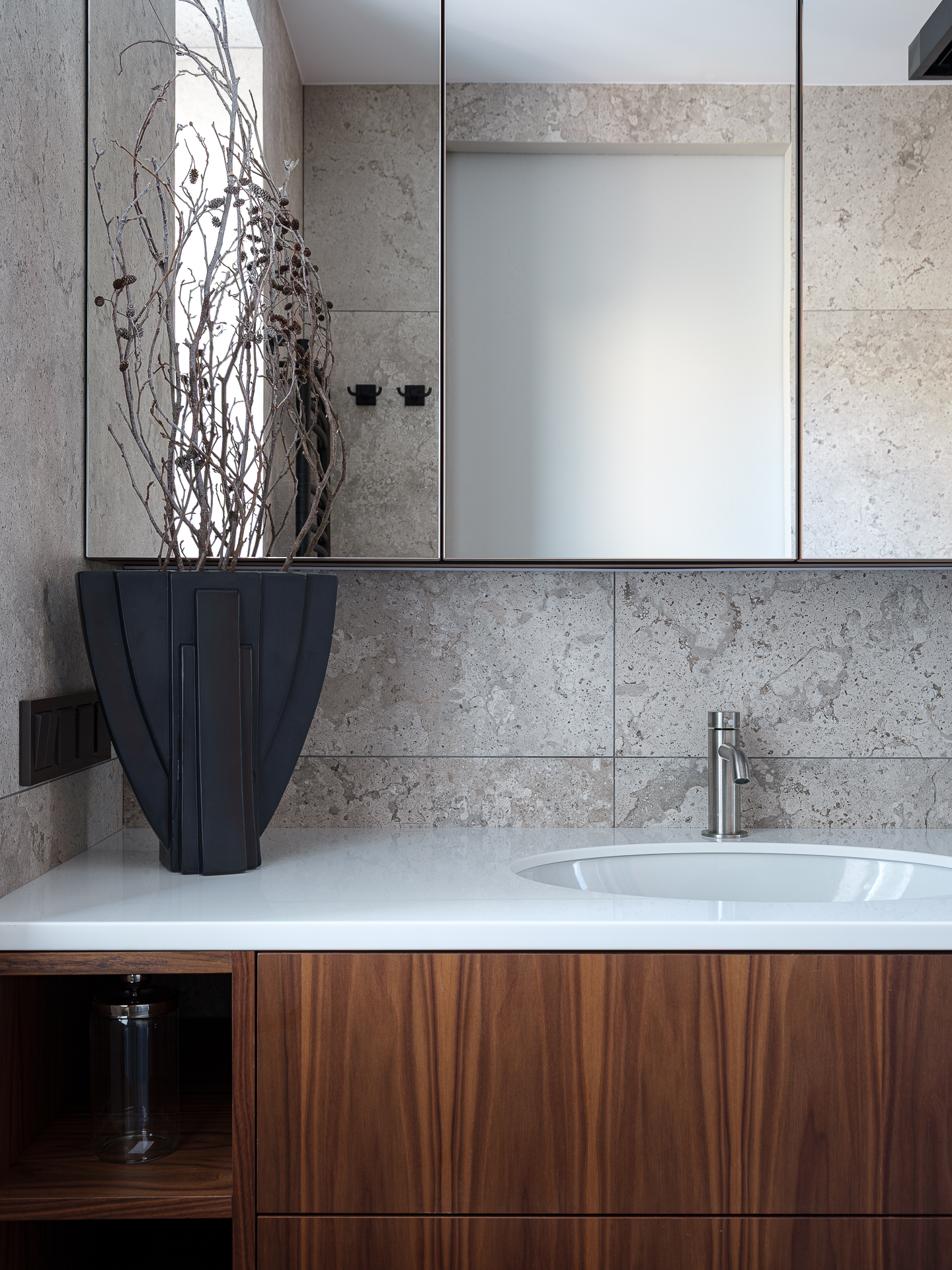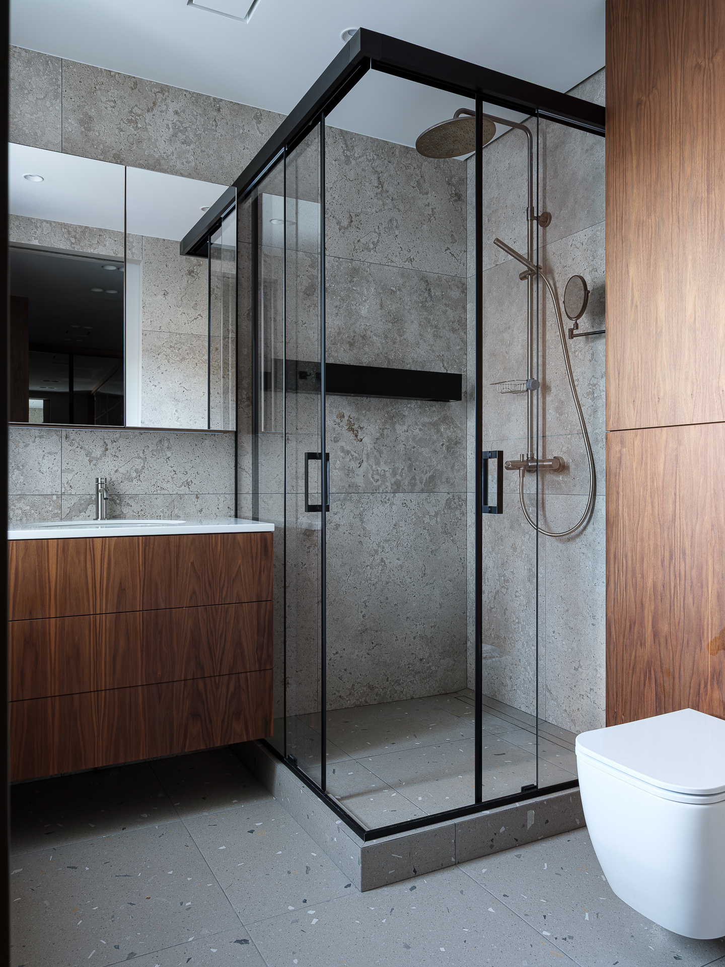 Заходим в мастер санузел. Здесь выбран для отделки керамогранит с текстурой камня в сочетании с деревом. В качестве акцентов - чёрные элементы в небольшом количестве. Основная часть сантехники в цвете нержавеющая сталь.
