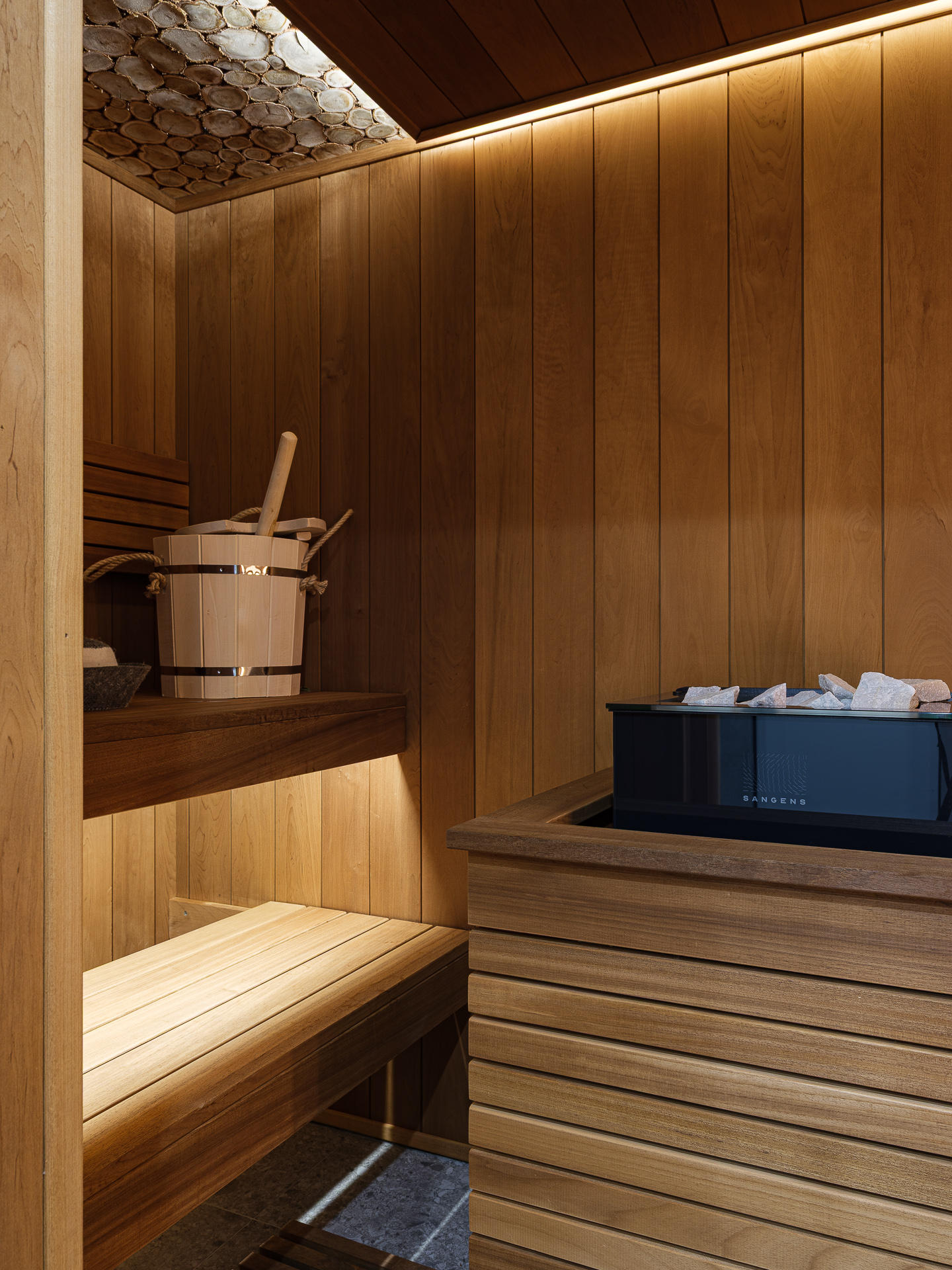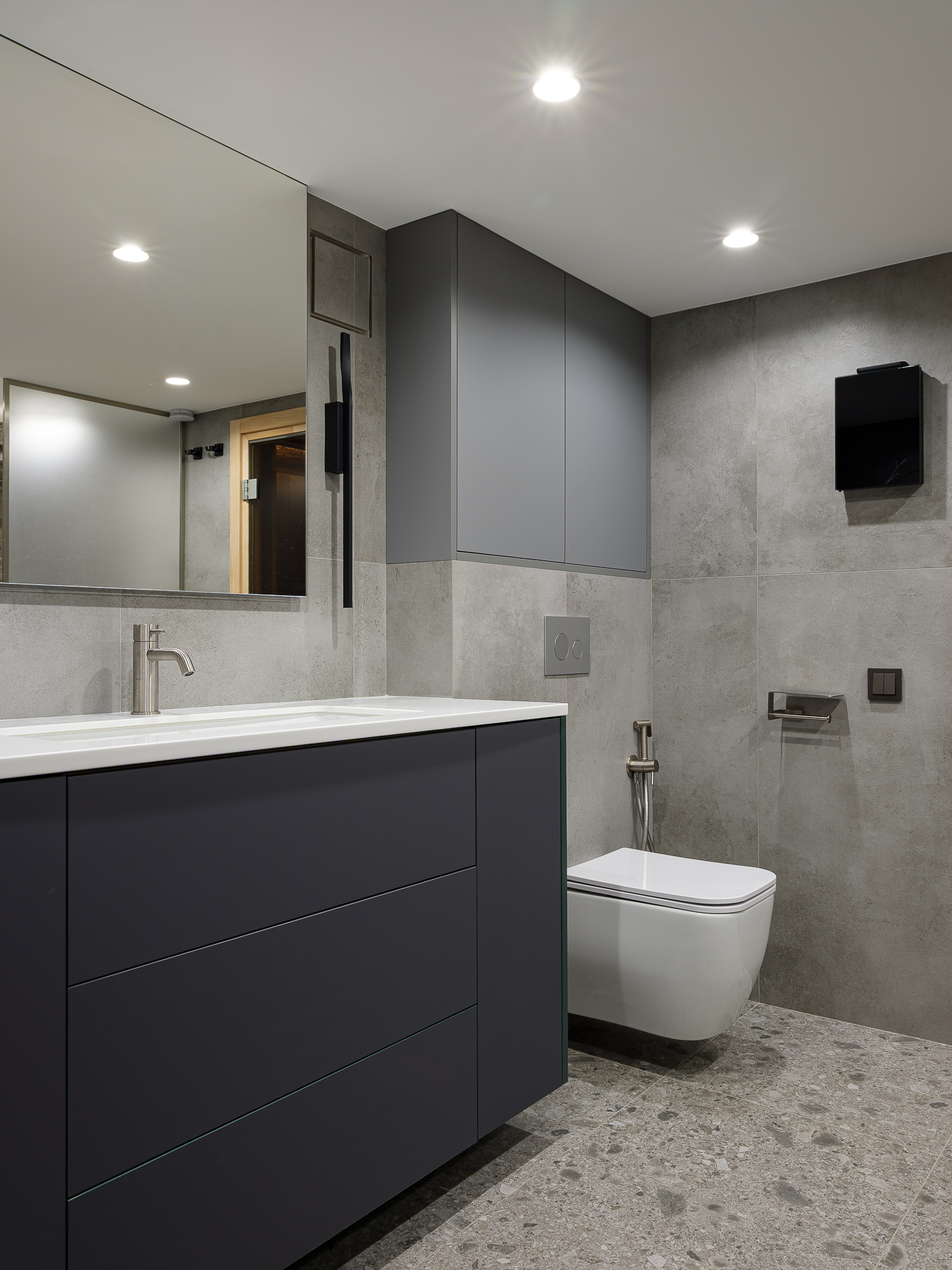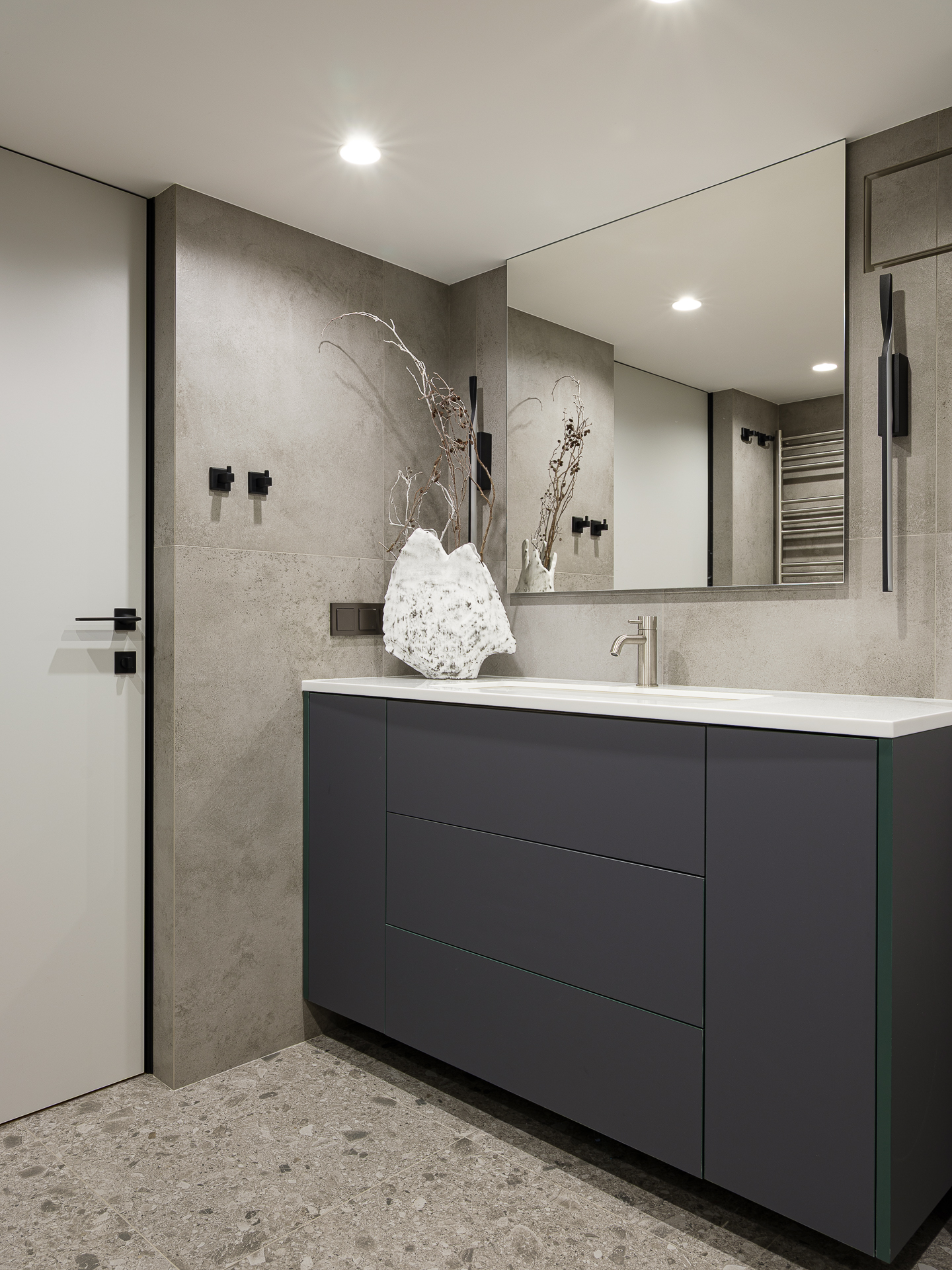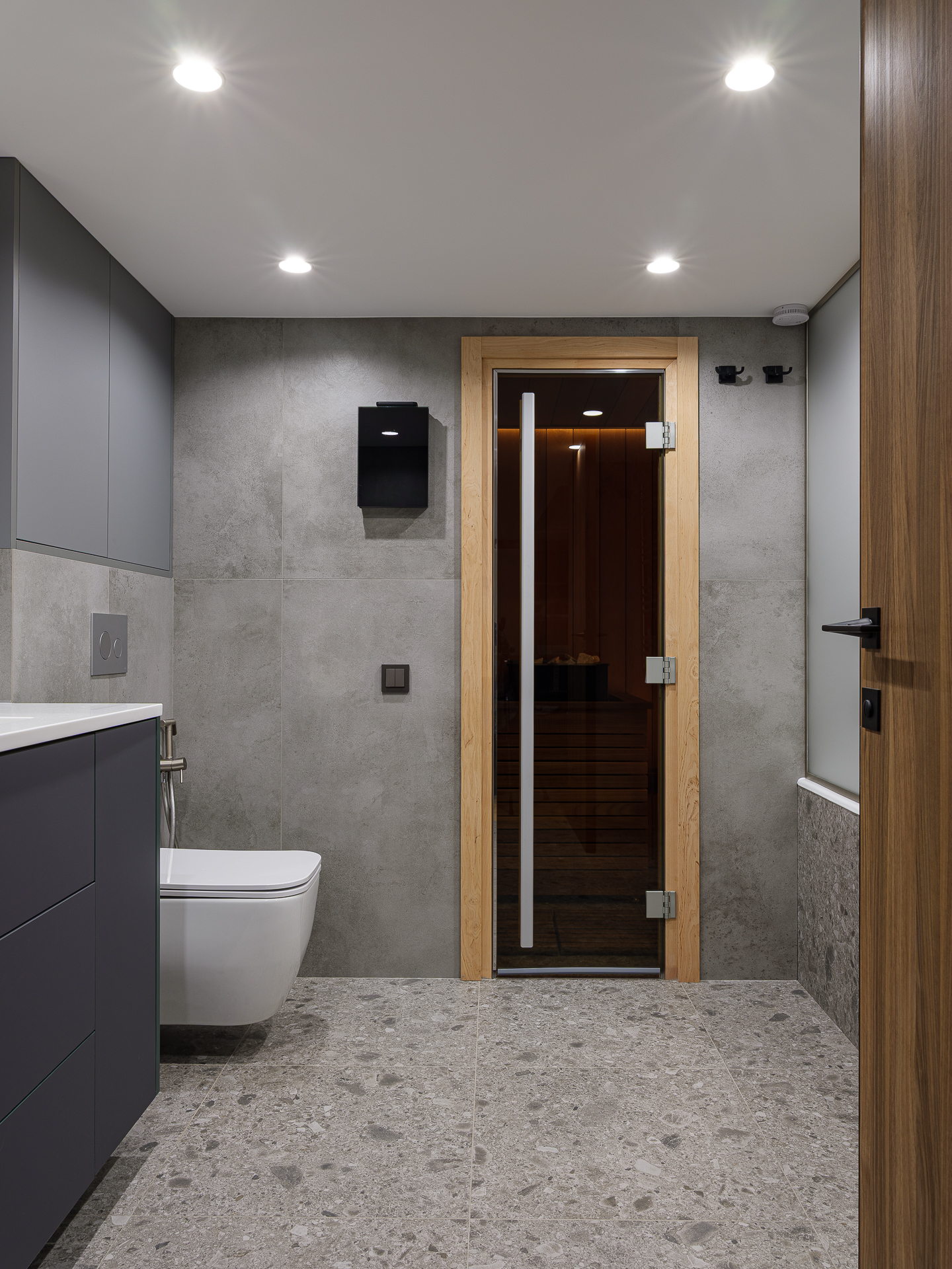 Санузел в данном помещении является переходом в сауну. Выполнен в серых оттенках, в сочетании с зеленым, который применили на тумбе. Сауна сделана из темного дерева и отгорожена от санузла темной стеклянной дверью.