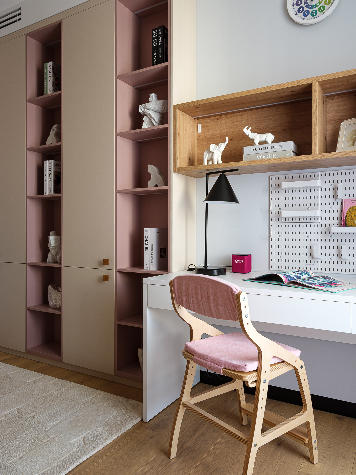 Кладовая - является небольшим светлым функциональным помещением. Здесь мы применили открытое хранение. Также, акцентом является розовая плитка.